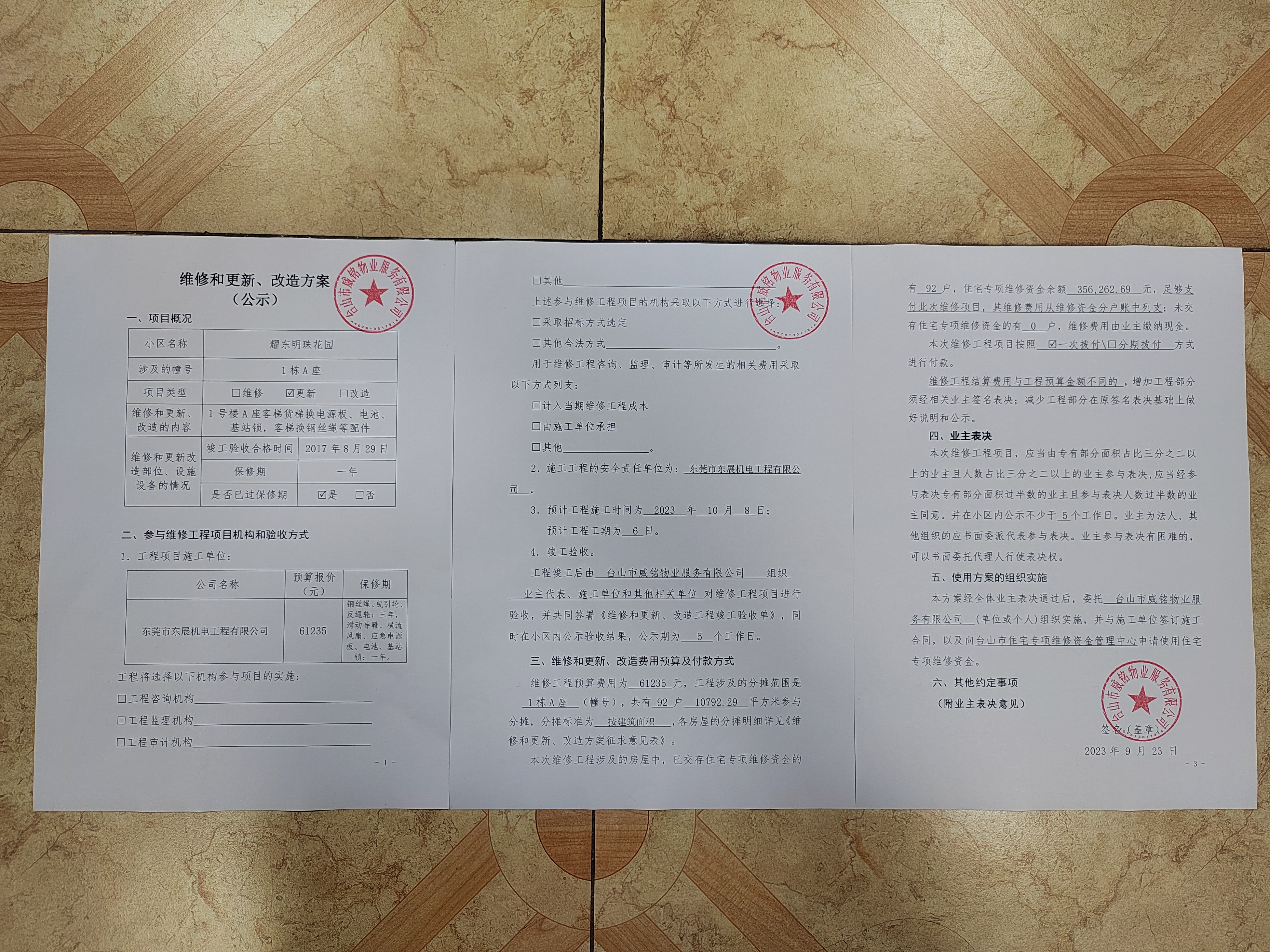 <td VALIGN="top" VALUES="" STYLE="border-width:0" BINDTYPE="0" ROWSPAN="19" COLSPAN="7" DATASOURCE="投票结果" ><font style="font-size:14pt;"><p style="white-space: normal; font-family: 宋体; line-height: 1.75em;">耀东明珠花园1号楼A座全体业主:</p><p style="white-space: normal; font-family: 宋体; line-height: 1.75em; text-indent: 2em;">本小区关于耀东明珠花园1号楼A座客梯货梯换电源板、电池、基站锁,客梯换钢丝绳等配件使用维修资金投票 的投票已表决结束,询异时间从2024年10月11日开始,投票询异公示期间,业主可通过微信查询自己的表决情况或可凭身份证件申请查询自己的表决情况;如公示的业主表决情况与查询的本人表决意见不一致的,可以以书面形式向投票组织机构申诉,投票组织机构予以纠正并重新公示表决结果。异议提出人对投票组织机构的处理仍有异议的,可以向街道办事处(镇人民政府)反映处理,涉及住宅专项维修资金的,可向属地住宅专项维修资金管理中心反映处理。</p><p style="white-space: normal;"><br/></p><p style="white-space: normal; font-family: 宋体; line-height: 1.75em;"><strong>附件:</strong></p><p style="white-space: normal; font-family: 宋体; line-height: 1.75em;"><strong>一、投票范围</strong></p><p style="white-space: normal; font-family: 宋体; line-height: 1.75em; text-indent: 2em;">耀东明珠花园1号楼A座</p><p style="white-space: normal; font-family: 宋体; line-height: 1.75em; text-indent: 2em;">总人数(专有部分人数之和):92</p><p style="white-space: normal; font-family: 宋体; line-height: 1.75em; text-indent: 2em;"><span style="font-family: 宋体, SimSun;"><span style="font-family: 宋体; text-indent: 32px;"><span style="font-family: 宋体; text-indent: 32px;">总户数:92</span></span></span></p><p style="white-space: normal; font-family: 宋体; line-height: 1.75em; text-indent: 2em;">建筑物总面积(专有部分面积之和):10792.29㎡</p><p style="white-space: normal; font-family: 宋体; line-height: 1.75em;"><strong>二、询异公示起止时间</strong></p><p dir="ltr" style="white-space: normal; font-family: 宋体; line-height: 1.75em; text-indent: 2em;"><span style="text-indent: 36px;">2024年10月11日至2024年10月17日</span></p><p style="white-space: normal; font-family: 宋体; line-height: 1.75em;"><strong>三、投票详细描述</strong></p><p style="white-space: normal; font-family: 宋体; line-height: 1.75em; text-indent: 2em;"><p style="text-wrap: wrap; text-indent: 2em;"><span style="font-size: 14px; background-color: rgb(255, 255, 255); font-family: 宋体;">小区1号楼</span><span style="font-size: 14px; background-color: rgb(255, 255, 0);"><span style="font-family: Calibri;">A座</span></span><span style="font-size: 14px; background-color: rgb(255, 255, 255); font-family: 宋体;">的</span><span style="font-size: 14px; font-family: 宋体; background: rgb(255, 255, 0);">客梯经特种设备进行年度审查发现曳引轮绳槽磨损严重,曳引钢丝绳和限速器钢丝绳老化磨损出油严重,曳引试验不符合。对重反绳轮和轿厢反绳轮有磨损老化,一把横流风扇严重异响损坏,电梯的滑动导靴磨损老化,其中有一个滑动导靴的弹簧螺丝松动,以上原因存在安全隐患,导致客梯暂时无法使用,另外,客梯、货梯的应急电源板、电池、基站锁均已损坏,需要一并换掉。</span></p><p style="text-wrap: wrap; text-indent: 2em;"><span style="font-size: 14px; background-color: rgb(255, 255, 255); font-family: 宋体;">现对</span><span style="font-size: 14px; font-family: 宋体; background: rgb(255, 255, 0);"><span style="font-family: Calibri;">1号楼A座的客梯、货梯进行维修,工程维修预算金额为61235元,项目最终费用以施工合同签订金额为准。因已过保修期,维修费用由相关业主按建筑面积分摊,每平方约5.67元,详见公示附件。如业主手机不能正常通过微信投票,请联系物业公司进行线下纸质投票,物业电话:0750-5586289。</span></span></p><p><br/></p></p><p style="white-space: normal; font-family: 宋体; line-height: 1.75em;"><strong>四、计票规则</strong></p><p style="white-space: normal; font-family: 宋体; line-height: 1.75em; text-indent: 2em;">表决事项:使用建筑物及其附属设施的维修资金<br /><p style='text-align: left; font-family: 宋体; font-size: 16px; line-height: 1.75em; text-indent: 2em;'>计票规则:弃权票不并入其它项 未表决票不并入其它项</p></p><p style="white-space: normal; font-family: 宋体; line-height: 1.75em;"><strong>五、通过规则</strong></p><p style="white-space: normal; font-family: 宋体; line-height: 1.75em;"><strong><strong style="white-space: normal;"><span style="font-family: 宋体, SimSun;"> 根据《中华人民共和国民法典》第二百七十八条规定:业主共同决定事项,应当由专有部分面积占比三分之二以上的业主且人数占比三分之二以上的业主参与表决。</span></strong></strong></p><p style="white-space: normal; font-family: 宋体; line-height: 1.75em; text-indent: 2em;">表决事项:使用建筑物及其附属设施的维修资金<br /><p style='text-align: left; font-family: 宋体; font-size: 16px; line-height: 1.75em; text-indent: 2em;'>通过规则:双2/3以上参与表决,参与表决双过半同意</p></p><p style="white-space: normal; font-family: 宋体; line-height: 1.75em;"><strong>六、投票结果</strong></p><p style="white-space: normal; font-family: 宋体; line-height: 1.75em; text-indent: 2em;"><div id='resultTable'><table style='table-layout: fixed; font-size:12px; margin-top:10px' width='100%' border='0' cellspacing='0' cellpadding='0'><tr><td height='28' colspan='10' align='center' style='border: 1px solid #666'><strong style='font-size: 14px;'> 使用建筑物及其附属设施的维修资金</str