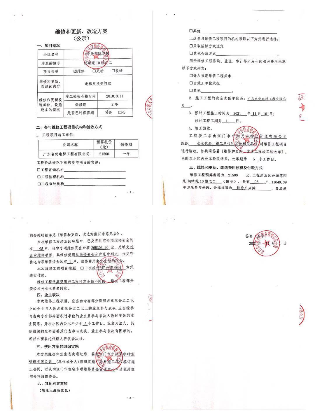 <td VALIGN="top" VALUES="" STYLE="border-width:0" BINDTYPE="0" ROWSPAN="19" COLSPAN="7" DATASOURCE="投票结果" ><font style="font-size:14pt;"><p style="text-align: left; font-family: 宋体; font-size: 16px; line-height: 1.75em;"><span style="font-family: 宋体;">中天国际花园蓬江区中天国际花园朗晴苑10栋之二全体业主:</span></p><p style="text-align: left; font-family: 宋体; font-size: 16px; line-height: 1.75em; text-indent: 2em;">本小区关于中天国际花园关于使用朗晴苑10幢之二电梯更换变频器的维修资金的投票的投票已表决结束,询异时间从2021年12月01日开始,投票询异公示期间,业主可通过微信查询自己的表决情况或可凭身份证件赴发起机构申请查询自己的表决情况;如公示的业主表决情况与在服务平台查询的本人表决意见不一致的,可以以书面形式向发起机构核查。经核查业主反映情况属实的,发起机构应当予以纠正并重新公示表决结果。</p><p><br/></p><p style="text-align: left; font-family: 宋体; font-size: 16px; line-height: 1.75em;"><strong><span style="font-family: 宋体">附件:</span></strong></p><p style="text-align: left; font-family: 宋体; font-size: 16px; line-height: 1.75em;"><strong>一、投票范围</strong></p><p style="text-align: left; font-family: 宋体; font-size: 16px; line-height: 1.75em; text-indent: 2em;">中天国际花园蓬江区中天国际花园朗晴苑10栋之二</p><p style="text-align: left; font-family: 宋体; font-size: 16px; line-height: 1.75em; text-indent: 2em;">总人数(专有部分人数之和):94</p><p style="text-align: left; font-family: 宋体; font-size: 16px; line-height: 1.75em; text-indent: 2em;">建筑物总面积(专有部分面积之和):11049.39㎡</p><p style="text-align: left; font-family: 宋体; font-size: 16px; line-height: 1.75em;"><strong>二、投票起止时间</strong></p><p dir="ltr" style="text-align: left; font-family: 宋体; font-size: 16px; line-height: 1.75em; text-indent: 2em;">投票表决时间:从2021年11月05日到2021年11月30日止</p><p dir="ltr" style="text-align: left; font-family: 宋体; font-size: 16px; line-height: 1.75em; text-indent: 2em;">投票询异公示时间:从2021年12月01日开始</p><p dir="ltr" style="text-align: left; font-family: 宋体; font-size: 16px; line-height: 1.75em; text-indent: 2em;">投票结果通知公告时间:从2021年12月08日开始<br/></p><p style="text-align: left; font-family: 宋体; font-size: 16px; line-height: 1.75em;"><strong>三、投票详细描述</strong></p><p style="text-align: left; font-family: 宋体; font-size: 16px; line-height: 1.75em; text-indent: 2em;"><p style="white-space: normal; text-indent: 2em; line-height: 1.75em;"><span style="font-family: 宋体, SimSun;"><span style="text-decoration-line: underline;">&nbsp;朗晴苑10幢之二&nbsp;</span>座<span style="text-decoration-line: underline;">&nbsp;客梯&nbsp;</span><span style="text-decoration-line: underline;">电梯外呼黑屏不能使用,主板及变频器处于断电状态,机房对控制柜的一级供电发现处于跳闸状态。</span>经检查,是由于<span style="text-decoration-line: underline;">&nbsp;变频器使用年限已超十年以上,电子原件老化引起的瞬时或长时间过电流过电压使模块和电容超负荷,发热鼓包爆炸。&nbsp;</span>已过保修期。</span></p><p style="white-space: normal; text-indent: 2em; line-height: 1.75em;"><span style="font-family: 宋体, SimSun;">现需申请使用维修资金对(<span style="text-decoration-line: underline;">&nbsp; <span style="font-family: 宋体, SimSun; text-indent: 32px; text-decoration-line: underline;">朗晴苑10幢之二&nbsp;</span></span>座)<span style="text-decoration-line: underline;">&nbsp; &nbsp;客梯&nbsp;</span>维修,工程维修预算金额为<span style="text-decoration-line: underline;">&nbsp; 21500</span>元,项目最终费用以施工合同签订金额为准。维修费用的分摊标准为<span style="text-decoration-line: underline;">&nbsp; 按分户分摊(223.96元/户)</span>,详见公示附件</span><span style="font-family: 宋体, SimSun; text-decoration-line: underline;">。本次投票以微信电子投票为主,书面表决投票作补充投票的方式,同一住户出现微信电子投票和书面表决投票同时存在的情况的,以该住户的微信电子投票为准计入表决统计数。</span></p><p><br/></p></p><p style="text-align: left; font-family: 宋体; font-size: 16px; line-height: 1.75em;"><strong>四、计票规则</strong></p><p style="text-align: left; font-family: 宋体; font-size: 16px; line-height: 1.75em; text-indent: 2em;">表决事项:使用建筑物及其附属设施的维修资金<br /><p style='text-align: left; font-family: 宋体; font-size: 16px; line-height: 1.75em; text-indent: 2em;'>计票规则:弃权票不并入其它项&nbsp;&nbsp;&nbsp;&nbsp;未表决票不并入其它项</p></p><p style="text-align: left; font-family: 宋体; font-size: 16px; line-height: 1.75em;"><strong>五、通过规则</strong></p><p style="text-align: left; font-family: 宋体; font-size: 16px; line-height: 1.75em; text-indent: 2em;"><span style="font-family: 宋体; text-indent: 32px;">表决事项:使用建筑物及其附属设施的维修资金<br /><p style='text-align: left; font-family: 宋体; font-size: 16px; line-height: 1.75em; text-indent: 2em;'>通过规则:双三分之二以上参与表决,并经参与表决双过半数以上同意</p></span></p><p style="text-align: left; font-family: 宋体; font-size: 16px; line-height: 1.75em;"><strong>六、投票结果</strong></p><p style="text-align: left; font-family: 宋体; font-size: 16px; line-height: 1.75em; text-indent: 2em;"><div id='resultTable'><table style='table-layout: fixed; font-size:12px; margin-top:10px' width='100%' border='0' cellspacing='0' cellpadding='0'><tr><td height='28' colspan='10' align='center' style='border