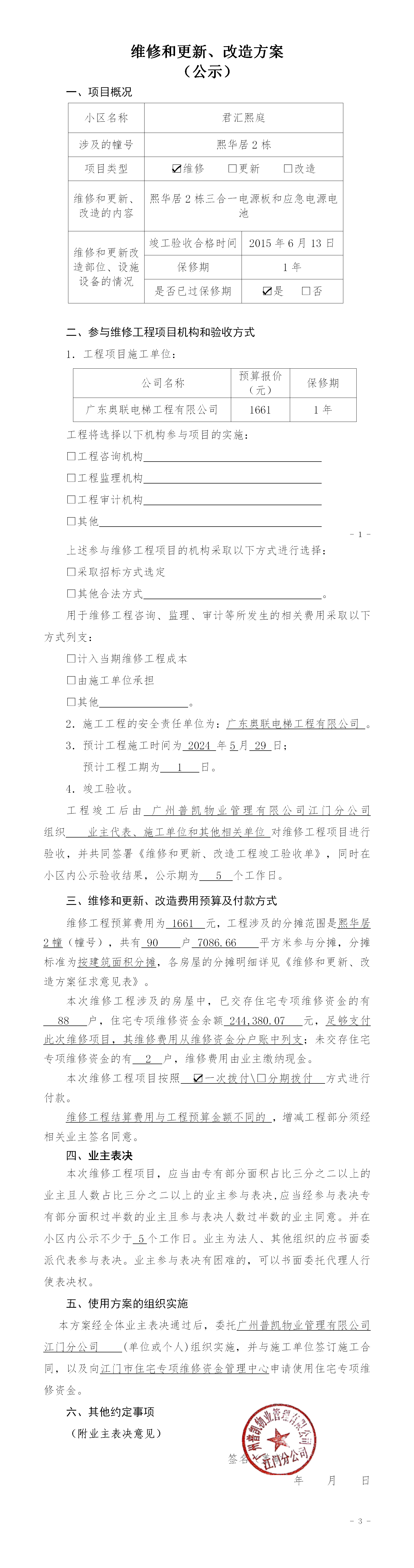 <td VALIGN="top" VALUES="" STYLE="border-width:0" BINDTYPE="0" ROWSPAN="17" COLSPAN="7" DATASOURCE="投票结果" ><font style=" font-family:方正小标宋简体;font-size:14pt;"><p style="line-height: 1.75em;"><span style="font-family: 宋体, SimSun;">各位尊敬的业主:</span><br/></p><p style="text-indent: 2em; line-height: 1.75em;"><span style="font-family: 宋体, SimSun;">根据法律法规的规定,本小区业主利用“江门市物业事项表决管理系统”已对本小区公共事务决策事项进行了表决,在经过7日的询异公示期后,未收到业主有效的异议。现将投票结果公告,并就产生的法律效力说明如下:</span></p><p style="line-height: 1.75em; text-indent: 0em;"><strong style="text-indent: 2em;"><span style="font-family: 宋体, SimSun;">一、投票范围</span></strong></p><p style="text-indent: 2em; line-height: 1.75em;"><span style="font-family: 宋体, SimSun;">江海区君汇熙庭江海区君汇熙庭熙华居2幢</span></p><p style="text-indent: 2em; line-height: 1.75em;"><span style="font-family: 宋体, SimSun;">总人数(专有部分人数之和):90</span></p><p style="text-indent: 2em; line-height: 1.75em;"><span style="font-family: 宋体, SimSun;"><span style="font-family: 宋体, SimSun; text-indent: 32px;"><span style="font-family: 宋体; text-indent: 32px;"><span style="font-family: 宋体; text-indent: 32px;">总户数:90</span></span></span></span></p><p style="text-indent: 2em; line-height: 1.75em;"><span style="font-family: 宋体, SimSun;">建筑物总面积(专有部分面积之和):7086.66㎡</span></p><p style="line-height: 1.75em;"><strong><span style="font-family: 宋体, SimSun;">二、投票结果公告时间</span></strong></p><p style="text-indent: 2em; line-height: 1.75em;"><span style="font-family: 宋体, SimSun;"><span style="font-family: 宋体, SimSun; text-indent: 32px;">从2024年07月11日开始</span></span></p><p style="line-height: 1.75em;"><strong><span style="font-family: 宋体, SimSun;">三、计票规则</span></strong></p><p style="text-indent: 2em; line-height: 1.75em;"><span style="font-family: 宋体, SimSun;">表决事项:使用建筑物及其附属设施的维修资金<br /><p style='font-family: 宋体, SimSun;line-height: 1.75em; text-indent: 2em;'>计票规则:弃权票不并入其它项&nbsp;&nbsp;&nbsp;&nbsp;未表决票不并入其它项</p></span></p><p style="line-height: 1.75em;"><strong><span style="font-family: 宋体, SimSun;">四、通过规则</span></strong></p><p style="line-height: 1.75em;"><strong><span style="font-family: 宋体, SimSun;">&nbsp; 根据《中华人民共和国民法典》第二百七十八条规定:业主共同决定事项,应当由专有部分面积占比三分之二以上的业主且人数占比三分之二以上的业主参与表决。</span></strong></p><p style="text-indent: 2em; line-height: 1.75em;"><span style="font-family: 宋体, SimSun;"><span style="font-family: 宋体, SimSun; text-indent: 32px;">表决事项:使用建筑物及其附属设施的维修资金<br /><p style='font-family: 宋体, SimSun;line-height: 1.75em; text-indent: 2em;'>通过规则:双2/3以上参与表决,参与表决双过半同意</p></span></span></p><p style="line-height: 1.75em;"><strong><span style="font-family: 宋体, SimSun;">五、投票结果</span></strong></p><p style="line-height: 1.75em; text-indent: 2em;"><span style="font-family: 宋体, SimSun; text-indent: 2em;"><div id='resultTable'><table style='table-layout: fixed; font-size:12px; margin-top:10px' width='100%' border='0' cellspacing='0' cellpadding='0'><tr><td height='28' colspan='10' align='center' style='border: 1px solid #666'><strong style='font-size: 14px;'> 使用建筑物及其附属设施的维修资金</strong></td> </tr><tr id='trfirst'><td height='28' colspan='4' style='border-left: 1px solid #666; border-bottom: 1px solid #666'><strong>&nbsp;申报单位:</strong> 广州普凯物业管理有限公司江门分公司</td><td colspan='3' style='border-left: 1px solid #666; border-bottom: 1px solid #666'><strong>&nbsp;联系方式:</strong> </td><td colspan='3' style='border-left: 1px solid #666; border-bottom: 1px solid #666; border-right: 1px solid #666'><strong>&nbsp;申报日期:</strong> 2024年6月2日 </td></tr><tr> <td height='28' colspan='5' style='border-left: 1px solid #666; border-bottom: 1px solid #666'><strong>&nbsp;总人数(专有部分人数之和):</strong>90人 </td><td colspan='5' style='border-left: 1px solid #666; border-bottom: 1px solid #666; border-right: 1px solid #666'><strong>&nbsp;建筑物总面积(专有部分面积之和):</strong>7086.66㎡ </td> </tr><tr><td height='28' colspan='10' bgcolor='#F3F3F3' style='border-left: 1px solid #666;border-bottom: 1px solid #666;border-right: 1px solid #666'><strong>&nbsp;参与表决人数及面积统计</strong></td></tr><tr><td height='28' colspan='5' style='border-left: 1px solid #666; border-bottom: 1px solid #666'><strong>&nbsp;参与表决人数:</strong>63人</td><td colspan='5' style='border-left: 1px solid #666; border-bottom: 1px solid #666; border-right: 1px solid #666'><strong>&nbsp;参与表决人数占总人数比例:</strong>70.00%</td></tr><tr><td height='28' colspan='5' style='border-left: 1px solid #666; border-bottom: 1px solid #666'><strong>&nbsp;参与表决面积:</strong>4857.87㎡</td><td colspan='5' style='border-left: 1px solid #666; border-bottom: 1px solid #666; border-right: 1px solid #666'><strong>&nbsp;参与表决面积占总面积比例:</strong>68.55%</td></tr><tr><td height='28' colspan='10' bgcolor='#F3F3F3' style='border-left: 1px solid #666; border-bottom: 1px solid #666;border-right: 1px solid #666'> <strong>&nbsp;参与表决同意人数及面积统计</strong></td> </tr><tr><td height='28' colspan='5' style='border-left: 1px solid #666; border-bottom: 1px solid #666'><strong>&nbsp;参与表决同意人数:</strong>61人 </td><td colspan='5' style='border-left: 1px solid