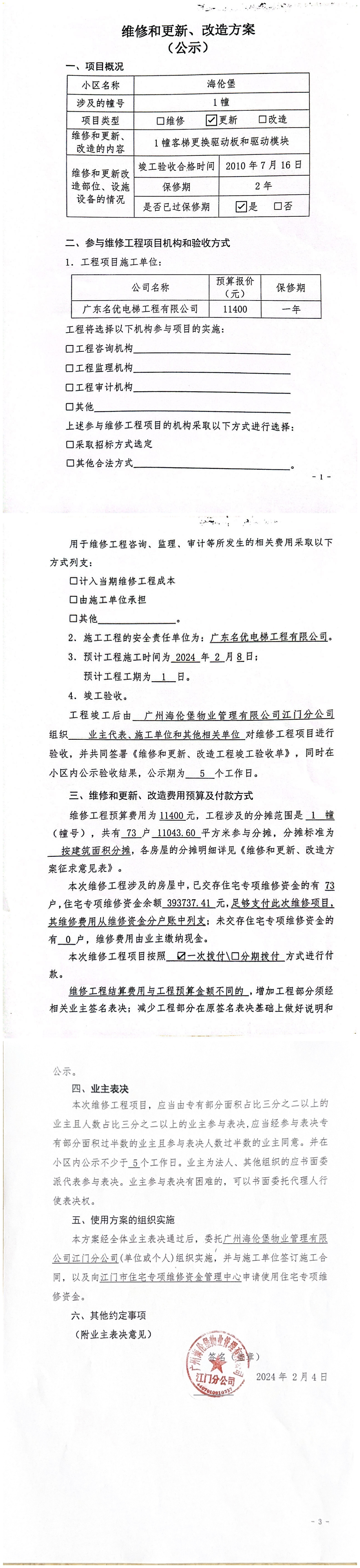 <td VALIGN="top" VALUES="" STYLE="border-width:0" BINDTYPE="0" ROWSPAN="19" COLSPAN="7" DATASOURCE="投票结果" ><font style="font-size:14pt;"><p style="white-space: normal; font-family: 宋体; line-height: 1.75em;">海伦堡蓬江区海伦堡1幢全体业主:</p><p style="white-space: normal; font-family: 宋体; line-height: 1.75em; text-indent: 2em;">本小区关于海伦堡1幢客梯更换驱动板和驱动模块维修使用维修资金的投票的投票已表决结束,询异时间从2024年02月07日开始,投票询异公示期间,业主可通过微信查询自己的表决情况或可凭身份证件申请查询自己的表决情况;如公示的业主表决情况与查询的本人表决意见不一致的,可以以书面形式向投票组织机构申诉,投票组织机构予以纠正并重新公示表决结果。异议提出人对投票组织机构的处理仍有异议的,可以向街道办事处(镇人民政府)反映处理,涉及住宅专项维修资金的,可向属地住宅专项维修资金管理中心反映处理。</p><p style="white-space: normal;"><br/></p><p style="white-space: normal; font-family: 宋体; line-height: 1.75em;"><strong>附件:</strong></p><p style="white-space: normal; font-family: 宋体; line-height: 1.75em;"><strong>一、投票范围</strong></p><p style="white-space: normal; font-family: 宋体; line-height: 1.75em; text-indent: 2em;">海伦堡蓬江区海伦堡1幢</p><p style="white-space: normal; font-family: 宋体; line-height: 1.75em; text-indent: 2em;">总人数(专有部分人数之和):72</p><p style="white-space: normal; font-family: 宋体; line-height: 1.75em; text-indent: 2em;"><span style="font-family: 宋体, SimSun;"><span style="font-family: 宋体; text-indent: 32px;"><span style="font-family: 宋体; text-indent: 32px;">总户数:73</span></span></span></p><p style="white-space: normal; font-family: 宋体; line-height: 1.75em; text-indent: 2em;">建筑物总面积(专有部分面积之和):11043.60㎡</p><p style="white-space: normal; font-family: 宋体; line-height: 1.75em;"><strong>二、询异公示起止时间</strong></p><p dir="ltr" style="white-space: normal; font-family: 宋体; line-height: 1.75em; text-indent: 2em;"><span style="text-indent: 36px;">2024年02月07日至2024年02月13日</span></p><p style="white-space: normal; font-family: 宋体; line-height: 1.75em;"><strong>三、投票详细描述</strong></p><p style="white-space: normal; font-family: 宋体; line-height: 1.75em; text-indent: 2em;"><p> 小区1幢客梯故障无法正常运行。经检查,发现是曳引机变频驱动模组(IPM)故障,即是驱动板和驱动模块失效。</p><p> 现需申请使用维修资金对1幢客梯的驱动板和驱动模块进行更换,工程维修预算金额为11400元,项目最终费用以施工合同签订金额为准。因已过保修期,维修费用由相关业主按建筑面积分摊,每平方约1.03元,详见公示附件。如业主手机不能正常通过微信投票,请联系物业公司进行线下纸质投票,物业电话:0750-3380006</p></p><p style="white-space: normal; font-family: 宋体; line-height: 1.75em;"><strong>四、计票规则</strong></p><p style="white-space: normal; font-family: 宋体; line-height: 1.75em; text-indent: 2em;">表决事项:使用建筑物及其附属设施的维修资金<br /><p style='text-align: left; font-family: 宋体; font-size: 16px; line-height: 1.75em; text-indent: 2em;'>计票规则:弃权票不并入其它项 未表决票不并入其它项</p></p><p style="white-space: normal; font-family: 宋体; line-height: 1.75em;"><strong>五、通过规则</strong></p><p style="white-space: normal; font-family: 宋体; line-height: 1.75em;"><strong><strong style="white-space: normal;"><span style="font-family: 宋体, SimSun;"> 根据《中华人民共和国民法典》第二百七十八条规定:业主共同决定事项,应当由专有部分面积占比三分之二以上的业主且人数占比三分之二以上的业主参与表决。</span></strong></strong></p><p style="white-space: normal; font-family: 宋体; line-height: 1.75em; text-indent: 2em;">表决事项:使用建筑物及其附属设施的维修资金<br /><p style='text-align: left; font-family: 宋体; font-size: 16px; line-height: 1.75em; text-indent: 2em;'>通过规则:双2/3以上参与表决,参与表决双过半同意</p></p><p style="white-space: normal; font-family: 宋体; line-height: 1.75em;"><strong>六、投票结果</strong></p><p style="white-space: normal; font-family: 宋体; line-height: 1.75em; text-indent: 2em;"><div id='resultTable'><table style='table-layout: fixed; font-size:12px; margin-top:10px' width='100%' border='0' cellspacing='0' cellpadding='0'><tr><td height='28' colspan='10' align='center' style='border: 1px solid #666'><strong style='font-size: 14px;'> 使用建筑物及其附属设施的维修资金</strong></td> </tr><tr id='trfirst'><td height='28' colspan='4' style='border-left: 1px solid #666; border-bottom: 1px solid #666'><strong> 申报单位:</strong> 广州海伦堡物业管理有限公司江门分公司</td><td colspan='3' style='border-left: 1px solid #666; border-bottom: 1px solid #666'><strong> 联系方式:</strong> 0750-3380006 </td><td colspan='3' style='border-left: 1px solid #666; border-bottom: 1px solid #666; border-right: 1px solid #666'><strong> 申报日期:</strong> 2024年2月4日 </td></tr><tr> <td height='28' colspan='5' style='border-left: 1px solid #666; border-bottom: 1px solid #666'><strong> 总人数(专有部分人数之和):</strong>72人 </td><td colspan='5' style='border-left: 1px solid #666; border-bottom: 1px solid #666; border-right: 1px solid #666'><strong> 建筑物总面积(专有部分面积之和):</strong>11043.60㎡ </td> </tr><tr><td height='28' colspan='10' bgcolor='#F3F3F3' style='border-left: 1px solid #666;border-bottom: 1px solid #666;border-right: 1px solid #666'><strong> 参与人数及面积统计</strong></td></tr><tr><td hei