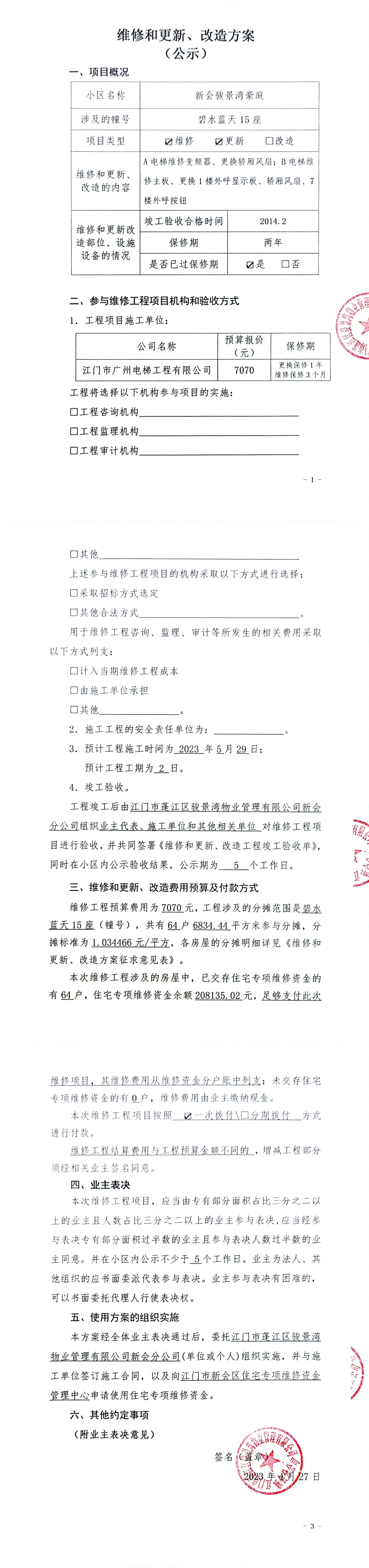 <td valign="top" values="" style="border-width:0" bindtype="0" rowspan="17" colspan="7" datasource="投票结果"><font style=" font-family:方正小标宋简体;font-size:14pt;"><p style="line-height: 1.75em;"><span style="font-family: 宋体, SimSun;">各位尊敬的业主:</span><br></p><p style="text-indent: 2em; line-height: 1.75em;"><span style="font-family: 宋体, SimSun;">根据法律法规的规定,本小区业主利用“物业公共事务决策系统”已对本小区公共事务决策事项进行了表决,在经过7日的询异公示期后,未收到业主有效的异议。现将投票结果公告,并就产生的法律效力说明如下:</span></p><p style="line-height: 1.75em; text-indent: 0em;"><strong style="text-indent: 2em;"><span style="font-family: 宋体, SimSun;">一、投票范围</span></strong></p><p style="text-indent: 2em; line-height: 1.75em;"><span style="font-family: 宋体, SimSun;">新会骏景湾豪庭碧水蓝天15座</span></p><p style="text-indent: 2em; line-height: 1.75em;"><span style="font-family: 宋体, SimSun;">总人数(专有部分人数之和):64</span></p><p style="text-indent: 2em; line-height: 1.75em;"><span style="font-family: 宋体, SimSun;"><span style="font-family: 宋体, SimSun; text-indent: 32px;">总户数:64</span></span></p><p style="text-indent: 2em; line-height: 1.75em;"><span style="font-family: 宋体, SimSun;">建筑物总面积(专有部分面积之和):6834.44㎡</span></p><p style="line-height: 1.75em;"><strong><span style="font-family: 宋体, SimSun;">二、投票起止时间</span></strong></p><p style="text-indent: 2em; line-height: 1.75em;"><span style="font-family: 宋体, SimSun;">投票表决时间:从2023年04月28日到2023年05月28日止</span></p><p style="text-indent: 2em; line-height: 1.75em;"><span style="font-family: 宋体, SimSun;">投票询异公示时间:从2023年05月29日开始</span></p><p style="text-indent: 2em; line-height: 1.75em;"><span style="font-family: 宋体, SimSun;">投票结果通知公告时间:从2023年06月05日开始</span></p><p style="line-height: 1.75em;"><strong><span style="font-family: 宋体, SimSun;">三、计票规则</span></strong></p><p style="text-indent: 2em; line-height: 1.75em;"><span style="font-family: 宋体, SimSun;">表决事项:使用建筑物及其附属设施的维修资金<br></span></p><p style="font-family: 宋体, SimSun;line-height: 1.75em; text-indent: 2em;">计票规则:弃权票不并入其它项 未表决票不并入其它项</p><p></p><p style="line-height: 1.75em;"><strong><span style="font-family: 宋体, SimSun;">四、通过规则</span></strong></p><p style="text-indent: 2em; line-height: 1.75em;"><span style="font-family: 宋体, SimSun;"><span style="font-family: 宋体, SimSun; text-indent: 32px;">表决事项:使用建筑物及其附属设施的维修资金<br></span></span></p><p style="font-family: 宋体, SimSun;line-height: 1.75em; text-indent: 2em;">通过规则:参与表决专有部分面积过半数的业主且参与表决人数过半数的业主同意</p><p></p><p style="line-height: 1.75em;"><strong><span style="font-family: 宋体, SimSun;">五、投票结果</span></strong></p><p style="line-height: 1.75em; text-indent: 2em;"><span style="font-family: 宋体, SimSun; text-indent: 2em;"></span></p><div id="resultTable"><table style="table-layout: fixed; font-size:12px; margin-top:10px" width="100%" border="0" cellspacing="0" cellpadding="0"><tbody><tr><td height="28" colspan="10" align="center" style="border: 1px solid #666"><strong style="font-size: 14px;"> 使用建筑物及其附属设施的维修资金</strong></td> </tr><tr id="trfirst"><td height="28" colspan="4" style="border-left: 1px solid #666; border-bottom: 1px solid #666"><strong> 申报单位:</strong> 江门市蓬江区骏景湾物业管理有限公司新会分公司</td><td colspan="3" style="border-left: 1px solid #666; border-bottom: 1px solid #666"><strong> 联系方式:</strong> </td><td colspan="3" style="border-left: 1px solid #666; border-bottom: 1px solid #666; border-right: 1px solid #666"><strong> 申报日期:</strong> 2023年4月28日 </td></tr><tr> <td height="28" colspan="5" style="border-left: 1px solid #666; border-bottom: 1px solid #666"><strong> 总人数(专有部分人数之和):</strong>64人 </td><td colspan="5" style="border-left: 1px solid #666; border-bottom: 1px solid #666; border-right: 1px solid #666"><strong> 建筑物总面积(专有部分面积之和):</strong>6834.44㎡ </td> </tr><tr><td height="28" colspan="10" bgcolor="#F3F3F3" style="border-left: 1px solid #666;border-bottom: 1px solid #666;border-right: 1px solid #666"><strong> 参与人数及面积统计</strong></td></tr><tr><td height="28" colspan="5" style="border-left: 1px solid #666; border-bottom: 1px solid #666"><strong> 参与表决专有部分人数之和:</strong>48人</td><td colspan="5" style="border-left: 1px solid #666; border-bottom: 1px solid #666; border-right: 1px solid #666"><strong> 参与表决占有表决权总人数比例:</strong>75.00%</td></tr><tr><td height="28" colspan="5" style="border-left: 1px solid #666; border-bottom: 1px solid #666"><strong> 参与表决专有部分面积之和:</strong>5090.17㎡</td><td colspan="5" style="border-left: 1px solid #666; border-bottom: 1px solid #666; border-right: 1px solid #666"><strong> 参与表决占有表决权总面积比例:</strong>74.48%</td></tr><tr><td height="28" colspan="10" bgcolor="#F3F3F3" style="border-left: 1px solid #666; border-bottom: 1px solid #666;border-right: 1px solid #666"> <strong> 未参与人数及面积统计</strong></td> </tr><tr><td height="28" colspan="5" style="border-left: 1px solid #666; border-bottom: 1px solid #666"><strong> 未参与表决专有部分人数之和:</strong>16人 </td><td colspan="5" style="border-left: 1px solid #666; border-bottom: 1px solid #666; border-right: 1px solid #666"><strong> 未参与表决占有表决权总人数比例:</strong>25.00%</td></