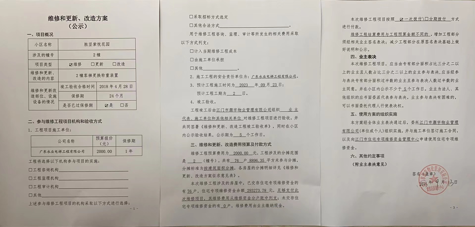 <td valign="top" values="" style="border-width:0" bindtype="0" rowspan="17" colspan="7" datasource="投票结果"><font style=" font-family:方正小标宋简体;font-size:14pt;"><p style="line-height: 1.75em;"><span style="font-family: 宋体, SimSun;">各位尊敬的业主:</span><br></p><p style="text-indent: 2em; line-height: 1.75em;"><span style="font-family: 宋体, SimSun;">根据法律法规的规定,本小区业主利用“江门市物业事项表决管理系统”已对本小区公共事务决策事项进行了表决,在经过7日的询异公示期后,未收到业主有效的异议。现将投票结果公告,并就产生的法律效力说明如下:</span></p><p style="line-height: 1.75em; text-indent: 0em;"><strong style="text-indent: 2em;"><span style="font-family: 宋体, SimSun;">一、投票范围</span></strong></p><p style="text-indent: 2em; line-height: 1.75em;"><span style="font-family: 宋体, SimSun;">蓬江区胜坚紫悦花园蓬江区胜坚紫悦花园2幢</span></p><p style="text-indent: 2em; line-height: 1.75em;"><span style="font-family: 宋体, SimSun;">总人数(专有部分人数之和):76</span></p><p style="text-indent: 2em; line-height: 1.75em;"><span style="font-family: 宋体, SimSun;"><span style="font-family: 宋体, SimSun; text-indent: 32px;"><span style="font-family: 宋体; text-indent: 32px;">总户数:76</span></span></span></p><p style="text-indent: 2em; line-height: 1.75em;"><span style="font-family: 宋体, SimSun;">建筑物总面积(专有部分面积之和):8896.35㎡</span></p><p style="line-height: 1.75em;"><strong><span style="font-family: 宋体, SimSun;">二、投票结果公告时间</span></strong></p><p style="text-indent: 2em; line-height: 1.75em;"><span style="font-family: 宋体, SimSun;">从2023年10月01日开始</span></p><p style="line-height: 1.75em;"><strong><span style="font-family: 宋体, SimSun;">三、计票规则</span></strong></p><p style="text-indent: 2em; line-height: 1.75em;"><span style="font-family: 宋体, SimSun;">表决事项:使用建筑物及其附属设施的维修资金<br></span></p><p style="font-family: 宋体, SimSun;line-height: 1.75em; text-indent: 2em;">计票规则:弃权票不并入其它项 未表决票不并入其它项</p><p></p><p style="line-height: 1.75em;"><strong><span style="font-family: 宋体, SimSun;">四、通过规则</span></strong></p><p style="text-indent: 2em; line-height: 1.75em;"><span style="font-family: 宋体, SimSun;"><span style="font-family: 宋体, SimSun; text-indent: 32px;">表决事项:使用建筑物及其附属设施的维修资金<br></span></span></p><p style="font-family: 宋体, SimSun;line-height: 1.75em; text-indent: 2em;">通过规则:参与表决专有部分面积过半数的业主且参与表决人数过半数的业主同意</p><p></p><p style="line-height: 1.75em;"><strong><span style="font-family: 宋体, SimSun;">五、投票结果</span></strong></p><p style="line-height: 1.75em; text-indent: 2em;"><span style="font-family: 宋体, SimSun; text-indent: 2em;"></span></p><div id="resultTable"><table style="table-layout: fixed; font-size:12px; margin-top:10px" width="100%" border="0" cellspacing="0" cellpadding="0"><tbody><tr><td height="28" colspan="10" align="center" style="border: 1px solid #666"><strong style="font-size: 14px;"> 使用建筑物及其附属设施的维修资金</strong></td> </tr><tr id="trfirst"><td height="28" colspan="4" style="border-left: 1px solid #666; border-bottom: 1px solid #666"><strong> 申报单位:</strong> 江门市灏宇物业管理有限公司</td><td colspan="3" style="border-left: 1px solid #666; border-bottom: 1px solid #666"><strong> 联系方式:</strong> </td><td colspan="3" style="border-left: 1px solid #666; border-bottom: 1px solid #666; border-right: 1px solid #666"><strong> 申报日期:</strong> 2023年9月13日 </td></tr><tr> <td height="28" colspan="5" style="border-left: 1px solid #666; border-bottom: 1px solid #666"><strong> 总人数(专有部分人数之和):</strong>76人 </td><td colspan="5" style="border-left: 1px solid #666; border-bottom: 1px solid #666; border-right: 1px solid #666"><strong> 建筑物总面积(专有部分面积之和):</strong>8896.35㎡ </td> </tr><tr><td height="28" colspan="10" bgcolor="#F3F3F3" style="border-left: 1px solid #666;border-bottom: 1px solid #666;border-right: 1px solid #666"><strong> 参与人数及面积统计</strong></td></tr><tr><td height="28" colspan="5" style="border-left: 1px solid #666; border-bottom: 1px solid #666"><strong> 参与表决专有部分人数之和:</strong>52人</td><td colspan="5" style="border-left: 1px solid #666; border-bottom: 1px solid #666; border-right: 1px solid #666"><strong> 参与表决占有表决权总人数比例:</strong>68.42%</td></tr><tr><td height="28" colspan="5" style="border-left: 1px solid #666; border-bottom: 1px solid #666"><strong> 参与表决专有部分面积之和:</strong>6097.63㎡</td><td colspan="5" style="border-left: 1px solid #666; border-bottom: 1px solid #666; border-right: 1px solid #666"><strong> 参与表决占有表决权总面积比例:</strong>68.54%</td></tr><tr><td height="28" colspan="10" bgcolor="#F3F3F3" style="border-left: 1px solid #666; border-bottom: 1px solid #666;border-right: 1px solid #666"> <strong> 未参与人数及面积统计</strong></td> </tr><tr><td height="28" colspan="5" style="border-left: 1px solid #666; border-bottom: 1px solid #666"><strong> 未参与表决专有部分人数之和:</strong>24人 </td><td colspan="5" style="border-left: 1px solid #666; border-bottom: 1px solid #666; border-right: 1px solid #666"><strong> 未参与表决占有表决权总人数比例:</strong>31.58%</td></tr><tr><td height="28" colspan="5" style="border-left: 1px solid #666; border-bottom: 1px solid #666"><strong> 未参与表决专有部分面积之和:</strong>2798.72㎡</td><td colspan="5" style="border-left: 1px solid #666; border-bottom: 1px solid #666; border-right: 1px solid #