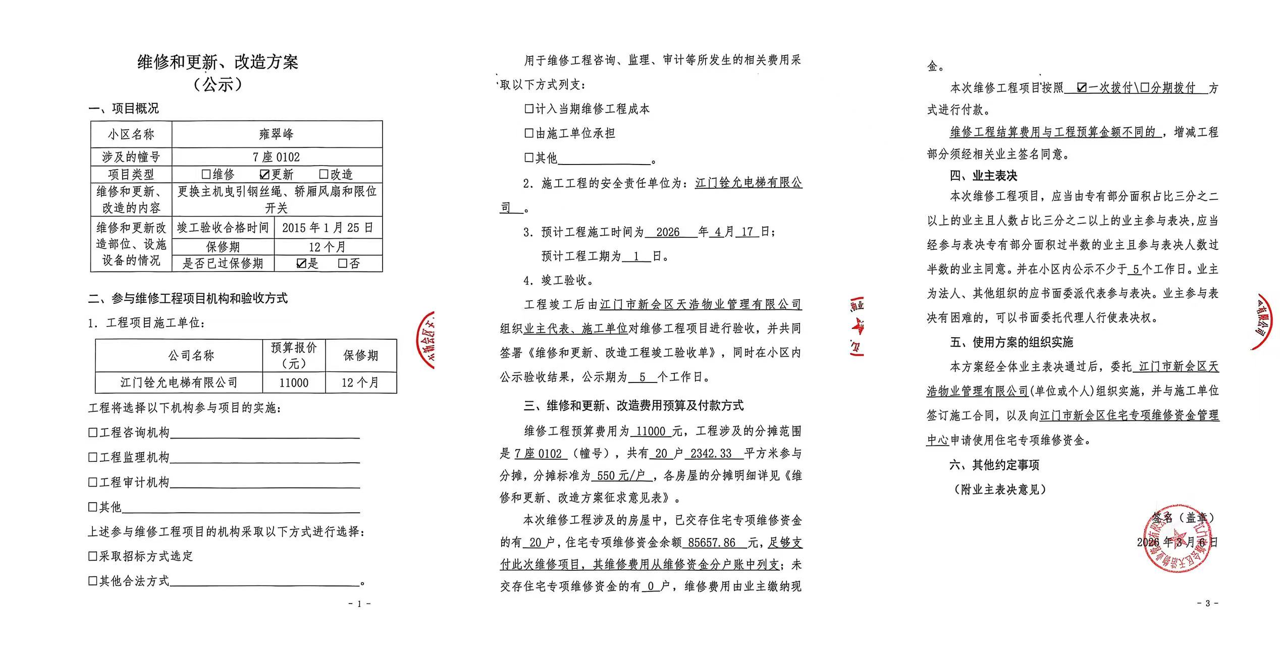<td VALIGN="top" VALUES="" STYLE="border-width:0" BINDTYPE="0" ROWSPAN="17" COLSPAN="7" DATASOURCE="投票结果" ><font style=" font-family:方正小标宋简体;font-size:14pt;"><p style="line-height: 1.75em;"><span style="font-family: 宋体, SimSun;">各位尊敬的业主:</span><br/></p><p style="text-indent: 2em; line-height: 1.75em;"><span style="font-family: 宋体, SimSun;">根据法律法规的规定,本小区业主利用“江门市物业事项表决管理系统”已对本小区公共事务决策事项(<span style="font-family: 宋体; text-indent: 32px;">雍翠峰7座01-02单元电梯【梯粤JX4626】更换主机曳引钢丝绳、轿厢风扇和限位开关使用维修资金的投票</span>)进行了表决,在经过7日的询异公示期后,未收到业主有效的异议。现将投票结果公告,并就产生的法律效力说明如下:</span></p><p style="line-height: 1.75em; text-indent: 0em;"><strong style="text-indent: 2em;"><span style="font-family: 宋体, SimSun;">一、投票范围</span></strong></p><p style="text-indent: 2em; line-height: 1.75em;"><span style="font-family: 宋体, SimSun;">雍翠峰雍翠峰7座</span></p><p style="text-indent: 2em; line-height: 1.75em;"><span style="font-family: 宋体, SimSun;">总人数(专有部分人数之和):20</span></p><p style="text-indent: 2em; line-height: 1.75em;"><span style="font-family: 宋体, SimSun;"><span style="font-family: 宋体, SimSun; text-indent: 32px;"><span style="font-family: 宋体; text-indent: 32px;"><span style="font-family: 宋体; text-indent: 32px;">总户数:20</span></span></span></span></p><p style="text-indent: 2em; line-height: 1.75em;"><span style="font-family: 宋体, SimSun;">建筑物总面积(专有部分面积之和):2342.33㎡</span></p><p style="line-height: 1.75em;"><strong><span style="font-family: 宋体, SimSun;">二、投票结果公告时间</span></strong></p><p style="text-indent: 2em; line-height: 1.75em;"><span style="font-family: 宋体, SimSun;"><span style="font-family: 宋体, SimSun; text-indent: 32px;">从2026年03月21日开始</span></span></p><p style="line-height: 1.75em;"><strong><span style="font-family: 宋体, SimSun;">三、计票规则</span></strong></p><p style="text-indent: 2em; line-height: 1.75em;"><span style="font-family: 宋体, SimSun;">表决事项:使用建筑物及其附属设施的维修资金<br /><p style='font-family: 宋体, SimSun;line-height: 1.75em; text-indent: 2em;'>计票规则:弃权票不并入其它项&nbsp;&nbsp;&nbsp;&nbsp;未表决票不并入其它项</p></span></p><p style="line-height: 1.75em;"><strong><span style="font-family: 宋体, SimSun;">四、通过规则</span></strong></p><p style="line-height: 1.75em;"><strong><span style="font-family: 宋体, SimSun;">&nbsp; 根据《中华人民共和国民法典》第二百七十八条规定:业主共同决定事项,应当由专有部分面积占比三分之二以上的业主且人数占比三分之二以上的业主参与表决。</span></strong></p><p style="text-indent: 2em; line-height: 1.75em;"><span style="font-family: 宋体, SimSun;"><span style="font-family: 宋体, SimSun; text-indent: 32px;">表决事项:使用建筑物及其附属设施的维修资金<br /><p style='font-family: 宋体, SimSun;line-height: 1.75em; text-indent: 2em;'>通过规则:双2/3以上参与表决,参与表决双过半同意</p></span></span></p><p style="line-height: 1.75em;"><strong><span style="font-family: 宋体, SimSun;">五、投票结果</span></strong></p><p style="line-height: 1.75em; text-indent: 2em;"><span style="font-family: 宋体, SimSun; text-indent: 2em;"><div id='resultTable'><table style='table-layout: fixed; font-size:12px; margin-top:10px' width='100%' border='0' cellspacing='0' cellpadding='0'><tr><td height='28' colspan='10' align='center' style='border: 1px solid #666'><strong style='font-size: 14px;'> 使用建筑物及其附属设施的维修资金</strong></td> </tr><tr id='trfirst'><td height='28' colspan='4' style='border-left: 1px solid #666; border-bottom: 1px solid #666'><strong>&nbsp;申报单位:</strong> 江门市新会区天浩物业管理有限公司</td><td colspan='3' style='border-left: 1px solid #666; border-bottom: 1px solid #666'><strong>&nbsp;联系方式:</strong> </td><td colspan='3' style='border-left: 1px solid #666; border-bottom: 1px solid #666; border-right: 1px solid #666'><strong>&nbsp;申报日期:</strong> 2026年3月6日 </td></tr><tr> <td height='28' colspan='5' style='border-left: 1px solid #666; border-bottom: 1px solid #666'><strong>&nbsp;列支总人数(专有部分人数之和):</strong>20人 </td><td colspan='5' style='border-left: 1px solid #666; border-bottom: 1px solid #666; border-right: 1px solid #666'><strong>&nbsp;列支建筑物总面积(专有部分面积之和):</strong>2342.33㎡ </td> </tr><tr><td height='28' colspan='10' bgcolor='#F3F3F3' style='border-left: 1px solid #666;border-bottom: 1px solid #666;border-right: 1px solid #666'><strong>&nbsp;参与表决人数及面积统计</strong></td></tr><tr><td height='28' colspan='5' style='border-left: 1px solid #666; border-bottom: 1px solid #666'><strong>&nbsp;参与表决人数:</strong>15人</td><td colspan='5' style='border-left: 1px solid #666; border-bottom: 1px solid #666; border-right: 1px solid #666'><strong>&nbsp;参与表决人数占总人数比例:</strong>75.00%</td></tr><tr><td height='28' colspan='5' style='border-left: 1px solid #666; border-bottom: 1px solid #666'><strong>&nbsp;参与表决面积:</strong>1819.68㎡</td><td colspan='5' style='border-left: 1px solid #666; border-bottom: 1px solid #666; border-right: 1px solid #666'><strong>&nbsp;参与表决面积占总面积比例:</strong>77.69%</td></tr><tr><td height='28' colspan='10' bgcolor='#F3F3F3' style='border-left: 1px solid #666; border-bottom: 1px solid #666;border-right: 1px solid #666'> <strong>&nbsp;参与表决同意人数及面积统计</strong></td> </tr><tr><td height='28' colspan='5' 