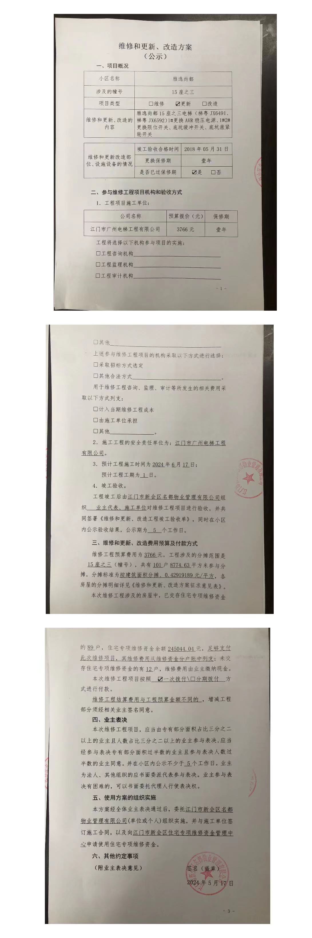 <td VALIGN="top" VALUES="" STYLE="border-width:0" BINDTYPE="0" ROWSPAN="17" COLSPAN="7" DATASOURCE="投票结果" ><font style=" font-family:方正小标宋简体;font-size:14pt;"><p style="line-height: 1.75em;"><span style="font-family: 宋体, SimSun;">各位尊敬的业主:</span><br/></p><p style="text-indent: 2em; line-height: 1.75em;"><span style="font-family: 宋体, SimSun;">根据法律法规的规定,本小区业主利用“江门市物业事项表决管理系统”已对本小区公共事务决策事项进行了表决,在经过7日的询异公示期后,未收到业主有效的异议。现将投票结果公告,并就产生的法律效力说明如下:</span></p><p style="line-height: 1.75em; text-indent: 0em;"><strong style="text-indent: 2em;"><span style="font-family: 宋体, SimSun;">一、投票范围</span></strong></p><p style="text-indent: 2em; line-height: 1.75em;"><span style="font-family: 宋体, SimSun;">雅逸尚都雅逸尚都15座之三</span></p><p style="text-indent: 2em; line-height: 1.75em;"><span style="font-family: 宋体, SimSun;">总人数(专有部分人数之和):100</span></p><p style="text-indent: 2em; line-height: 1.75em;"><span style="font-family: 宋体, SimSun;"><span style="font-family: 宋体, SimSun; text-indent: 32px;"><span style="font-family: 宋体; text-indent: 32px;"><span style="font-family: 宋体; text-indent: 32px;">总户数:101</span></span></span></span></p><p style="text-indent: 2em; line-height: 1.75em;"><span style="font-family: 宋体, SimSun;">建筑物总面积(专有部分面积之和):8774.63㎡</span></p><p style="line-height: 1.75em;"><strong><span style="font-family: 宋体, SimSun;">二、投票结果公告时间</span></strong></p><p style="text-indent: 2em; line-height: 1.75em;"><span style="font-family: 宋体, SimSun;">从2024年06月19日开始</span></p><p style="line-height: 1.75em;"><strong><span style="font-family: 宋体, SimSun;">三、计票规则</span></strong></p><p style="text-indent: 2em; line-height: 1.75em;"><span style="font-family: 宋体, SimSun;">表决事项:使用建筑物及其附属设施的维修资金<br /><p style='font-family: 宋体, SimSun;line-height: 1.75em; text-indent: 2em;'>计票规则:弃权票不并入其它项&nbsp;&nbsp;&nbsp;&nbsp;未表决票不并入其它项</p></span></p><p style="line-height: 1.75em;"><strong><span style="font-family: 宋体, SimSun;">四、通过规则</span></strong></p><p style="line-height: 1.75em;"><strong><span style="font-family: 宋体, SimSun;">&nbsp; 根据《中华人民共和国民法典》第二百七十八条规定:业主共同决定事项,应当由专有部分面积占比三分之二以上的业主且人数占比三分之二以上的业主参与表决。</span></strong></p><p style="text-indent: 2em; line-height: 1.75em;"><span style="font-family: 宋体, SimSun;"><span style="font-family: 宋体, SimSun; text-indent: 32px;">表决事项:使用建筑物及其附属设施的维修资金<br /><p style='font-family: 宋体, SimSun;line-height: 1.75em; text-indent: 2em;'>通过规则:双2/3以上参与表决,参与表决双过半同意</p></span></span></p><p style="line-height: 1.75em;"><strong><span style="font-family: 宋体, SimSun;">五、投票结果</span></strong></p><p style="line-height: 1.75em; text-indent: 2em;"><span style="font-family: 宋体, SimSun; text-indent: 2em;"><div id='resultTable'><table style='table-layout: fixed; font-size:12px; margin-top:10px' width='100%' border='0' cellspacing='0' cellpadding='0'><tr><td height='28' colspan='10' align='center' style='border: 1px solid #666'><strong style='font-size: 14px;'> 使用建筑物及其附属设施的维修资金</strong></td> </tr><tr id='trfirst'><td height='28' colspan='4' style='border-left: 1px solid #666; border-bottom: 1px solid #666'><strong>&nbsp;申报单位:</strong> 江门市新会区名都物业管理有限公司</td><td colspan='3' style='border-left: 1px solid #666; border-bottom: 1px solid #666'><strong>&nbsp;联系方式:</strong> 6609908 </td><td colspan='3' style='border-left: 1px solid #666; border-bottom: 1px solid #666; border-right: 1px solid #666'><strong>&nbsp;申报日期:</strong> 2024年5月18日 </td></tr><tr> <td height='28' colspan='5' style='border-left: 1px solid #666; border-bottom: 1px solid #666'><strong>&nbsp;列支总人数(专有部分人数之和):</strong>100人 </td><td colspan='5' style='border-left: 1px solid #666; border-bottom: 1px solid #666; border-right: 1px solid #666'><strong>&nbsp;列支建筑物总面积(专有部分面积之和):</strong>8774.63㎡ </td> </tr><tr><td height='28' colspan='10' bgcolor='#F3F3F3' style='border-left: 1px solid #666;border-bottom: 1px solid #666;border-right: 1px solid #666'><strong>&nbsp;参与表决人数及面积统计</strong></td></tr><tr><td height='28' colspan='5' style='border-left: 1px solid #666; border-bottom: 1px solid #666'><strong>&nbsp;参与表决人数:</strong>70人</td><td colspan='5' style='border-left: 1px solid #666; border-bottom: 1px solid #666; border-right: 1px solid #666'><strong>&nbsp;参与表决人数占总人数比例:</strong>70.00%</td></tr><tr><td height='28' colspan='5' style='border-left: 1px solid #666; border-bottom: 1px solid #666'><strong>&nbsp;参与表决面积:</strong>6184.86㎡</td><td colspan='5' style='border-left: 1px solid #666; border-bottom: 1px solid #666; border-right: 1px solid #666'><strong>&nbsp;参与表决面积占总面积比例:</strong>70.49%</td></tr><tr><td height='28' colspan='10' bgcolor='#F3F3F3' style='border-left: 1px solid #666; border-bottom: 1px solid #666;border-right: 1px solid #666'> <strong>&nbsp;参与表决同意人数及面积统计</strong></td> </tr><tr><td height='28' colspan='5' style='border-left: 1px solid #666; border-bottom: 1px solid #666'><strong>&nbsp;参与表决同意人数:</strong>70人 </td><td colspan='5' style='border-left: 1px solid #666; border-bottom: 1px solid #666; border-right: 1px solid #666'>