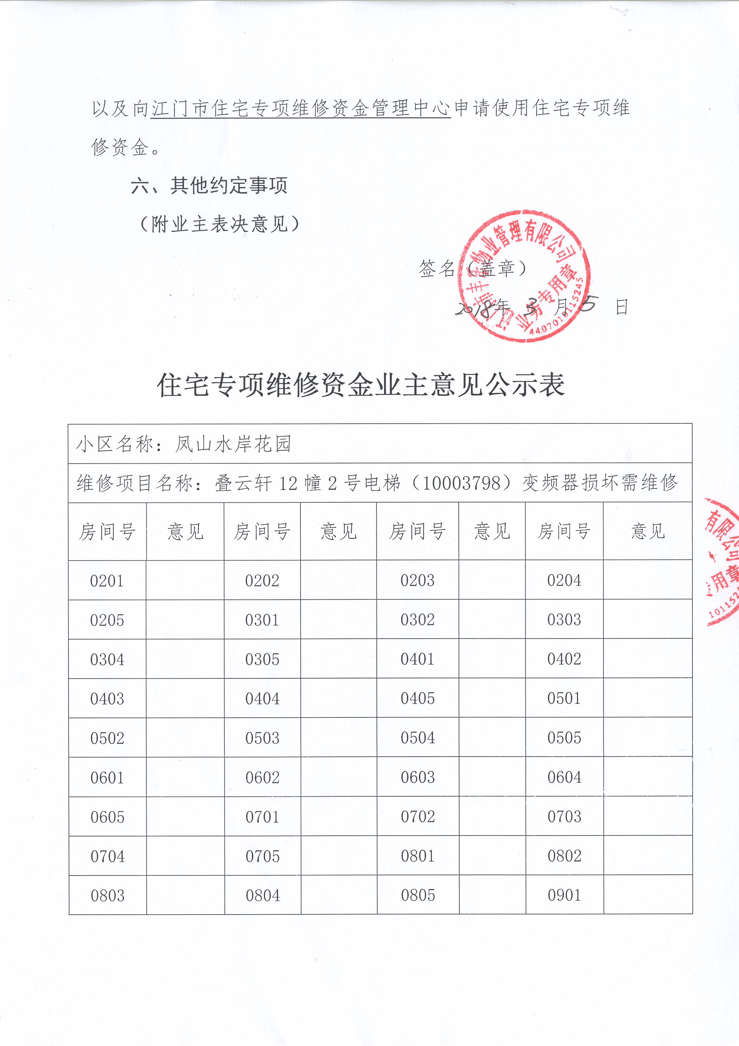 <div style="font-family: 宋体; font-size: 16px;"><p style="text-align: left;">各位尊敬的业主:</p><p style="text-align: left;"> 根据法律法规的规定,本小区业主利用“江门市物业管理公众服务平台”已对本小区公共事务决策事项进行了表决,在经过7日的询异公示期后,未收到业主有效的异议。现将投票结果公告,并就产生的法律效力说明如下:</p><p style="text-align: left;">一、投票范围</p><p style="text-align: left;"> 凤山水岸花园叠云轩12幢</p><p style="text-align: left;"> 总人数(专有部分人数之和):85</p><p style="text-align: left;"> 建筑物总面积(专有部分面积之和):10637.14㎡</p><p style="text-align: left;">二、投票起止时间</p><p style="text-align: left;"> 投票表决时间:从2018年03月08日到2018年04月07日止</p><p style="text-align: left;"> 投票询异公示时间:从2018年04月08日开始</p><p style="text-align: left;"> 投票结果通知公告时间:从2018年04月15日开始</p><p style="text-align: left;">三、投票结果 </p><p style="text-align: left;"><table style='table-layout: fixed; font-size:12px; margin-top:10px' width='100%' border='0' cellspacing='0' cellpadding='0'><tr><td height='28' colspan='10' align='center' style='border: 1px solid #666'><strong style='font-size: 14px;'> 叠云轩12幢2号电梯光幕损坏需维修</strong></td> </tr><tr><td height='28' colspan='4' style='border-left: 1px solid #666; border-bottom: 1px solid #666'><strong> 申报单位:</strong> 江门市丰乐物业管理有限公司</td><td colspan='3' style='border-left: 1px solid #666; border-bottom: 1px solid #666'><strong> 联系方式:</strong> (0750) 3871336 3829717 </td><td colspan='3' style='border-left: 1px solid #666; border-bottom: 1px solid #666; border-right: 1px solid #666'><strong> 申报日期:</strong> 2018年3月5日 </td></tr><tr> <td height='28' colspan='5' style='border-left: 1px solid #666; border-bottom: 1px solid #666'><strong> 总人数(专有部分人数之和):</strong>85人 </td><td colspan='5' style='border-left: 1px solid #666; border-bottom: 1px solid #666; border-right: 1px solid #666'><strong> 建筑物总面积(专有部分面积之和):</strong>10637.14㎡ </td> </tr><tr><td height='28' colspan='10' bgcolor='#F3F3F3' style='border-left: 1px solid #666;border-bottom: 1px solid #666;border-right: 1px solid #666'><strong> 参与人数及面积统计</strong></td></tr><tr><td height='28' colspan='5' style='border-left: 1px solid #666; border-bottom: 1px solid #666'><strong> 参与表决专有部分人数之和:</strong>0人</td><td colspan='5' style='border-left: 1px solid #666; border-bottom: 1px solid #666; border-right: 1px solid #666'><strong> 参与表决占有表决权总人数比例:</strong>0.00%</td></tr><tr><td height='28' colspan='5' style='border-left: 1px solid #666; border-bottom: 1px solid #666'><strong> 参与表决专有部分面积之和:</strong>0.00㎡</td><td colspan='5' style='border-left: 1px solid #666; border-bottom: 1px solid #666; border-right: 1px solid #666'><strong> 参与表决占有表决权总面积比例:</strong>0.00%</td></tr><tr><td height='28' colspan='10' bgcolor='#F3F3F3' style='border-left: 1px solid #666; border-bottom: 1px solid #666;border-right: 1px solid #666'> <strong> 未参与人数及面积统计</strong></td> </tr><tr><td height='28' colspan='5' style='border-left: 1px solid #666; border-bottom: 1px solid #666'><strong> 未参与表决专有部分人数之和:</strong>85人 </td><td colspan='5' style='border-left: 1px solid #666; border-bottom: 1px solid #666; border-right: 1px solid #666'><strong> 未参与表决占有表决权总人数比例:</strong>100.00%</td></tr><tr><td height='28' colspan='5' style='border-left: 1px solid #666; border-bottom: 1px solid #666'><strong> 未参与表决专有部分面积之和:</strong>10637.14㎡</td><td colspan='5' style='border-left: 1px solid #666; border-bottom: 1px solid #666; border-right: 1px solid #666'><strong> 未参与表决占有表决权总面积比例:</strong>100.00% </td> </tr><tr><td width='6%' rowspan='2' align='center' bgcolor='#F3F3F3' style='border-left: 1px solid #666; border-bottom: 1px solid #666'><strong>序号</strong></td><td width='11%' rowspan='2' align='center' bgcolor='#F3F3F3' style='border-left: 1px solid #666; border-bottom: 1px solid #666'><strong>候选项</strong></td><td height='28' colspan='2' align='center' bgcolor='#F3F3F3' style='border-left: 1px solid #666; border-bottom: 1px solid #666'><strong>表决人数情况</strong> </td><td colspan='2' align='center' bgcolor='#F3F3F3' style='border-left: 1px solid #666; border-bottom: 1px solid #666'><strong>表决面积情况</strong></td><td colspan='4' align='center' bgcolor='#F3F3F3' style='border-left: 1px solid #666; border-bottom: 1px solid #666; border-right: 1px solid #666'><strong>表决方式</strong></td></tr><tr><td width='11%' height='28' align='center' bgcolor='#F3F3F3' style='border-left: 1px solid #666;border-bottom: 1px solid #666'><strong>参与表决<br />专有部分<br />人数之和</strong> </td><td width='11%' align='center' bgcolor='#F3F3F3' style='border-left: 1px solid #666; border-bottom: 1px solid #666'><strong>占有<br /> 表决权<br /> 总人数比例<br /> </strong></td><td width='11%' align='center' bgcolor='#F3F3F3' style='border-left: 1px solid #666; border-bottom: 1px solid #666'><strong>参与表决<br /> 专有部分<br /> 面积之和<br /> </strong></td><td width='13%' align='center' bgcolor='#F3F3F3' style='border-left: 1px solid #666; border-bottom: 1px solid #666'><strong>占有<br />表决权<br />总面积比例</strong></td><td width='9%' align='center' bgcolor='#F3F3F3' style='border-left: 1px solid #666; border-bottom: 1px solid #666'><strong>微信<br /> 投票<br /> </strong></td><td width='7%' align='center' bgcolor='#F3F3F3' style='border-left: 1px solid #666; border-bottom: 1px solid #666'><strong>投票