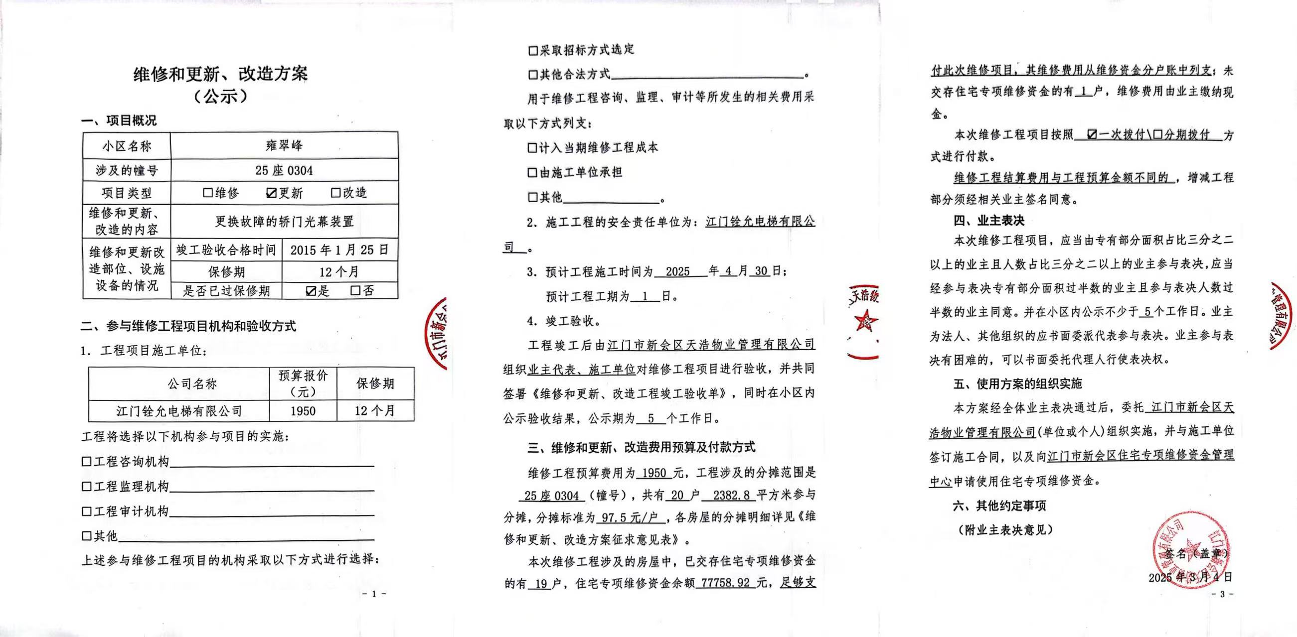 <td VALIGN="top" VALUES="" STYLE="border-width:0" BINDTYPE="0" ROWSPAN="17" COLSPAN="7" DATASOURCE="投票结果" ><font style=" font-family:方正小标宋简体;font-size:14pt;"><p style="line-height: 1.75em;"><span style="font-family: 宋体, SimSun;">各位尊敬的业主:</span><br/></p><p style="text-indent: 2em; line-height: 1.75em;"><span style="font-family: 宋体, SimSun;">根据法律法规的规定,本小区业主利用“江门市物业事项表决管理系统”已对本小区公共事务决策事项进行了表决,在经过7日的询异公示期后,未收到业主有效的异议。现将投票结果公告,并就产生的法律效力说明如下:</span></p><p style="line-height: 1.75em; text-indent: 0em;"><strong style="text-indent: 2em;"><span style="font-family: 宋体, SimSun;">一、投票范围</span></strong></p><p style="text-indent: 2em; line-height: 1.75em;"><span style="font-family: 宋体, SimSun;">雍翠峰雍翠峰25座</span></p><p style="text-indent: 2em; line-height: 1.75em;"><span style="font-family: 宋体, SimSun;">总人数(专有部分人数之和):20</span></p><p style="text-indent: 2em; line-height: 1.75em;"><span style="font-family: 宋体, SimSun;"><span style="font-family: 宋体, SimSun; text-indent: 32px;"><span style="font-family: 宋体; text-indent: 32px;"><span style="font-family: 宋体; text-indent: 32px;">总户数:20</span></span></span></span></p><p style="text-indent: 2em; line-height: 1.75em;"><span style="font-family: 宋体, SimSun;">建筑物总面积(专有部分面积之和):2382.80㎡</span></p><p style="line-height: 1.75em;"><strong><span style="font-family: 宋体, SimSun;">二、投票结果公告时间</span></strong></p><p style="text-indent: 2em; line-height: 1.75em;"><span style="font-family: 宋体, SimSun;"><span style="font-family: 宋体, SimSun; text-indent: 32px;">从2025年03月13日开始</span></span></p><p style="line-height: 1.75em;"><strong><span style="font-family: 宋体, SimSun;">三、计票规则</span></strong></p><p style="text-indent: 2em; line-height: 1.75em;"><span style="font-family: 宋体, SimSun;">表决事项:使用建筑物及其附属设施的维修资金<br /><p style='font-family: 宋体, SimSun;line-height: 1.75em; text-indent: 2em;'>计票规则:弃权票不并入其它项&nbsp;&nbsp;&nbsp;&nbsp;未表决票不并入其它项</p></span></p><p style="line-height: 1.75em;"><strong><span style="font-family: 宋体, SimSun;">四、通过规则</span></strong></p><p style="line-height: 1.75em;"><strong><span style="font-family: 宋体, SimSun;">&nbsp; 根据《中华人民共和国民法典》第二百七十八条规定:业主共同决定事项,应当由专有部分面积占比三分之二以上的业主且人数占比三分之二以上的业主参与表决。</span></strong></p><p style="text-indent: 2em; line-height: 1.75em;"><span style="font-family: 宋体, SimSun;"><span style="font-family: 宋体, SimSun; text-indent: 32px;">表决事项:使用建筑物及其附属设施的维修资金<br /><p style='font-family: 宋体, SimSun;line-height: 1.75em; text-indent: 2em;'>通过规则:双2/3以上参与表决,参与表决双过半同意</p></span></span></p><p style="line-height: 1.75em;"><strong><span style="font-family: 宋体, SimSun;">五、投票结果</span></strong></p><p style="line-height: 1.75em; text-indent: 2em;"><span style="font-family: 宋体, SimSun; text-indent: 2em;"><div id='resultTable'><table style='table-layout: fixed; font-size:12px; margin-top:10px' width='100%' border='0' cellspacing='0' cellpadding='0'><tr><td height='28' colspan='10' align='center' style='border: 1px solid #666'><strong style='font-size: 14px;'> 使用建筑物及其附属设施的维修资金</strong></td> </tr><tr id='trfirst'><td height='28' colspan='4' style='border-left: 1px solid #666; border-bottom: 1px solid #666'><strong>&nbsp;申报单位:</strong> 江门市新会区天浩物业管理有限公司</td><td colspan='3' style='border-left: 1px solid #666; border-bottom: 1px solid #666'><strong>&nbsp;联系方式:</strong> </td><td colspan='3' style='border-left: 1px solid #666; border-bottom: 1px solid #666; border-right: 1px solid #666'><strong>&nbsp;申报日期:</strong> 2025年3月4日 </td></tr><tr> <td height='28' colspan='5' style='border-left: 1px solid #666; border-bottom: 1px solid #666'><strong>&nbsp;列支总人数(专有部分人数之和):</strong>20人 </td><td colspan='5' style='border-left: 1px solid #666; border-bottom: 1px solid #666; border-right: 1px solid #666'><strong>&nbsp;列支建筑物总面积(专有部分面积之和):</strong>2382.80㎡ </td> </tr><tr><td height='28' colspan='10' bgcolor='#F3F3F3' style='border-left: 1px solid #666;border-bottom: 1px solid #666;border-right: 1px solid #666'><strong>&nbsp;参与表决人数及面积统计</strong></td></tr><tr><td height='28' colspan='5' style='border-left: 1px solid #666; border-bottom: 1px solid #666'><strong>&nbsp;参与表决人数:</strong>16人</td><td colspan='5' style='border-left: 1px solid #666; border-bottom: 1px solid #666; border-right: 1px solid #666'><strong>&nbsp;参与表决人数占总人数比例:</strong>80.00%</td></tr><tr><td height='28' colspan='5' style='border-left: 1px solid #666; border-bottom: 1px solid #666'><strong>&nbsp;参与表决面积:</strong>1933.66㎡</td><td colspan='5' style='border-left: 1px solid #666; border-bottom: 1px solid #666; border-right: 1px solid #666'><strong>&nbsp;参与表决面积占总面积比例:</strong>81.15%</td></tr><tr><td height='28' colspan='10' bgcolor='#F3F3F3' style='border-left: 1px solid #666; border-bottom: 1px solid #666;border-right: 1px solid #666'> <strong>&nbsp;参与表决同意人数及面积统计</strong></td> </tr><tr><td height='28' colspan='5' style='border-left: 1px solid #666; border-bottom: 1px solid #666'><strong>&nbsp;参与表决同意人数:</strong>16人 </td><td colspan='5' style='border-left: 1px solid #666; border-bottom: 1