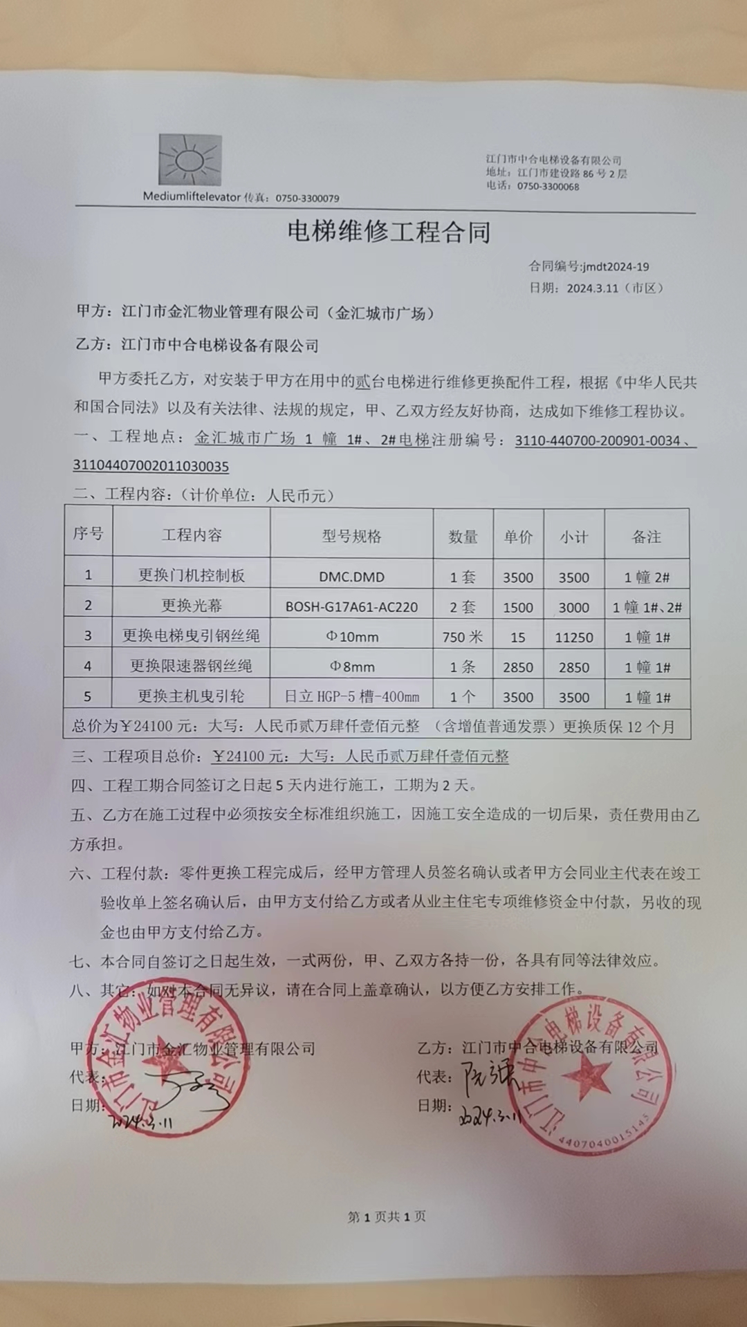 <td VALIGN="top" VALUES="" STYLE="border-width:0" BINDTYPE="0" ROWSPAN="19" COLSPAN="7" DATASOURCE="投票结果" ><font style="font-size:14pt;"><p style="white-space: normal; font-family: 宋体; line-height: 1.75em;">金汇城市广场金汇城市广场1栋全体业主:</p><p style="white-space: normal; font-family: 宋体; line-height: 1.75em; text-indent: 2em;">本小区关于金汇城市广场关于1幢1#2#电梯更换光幕、2#电梯更换门机控制板、1#电梯更换曳引钢丝绳、限速器钢丝绳、主机曳引轮工程使用维修资金的投票的投票已表决结束,询异时间从2024年05月11日开始,投票询异公示期间,业主可通过微信查询自己的表决情况或可凭身份证件申请查询自己的表决情况;如公示的业主表决情况与查询的本人表决意见不一致的,可以以书面形式向投票组织机构申诉,投票组织机构予以纠正并重新公示表决结果。异议提出人对投票组织机构的处理仍有异议的,可以向街道办事处(镇人民政府)反映处理,涉及住宅专项维修资金的,可向属地住宅专项维修资金管理中心反映处理。</p><p style="white-space: normal;"><br/></p><p style="white-space: normal; font-family: 宋体; line-height: 1.75em;"><strong>附件:</strong></p><p style="white-space: normal; font-family: 宋体; line-height: 1.75em;"><strong>一、投票范围</strong></p><p style="white-space: normal; font-family: 宋体; line-height: 1.75em; text-indent: 2em;">金汇城市广场金汇城市广场1栋</p><p style="white-space: normal; font-family: 宋体; line-height: 1.75em; text-indent: 2em;">总人数(专有部分人数之和):38</p><p style="white-space: normal; font-family: 宋体; line-height: 1.75em; text-indent: 2em;"><span style="font-family: 宋体, SimSun;"><span style="font-family: 宋体; text-indent: 32px;"><span style="font-family: 宋体; text-indent: 32px;">总户数:39</span></span></span></p><p style="white-space: normal; font-family: 宋体; line-height: 1.75em; text-indent: 2em;">建筑物总面积(专有部分面积之和):7311.47㎡</p><p style="white-space: normal; font-family: 宋体; line-height: 1.75em;"><strong>二、询异公示起止时间</strong></p><p dir="ltr" style="white-space: normal; font-family: 宋体; line-height: 1.75em; text-indent: 2em;"><span style="text-indent: 36px;">2024年05月11日至2024年05月17日</span></p><p style="white-space: normal; font-family: 宋体; line-height: 1.75em;"><strong>三、投票详细描述</strong></p><p style="white-space: normal; font-family: 宋体; line-height: 1.75em; text-indent: 2em;"><p><span style="font-family: 宋体, SimSun; font-size: 14px;"> 金汇城市广场1幢1<span style="font-family: 宋体, SimSun; font-size: 14px;">#</span>2<span style="font-family: 宋体, SimSun; font-size: 14px;">#</span>电梯突然出现故障,<span style="font-family: 宋体, SimSun; background-color: rgb(255, 255, 255);">经检查,由于</span>1#电梯曳引钢丝绳、限速器钢丝绳、主机曳引轮;2#电梯门机控制板;1#2#电梯光幕<span style="font-family: 宋体; font-size: 14px; background-color: rgb(255, 255, 0);">因使用时间较长,<span style="font-family: 宋体; font-size: 14px; background-color: rgb(255, 255, 0);">原件出现老化而不能正常运行,已损坏及停止使用。</span></span></span></p><p><span style="font-family: 宋体, SimSun; font-size: 14px;"><span style="font-family: 宋体; font-size: 14px; background-color: rgb(255, 255, 0);"><span style="font-family: 宋体; font-size: 14px; background-color: rgb(255, 255, 0);"> <span style="font-size: 14px; background-color: rgb(255, 255, 255); font-family: 宋体;">现对</span><span style="font-size: 14px; font-family: 宋体; background: rgb(255, 255, 0);"><span style="font-family: Calibri;"></span><span style="font-family: 宋体, SimSun; font-size: 14px;">1</span><span style="font-family: 宋体, SimSun; font-size: 14px;">幢</span><span style="font-family: 宋体, SimSun; font-size: 14px;">1</span><span style="font-family: 宋体, SimSun; font-size: 14px;">#</span><span style="font-family: 宋体, SimSun; font-size: 14px;">2</span><span style="font-family: 宋体, SimSun; font-size: 14px;">#</span><span style="font-family: 宋体, SimSun; font-size: 14px;">电梯</span>进行更换改造</span><span style="font-size: 14px; background-color: rgb(255, 255, 255); font-family: 宋体;">,工程维修预算金额为</span><span style="font-size: 14px; font-family: 宋体; background: rgb(255, 255, 0);"><span style="font-family: Calibri;">24100</span>元</span><span style="font-size: 14px; background-color: rgb(255, 255, 255); font-family: 宋体;">,项目最终费用以施工合同签订金额为准。因已过保修期,维修费用由相关业主</span><span style="font-size: 14px; font-family: 宋体; background: rgb(255, 255, 0);">按建筑面积</span><span style="font-size: 14px; background-color: rgb(255, 255, 255); font-family: 宋体;">分摊,</span><span style="font-size: 14px; font-family: 宋体; background: rgb(255, 255, 0);">每平方约<span style="font-family: Calibri;">3.29</span>元</span><span style="font-size: 14px; background-color: rgb(255, 255, 255); font-family: 宋体;">,详见公示附件。如业主手机不能正常通过微信投票,请联系物业公司进行线下纸质投票,物业电话</span><span style="font-size: 14px; font-family: 宋体; background: rgb(255, 255, 0);">:<span style="font-family: Calibri;">0750-3909003</span></span><span style="font-size: 14px; background-color: rgb(255, 255, 255); font-family: 宋体;">。</span></span></span></span></p></p><p style="white-space: normal; font-family: 宋体; line-height: 1.75em;"><strong>四、计票规则</strong></p><p style="white-space: normal; font-family: 宋体; line-height: 1.75em; text-indent: 2em;">表决事项:使用建筑物及其附属设施的维修资金<br /><p style='text-align: left; font-family: 宋体; fon