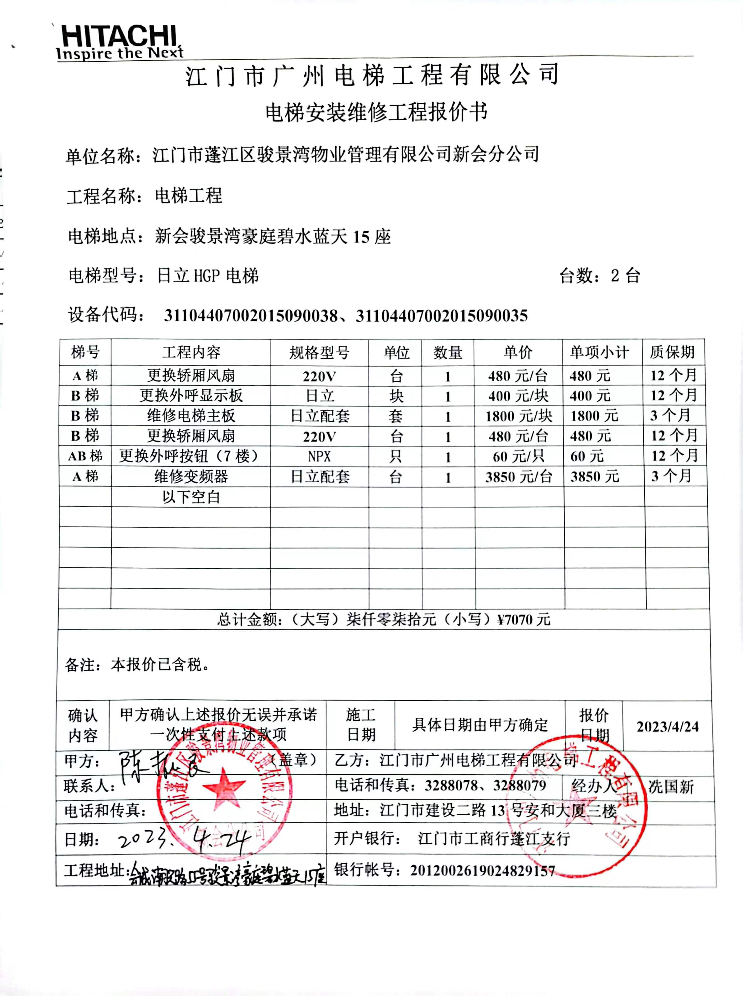 <td VALIGN="top" VALUES="" STYLE="border-width:0" BINDTYPE="0" ROWSPAN="19" COLSPAN="7" DATASOURCE="投票结果" ><font style="font-size:14pt;"><p style="white-space: normal; font-family: 宋体; line-height: 1.75em;">新会骏景湾豪庭碧水蓝天15座全体业主:</p><p style="white-space: normal; font-family: 宋体; line-height: 1.75em; text-indent: 2em;">本小区关于新会骏景湾豪庭碧水蓝天15座A电梯维修变频器、更换轿厢风扇;B电梯维修主板、更换1楼外呼显示板、轿厢风扇、7楼外呼按钮使用维修资金的投票的投票已表决结束,询异时间从2023年05月29日开始,投票询异公示期间,业主可通过微信查询自己的表决情况或可凭身份证件申请查询自己的表决情况;如公示的业主表决情况与查询的本人表决意见不一致的,可以以书面形式向投票组织机构申诉,投票组织机构予以纠正并重新公示表决结果。异议提出人对投票组织机构的处理仍有异议的,可以向街道办事处(镇人民政府)反映处理,涉及住宅专项维修资金的,可向属地住宅专项维修资金管理中心反映处理。</p><p style="white-space: normal;"><br/></p><p style="white-space: normal; font-family: 宋体; line-height: 1.75em;"><strong>附件:</strong></p><p style="white-space: normal; font-family: 宋体; line-height: 1.75em;"><strong>一、投票范围</strong></p><p style="white-space: normal; font-family: 宋体; line-height: 1.75em; text-indent: 2em;">新会骏景湾豪庭碧水蓝天15座</p><p style="white-space: normal; font-family: 宋体; line-height: 1.75em; text-indent: 2em;">总人数(专有部分人数之和):64</p><p style="white-space: normal; font-family: 宋体; line-height: 1.75em; text-indent: 2em;"><span style="font-family: 宋体, SimSun;">总户数:64</span></p><p style="white-space: normal; font-family: 宋体; line-height: 1.75em; text-indent: 2em;">建筑物总面积(专有部分面积之和):6834.44㎡</p><p style="white-space: normal; font-family: 宋体; line-height: 1.75em;"><strong>二、询异公示起止时间</strong></p><p dir="ltr" style="white-space: normal; font-family: 宋体; line-height: 1.75em; text-indent: 2em;"><span style="text-indent: 36px;">2023年05月29日至2023年06月04日</span></p><p style="white-space: normal; font-family: 宋体; line-height: 1.75em;"><strong>三、投票详细描述</strong></p><p style="white-space: normal; font-family: 宋体; line-height: 1.75em; text-indent: 2em;"><p>小区碧水蓝天15座的A电梯停止在楼层不运行,是由于变频器损坏,B电梯日常运行时出现同上同落,是由于B电梯主板故障,因使用时间较长,AB电梯轿厢风扇出现异响不运行,1楼外呼显示板和7楼外呼按钮损坏不能使用,已过保修期。</p><p>现需申请使用维修基金对碧水蓝天15座AB电梯进行维修,工程维修预算金额为7070元,项目最终费用以施工合同签订金额为准,维修费用的分摊标准为建筑面积分摊,每平方约:1.034466元,详见公示附件。如业主手机不能正常通过微信投票,请联系物业公司进行线下纸质投票,物业电话:0750-6179992</p><p><br/></p></p><p style="white-space: normal; font-family: 宋体; line-height: 1.75em;"><strong>四、计票规则</strong></p><p style="white-space: normal; font-family: 宋体; line-height: 1.75em; text-indent: 2em;">表决事项:使用建筑物及其附属设施的维修资金<br /><p style='text-align: left; font-family: 宋体; font-size: 16px; line-height: 1.75em; text-indent: 2em;'>计票规则:弃权票不并入其它项 未表决票不并入其它项</p></p><p style="white-space: normal; font-family: 宋体; line-height: 1.75em;"><strong>五、通过规则</strong></p><p style="white-space: normal; font-family: 宋体; line-height: 1.75em; text-indent: 2em;">表决事项:使用建筑物及其附属设施的维修资金<br /><p style='text-align: left; font-family: 宋体; font-size: 16px; line-height: 1.75em; text-indent: 2em;'>通过规则:参与表决专有部分面积过半数的业主且参与表决人数过半数的业主同意</p></p><p style="white-space: normal; font-family: 宋体; line-height: 1.75em;"><strong>六、投票结果</strong></p><p style="white-space: normal; font-family: 宋体; line-height: 1.75em; text-indent: 2em;"><div id='resultTable'><table style='table-layout: fixed; font-size:12px; margin-top:10px' width='100%' border='0' cellspacing='0' cellpadding='0'><tr><td height='28' colspan='10' align='center' style='border: 1px solid #666'><strong style='font-size: 14px;'> 使用建筑物及其附属设施的维修资金</strong></td> </tr><tr id='trfirst'><td height='28' colspan='4' style='border-left: 1px solid #666; border-bottom: 1px solid #666'><strong> 申报单位:</strong> 江门市蓬江区骏景湾物业管理有限公司新会分公司</td><td colspan='3' style='border-left: 1px solid #666; border-bottom: 1px solid #666'><strong> 联系方式:</strong> </td><td colspan='3' style='border-left: 1px solid #666; border-bottom: 1px solid #666; border-right: 1px solid #666'><strong> 申报日期:</strong> 2023年4月28日 </td></tr><tr> <td height='28' colspan='5' style='border-left: 1px solid #666; border-bottom: 1px solid #666'><strong> 总人数(专有部分人数之和):</strong>64人 </td><td colspan='5' style='border-left: 1px solid #666; border-bottom: 1px solid #666; border-right: 1px solid #666'><strong> 建筑物总面积(专有部分面积之和):</strong>6834.44㎡ </td> </tr><tr><td height='28' colspan='10' bgcolor='#F3F3F3' style='border-left: 1px solid #666;border-bottom: 1px solid #666;border-right: 1px solid #666'><strong> 参与人数及面积统计</strong></td></tr><tr><td height='28' colspan='5' style='border-left: 1px solid #666; border-bottom: 1px solid #666'><strong> 参与表决专有部分人数之和:</strong>48人</td><td colspan='5' style='border-left: 1px solid #666; border-bottom: 1px solid #6