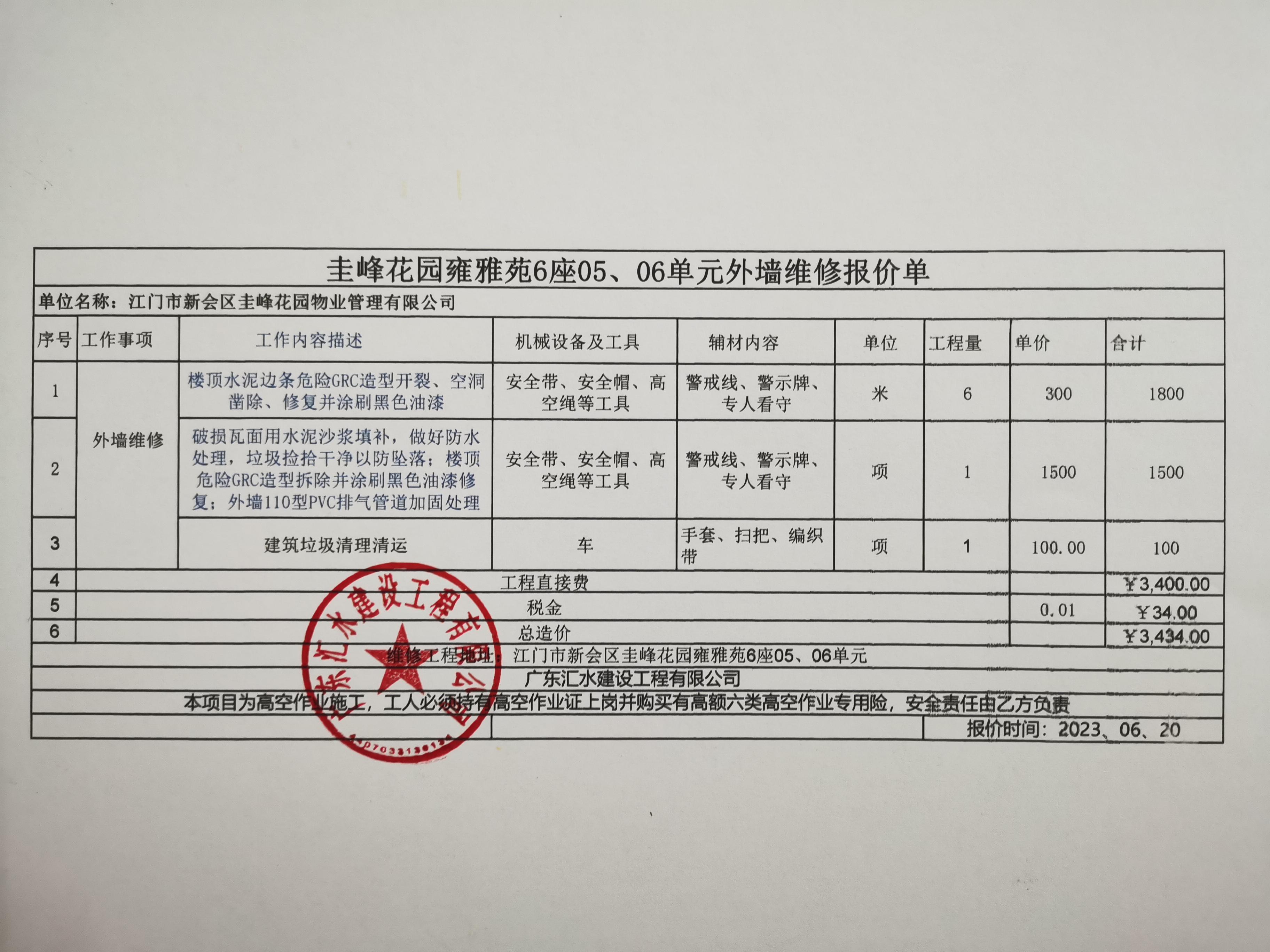 <td valign="top" values="" style="border-width:0" bindtype="0" rowspan="19" colspan="7" datasource="投票结果"><font style="font-size:14pt;"><p style="white-space: normal; font-family: 宋体; line-height: 1.75em;">圭峰花园圭峰花园雍雅苑6座全体业主:</p><p style="white-space: normal; font-family: 宋体; line-height: 1.75em; text-indent: 2em;">本小区关于圭峰花园雍雅苑6座0506单元外墙维修使用维修资金的投票的投票已表决结束,询异时间从2023年07月29日开始,投票询异公示期间,业主可通过微信查询自己的表决情况或可凭身份证件申请查询自己的表决情况;如公示的业主表决情况与查询的本人表决意见不一致的,可以以书面形式向投票组织机构申诉,投票组织机构予以纠正并重新公示表决结果。异议提出人对投票组织机构的处理仍有异议的,可以向街道办事处(镇人民政府)反映处理,涉及住宅专项维修资金的,可向属地住宅专项维修资金管理中心反映处理。</p><p style="white-space: normal;"><br></p><p style="white-space: normal; font-family: 宋体; line-height: 1.75em;"><strong>附件:</strong></p><p style="white-space: normal; font-family: 宋体; line-height: 1.75em;"><strong>一、投票范围</strong></p><p style="white-space: normal; font-family: 宋体; line-height: 1.75em; text-indent: 2em;">圭峰花园圭峰花园雍雅苑6座</p><p style="white-space: normal; font-family: 宋体; line-height: 1.75em; text-indent: 2em;">总人数(专有部分人数之和):18</p><p style="white-space: normal; font-family: 宋体; line-height: 1.75em; text-indent: 2em;"><span style="font-family: 宋体, SimSun;">总户数:18</span></p><p style="white-space: normal; font-family: 宋体; line-height: 1.75em; text-indent: 2em;">建筑物总面积(专有部分面积之和):2872.28㎡</p><p style="white-space: normal; font-family: 宋体; line-height: 1.75em;"><strong>二、询异公示起止时间</strong></p><p dir="ltr" style="white-space: normal; font-family: 宋体; line-height: 1.75em; text-indent: 2em;"><span style="text-indent: 36px;">2023年07月29日至2023年08月04日</span></p><p style="white-space: normal; font-family: 宋体; line-height: 1.75em;"><strong>三、投票详细描述</strong></p><p style="white-space: normal; font-family: 宋体; line-height: 1.75em; text-indent: 2em;"></p><p>圭峰花园雍雅苑 6 座0506的楼顶水泥边条开裂、剥落,经检查,是由于日久老化剥落,已过保修期。现需申请使用维修资金对雍雅苑6座0506单元外墙进行维修,工程维修预算金额为3434元,项目最终费用以施工合同签订金额为准。维修费用的分摊标准为按建筑面积分摊,每平方约1.1956元,详见公示附件。如业主手机不能正常通过微信投票,请联系物业公司进行线下纸质投票,物业联系电话:0750-6171066</p><p></p><p style="white-space: normal; font-family: 宋体; line-height: 1.75em;"><strong>四、计票规则</strong></p><p style="white-space: normal; font-family: 宋体; line-height: 1.75em; text-indent: 2em;">表决事项:使用建筑物及其附属设施的维修资金<br></p><p style="text-align: left; font-family: 宋体; font-size: 16px; line-height: 1.75em; text-indent: 2em;">计票规则:弃权票不并入其它项 未表决票不并入其它项</p><p></p><p style="white-space: normal; font-family: 宋体; line-height: 1.75em;"><strong>五、通过规则</strong></p><p style="white-space: normal; font-family: 宋体; line-height: 1.75em; text-indent: 2em;">表决事项:使用建筑物及其附属设施的维修资金<br></p><p style="text-align: left; font-family: 宋体; font-size: 16px; line-height: 1.75em; text-indent: 2em;">通过规则:参与表决专有部分面积过半数的业主且参与表决人数过半数的业主同意</p><p></p><p style="white-space: normal; font-family: 宋体; line-height: 1.75em;"><strong>六、投票结果</strong></p><p style="white-space: normal; font-family: 宋体; line-height: 1.75em; text-indent: 2em;"></p><div id="resultTable"><table style="table-layout: fixed; font-size:12px; margin-top:10px" width="100%" border="0" cellspacing="0" cellpadding="0"><tbody><tr><td height="28" colspan="10" align="center" style="border: 1px solid #666"><strong style="font-size: 14px;"> 使用建筑物及其附属设施的维修资金</strong></td> </tr><tr id="trfirst"><td height="28" colspan="4" style="border-left: 1px solid #666; border-bottom: 1px solid #666"><strong> 申报单位:</strong> 江门市新会区圭峰花园物业管理有限公司</td><td colspan="3" style="border-left: 1px solid #666; border-bottom: 1px solid #666"><strong> 联系方式:</strong> 7506171066 </td><td colspan="3" style="border-left: 1px solid #666; border-bottom: 1px solid #666; border-right: 1px solid #666"><strong> 申报日期:</strong> 2023年7月13日 </td></tr><tr> <td height="28" colspan="5" style="border-left: 1px solid #666; border-bottom: 1px solid #666"><strong> 总人数(专有部分人数之和):</strong>18人 </td><td colspan="5" style="border-left: 1px solid #666; border-bottom: 1px solid #666; border-right: 1px solid #666"><strong> 建筑物总面积(专有部分面积之和):</strong>2872.28㎡ </td> </tr><tr><td height="28" colspan="10" bgcolor="#F3F3F3" style="border-left: 1px solid #666;border-bottom: 1px solid #666;border-right: 1px solid #666"><strong> 参与人数及面积统计</strong></td></tr><tr><td height="28" colspan="5" style="border-left: 1px solid #666; border-bottom: 1px solid #666"><strong> 参与表决专有部分人数之和:</strong>13人</td><td colspan="5" style="border-left: 1px solid #666; border-bottom: 1px solid #666; border-right: 1px solid #666"><strong> 参与表决占有表决权总人数比例:</strong>72.22%</td></tr><tr><td height="28" colspan="5" style="border-left: 1px solid #666; border-bottom: 1px solid #666"><strong> 参与表决专有部分面积之和:</strong>209