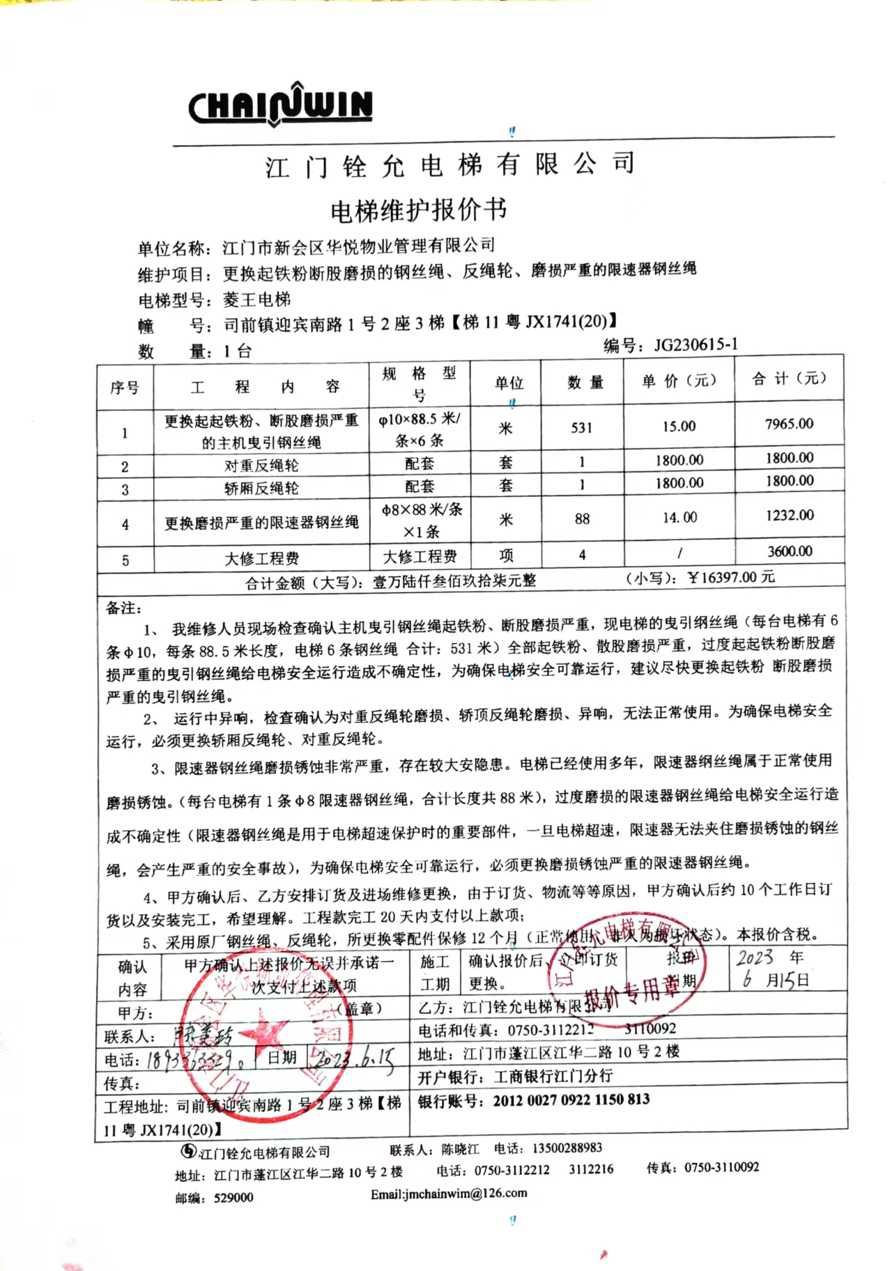 <td VALIGN="top" VALUES="" STYLE="border-width:0" BINDTYPE="0" ROWSPAN="19" COLSPAN="7" DATASOURCE="投票结果" ><font style="font-size:14pt;"><p style="white-space: normal; font-family: 宋体; line-height: 1.75em;">华悦城市花园司前镇迎宾南路1号2座全体业主:</p><p style="white-space: normal; font-family: 宋体; line-height: 1.75em; text-indent: 2em;">本小区关于华悦城市花园2座06至09单元{梯11粤JX1741(20)}更换起铁粉断股磨损的钢丝绳、反绳轮、磨损严重的限速器钢丝绳使用维修资金投票的投票已表决结束,询异时间从2023年06月22日开始,投票询异公示期间,业主可通过微信查询自己的表决情况或可凭身份证件申请查询自己的表决情况;如公示的业主表决情况与查询的本人表决意见不一致的,可以以书面形式向投票组织机构申诉,投票组织机构予以纠正并重新公示表决结果。异议提出人对投票组织机构的处理仍有异议的,可以向街道办事处(镇人民政府)反映处理,涉及住宅专项维修资金的,可向属地住宅专项维修资金管理中心反映处理。</p><p style="white-space: normal;"><br/></p><p style="white-space: normal; font-family: 宋体; line-height: 1.75em;"><strong>附件:</strong></p><p style="white-space: normal; font-family: 宋体; line-height: 1.75em;"><strong>一、投票范围</strong></p><p style="white-space: normal; font-family: 宋体; line-height: 1.75em; text-indent: 2em;">华悦城市花园司前镇迎宾南路1号2座</p><p style="white-space: normal; font-family: 宋体; line-height: 1.75em; text-indent: 2em;">总人数(专有部分人数之和):40</p><p style="white-space: normal; font-family: 宋体; line-height: 1.75em; text-indent: 2em;"><span style="font-family: 宋体, SimSun;">总户数:40</span></p><p style="white-space: normal; font-family: 宋体; line-height: 1.75em; text-indent: 2em;">建筑物总面积(专有部分面积之和):4626.02㎡</p><p style="white-space: normal; font-family: 宋体; line-height: 1.75em;"><strong>二、询异公示起止时间</strong></p><p dir="ltr" style="white-space: normal; font-family: 宋体; line-height: 1.75em; text-indent: 2em;"><span style="text-indent: 36px;">2023年06月22日至2023年06月28日</span></p><p style="white-space: normal; font-family: 宋体; line-height: 1.75em;"><strong>三、投票详细描述</strong></p><p style="white-space: normal; font-family: 宋体; line-height: 1.75em; text-indent: 2em;"><p>本小区 2座06至09单元的【梯11粤JX1741(20)】电梯在运行中异响,无法正常使用,经检查,是由于主机曳引轮钢丝绳起铁粉、散股磨损严重,过度起铁粉断股磨损严重的曳引轮钢丝绳给电梯造成不确定性,限速器钢丝绳磨损锈蚀非常严重,存在较大安全隐患,已过保修期。现需申请使用维修资金对2座06至09单元的【梯11粤JX1741(20)】电梯进行更新,工程维修预算金额为 16397元,项目最终费用以施工合同签订金额为准。维修费用的分摊标准为 3.54元/平方,详见公示附件。物业公司联系电话:18933633290。</p><p><br/></p></p><p style="white-space: normal; font-family: 宋体; line-height: 1.75em;"><strong>四、计票规则</strong></p><p style="white-space: normal; font-family: 宋体; line-height: 1.75em; text-indent: 2em;">表决事项:使用建筑物及其附属设施的维修资金<br /><p style='text-align: left; font-family: 宋体; font-size: 16px; line-height: 1.75em; text-indent: 2em;'>计票规则:弃权票不并入其它项 未表决票不并入其它项</p></p><p style="white-space: normal; font-family: 宋体; line-height: 1.75em;"><strong>五、通过规则</strong></p><p style="white-space: normal; font-family: 宋体; line-height: 1.75em; text-indent: 2em;">表决事项:使用建筑物及其附属设施的维修资金<br /><p style='text-align: left; font-family: 宋体; font-size: 16px; line-height: 1.75em; text-indent: 2em;'>通过规则:参与表决专有部分面积过半数的业主且参与表决人数过半数的业主同意</p></p><p style="white-space: normal; font-family: 宋体; line-height: 1.75em;"><strong>六、投票结果</strong></p><p style="white-space: normal; font-family: 宋体; line-height: 1.75em; text-indent: 2em;"><div id='resultTable'><table style='table-layout: fixed; font-size:12px; margin-top:10px' width='100%' border='0' cellspacing='0' cellpadding='0'><tr><td height='28' colspan='10' align='center' style='border: 1px solid #666'><strong style='font-size: 14px;'> 使用建筑物及其附属设施的维修资金</strong></td> </tr><tr id='trfirst'><td height='28' colspan='4' style='border-left: 1px solid #666; border-bottom: 1px solid #666'><strong> 申报单位:</strong> 江门市新会区华悦物业管理有限公司</td><td colspan='3' style='border-left: 1px solid #666; border-bottom: 1px solid #666'><strong> 联系方式:</strong> 07506566123 </td><td colspan='3' style='border-left: 1px solid #666; border-bottom: 1px solid #666; border-right: 1px solid #666'><strong> 申报日期:</strong> 2023年6月20日 </td></tr><tr> <td height='28' colspan='5' style='border-left: 1px solid #666; border-bottom: 1px solid #666'><strong> 总人数(专有部分人数之和):</strong>40人 </td><td colspan='5' style='border-left: 1px solid #666; border-bottom: 1px solid #666; border-right: 1px solid #666'><strong> 建筑物总面积(专有部分面积之和):</strong>4626.02㎡ </td> </tr><tr><td height='28' colspan='10' bgcolor='#F3F3F3' style='border-left: 1px solid #666;border-bottom: 1px solid #666;border-right: 1px solid #666'><strong> 参与人数及面积统计</strong></td></tr><tr><td height='28' colspan='5' style='border-left: 1px solid #666; border-bottom: 1px solid #666'><strong> 参与表决专有部分人数之和:</strong>30人</td><td colspan='5' style='border-left: 1px solid #666; border-bottom: 1px solid #666; border-right: 1px solid #666'><strong> 参