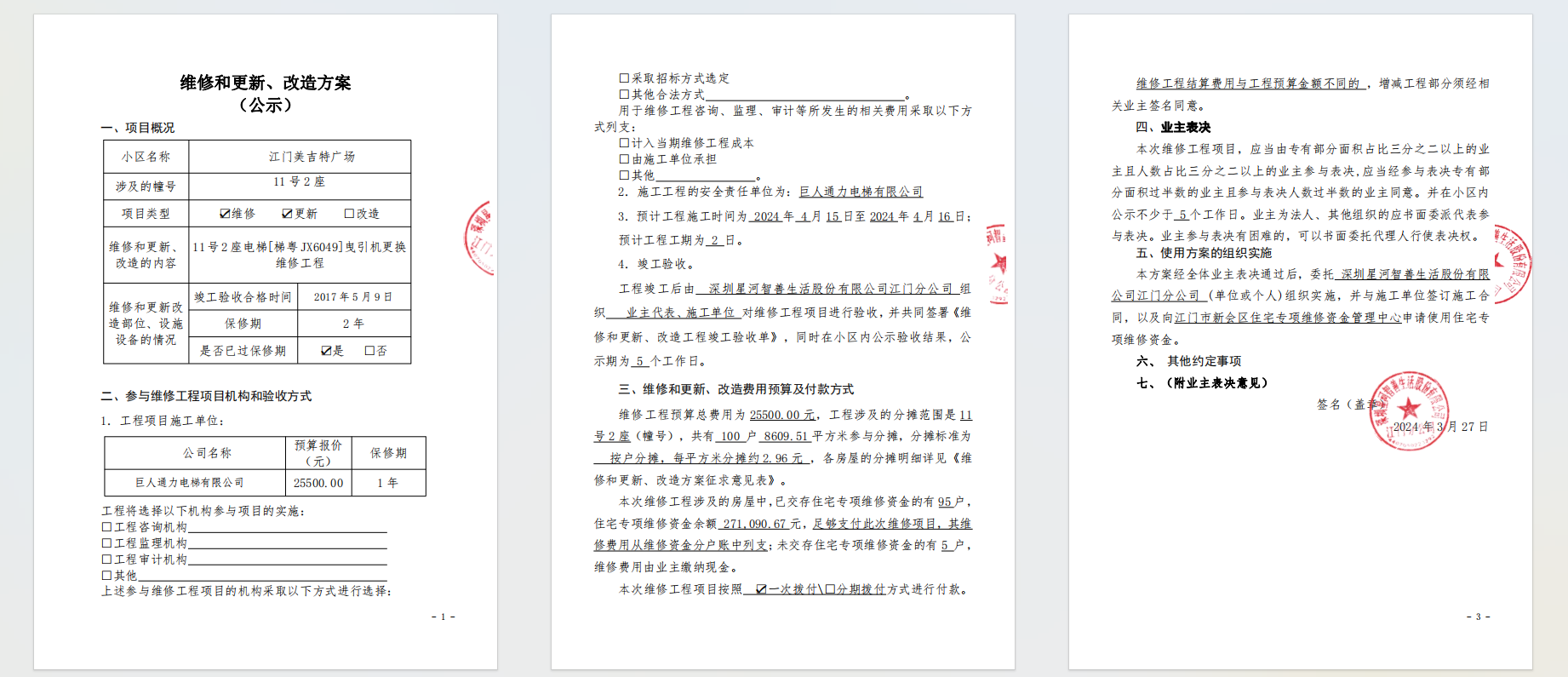 <td VALIGN="top" VALUES="" STYLE="border-width:0" BINDTYPE="0" ROWSPAN="17" COLSPAN="7" DATASOURCE="投票结果" ><font style=" font-family:方正小标宋简体;font-size:14pt;"><p style="line-height: 1.75em;"><span style="font-family: 宋体, SimSun;">各位尊敬的业主:</span><br/></p><p style="text-indent: 2em; line-height: 1.75em;"><span style="font-family: 宋体, SimSun;">根据法律法规的规定,本小区业主利用“江门市物业事项表决管理系统”已对本小区公共事务决策事项进行了表决,在经过7日的询异公示期后,未收到业主有效的异议。现将投票结果公告,并就产生的法律效力说明如下:</span></p><p style="line-height: 1.75em; text-indent: 0em;"><strong style="text-indent: 2em;"><span style="font-family: 宋体, SimSun;">一、投票范围</span></strong></p><p style="text-indent: 2em; line-height: 1.75em;"><span style="font-family: 宋体, SimSun;">江门美吉特广场会城启超大道11号2座</span></p><p style="text-indent: 2em; line-height: 1.75em;"><span style="font-family: 宋体, SimSun;">总人数(专有部分人数之和):97</span></p><p style="text-indent: 2em; line-height: 1.75em;"><span style="font-family: 宋体, SimSun;"><span style="font-family: 宋体, SimSun; text-indent: 32px;"><span style="font-family: 宋体; text-indent: 32px;"><span style="font-family: 宋体; text-indent: 32px;">总户数:100</span></span></span></span></p><p style="text-indent: 2em; line-height: 1.75em;"><span style="font-family: 宋体, SimSun;">建筑物总面积(专有部分面积之和):8609.51㎡</span></p><p style="line-height: 1.75em;"><strong><span style="font-family: 宋体, SimSun;">二、投票结果公告时间</span></strong></p><p style="text-indent: 2em; line-height: 1.75em;"><span style="font-family: 宋体, SimSun;">从2024年04月16日开始</span></p><p style="line-height: 1.75em;"><strong><span style="font-family: 宋体, SimSun;">三、计票规则</span></strong></p><p style="text-indent: 2em; line-height: 1.75em;"><span style="font-family: 宋体, SimSun;">表决事项:使用建筑物及其附属设施的维修资金<br /><p style='font-family: 宋体, SimSun;line-height: 1.75em; text-indent: 2em;'>计票规则:弃权票不并入其它项&nbsp;&nbsp;&nbsp;&nbsp;未表决票不并入其它项</p></span></p><p style="line-height: 1.75em;"><strong><span style="font-family: 宋体, SimSun;">四、通过规则</span></strong></p><p style="line-height: 1.75em;"><strong><span style="font-family: 宋体, SimSun;">&nbsp; 根据《中华人民共和国民法典》第二百七十八条规定:业主共同决定事项,应当由专有部分面积占比三分之二以上的业主且人数占比三分之二以上的业主参与表决。</span></strong></p><p style="text-indent: 2em; line-height: 1.75em;"><span style="font-family: 宋体, SimSun;"><span style="font-family: 宋体, SimSun; text-indent: 32px;">表决事项:使用建筑物及其附属设施的维修资金<br /><p style='font-family: 宋体, SimSun;line-height: 1.75em; text-indent: 2em;'>通过规则:双2/3以上参与表决,参与表决双过半同意</p></span></span></p><p style="line-height: 1.75em;"><strong><span style="font-family: 宋体, SimSun;">五、投票结果</span></strong></p><p style="line-height: 1.75em; text-indent: 2em;"><span style="font-family: 宋体, SimSun; text-indent: 2em;"><div id='resultTable'><table style='table-layout: fixed; font-size:12px; margin-top:10px' width='100%' border='0' cellspacing='0' cellpadding='0'><tr><td height='28' colspan='10' align='center' style='border: 1px solid #666'><strong style='font-size: 14px;'> 使用建筑物及其附属设施的维修资金</strong></td> </tr><tr id='trfirst'><td height='28' colspan='4' style='border-left: 1px solid #666; border-bottom: 1px solid #666'><strong>&nbsp;申报单位:</strong> 深圳星河智善生活股份有限公司江门分公司</td><td colspan='3' style='border-left: 1px solid #666; border-bottom: 1px solid #666'><strong>&nbsp;联系方式:</strong> (0750) 3871336 3829717 </td><td colspan='3' style='border-left: 1px solid #666; border-bottom: 1px solid #666; border-right: 1px solid #666'><strong>&nbsp;申报日期:</strong> 2024年3月27日 </td></tr><tr> <td height='28' colspan='5' style='border-left: 1px solid #666; border-bottom: 1px solid #666'><strong>&nbsp;列支总人数(专有部分人数之和):</strong>97人 </td><td colspan='5' style='border-left: 1px solid #666; border-bottom: 1px solid #666; border-right: 1px solid #666'><strong>&nbsp;列支建筑物总面积(专有部分面积之和):</strong>8609.51㎡ </td> </tr><tr><td height='28' colspan='10' bgcolor='#F3F3F3' style='border-left: 1px solid #666;border-bottom: 1px solid #666;border-right: 1px solid #666'><strong>&nbsp;参与表决人数及面积统计</strong></td></tr><tr><td height='28' colspan='5' style='border-left: 1px solid #666; border-bottom: 1px solid #666'><strong>&nbsp;参与表决人数:</strong>69人</td><td colspan='5' style='border-left: 1px solid #666; border-bottom: 1px solid #666; border-right: 1px solid #666'><strong>&nbsp;参与表决人数占总人数比例:</strong>71.13%</td></tr><tr><td height='28' colspan='5' style='border-left: 1px solid #666; border-bottom: 1px solid #666'><strong>&nbsp;参与表决面积:</strong>6175.88㎡</td><td colspan='5' style='border-left: 1px solid #666; border-bottom: 1px solid #666; border-right: 1px solid #666'><strong>&nbsp;参与表决面积占总面积比例:</strong>71.73%</td></tr><tr><td height='28' colspan='10' bgcolor='#F3F3F3' style='border-left: 1px solid #666; border-bottom: 1px solid #666;border-right: 1px solid #666'> <strong>&nbsp;参与表决同意人数及面积统计</strong></td> </tr><tr><td height='28' colspan='5' style='border-left: 1px solid #666; border-bottom: 1px solid #666'><strong>&nbsp;参与表决同意人数:</strong>67人 </td><td colspan='5' style='border-left: 1px solid #666; border-bottom: 1px solid #