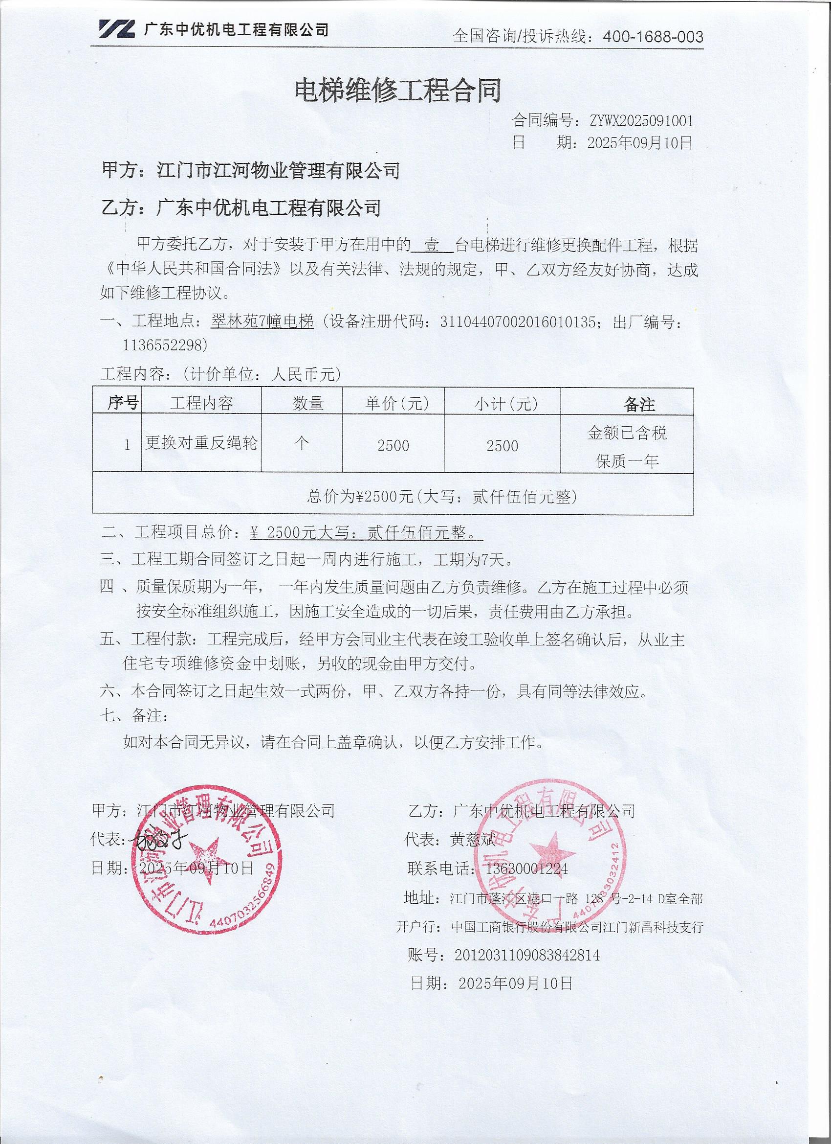 <td VALIGN="top" VALUES="" STYLE="border-width:0" BINDTYPE="0" ROWSPAN="19" COLSPAN="7" DATASOURCE="投票结果" ><font style="font-size:14pt;"><p style="white-space: normal; font-family: 宋体; line-height: 1.75em;">翠林苑蓬江区翠林苑7幢全体业主:</p><p style="white-space: normal; font-family: 宋体; line-height: 1.75em; text-indent: 2em;">本小区关于翠林苑小区7幢电梯更换对重反绳轮使用维修资金的投票的投票已表决结束,询异时间从2025年11月04日开始,投票询异公示期间,业主可通过微信查询自己的表决情况或可凭身份证件申请查询自己的表决情况;如公示的业主表决情况与查询的本人表决意见不一致的,可以以书面形式向投票组织机构申诉,投票组织机构予以纠正并重新公示表决结果。异议提出人对投票组织机构的处理仍有异议的,可以向街道办事处(镇人民政府)反映处理,涉及住宅专项维修资金的,可向属地住宅专项维修资金管理中心反映处理。</p><p style="white-space: normal;"><br/></p><p style="white-space: normal; font-family: 宋体; line-height: 1.75em;"><strong>附件:</strong></p><p style="white-space: normal; font-family: 宋体; line-height: 1.75em;"><strong>一、投票范围</strong></p><p style="white-space: normal; font-family: 宋体; line-height: 1.75em; text-indent: 2em;">翠林苑蓬江区翠林苑7幢</p><p style="white-space: normal; font-family: 宋体; line-height: 1.75em; text-indent: 2em;">总人数(专有部分人数之和):40</p><p style="white-space: normal; font-family: 宋体; line-height: 1.75em; text-indent: 2em;"><span style="font-family: 宋体, SimSun;"><span style="font-family: 宋体; text-indent: 32px;"><span style="font-family: 宋体; text-indent: 32px;">总户数:40</span></span></span></p><p style="white-space: normal; font-family: 宋体; line-height: 1.75em; text-indent: 2em;">建筑物总面积(专有部分面积之和):4175.98㎡</p><p style="white-space: normal; font-family: 宋体; line-height: 1.75em;"><strong>二、询异公示起止时间</strong></p><p dir="ltr" style="white-space: normal; font-family: 宋体; line-height: 1.75em; text-indent: 2em;"><span style="text-indent: 36px;">2025年11月04日至2025年11月14日</span></p><p style="white-space: normal; font-family: 宋体; line-height: 1.75em;"><strong>三、投票详细描述</strong></p><p style="white-space: normal; font-family: 宋体; line-height: 1.75em; text-indent: 2em;"><p>翠林苑小区7幢电梯运行时业主发现有异常响声,经电梯维保师傅检查,是由于对重反绳轮损坏造成,需要停梯更换配件后方可正常运行。</p><p> 现对7幢之一电梯进行维修更换,工程维修预算金额为2500元,项目最终费用以施工合同签订金额为准。因已过保修期,维修费用由相关业主按分户分摊,每户分摊62.5元,详见公示附件。如业主手机不能正常通过微信投票,请联系物业公司进行线下纸质投票,物业电话:3221022。</p><p><br/></p></p><p style="white-space: normal; font-family: 宋体; line-height: 1.75em;"><strong>四、计票规则</strong></p><p style="white-space: normal; font-family: 宋体; line-height: 1.75em; text-indent: 2em;">表决事项:翠林苑小区7幢电梯更换对重反绳轮的投票<br /><p style='text-align: left; font-family: 宋体; font-size: 16px; line-height: 1.75em; text-indent: 2em;'>计票规则:弃权票不并入其它项 未表决票不并入其它项</p></p><p style="white-space: normal; font-family: 宋体; line-height: 1.75em;"><strong>五、通过规则</strong></p><p style="white-space: normal; font-family: 宋体; line-height: 1.75em;"><strong><strong style="white-space: normal;"><span style="font-family: 宋体, SimSun;"> 根据《中华人民共和国民法典》第二百七十八条规定:业主共同决定事项,应当由专有部分面积占比三分之二以上的业主且人数占比三分之二以上的业主参与表决。</span></strong></strong></p><p style="white-space: normal; font-family: 宋体; line-height: 1.75em; text-indent: 2em;">表决事项:翠林苑小区7幢电梯更换对重反绳轮的投票<br /><p style='text-align: left; font-family: 宋体; font-size: 16px; line-height: 1.75em; text-indent: 2em;'>通过规则:双2/3以上参与表决,参与表决双过半同意</p></p><p style="white-space: normal; font-family: 宋体; line-height: 1.75em;"><strong>六、投票结果</strong></p><p style="white-space: normal; font-family: 宋体; line-height: 1.75em; text-indent: 2em;"><div id='resultTable'><table style='table-layout: fixed; font-size:12px; margin-top:10px' width='100%' border='0' cellspacing='0' cellpadding='0'><tr><td height='28' colspan='10' align='center' style='border: 1px solid #666'><strong style='font-size: 14px;'> 翠林苑小区7幢电梯更换对重反绳轮的投票</strong></td> </tr><tr id='trfirst'><td height='28' colspan='4' style='border-left: 1px solid #666; border-bottom: 1px solid #666'><strong> 申报单位:</strong> 江门市江河物业管理有限公司</td><td colspan='3' style='border-left: 1px solid #666; border-bottom: 1px solid #666'><strong> 联系方式:</strong> 3221022 </td><td colspan='3' style='border-left: 1px solid #666; border-bottom: 1px solid #666; border-right: 1px solid #666'><strong> 申报日期:</strong> 2025年9月11日 </td></tr><tr> <td height='28' colspan='5' style='border-left: 1px solid #666; border-bottom: 1px solid #666'><strong> 总人数(专有部分人数之和):</strong>40人 </td><td colspan='5' style='border-left: 1px solid #666; border-bottom: 1px solid #666; border-right: 1px solid #666'><strong> 建筑物总面积(专有部分面积之和):</strong>4175.98㎡ </td> </tr><tr><td height='28' colspan='10' bgcolor='#F3F3F3' style='border-left: 1px solid #666;border-bottom: 1px solid #666;border-right: 1px solid #666'><strong> 参与人数及面积统计</strong></td></tr><tr><td height='28' colsp