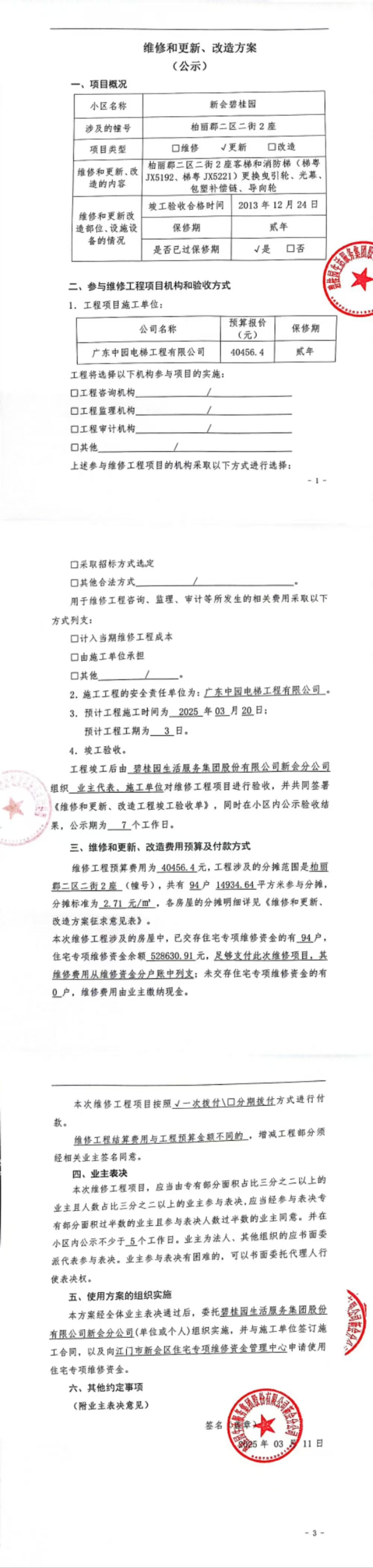 <td VALIGN="top" VALUES="" STYLE="border-width:0" BINDTYPE="0" ROWSPAN="17" COLSPAN="7" DATASOURCE="投票结果" ><font style=" font-family:方正小标宋简体;font-size:14pt;"><p style="line-height: 1.75em;"><span style="font-family: 宋体, SimSun;">各位尊敬的业主:</span><br/></p><p style="text-indent: 2em; line-height: 1.75em;"><span style="font-family: 宋体, SimSun;">根据法律法规的规定,本小区业主利用“江门市物业事项表决管理系统”已对本小区公共事务决策事项进行了表决,在经过7日的询异公示期后,未收到业主有效的异议。现将投票结果公告,并就产生的法律效力说明如下:</span></p><p style="line-height: 1.75em; text-indent: 0em;"><strong style="text-indent: 2em;"><span style="font-family: 宋体, SimSun;">一、投票范围</span></strong></p><p style="text-indent: 2em; line-height: 1.75em;"><span style="font-family: 宋体, SimSun;">新会碧桂园碧桂园柏丽郡二区二街2座</span></p><p style="text-indent: 2em; line-height: 1.75em;"><span style="font-family: 宋体, SimSun;">总人数(专有部分人数之和):94</span></p><p style="text-indent: 2em; line-height: 1.75em;"><span style="font-family: 宋体, SimSun;"><span style="font-family: 宋体, SimSun; text-indent: 32px;"><span style="font-family: 宋体; text-indent: 32px;"><span style="font-family: 宋体; text-indent: 32px;">总户数:94</span></span></span></span></p><p style="text-indent: 2em; line-height: 1.75em;"><span style="font-family: 宋体, SimSun;">建筑物总面积(专有部分面积之和):14934.64㎡</span></p><p style="line-height: 1.75em;"><strong><span style="font-family: 宋体, SimSun;">二、投票结果公告时间</span></strong></p><p style="text-indent: 2em; line-height: 1.75em;"><span style="font-family: 宋体, SimSun;"><span style="font-family: 宋体, SimSun; text-indent: 32px;">从2025年03月26日开始</span></span></p><p style="line-height: 1.75em;"><strong><span style="font-family: 宋体, SimSun;">三、计票规则</span></strong></p><p style="text-indent: 2em; line-height: 1.75em;"><span style="font-family: 宋体, SimSun;">表决事项:使用建筑物及其附属设施的维修资金<br /><p style='font-family: 宋体, SimSun;line-height: 1.75em; text-indent: 2em;'>计票规则:弃权票不并入其它项&nbsp;&nbsp;&nbsp;&nbsp;未表决票不并入其它项</p></span></p><p style="line-height: 1.75em;"><strong><span style="font-family: 宋体, SimSun;">四、通过规则</span></strong></p><p style="line-height: 1.75em;"><strong><span style="font-family: 宋体, SimSun;">&nbsp; 根据《中华人民共和国民法典》第二百七十八条规定:业主共同决定事项,应当由专有部分面积占比三分之二以上的业主且人数占比三分之二以上的业主参与表决。</span></strong></p><p style="text-indent: 2em; line-height: 1.75em;"><span style="font-family: 宋体, SimSun;"><span style="font-family: 宋体, SimSun; text-indent: 32px;">表决事项:使用建筑物及其附属设施的维修资金<br /><p style='font-family: 宋体, SimSun;line-height: 1.75em; text-indent: 2em;'>通过规则:双2/3以上参与表决,参与表决双过半同意</p></span></span></p><p style="line-height: 1.75em;"><strong><span style="font-family: 宋体, SimSun;">五、投票结果</span></strong></p><p style="line-height: 1.75em; text-indent: 2em;"><span style="font-family: 宋体, SimSun; text-indent: 2em;"><div id='resultTable'><table style='table-layout: fixed; font-size:12px; margin-top:10px' width='100%' border='0' cellspacing='0' cellpadding='0'><tr><td height='28' colspan='10' align='center' style='border: 1px solid #666'><strong style='font-size: 14px;'> 使用建筑物及其附属设施的维修资金</strong></td> </tr><tr id='trfirst'><td height='28' colspan='4' style='border-left: 1px solid #666; border-bottom: 1px solid #666'><strong>&nbsp;申报单位:</strong> 碧桂园生活服务集团股份有限公司新会分公司</td><td colspan='3' style='border-left: 1px solid #666; border-bottom: 1px solid #666'><strong>&nbsp;联系方式:</strong> </td><td colspan='3' style='border-left: 1px solid #666; border-bottom: 1px solid #666; border-right: 1px solid #666'><strong>&nbsp;申报日期:</strong> 2025年3月13日 </td></tr><tr> <td height='28' colspan='5' style='border-left: 1px solid #666; border-bottom: 1px solid #666'><strong>&nbsp;列支总人数(专有部分人数之和):</strong>94人 </td><td colspan='5' style='border-left: 1px solid #666; border-bottom: 1px solid #666; border-right: 1px solid #666'><strong>&nbsp;列支建筑物总面积(专有部分面积之和):</strong>14934.64㎡ </td> </tr><tr><td height='28' colspan='10' bgcolor='#F3F3F3' style='border-left: 1px solid #666;border-bottom: 1px solid #666;border-right: 1px solid #666'><strong>&nbsp;参与表决人数及面积统计</strong></td></tr><tr><td height='28' colspan='5' style='border-left: 1px solid #666; border-bottom: 1px solid #666'><strong>&nbsp;参与表决人数:</strong>66人</td><td colspan='5' style='border-left: 1px solid #666; border-bottom: 1px solid #666; border-right: 1px solid #666'><strong>&nbsp;参与表决人数占总人数比例:</strong>70.21%</td></tr><tr><td height='28' colspan='5' style='border-left: 1px solid #666; border-bottom: 1px solid #666'><strong>&nbsp;参与表决面积:</strong>10685.85㎡</td><td colspan='5' style='border-left: 1px solid #666; border-bottom: 1px solid #666; border-right: 1px solid #666'><strong>&nbsp;参与表决面积占总面积比例:</strong>71.55%</td></tr><tr><td height='28' colspan='10' bgcolor='#F3F3F3' style='border-left: 1px solid #666; border-bottom: 1px solid #666;border-right: 1px solid #666'> <strong>&nbsp;参与表决同意人数及面积统计</strong></td> </tr><tr><td height='28' colspan='5' style='border-left: 1px solid #666; border-bottom: 1px solid #666'><strong>&nbsp;参与表决同意人数:</strong>63人 </td><td colspan='5' style='bor