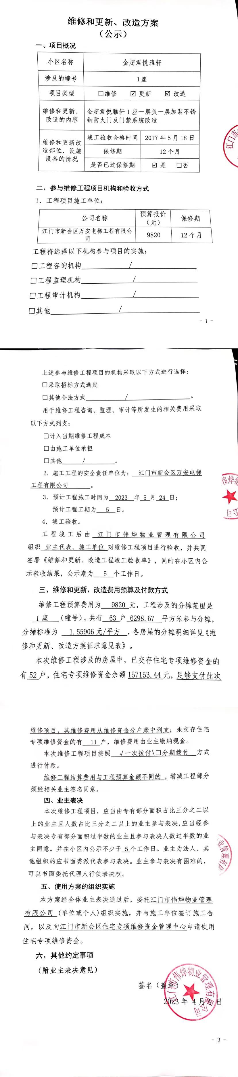 <td valign="top" values="" style="border-width:0" bindtype="0" rowspan="17" colspan="7" datasource="投票结果"><font style=" font-family:方正小标宋简体;font-size:14pt;"><p style="line-height: 1.75em;"><span style="font-family: 宋体, SimSun;">各位尊敬的业主:</span><br></p><p style="text-indent: 2em; line-height: 1.75em;"><span style="font-family: 宋体, SimSun;">根据法律法规的规定,本小区业主利用“物业公共事务决策系统”已对本小区公共事务决策事项进行了表决,在经过7日的询异公示期后,未收到业主有效的异议。现将投票结果公告,并就产生的法律效力说明如下:</span></p><p style="line-height: 1.75em; text-indent: 0em;"><strong style="text-indent: 2em;"><span style="font-family: 宋体, SimSun;">一、投票范围</span></strong></p><p style="text-indent: 2em; line-height: 1.75em;"><span style="font-family: 宋体, SimSun;">金超君悦雅轩1座</span></p><p style="text-indent: 2em; line-height: 1.75em;"><span style="font-family: 宋体, SimSun;">总人数(专有部分人数之和):62</span></p><p style="text-indent: 2em; line-height: 1.75em;"><span style="font-family: 宋体, SimSun;"><span style="font-family: 宋体, SimSun; text-indent: 32px;">总户数:63</span></span></p><p style="text-indent: 2em; line-height: 1.75em;"><span style="font-family: 宋体, SimSun;">建筑物总面积(专有部分面积之和):6298.67㎡</span></p><p style="line-height: 1.75em;"><strong><span style="font-family: 宋体, SimSun;">二、投票起止时间</span></strong></p><p style="text-indent: 2em; line-height: 1.75em;"><span style="font-family: 宋体, SimSun;">投票表决时间:从2023年04月06日到2023年07月05日止</span></p><p style="text-indent: 2em; line-height: 1.75em;"><span style="font-family: 宋体, SimSun;">投票询异公示时间:从2023年07月06日开始</span></p><p style="text-indent: 2em; line-height: 1.75em;"><span style="font-family: 宋体, SimSun;">投票结果通知公告时间:从2023年07月13日开始</span></p><p style="line-height: 1.75em;"><strong><span style="font-family: 宋体, SimSun;">三、计票规则</span></strong></p><p style="text-indent: 2em; line-height: 1.75em;"><span style="font-family: 宋体, SimSun;">表决事项:使用建筑物及其附属设施的维修资金<br></span></p><p style="font-family: 宋体, SimSun;line-height: 1.75em; text-indent: 2em;">计票规则:弃权票不并入其它项 未表决票不并入其它项</p><p></p><p style="line-height: 1.75em;"><strong><span style="font-family: 宋体, SimSun;">四、通过规则</span></strong></p><p style="text-indent: 2em; line-height: 1.75em;"><span style="font-family: 宋体, SimSun;"><span style="font-family: 宋体, SimSun; text-indent: 32px;">表决事项:使用建筑物及其附属设施的维修资金<br></span></span></p><p style="font-family: 宋体, SimSun;line-height: 1.75em; text-indent: 2em;">通过规则:参与表决专有部分面积过半数的业主且参与表决人数过半数的业主同意</p><p></p><p style="line-height: 1.75em;"><strong><span style="font-family: 宋体, SimSun;">五、投票结果</span></strong></p><p style="line-height: 1.75em; text-indent: 2em;"><span style="font-family: 宋体, SimSun; text-indent: 2em;"></span></p><div id="resultTable"><table style="table-layout: fixed; font-size:12px; margin-top:10px" width="100%" border="0" cellspacing="0" cellpadding="0"><tbody><tr><td height="28" colspan="10" align="center" style="border: 1px solid #666"><strong style="font-size: 14px;"> 使用建筑物及其附属设施的维修资金</strong></td> </tr><tr id="trfirst"><td height="28" colspan="4" style="border-left: 1px solid #666; border-bottom: 1px solid #666"><strong> 申报单位:</strong> 江门市伟烨物业管理有限公司</td><td colspan="3" style="border-left: 1px solid #666; border-bottom: 1px solid #666"><strong> 联系方式:</strong> 0750-6123828 </td><td colspan="3" style="border-left: 1px solid #666; border-bottom: 1px solid #666; border-right: 1px solid #666"><strong> 申报日期:</strong> 2023年4月6日 </td></tr><tr> <td height="28" colspan="5" style="border-left: 1px solid #666; border-bottom: 1px solid #666"><strong> 总人数(专有部分人数之和):</strong>62人 </td><td colspan="5" style="border-left: 1px solid #666; border-bottom: 1px solid #666; border-right: 1px solid #666"><strong> 建筑物总面积(专有部分面积之和):</strong>6298.67㎡ </td> </tr><tr><td height="28" colspan="10" bgcolor="#F3F3F3" style="border-left: 1px solid #666;border-bottom: 1px solid #666;border-right: 1px solid #666"><strong> 参与人数及面积统计</strong></td></tr><tr><td height="28" colspan="5" style="border-left: 1px solid #666; border-bottom: 1px solid #666"><strong> 参与表决专有部分人数之和:</strong>24人</td><td colspan="5" style="border-left: 1px solid #666; border-bottom: 1px solid #666; border-right: 1px solid #666"><strong> 参与表决占有表决权总人数比例:</strong>38.71%</td></tr><tr><td height="28" colspan="5" style="border-left: 1px solid #666; border-bottom: 1px solid #666"><strong> 参与表决专有部分面积之和:</strong>2401.90㎡</td><td colspan="5" style="border-left: 1px solid #666; border-bottom: 1px solid #666; border-right: 1px solid #666"><strong> 参与表决占有表决权总面积比例:</strong>38.13%</td></tr><tr><td height="28" colspan="10" bgcolor="#F3F3F3" style="border-left: 1px solid #666; border-bottom: 1px solid #666;border-right: 1px solid #666"> <strong> 未参与人数及面积统计</strong></td> </tr><tr><td height="28" colspan="5" style="border-left: 1px solid #666; border-bottom: 1px solid #666"><strong> 未参与表决专有部分人数之和:</strong>38人 </td><td colspan="5" style="border-left: 1px solid #666; border-bottom: 1px solid #666; border-right: 1px solid #666"><strong> 未参与表决占有表决权总人数比例:</strong>61.29%</td></tr><tr><td height="28" colspan=