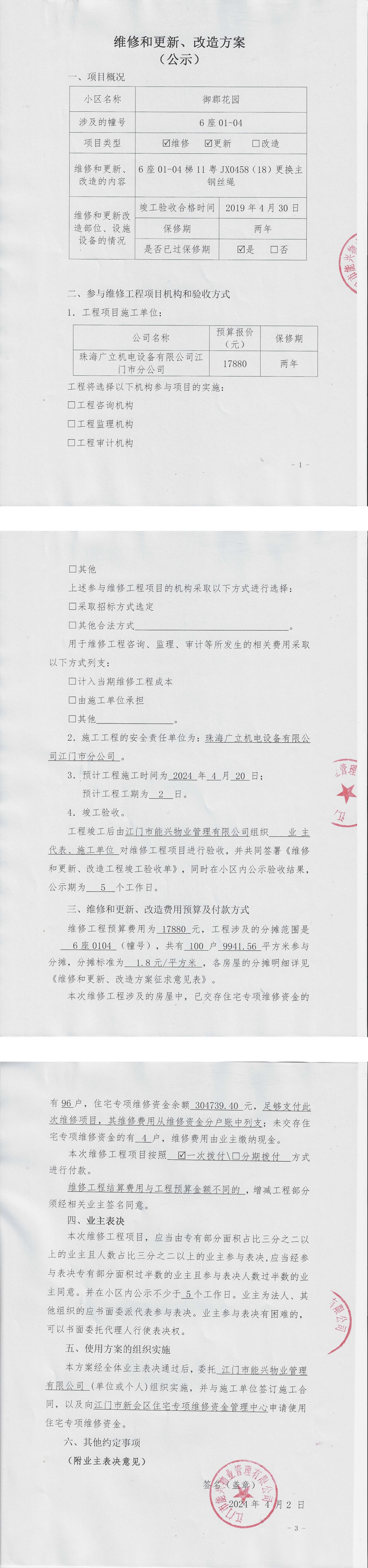 <td VALIGN="top" VALUES="" STYLE="border-width:0" BINDTYPE="0" ROWSPAN="19" COLSPAN="7" DATASOURCE="投票结果" ><font style="font-size:14pt;"><p style="white-space: normal; font-family: 宋体; line-height: 1.75em;">御郡花园御郡花园6座全体业主:</p><p style="white-space: normal; font-family: 宋体; line-height: 1.75em; text-indent: 2em;">本小区关于御郡花园6座01-04单元梯11粤JX0458(18)更换主钢丝绳使用维修资金的投票的投票已表决结束,询异时间从2024年04月20日开始,投票询异公示期间,业主可通过微信查询自己的表决情况或可凭身份证件申请查询自己的表决情况;如公示的业主表决情况与查询的本人表决意见不一致的,可以以书面形式向投票组织机构申诉,投票组织机构予以纠正并重新公示表决结果。异议提出人对投票组织机构的处理仍有异议的,可以向街道办事处(镇人民政府)反映处理,涉及住宅专项维修资金的,可向属地住宅专项维修资金管理中心反映处理。</p><p style="white-space: normal;"><br/></p><p style="white-space: normal; font-family: 宋体; line-height: 1.75em;"><strong>附件:</strong></p><p style="white-space: normal; font-family: 宋体; line-height: 1.75em;"><strong>一、投票范围</strong></p><p style="white-space: normal; font-family: 宋体; line-height: 1.75em; text-indent: 2em;">御郡花园御郡花园6座</p><p style="white-space: normal; font-family: 宋体; line-height: 1.75em; text-indent: 2em;">总人数(专有部分人数之和):100</p><p style="white-space: normal; font-family: 宋体; line-height: 1.75em; text-indent: 2em;"><span style="font-family: 宋体, SimSun;"><span style="font-family: 宋体; text-indent: 32px;"><span style="font-family: 宋体; text-indent: 32px;">总户数:100</span></span></span></p><p style="white-space: normal; font-family: 宋体; line-height: 1.75em; text-indent: 2em;">建筑物总面积(专有部分面积之和):9941.56㎡</p><p style="white-space: normal; font-family: 宋体; line-height: 1.75em;"><strong>二、询异公示起止时间</strong></p><p dir="ltr" style="white-space: normal; font-family: 宋体; line-height: 1.75em; text-indent: 2em;"><span style="text-indent: 36px;">2024年04月20日至2024年04月26日</span></p><p style="white-space: normal; font-family: 宋体; line-height: 1.75em;"><strong>三、投票详细描述</strong></p><p style="white-space: normal; font-family: 宋体; line-height: 1.75em; text-indent: 2em;"><p> 小区6座01-04单元梯11粤JX0458(18)运行时出现异响,经检查,是由于梯11粤JX0458(18)主钢丝绳断股,不能正常运行。</p><p> 现需申请使用维修资金对6座01-04单元梯11粤JX0458(18)进行更换主钢丝绳,工程维修预算金额为17880元,项目最终费用以施工合同签订金额为准。因已过保修期,维修费用由相关业主按建筑面积分摊,每平方约1.8元,详见公示附件。如业主手机不能正常通过微信投票,请联系物业公司进行线下纸质投票,物业电话:18948419731。</p><p><br/></p></p><p style="white-space: normal; font-family: 宋体; line-height: 1.75em;"><strong>四、计票规则</strong></p><p style="white-space: normal; font-family: 宋体; line-height: 1.75em; text-indent: 2em;">表决事项:使用建筑物及其附属设施的维修资金<br /><p style='text-align: left; font-family: 宋体; font-size: 16px; line-height: 1.75em; text-indent: 2em;'>计票规则:弃权票不并入其它项 未表决票不并入其它项</p></p><p style="white-space: normal; font-family: 宋体; line-height: 1.75em;"><strong>五、通过规则</strong></p><p style="white-space: normal; font-family: 宋体; line-height: 1.75em;"><strong><strong style="white-space: normal;"><span style="font-family: 宋体, SimSun;"> 根据《中华人民共和国民法典》第二百七十八条规定:业主共同决定事项,应当由专有部分面积占比三分之二以上的业主且人数占比三分之二以上的业主参与表决。</span></strong></strong></p><p style="white-space: normal; font-family: 宋体; line-height: 1.75em; text-indent: 2em;">表决事项:使用建筑物及其附属设施的维修资金<br /><p style='text-align: left; font-family: 宋体; font-size: 16px; line-height: 1.75em; text-indent: 2em;'>通过规则:双2/3以上参与表决,参与表决双过半同意</p></p><p style="white-space: normal; font-family: 宋体; line-height: 1.75em;"><strong>六、投票结果</strong></p><p style="white-space: normal; font-family: 宋体; line-height: 1.75em; text-indent: 2em;"><div id='resultTable'><table style='table-layout: fixed; font-size:12px; margin-top:10px' width='100%' border='0' cellspacing='0' cellpadding='0'><tr><td height='28' colspan='10' align='center' style='border: 1px solid #666'><strong style='font-size: 14px;'> 使用建筑物及其附属设施的维修资金</strong></td> </tr><tr id='trfirst'><td height='28' colspan='4' style='border-left: 1px solid #666; border-bottom: 1px solid #666'><strong> 申报单位:</strong> 江门市能兴物业管理有限公司</td><td colspan='3' style='border-left: 1px solid #666; border-bottom: 1px solid #666'><strong> 联系方式:</strong> 18948419121 </td><td colspan='3' style='border-left: 1px solid #666; border-bottom: 1px solid #666; border-right: 1px solid #666'><strong> 申报日期:</strong> 2024年4月3日 </td></tr><tr> <td height='28' colspan='5' style='border-left: 1px solid #666; border-bottom: 1px solid #666'><strong> 总人数(专有部分人数之和):</strong>100人 </td><td colspan='5' style='border-left: 1px solid #666; border-bottom: 1px solid #666; border-right: 1px solid #666'><strong> 建筑物总面积(专有部分面积之和):</strong>9941.56㎡ </td> </tr><tr><td height='28' colspan='10' bgcolor='#F3F3F3' style='border-left: 1px solid #666;border-bottom: 1px solid #666;border-right: 1px solid #666'><strong> 参与人数及面积统计</strong></td></tr><tr><