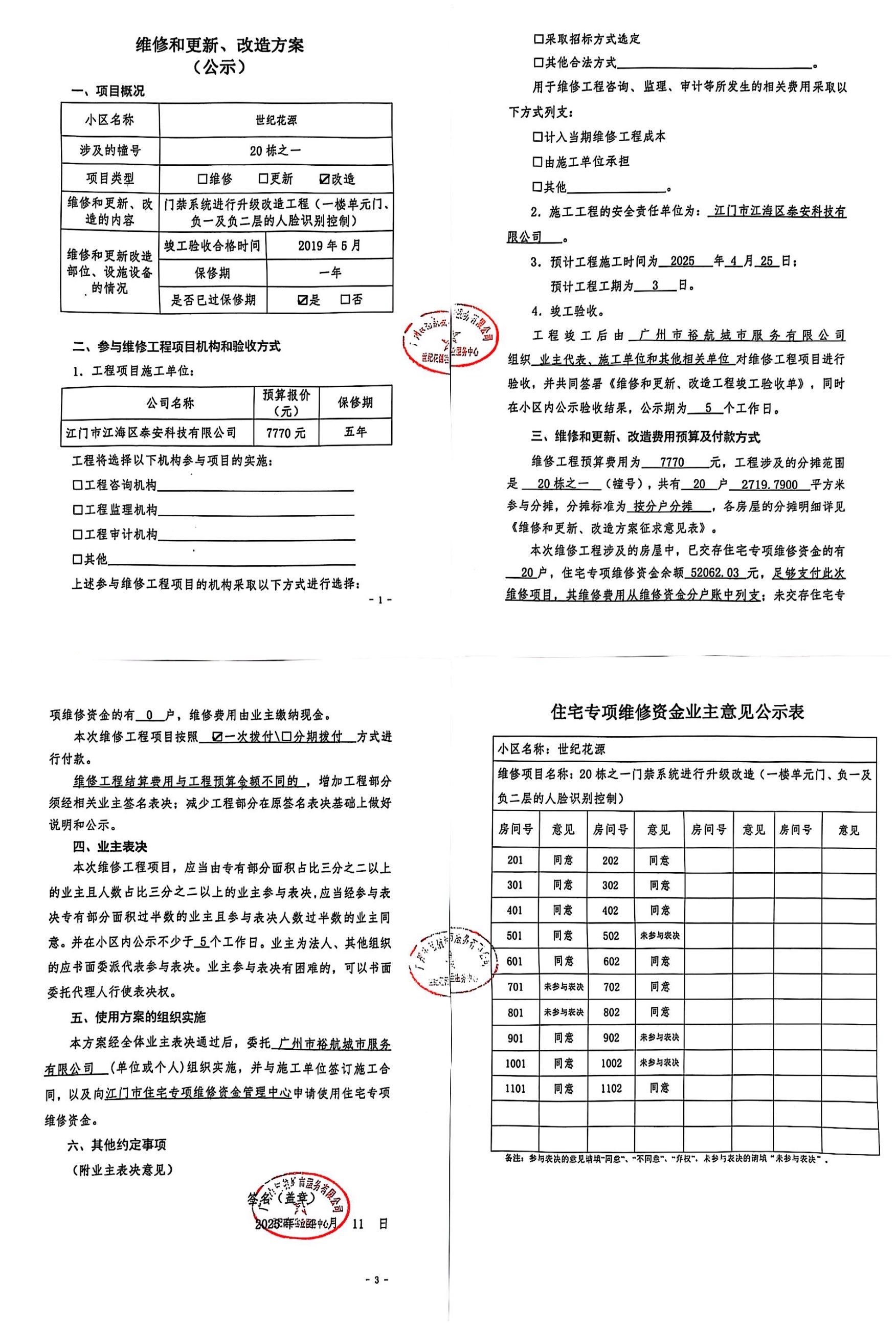 <td VALIGN="top" VALUES="" STYLE="border-width:0" BINDTYPE="0" ROWSPAN="17" COLSPAN="7" DATASOURCE="投票结果" ><font style=" font-family:方正小标宋简体;font-size:14pt;"><p style="line-height: 1.75em;"><span style="font-family: 宋体, SimSun;">各位尊敬的业主:</span><br/></p><p style="text-indent: 2em; line-height: 1.75em;"><span style="font-family: 宋体, SimSun;">根据法律法规的规定,本小区业主利用“江门市物业事项表决管理系统”已对本小区公共事务决策事项进行了表决,在经过7日的询异公示期后,未收到业主有效的异议。现将投票结果公告,并就产生的法律效力说明如下:</span></p><p style="line-height: 1.75em; text-indent: 0em;"><strong style="text-indent: 2em;"><span style="font-family: 宋体, SimSun;">一、投票范围</span></strong></p><p style="text-indent: 2em; line-height: 1.75em;"><span style="font-family: 宋体, SimSun;">世纪花源蓬江区世纪花源20幢之一</span></p><p style="text-indent: 2em; line-height: 1.75em;"><span style="font-family: 宋体, SimSun;">总人数(专有部分人数之和):20</span></p><p style="text-indent: 2em; line-height: 1.75em;"><span style="font-family: 宋体, SimSun;"><span style="font-family: 宋体, SimSun; text-indent: 32px;"><span style="font-family: 宋体; text-indent: 32px;"><span style="font-family: 宋体; text-indent: 32px;">总户数:20</span></span></span></span></p><p style="text-indent: 2em; line-height: 1.75em;"><span style="font-family: 宋体, SimSun;">建筑物总面积(专有部分面积之和):2719.79㎡</span></p><p style="line-height: 1.75em;"><strong><span style="font-family: 宋体, SimSun;">二、投票结果公告时间</span></strong></p><p style="text-indent: 2em; line-height: 1.75em;"><span style="font-family: 宋体, SimSun;"><span style="font-family: 宋体, SimSun; text-indent: 32px;">从2025年04月26日开始</span></span></p><p style="line-height: 1.75em;"><strong><span style="font-family: 宋体, SimSun;">三、计票规则</span></strong></p><p style="text-indent: 2em; line-height: 1.75em;"><span style="font-family: 宋体, SimSun;">表决事项:使用建筑物及其附属设施的维修资金<br /><p style='font-family: 宋体, SimSun;line-height: 1.75em; text-indent: 2em;'>计票规则:弃权票不并入其它项&nbsp;&nbsp;&nbsp;&nbsp;未表决票不并入其它项</p></span></p><p style="line-height: 1.75em;"><strong><span style="font-family: 宋体, SimSun;">四、通过规则</span></strong></p><p style="line-height: 1.75em;"><strong><span style="font-family: 宋体, SimSun;">&nbsp; 根据《中华人民共和国民法典》第二百七十八条规定:业主共同决定事项,应当由专有部分面积占比三分之二以上的业主且人数占比三分之二以上的业主参与表决。</span></strong></p><p style="text-indent: 2em; line-height: 1.75em;"><span style="font-family: 宋体, SimSun;"><span style="font-family: 宋体, SimSun; text-indent: 32px;">表决事项:使用建筑物及其附属设施的维修资金<br /><p style='font-family: 宋体, SimSun;line-height: 1.75em; text-indent: 2em;'>通过规则:双2/3以上参与表决,参与表决双过半同意</p></span></span></p><p style="line-height: 1.75em;"><strong><span style="font-family: 宋体, SimSun;">五、投票结果</span></strong></p><p style="line-height: 1.75em; text-indent: 2em;"><span style="font-family: 宋体, SimSun; text-indent: 2em;"><div id='resultTable'><table style='table-layout: fixed; font-size:12px; margin-top:10px' width='100%' border='0' cellspacing='0' cellpadding='0'><tr><td height='28' colspan='10' align='center' style='border: 1px solid #666'><strong style='font-size: 14px;'> 使用建筑物及其附属设施的维修资金</strong></td> </tr><tr id='trfirst'><td height='28' colspan='4' style='border-left: 1px solid #666; border-bottom: 1px solid #666'><strong>&nbsp;申报单位:</strong> 广州市裕航城市服务有限公司</td><td colspan='3' style='border-left: 1px solid #666; border-bottom: 1px solid #666'><strong>&nbsp;联系方式:</strong> </td><td colspan='3' style='border-left: 1px solid #666; border-bottom: 1px solid #666; border-right: 1px solid #666'><strong>&nbsp;申报日期:</strong> 2025年4月11日 </td></tr><tr> <td height='28' colspan='5' style='border-left: 1px solid #666; border-bottom: 1px solid #666'><strong>&nbsp;列支总人数(专有部分人数之和):</strong>20人 </td><td colspan='5' style='border-left: 1px solid #666; border-bottom: 1px solid #666; border-right: 1px solid #666'><strong>&nbsp;列支建筑物总面积(专有部分面积之和):</strong>2719.79㎡ </td> </tr><tr><td height='28' colspan='10' bgcolor='#F3F3F3' style='border-left: 1px solid #666;border-bottom: 1px solid #666;border-right: 1px solid #666'><strong>&nbsp;参与表决人数及面积统计</strong></td></tr><tr><td height='28' colspan='5' style='border-left: 1px solid #666; border-bottom: 1px solid #666'><strong>&nbsp;参与表决人数:</strong>18人</td><td colspan='5' style='border-left: 1px solid #666; border-bottom: 1px solid #666; border-right: 1px solid #666'><strong>&nbsp;参与表决人数占总人数比例:</strong>90.00%</td></tr><tr><td height='28' colspan='5' style='border-left: 1px solid #666; border-bottom: 1px solid #666'><strong>&nbsp;参与表决面积:</strong>2460.41㎡</td><td colspan='5' style='border-left: 1px solid #666; border-bottom: 1px solid #666; border-right: 1px solid #666'><strong>&nbsp;参与表决面积占总面积比例:</strong>90.46%</td></tr><tr><td height='28' colspan='10' bgcolor='#F3F3F3' style='border-left: 1px solid #666; border-bottom: 1px solid #666;border-right: 1px solid #666'> <strong>&nbsp;参与表决同意人数及面积统计</strong></td> </tr><tr><td height='28' colspan='5' style='border-left: 1px solid #666; border-bottom: 1px solid #666'><strong>&nbsp;参与表决同意人数:</strong>17人 </td><td colspan='5' style='border-left: 1px solid #666; bor