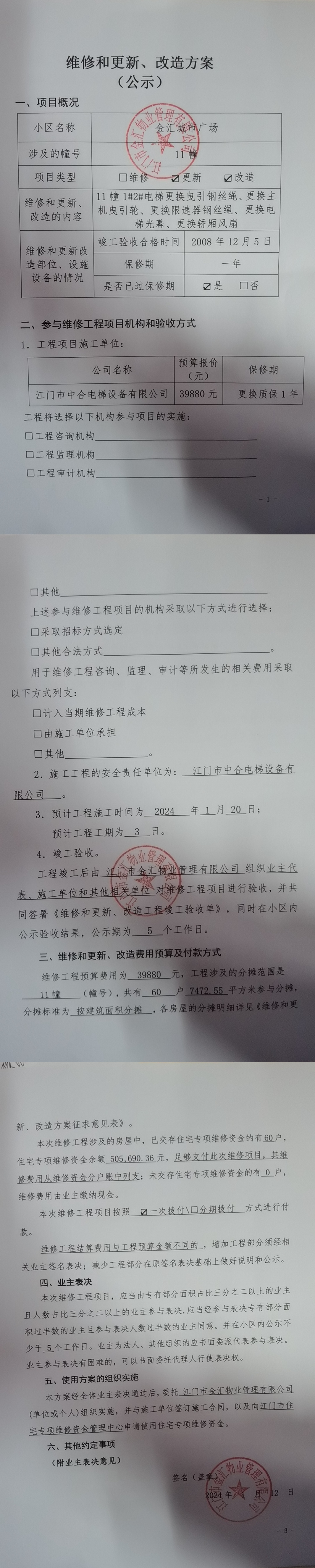<td VALIGN="top" VALUES="" STYLE="border-width:0" BINDTYPE="0" ROWSPAN="17" COLSPAN="7" DATASOURCE="投票结果" ><font style=" font-family:方正小标宋简体;font-size:14pt;"><p style="line-height: 1.75em;"><span style="font-family: 宋体, SimSun;">各位尊敬的业主:</span><br/></p><p style="text-indent: 2em; line-height: 1.75em;"><span style="font-family: 宋体, SimSun;">根据法律法规的规定,本小区业主利用“江门市物业事项表决管理系统”已对本小区公共事务决策事项进行了表决,在经过7日的询异公示期后,未收到业主有效的异议。现将投票结果公告,并就产生的法律效力说明如下:</span></p><p style="line-height: 1.75em; text-indent: 0em;"><strong style="text-indent: 2em;"><span style="font-family: 宋体, SimSun;">一、投票范围</span></strong></p><p style="text-indent: 2em; line-height: 1.75em;"><span style="font-family: 宋体, SimSun;">金汇城市广场金汇城市广场11栋</span></p><p style="text-indent: 2em; line-height: 1.75em;"><span style="font-family: 宋体, SimSun;">总人数(专有部分人数之和):58</span></p><p style="text-indent: 2em; line-height: 1.75em;"><span style="font-family: 宋体, SimSun;"><span style="font-family: 宋体, SimSun; text-indent: 32px;"><span style="font-family: 宋体; text-indent: 32px;"><span style="font-family: 宋体; text-indent: 32px;">总户数:60</span></span></span></span></p><p style="text-indent: 2em; line-height: 1.75em;"><span style="font-family: 宋体, SimSun;">建筑物总面积(专有部分面积之和):7472.55㎡</span></p><p style="line-height: 1.75em;"><strong><span style="font-family: 宋体, SimSun;">二、投票结果公告时间</span></strong></p><p style="text-indent: 2em; line-height: 1.75em;"><span style="font-family: 宋体, SimSun;">从2024年04月04日开始</span></p><p style="line-height: 1.75em;"><strong><span style="font-family: 宋体, SimSun;">三、计票规则</span></strong></p><p style="text-indent: 2em; line-height: 1.75em;"><span style="font-family: 宋体, SimSun;">表决事项:使用建筑物及其附属设施的维修资金<br /><p style='font-family: 宋体, SimSun;line-height: 1.75em; text-indent: 2em;'>计票规则:弃权票不并入其它项&nbsp;&nbsp;&nbsp;&nbsp;未表决票不并入其它项</p></span></p><p style="line-height: 1.75em;"><strong><span style="font-family: 宋体, SimSun;">四、通过规则</span></strong></p><p style="line-height: 1.75em;"><strong><span style="font-family: 宋体, SimSun;">&nbsp; 根据《中华人民共和国民法典》第二百七十八条规定:业主共同决定事项,应当由专有部分面积占比三分之二以上的业主且人数占比三分之二以上的业主参与表决。</span></strong></p><p style="text-indent: 2em; line-height: 1.75em;"><span style="font-family: 宋体, SimSun;"><span style="font-family: 宋体, SimSun; text-indent: 32px;">表决事项:使用建筑物及其附属设施的维修资金<br /><p style='font-family: 宋体, SimSun;line-height: 1.75em; text-indent: 2em;'>通过规则:双2/3以上参与表决,参与表决双过半同意</p></span></span></p><p style="line-height: 1.75em;"><strong><span style="font-family: 宋体, SimSun;">五、投票结果</span></strong></p><p style="line-height: 1.75em; text-indent: 2em;"><span style="font-family: 宋体, SimSun; text-indent: 2em;"><div id='resultTable'><table style='table-layout: fixed; font-size:12px; margin-top:10px' width='100%' border='0' cellspacing='0' cellpadding='0'><tr><td height='28' colspan='10' align='center' style='border: 1px solid #666'><strong style='font-size: 14px;'> 使用建筑物及其附属设施的维修资金</strong></td> </tr><tr id='trfirst'><td height='28' colspan='4' style='border-left: 1px solid #666; border-bottom: 1px solid #666'><strong>&nbsp;申报单位:</strong> 江门市金汇物业管理有限公司</td><td colspan='3' style='border-left: 1px solid #666; border-bottom: 1px solid #666'><strong>&nbsp;联系方式:</strong> 3929003 </td><td colspan='3' style='border-left: 1px solid #666; border-bottom: 1px solid #666; border-right: 1px solid #666'><strong>&nbsp;申报日期:</strong> 2024年1月22日 </td></tr><tr> <td height='28' colspan='5' style='border-left: 1px solid #666; border-bottom: 1px solid #666'><strong>&nbsp;列支总人数(专有部分人数之和):</strong>58人 </td><td colspan='5' style='border-left: 1px solid #666; border-bottom: 1px solid #666; border-right: 1px solid #666'><strong>&nbsp;列支建筑物总面积(专有部分面积之和):</strong>7472.55㎡ </td> </tr><tr><td height='28' colspan='10' bgcolor='#F3F3F3' style='border-left: 1px solid #666;border-bottom: 1px solid #666;border-right: 1px solid #666'><strong>&nbsp;参与表决人数及面积统计</strong></td></tr><tr><td height='28' colspan='5' style='border-left: 1px solid #666; border-bottom: 1px solid #666'><strong>&nbsp;参与表决人数:</strong>44人</td><td colspan='5' style='border-left: 1px solid #666; border-bottom: 1px solid #666; border-right: 1px solid #666'><strong>&nbsp;参与表决人数占总人数比例:</strong>75.86%</td></tr><tr><td height='28' colspan='5' style='border-left: 1px solid #666; border-bottom: 1px solid #666'><strong>&nbsp;参与表决面积:</strong>5646.26㎡</td><td colspan='5' style='border-left: 1px solid #666; border-bottom: 1px solid #666; border-right: 1px solid #666'><strong>&nbsp;参与表决面积占总面积比例:</strong>75.56%</td></tr><tr><td height='28' colspan='10' bgcolor='#F3F3F3' style='border-left: 1px solid #666; border-bottom: 1px solid #666;border-right: 1px solid #666'> <strong>&nbsp;参与表决同意人数及面积统计</strong></td> </tr><tr><td height='28' colspan='5' style='border-left: 1px solid #666; border-bottom: 1px solid #666'><strong>&nbsp;参与表决同意人数:</strong>44人 </td><td colspan='5' style='border-left: 1px solid #666; border-bottom: 1px solid #666; border-right: 1px solid #666'><stron