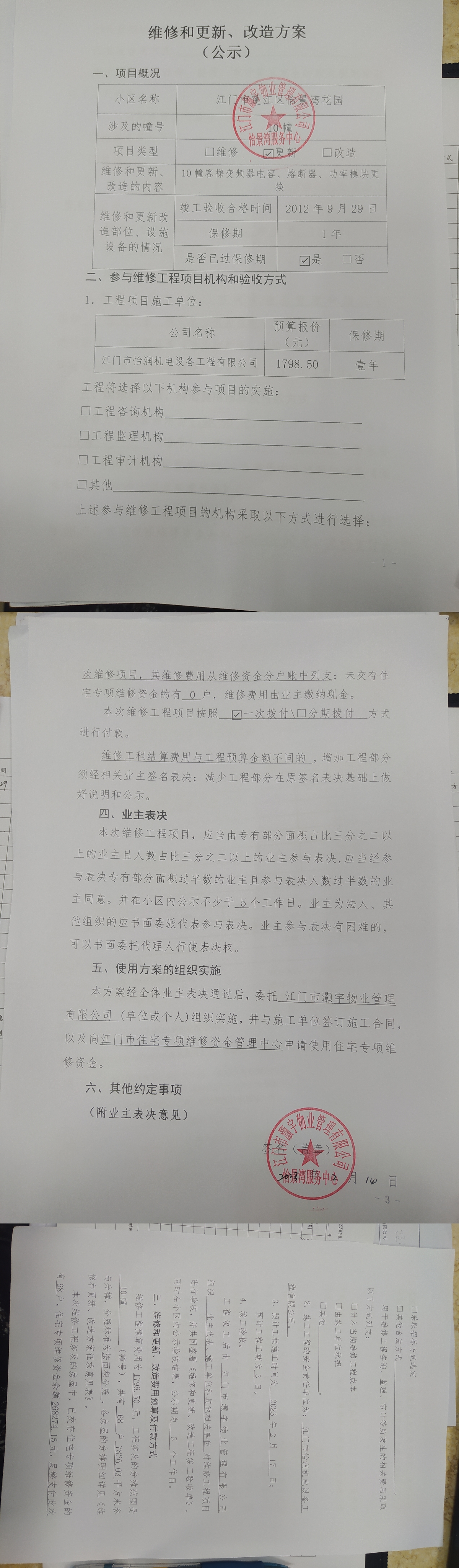 <td valign="top" values="" style="border-width:0" bindtype="0" rowspan="19" colspan="7" datasource="投票结果"><font style="font-size:14pt;"><p style="white-space: normal; font-family: 宋体; line-height: 1.75em;">蓬江区怡景湾蓬江区怡景湾花园10幢全体业主:</p><p style="white-space: normal; font-family: 宋体; line-height: 1.75em; text-indent: 2em;">本小区关于蓬江区怡景湾10幢客梯更换电梯配件使用维修资金的投票的投票已表决结束,询异时间从2023年02月20日开始,投票询异公示期间,业主可通过微信查询自己的表决情况或可凭身份证件申请查询自己的表决情况;如公示的业主表决情况与查询的本人表决意见不一致的,可以以书面形式向投票组织机构申诉,投票组织机构予以纠正并重新公示表决结果。异议提出人对投票组织机构的处理仍有异议的,可以向街道办事处(镇人民政府)反映处理,涉及住宅专项维修资金的,可向属地住宅专项维修资金管理中心反映处理。</p><p style="white-space: normal;"><br></p><p style="white-space: normal; font-family: 宋体; line-height: 1.75em;"><strong>附件:</strong></p><p style="white-space: normal; font-family: 宋体; line-height: 1.75em;"><strong>一、投票范围</strong></p><p style="white-space: normal; font-family: 宋体; line-height: 1.75em; text-indent: 2em;">蓬江区怡景湾蓬江区怡景湾花园10幢</p><p style="white-space: normal; font-family: 宋体; line-height: 1.75em; text-indent: 2em;">总人数(专有部分人数之和):67</p><p style="white-space: normal; font-family: 宋体; line-height: 1.75em; text-indent: 2em;"><span style="font-family: 宋体, SimSun;">总户数:68</span></p><p style="white-space: normal; font-family: 宋体; line-height: 1.75em; text-indent: 2em;">建筑物总面积(专有部分面积之和):7826.03㎡</p><p style="white-space: normal; font-family: 宋体; line-height: 1.75em;"><strong>二、询异公示起止时间</strong></p><p dir="ltr" style="white-space: normal; font-family: 宋体; line-height: 1.75em; text-indent: 2em;"><span style="text-indent: 36px;">2023年02月20日至2023年02月26日</span></p><p style="white-space: normal; font-family: 宋体; line-height: 1.75em;"><strong>三、投票详细描述</strong></p><p style="white-space: normal; font-family: 宋体; line-height: 1.75em; text-indent: 2em;"></p><p><span style="font-family: " helvetica="" neue",="" helvetica,="" arial,="" sans-serif;="" font-size:="" 14px;="" background-color:="" rgb(255,="" 255,="" 255);"="">小区10幢客梯运行期间发生停梯故障,经检查,发现变频器电容老化、导致变频器电容、熔断器、功率模块损坏,需要更换,现需申请使用维修资金对客梯变频器电容、熔断器、功率模块进行更换,工程维修预算金额为1798.50元,项目最终费用以施工合同签订金额为准。维修费用的分摊标准为按面积分摊 ,每平约0.23元,详见公示附件。如业主手机不能正常通过微信投票,请联系物业公司进行线下纸质投票,物业电话:0750-3692722</span></p><p></p><p style="white-space: normal; font-family: 宋体; line-height: 1.75em;"><strong>四、计票规则</strong></p><p style="white-space: normal; font-family: 宋体; line-height: 1.75em; text-indent: 2em;">表决事项:使用建筑物及其附属设施的维修资金<br></p><p style="text-align: left; font-family: 宋体; font-size: 16px; line-height: 1.75em; text-indent: 2em;">计票规则:弃权票不并入其它项 未表决票不并入其它项</p><p></p><p style="white-space: normal; font-family: 宋体; line-height: 1.75em;"><strong>五、通过规则</strong></p><p style="white-space: normal; font-family: 宋体; line-height: 1.75em; text-indent: 2em;">表决事项:使用建筑物及其附属设施的维修资金<br></p><p style="text-align: left; font-family: 宋体; font-size: 16px; line-height: 1.75em; text-indent: 2em;">通过规则:参与表决专有部分面积过半数的业主且参与表决人数过半数的业主同意</p><p></p><p style="white-space: normal; font-family: 宋体; line-height: 1.75em;"><strong>六、投票结果</strong></p><p style="white-space: normal; font-family: 宋体; line-height: 1.75em; text-indent: 2em;"></p><div id="resultTable"><table style="table-layout: fixed; font-size:12px; margin-top:10px" width="100%" border="0" cellspacing="0" cellpadding="0"><tbody><tr><td height="28" colspan="10" align="center" style="border: 1px solid #666"><strong style="font-size: 14px;"> 使用建筑物及其附属设施的维修资金</strong></td> </tr><tr id="trfirst"><td height="28" colspan="4" style="border-left: 1px solid #666; border-bottom: 1px solid #666"><strong> 申报单位:</strong> 江门市灏宇物业管理有限公司</td><td colspan="3" style="border-left: 1px solid #666; border-bottom: 1px solid #666"><strong> 联系方式:</strong> </td><td colspan="3" style="border-left: 1px solid #666; border-bottom: 1px solid #666; border-right: 1px solid #666"><strong> 申报日期:</strong> 2023年2月14日 </td></tr><tr> <td height="28" colspan="5" style="border-left: 1px solid #666; border-bottom: 1px solid #666"><strong> 总人数(专有部分人数之和):</strong>67人 </td><td colspan="5" style="border-left: 1px solid #666; border-bottom: 1px solid #666; border-right: 1px solid #666"><strong> 建筑物总面积(专有部分面积之和):</strong>7826.03㎡ </td> </tr><tr><td height="28" colspan="10" bgcolor="#F3F3F3" style="border-left: 1px solid #666;border-bottom: 1px solid #666;border-right: 1px solid #666"><strong> 参与人数及面积统计</strong></td></tr><tr><td height="28" colspan="5" style="border-left: 1px solid #666; border-bottom: 1px solid #666"><strong> 参与表决专有部分人数之和:</strong>34人</td><td colspan="5" style="border-left: 1px solid #666; border-bottom: 1px solid #666; border-right: 1px solid #666"><strong> 参与表决占有表