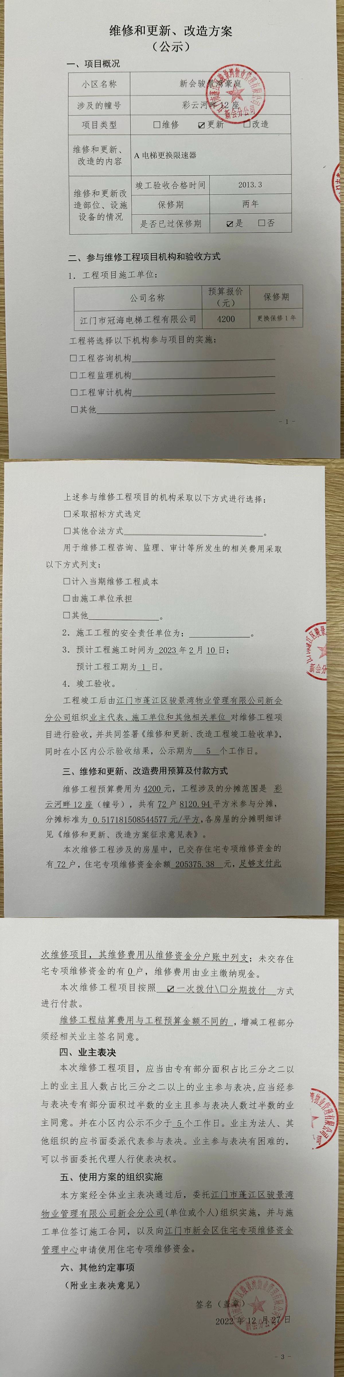 <td valign="top" values="" style="border-width:0" bindtype="0" rowspan="17" colspan="7" datasource="投票结果"><font style=" font-family:方正小标宋简体;font-size:14pt;"><p style="line-height: 1.75em;"><span style="font-family: 宋体, SimSun;">各位尊敬的业主:</span><br></p><p style="text-indent: 2em; line-height: 1.75em;"><span style="font-family: 宋体, SimSun;">根据法律法规的规定,本小区业主利用“物业公共事务决策系统”已对本小区公共事务决策事项进行了表决,在经过7日的询异公示期后,未收到业主有效的异议。现将投票结果公告,并就产生的法律效力说明如下:</span></p><p style="line-height: 1.75em; text-indent: 0em;"><strong style="text-indent: 2em;"><span style="font-family: 宋体, SimSun;">一、投票范围</span></strong></p><p style="text-indent: 2em; line-height: 1.75em;"><span style="font-family: 宋体, SimSun;">新会骏景湾豪庭彩云河畔12座</span></p><p style="text-indent: 2em; line-height: 1.75em;"><span style="font-family: 宋体, SimSun;">总人数(专有部分人数之和):71</span></p><p style="text-indent: 2em; line-height: 1.75em;"><span style="font-family: 宋体, SimSun;"><span style="font-family: 宋体, SimSun; text-indent: 32px;">总户数:72</span></span></p><p style="text-indent: 2em; line-height: 1.75em;"><span style="font-family: 宋体, SimSun;">建筑物总面积(专有部分面积之和):8120.94㎡</span></p><p style="line-height: 1.75em;"><strong><span style="font-family: 宋体, SimSun;">二、投票起止时间</span></strong></p><p style="text-indent: 2em; line-height: 1.75em;"><span style="font-family: 宋体, SimSun;">投票表决时间:从2023年01月10日到2023年02月03日止</span></p><p style="text-indent: 2em; line-height: 1.75em;"><span style="font-family: 宋体, SimSun;">投票询异公示时间:从2023年02月04日开始</span></p><p style="text-indent: 2em; line-height: 1.75em;"><span style="font-family: 宋体, SimSun;">投票结果通知公告时间:从2023年02月11日开始</span></p><p style="line-height: 1.75em;"><strong><span style="font-family: 宋体, SimSun;">三、计票规则</span></strong></p><p style="text-indent: 2em; line-height: 1.75em;"><span style="font-family: 宋体, SimSun;">表决事项:使用建筑物及其附属设施的维修资金<br></span></p><p style="font-family: 宋体, SimSun;line-height: 1.75em; text-indent: 2em;">计票规则:弃权票不并入其它项 未表决票不并入其它项</p><p></p><p style="line-height: 1.75em;"><strong><span style="font-family: 宋体, SimSun;">四、通过规则</span></strong></p><p style="text-indent: 2em; line-height: 1.75em;"><span style="font-family: 宋体, SimSun;"><span style="font-family: 宋体, SimSun; text-indent: 32px;">表决事项:使用建筑物及其附属设施的维修资金<br></span></span></p><p style="font-family: 宋体, SimSun;line-height: 1.75em; text-indent: 2em;">通过规则:参与表决专有部分面积过半数的业主且参与表决人数过半数的业主同意</p><p></p><p style="line-height: 1.75em;"><strong><span style="font-family: 宋体, SimSun;">五、投票结果</span></strong></p><p style="line-height: 1.75em; text-indent: 2em;"><span style="font-family: 宋体, SimSun; text-indent: 2em;"></span></p><div id="resultTable"><table style="table-layout: fixed; font-size:12px; margin-top:10px" width="100%" border="0" cellspacing="0" cellpadding="0"><tbody><tr><td height="28" colspan="10" align="center" style="border: 1px solid #666"><strong style="font-size: 14px;"> 使用建筑物及其附属设施的维修资金</strong></td> </tr><tr id="trfirst"><td height="28" colspan="4" style="border-left: 1px solid #666; border-bottom: 1px solid #666"><strong> 申报单位:</strong> 江门市蓬江区骏景湾物业管理有限公司新会分公司</td><td colspan="3" style="border-left: 1px solid #666; border-bottom: 1px solid #666"><strong> 联系方式:</strong> </td><td colspan="3" style="border-left: 1px solid #666; border-bottom: 1px solid #666; border-right: 1px solid #666"><strong> 申报日期:</strong> 2023年1月5日 </td></tr><tr> <td height="28" colspan="5" style="border-left: 1px solid #666; border-bottom: 1px solid #666"><strong> 总人数(专有部分人数之和):</strong>71人 </td><td colspan="5" style="border-left: 1px solid #666; border-bottom: 1px solid #666; border-right: 1px solid #666"><strong> 建筑物总面积(专有部分面积之和):</strong>8120.94㎡ </td> </tr><tr><td height="28" colspan="10" bgcolor="#F3F3F3" style="border-left: 1px solid #666;border-bottom: 1px solid #666;border-right: 1px solid #666"><strong> 参与人数及面积统计</strong></td></tr><tr><td height="28" colspan="5" style="border-left: 1px solid #666; border-bottom: 1px solid #666"><strong> 参与表决专有部分人数之和:</strong>50人</td><td colspan="5" style="border-left: 1px solid #666; border-bottom: 1px solid #666; border-right: 1px solid #666"><strong> 参与表决占有表决权总人数比例:</strong>70.42%</td></tr><tr><td height="28" colspan="5" style="border-left: 1px solid #666; border-bottom: 1px solid #666"><strong> 参与表决专有部分面积之和:</strong>5689.51㎡</td><td colspan="5" style="border-left: 1px solid #666; border-bottom: 1px solid #666; border-right: 1px solid #666"><strong> 参与表决占有表决权总面积比例:</strong>70.06%</td></tr><tr><td height="28" colspan="10" bgcolor="#F3F3F3" style="border-left: 1px solid #666; border-bottom: 1px solid #666;border-right: 1px solid #666"> <strong> 未参与人数及面积统计</strong></td> </tr><tr><td height="28" colspan="5" style="border-left: 1px solid #666; border-bottom: 1px solid #666"><strong> 未参与表决专有部分人数之和:</strong>21人 </td><td colspan="5" style="border-left: 1px solid #666; border-bottom: 1px solid #666; border-right: 1px solid #666"><strong> 未参与表决占有表决权总人数比例:</strong>29.58%</td></t