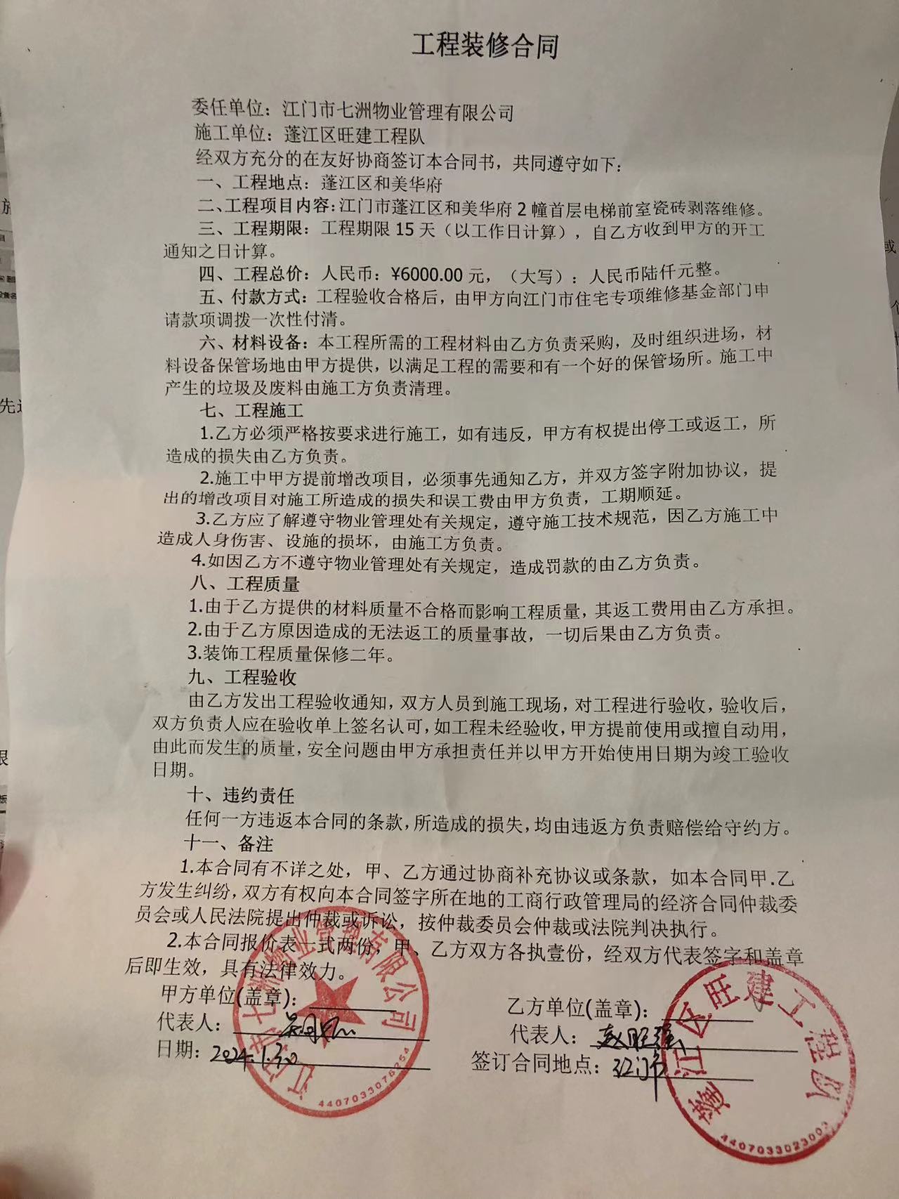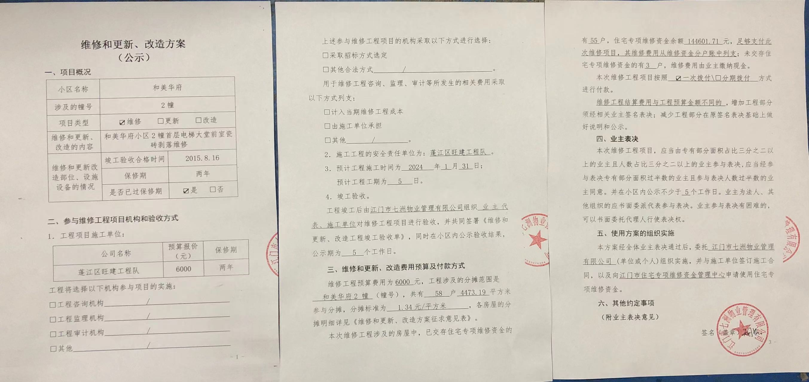 <td VALIGN="top" VALUES="" STYLE="border-width:0" BINDTYPE="0" ROWSPAN="19" COLSPAN="7" DATASOURCE="投票结果" ><font style="font-size:14pt;"><p style="white-space: normal; font-family: 宋体; line-height: 1.75em;">和美华府蓬江区和美华府2幢全体业主:</p><p style="white-space: normal; font-family: 宋体; line-height: 1.75em; text-indent: 2em;">本小区关于和美华府2幢首层电梯前室瓷砖剥落维修资金使用投票事项的投票已表决结束,询异时间从2024年03月24日开始,投票询异公示期间,业主可通过微信查询自己的表决情况或可凭身份证件申请查询自己的表决情况;如公示的业主表决情况与查询的本人表决意见不一致的,可以以书面形式向投票组织机构申诉,投票组织机构予以纠正并重新公示表决结果。异议提出人对投票组织机构的处理仍有异议的,可以向街道办事处(镇人民政府)反映处理,涉及住宅专项维修资金的,可向属地住宅专项维修资金管理中心反映处理。</p><p style="white-space: normal;"><br/></p><p style="white-space: normal; font-family: 宋体; line-height: 1.75em;"><strong>附件:</strong></p><p style="white-space: normal; font-family: 宋体; line-height: 1.75em;"><strong>一、投票范围</strong></p><p style="white-space: normal; font-family: 宋体; line-height: 1.75em; text-indent: 2em;">和美华府蓬江区和美华府2幢</p><p style="white-space: normal; font-family: 宋体; line-height: 1.75em; text-indent: 2em;">总人数(专有部分人数之和):57</p><p style="white-space: normal; font-family: 宋体; line-height: 1.75em; text-indent: 2em;"><span style="font-family: 宋体, SimSun;"><span style="font-family: 宋体; text-indent: 32px;"><span style="font-family: 宋体; text-indent: 32px;">总户数:58</span></span></span></p><p style="white-space: normal; font-family: 宋体; line-height: 1.75em; text-indent: 2em;">建筑物总面积(专有部分面积之和):4473.19㎡</p><p style="white-space: normal; font-family: 宋体; line-height: 1.75em;"><strong>二、询异公示起止时间</strong></p><p dir="ltr" style="white-space: normal; font-family: 宋体; line-height: 1.75em; text-indent: 2em;"><span style="text-indent: 36px;">2024年03月24日至2024年03月30日</span></p><p style="white-space: normal; font-family: 宋体; line-height: 1.75em;"><strong>三、投票详细描述</strong></p><p style="white-space: normal; font-family: 宋体; line-height: 1.75em; text-indent: 2em;"><p>小区2幢首层电梯前室于2023年12月17日发现有瓷砖剥落,经检查,该墙面已有大面积空鼓现象,需对该墙面进行重新维修,工程维修金额为6000元。因已过保修期,维修费用由相关业主按建筑面积分摊,详见公示附件。如业主手机不能正常通过微信投票,请联系物业公司进行线下纸质投票,物业电话:0750-3692920。</p></p><p style="white-space: normal; font-family: 宋体; line-height: 1.75em;"><strong>四、计票规则</strong></p><p style="white-space: normal; font-family: 宋体; line-height: 1.75em; text-indent: 2em;">表决事项:使用建筑物及其附属设施的维修资金<br /><p style='text-align: left; font-family: 宋体; font-size: 16px; line-height: 1.75em; text-indent: 2em;'>计票规则:弃权票不并入其它项 未表决票不并入其它项</p></p><p style="white-space: normal; font-family: 宋体; line-height: 1.75em;"><strong>五、通过规则</strong></p><p style="white-space: normal; font-family: 宋体; line-height: 1.75em;"><strong><strong style="white-space: normal;"><span style="font-family: 宋体, SimSun;"> 根据《中华人民共和国民法典》第二百七十八条规定:业主共同决定事项,应当由专有部分面积占比三分之二以上的业主且人数占比三分之二以上的业主参与表决。</span></strong></strong></p><p style="white-space: normal; font-family: 宋体; line-height: 1.75em; text-indent: 2em;">表决事项:使用建筑物及其附属设施的维修资金<br /><p style='text-align: left; font-family: 宋体; font-size: 16px; line-height: 1.75em; text-indent: 2em;'>通过规则:同意票数达到总双的2/3</p></p><p style="white-space: normal; font-family: 宋体; line-height: 1.75em;"><strong>六、投票结果</strong></p><p style="white-space: normal; font-family: 宋体; line-height: 1.75em; text-indent: 2em;"><div id='resultTable'><table style='table-layout: fixed; font-size:12px; margin-top:10px' width='100%' border='0' cellspacing='0' cellpadding='0'><tr><td height='28' colspan='10' align='center' style='border: 1px solid #666'><strong style='font-size: 14px;'> 使用建筑物及其附属设施的维修资金</strong></td> </tr><tr id='trfirst'><td height='28' colspan='4' style='border-left: 1px solid #666; border-bottom: 1px solid #666'><strong> 申报单位:</strong> 江门市七洲物业管理有限公司</td><td colspan='3' style='border-left: 1px solid #666; border-bottom: 1px solid #666'><strong> 联系方式:</strong> 0750-3338969 </td><td colspan='3' style='border-left: 1px solid #666; border-bottom: 1px solid #666; border-right: 1px solid #666'><strong> 申报日期:</strong> 2024年3月8日 </td></tr><tr> <td height='28' colspan='5' style='border-left: 1px solid #666; border-bottom: 1px solid #666'><strong> 总人数(专有部分人数之和):</strong>57人 </td><td colspan='5' style='border-left: 1px solid #666; border-bottom: 1px solid #666; border-right: 1px solid #666'><strong> 建筑物总面积(专有部分面积之和):</strong>4473.19㎡ </td> </tr><tr><td height='28' colspan='10' bgcolor='#F3F3F3' style='border-left: 1px solid #666;border-bottom: 1px solid #666;border-right: 1px solid #666'><strong> 参与人数及面积统计</strong></td></tr><tr><td height='28' colspan='5' style='border-left: 1px solid #666; border-bottom: 1px solid #666'><strong> 参与表决专有部分人数之和:</strong>41人</td><td colspan='5' style='border-left: 1