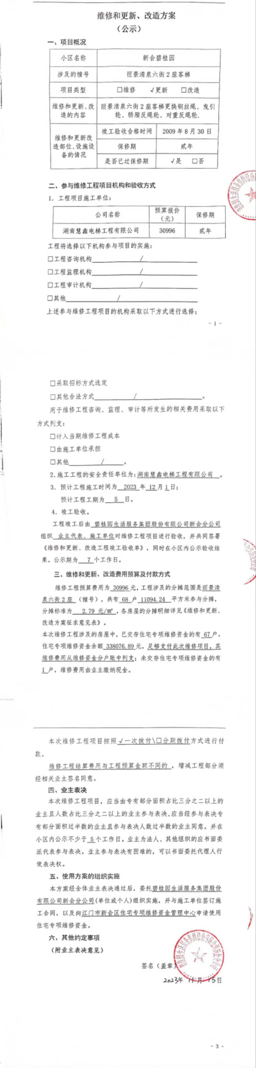<td VALIGN="top" VALUES="" STYLE="border-width:0" BINDTYPE="0" ROWSPAN="19" COLSPAN="7" DATASOURCE="投票结果" ><font style="font-size:14pt;"><p style="white-space: normal; font-family: 宋体; line-height: 1.75em;">新会碧桂园丽景清泉六街2座全体业主:</p><p style="white-space: normal; font-family: 宋体; line-height: 1.75em; text-indent: 2em;">本小区关于新会碧桂园丽景清泉六街2座客梯更换钢丝绳、曳引轮、轿厢反绳轮、对重反绳轮使用维修资金的投票的投票已表决结束,询异时间从2023年11月23日开始,投票询异公示期间,业主可通过微信查询自己的表决情况或可凭身份证件申请查询自己的表决情况;如公示的业主表决情况与查询的本人表决意见不一致的,可以以书面形式向投票组织机构申诉,投票组织机构予以纠正并重新公示表决结果。异议提出人对投票组织机构的处理仍有异议的,可以向街道办事处(镇人民政府)反映处理,涉及住宅专项维修资金的,可向属地住宅专项维修资金管理中心反映处理。</p><p style="white-space: normal;"><br/></p><p style="white-space: normal; font-family: 宋体; line-height: 1.75em;"><strong>附件:</strong></p><p style="white-space: normal; font-family: 宋体; line-height: 1.75em;"><strong>一、投票范围</strong></p><p style="white-space: normal; font-family: 宋体; line-height: 1.75em; text-indent: 2em;">新会碧桂园丽景清泉六街2座</p><p style="white-space: normal; font-family: 宋体; line-height: 1.75em; text-indent: 2em;">总人数(专有部分人数之和):67</p><p style="white-space: normal; font-family: 宋体; line-height: 1.75em; text-indent: 2em;"><span style="font-family: 宋体, SimSun;">总户数:68</span></p><p style="white-space: normal; font-family: 宋体; line-height: 1.75em; text-indent: 2em;">建筑物总面积(专有部分面积之和):11094.24㎡</p><p style="white-space: normal; font-family: 宋体; line-height: 1.75em;"><strong>二、询异公示起止时间</strong></p><p dir="ltr" style="white-space: normal; font-family: 宋体; line-height: 1.75em; text-indent: 2em;"><span style="text-indent: 36px;">2023年11月23日至2023年11月29日</span></p><p style="white-space: normal; font-family: 宋体; line-height: 1.75em;"><strong>三、投票详细描述</strong></p><p style="white-space: normal; font-family: 宋体; line-height: 1.75em; text-indent: 2em;"><p>新会碧桂园丽景清泉六街2座客梯在每月维保检查中,发现客梯钢丝绳、曳引轮、轿厢反绳轮、对重反绳轮,由于使用时间较长出现磨损和钢丝绳散股等现象,导致电梯在运行过程中出现异响和振动严重。已过保修期,现申请使用维修资金对新会碧桂园丽景清泉六街2座客梯钢丝绳、曳引轮、轿厢反绳轮、对重反绳轮进行更换,工程维修预算约30996元,项目最终费用以施工合同签订为准,维修费用的分摊标准按建筑面积分摊,每平方约2.79元,详见公示,如果有业主手机不能正常通过微信投票的,请联系物业公司进行线下纸质投票,物业电话18088896992.</p></p><p style="white-space: normal; font-family: 宋体; line-height: 1.75em;"><strong>四、计票规则</strong></p><p style="white-space: normal; font-family: 宋体; line-height: 1.75em; text-indent: 2em;">表决事项:使用建筑物及其附属设施的维修资金<br /><p style='text-align: left; font-family: 宋体; font-size: 16px; line-height: 1.75em; text-indent: 2em;'>计票规则:弃权票不并入其它项 未表决票不并入其它项</p></p><p style="white-space: normal; font-family: 宋体; line-height: 1.75em;"><strong>五、通过规则</strong></p><p style="white-space: normal; font-family: 宋体; line-height: 1.75em;"><strong><strong style="white-space: normal;"><span style="font-family: 宋体, SimSun;">&nbsp; 根据《中华人民共和国民法典》第二百七十八条规定:业主共同决定事项,应当由专有部分面积占比三分之二以上的业主且人数占比三分之二以上的业主参与表决。</span></strong></strong></p><p style="white-space: normal; font-family: 宋体; line-height: 1.75em; text-indent: 2em;">表决事项:使用建筑物及其附属设施的维修资金<br /><p style='text-align: left; font-family: 宋体; font-size: 16px; line-height: 1.75em; text-indent: 2em;'>通过规则:参与表决专有部分面积过半数的业主且参与表决人数过半数的业主同意</p></p><p style="white-space: normal; font-family: 宋体; line-height: 1.75em;"><strong>六、投票结果</strong></p><p style="white-space: normal; font-family: 宋体; line-height: 1.75em; text-indent: 2em;"><div id='resultTable'><table style='table-layout: fixed; font-size:12px; margin-top:10px' width='100%' border='0' cellspacing='0' cellpadding='0'><tr><td height='28' colspan='10' align='center' style='border: 1px solid #666'><strong style='font-size: 14px;'> 使用建筑物及其附属设施的维修资金</strong></td> </tr><tr id='trfirst'><td height='28' colspan='4' style='border-left: 1px solid #666; border-bottom: 1px solid #666'><strong> 申报单位:</strong> 碧桂园生活服务集团股份有限公司新会分公司</td><td colspan='3' style='border-left: 1px solid #666; border-bottom: 1px solid #666'><strong> 联系方式:</strong> </td><td colspan='3' style='border-left: 1px solid #666; border-bottom: 1px solid #666; border-right: 1px solid #666'><strong> 申报日期:</strong> 2023年11月16日 </td></tr><tr> <td height='28' colspan='5' style='border-left: 1px solid #666; border-bottom: 1px solid #666'><strong> 总人数(专有部分人数之和):</strong>67人 </td><td colspan='5' style='border-left: 1px solid #666; border-bottom: 1px solid #666; border-right: 1px solid #666'><strong> 建筑物总面积(专有部分面积之和):</strong>11094.24㎡ </td> </tr><tr><td height='28' colspan='10' bgcolor='#F3F3F3' style='border-left: 1p
