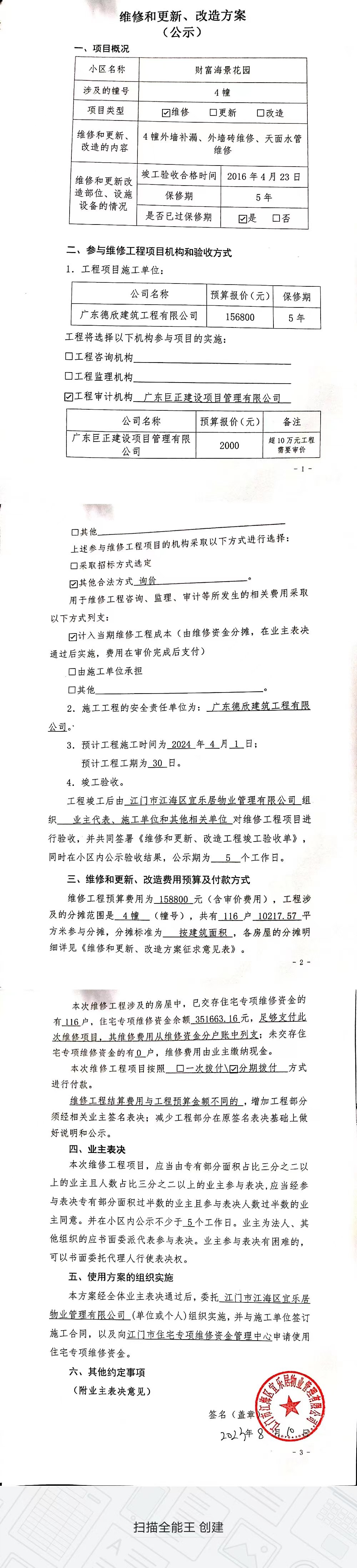 <td valign="top" values="" style="border-width:0" bindtype="0" rowspan="17" colspan="7" datasource="投票结果"><font style=" font-family:方正小标宋简体;font-size:14pt;"><p style="line-height: 1.75em;"><span style="font-family: 宋体, SimSun;">各位尊敬的业主:</span><br></p><p style="text-indent: 2em; line-height: 1.75em;"><span style="font-family: 宋体, SimSun;">根据法律法规的规定,本小区业主利用“江门市物业事项表决管理系统”已对本小区公共事务决策事项进行了表决,在经过7日的询异公示期后,未收到业主有效的异议。现将投票结果公告,并就产生的法律效力说明如下:</span></p><p style="line-height: 1.75em; text-indent: 0em;"><strong style="text-indent: 2em;"><span style="font-family: 宋体, SimSun;">一、投票范围</span></strong></p><p style="text-indent: 2em; line-height: 1.75em;"><span style="font-family: 宋体, SimSun;">江海区外海财富海景花园江海区外海财富海景花园4幢</span></p><p style="text-indent: 2em; line-height: 1.75em;"><span style="font-family: 宋体, SimSun;">总人数(专有部分人数之和):115</span></p><p style="text-indent: 2em; line-height: 1.75em;"><span style="font-family: 宋体, SimSun;"><span style="font-family: 宋体, SimSun; text-indent: 32px;"><span style="font-family: 宋体; text-indent: 32px;">总户数:116</span></span></span></p><p style="text-indent: 2em; line-height: 1.75em;"><span style="font-family: 宋体, SimSun;">建筑物总面积(专有部分面积之和):10217.57㎡</span></p><p style="line-height: 1.75em;"><strong><span style="font-family: 宋体, SimSun;">二、投票结果公告时间</span></strong></p><p style="text-indent: 2em; line-height: 1.75em;"><span style="font-family: 宋体, SimSun;">从2023年10月02日开始</span></p><p style="line-height: 1.75em;"><strong><span style="font-family: 宋体, SimSun;">三、计票规则</span></strong></p><p style="text-indent: 2em; line-height: 1.75em;"><span style="font-family: 宋体, SimSun;">表决事项:使用建筑物及其附属设施的维修资金<br></span></p><p style="font-family: 宋体, SimSun;line-height: 1.75em; text-indent: 2em;">计票规则:弃权票不并入其它项 未表决票不并入其它项</p><p></p><p style="line-height: 1.75em;"><strong><span style="font-family: 宋体, SimSun;">四、通过规则</span></strong></p><p style="text-indent: 2em; line-height: 1.75em;"><span style="font-family: 宋体, SimSun;"><span style="font-family: 宋体, SimSun; text-indent: 32px;">表决事项:使用建筑物及其附属设施的维修资金<br></span></span></p><p style="font-family: 宋体, SimSun;line-height: 1.75em; text-indent: 2em;">通过规则:参与表决专有部分面积过半数的业主且参与表决人数过半数的业主同意</p><p></p><p style="line-height: 1.75em;"><strong><span style="font-family: 宋体, SimSun;">五、投票结果</span></strong></p><p style="line-height: 1.75em; text-indent: 2em;"><span style="font-family: 宋体, SimSun; text-indent: 2em;"></span></p><div id="resultTable"><table style="table-layout: fixed; font-size:12px; margin-top:10px" width="100%" border="0" cellspacing="0" cellpadding="0"><tbody><tr><td height="28" colspan="10" align="center" style="border: 1px solid #666"><strong style="font-size: 14px;"> 使用建筑物及其附属设施的维修资金</strong></td> </tr><tr id="trfirst"><td height="28" colspan="4" style="border-left: 1px solid #666; border-bottom: 1px solid #666"><strong> 申报单位:</strong> 江门市江海区宜乐居物业管理有限公司</td><td colspan="3" style="border-left: 1px solid #666; border-bottom: 1px solid #666"><strong> 联系方式:</strong> </td><td colspan="3" style="border-left: 1px solid #666; border-bottom: 1px solid #666; border-right: 1px solid #666"><strong> 申报日期:</strong> 2023年8月18日 </td></tr><tr> <td height="28" colspan="5" style="border-left: 1px solid #666; border-bottom: 1px solid #666"><strong> 总人数(专有部分人数之和):</strong>115人 </td><td colspan="5" style="border-left: 1px solid #666; border-bottom: 1px solid #666; border-right: 1px solid #666"><strong> 建筑物总面积(专有部分面积之和):</strong>10217.57㎡ </td> </tr><tr><td height="28" colspan="10" bgcolor="#F3F3F3" style="border-left: 1px solid #666;border-bottom: 1px solid #666;border-right: 1px solid #666"><strong> 参与人数及面积统计</strong></td></tr><tr><td height="28" colspan="5" style="border-left: 1px solid #666; border-bottom: 1px solid #666"><strong> 参与表决专有部分人数之和:</strong>46人</td><td colspan="5" style="border-left: 1px solid #666; border-bottom: 1px solid #666; border-right: 1px solid #666"><strong> 参与表决占有表决权总人数比例:</strong>40.00%</td></tr><tr><td height="28" colspan="5" style="border-left: 1px solid #666; border-bottom: 1px solid #666"><strong> 参与表决专有部分面积之和:</strong>4054.88㎡</td><td colspan="5" style="border-left: 1px solid #666; border-bottom: 1px solid #666; border-right: 1px solid #666"><strong> 参与表决占有表决权总面积比例:</strong>39.69%</td></tr><tr><td height="28" colspan="10" bgcolor="#F3F3F3" style="border-left: 1px solid #666; border-bottom: 1px solid #666;border-right: 1px solid #666"> <strong> 未参与人数及面积统计</strong></td> </tr><tr><td height="28" colspan="5" style="border-left: 1px solid #666; border-bottom: 1px solid #666"><strong> 未参与表决专有部分人数之和:</strong>69人 </td><td colspan="5" style="border-left: 1px solid #666; border-bottom: 1px solid #666; border-right: 1px solid #666"><strong> 未参与表决占有表决权总人数比例:</strong>60.00%</td></tr><tr><td height="28" colspan="5" style="border-left: 1px solid #666; border-bottom: 1px solid #666"><strong> 未参与表决专有部分面积之和:</strong>6162.69㎡</td><td colspan="5" style="border-left: 1px solid #666; border-bottom: 1px solid #6