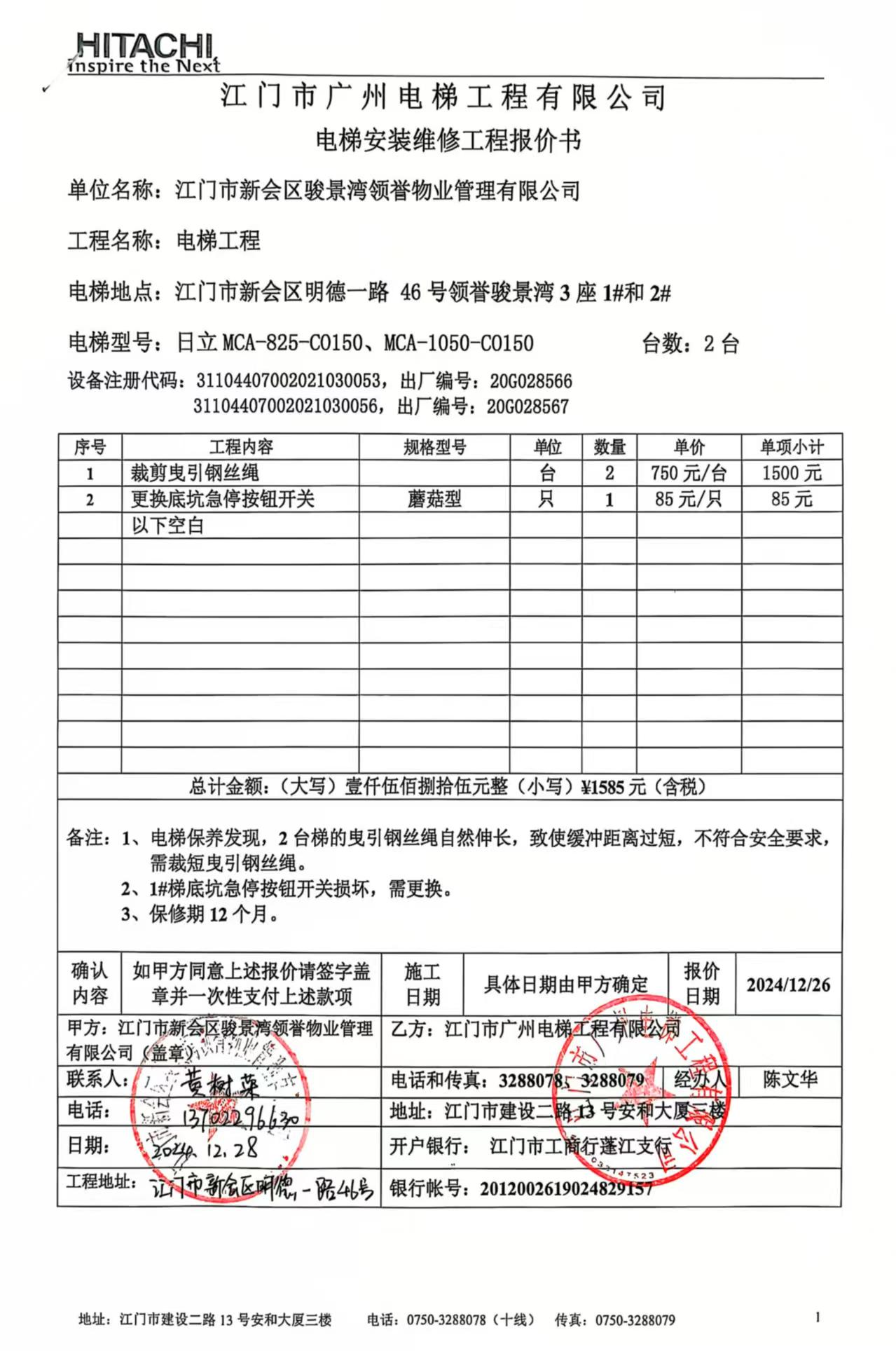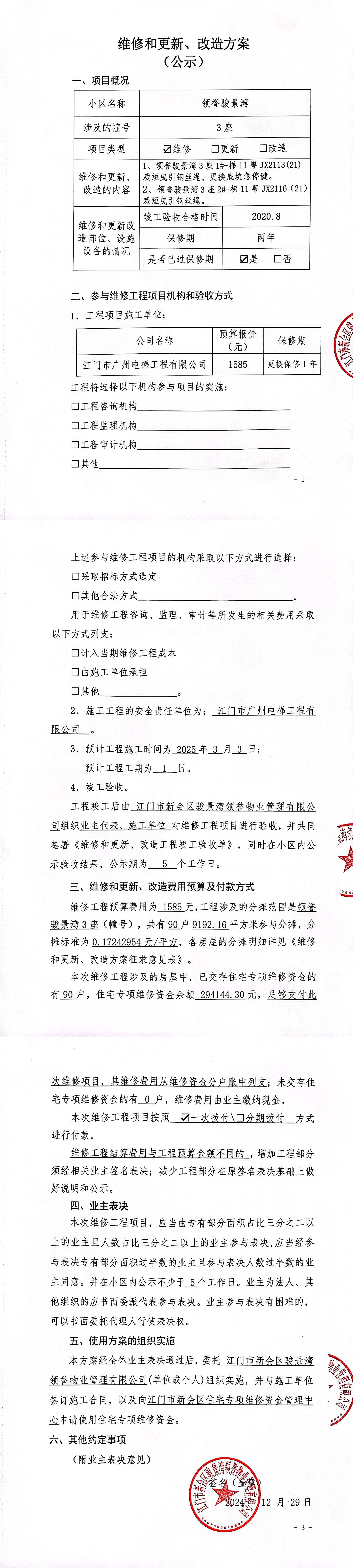 <td VALIGN="top" VALUES="" STYLE="border-width:0" BINDTYPE="0" ROWSPAN="19" COLSPAN="7" DATASOURCE="投票结果" ><font style="font-size:14pt;"><p style="white-space: normal; font-family: 宋体; line-height: 1.75em;">领誉骏景湾领誉骏景湾3座全体业主:</p><p style="white-space: normal; font-family: 宋体; line-height: 1.75em; text-indent: 2em;">本小区关于领誉骏景湾3座1#2#电梯裁短曳引钢丝绳,1#更换底坑急停键使用维修资金的投票的投票已表决结束,询异时间从2025年01月20日开始,投票询异公示期间,业主可通过微信查询自己的表决情况或可凭身份证件申请查询自己的表决情况;如公示的业主表决情况与查询的本人表决意见不一致的,可以以书面形式向投票组织机构申诉,投票组织机构予以纠正并重新公示表决结果。异议提出人对投票组织机构的处理仍有异议的,可以向街道办事处(镇人民政府)反映处理,涉及住宅专项维修资金的,可向属地住宅专项维修资金管理中心反映处理。</p><p style="white-space: normal;"><br/></p><p style="white-space: normal; font-family: 宋体; line-height: 1.75em;"><strong>附件:</strong></p><p style="white-space: normal; font-family: 宋体; line-height: 1.75em;"><strong>一、投票范围</strong></p><p style="white-space: normal; font-family: 宋体; line-height: 1.75em; text-indent: 2em;">领誉骏景湾领誉骏景湾3座</p><p style="white-space: normal; font-family: 宋体; line-height: 1.75em; text-indent: 2em;">总人数(专有部分人数之和):90</p><p style="white-space: normal; font-family: 宋体; line-height: 1.75em; text-indent: 2em;"><span style="font-family: 宋体, SimSun;"><span style="font-family: 宋体; text-indent: 32px;"><span style="font-family: 宋体; text-indent: 32px;">总户数:90</span></span></span></p><p style="white-space: normal; font-family: 宋体; line-height: 1.75em; text-indent: 2em;">建筑物总面积(专有部分面积之和):9192.16㎡</p><p style="white-space: normal; font-family: 宋体; line-height: 1.75em;"><strong>二、询异公示起止时间</strong></p><p dir="ltr" style="white-space: normal; font-family: 宋体; line-height: 1.75em; text-indent: 2em;"><span style="text-indent: 36px;">2025年01月20日至2025年01月30日</span></p><p style="white-space: normal; font-family: 宋体; line-height: 1.75em;"><strong>三、投票详细描述</strong></p><p style="white-space: normal; font-family: 宋体; line-height: 1.75em; text-indent: 2em;"><p> 领誉骏景湾3座1#梯11粤JX2113(21)和2#梯11粤JX2116(21)经保养发现:</p><p>1、2台梯的曳引钢丝绳自然伸长,致使缓冲距离过短,不符合安全要求,需裁短曳引钢丝绳;</p><p>2、1#梯底坑急停按钮开关损坏,需更换。</p><p>现对3座1#2#电梯进行维修,工程维修预算金额为1585元,项目最终费用以施工合同签订金额为准。因已过保修期,维修费用由相关业主按建筑面积分摊,每平方约0.17242954元,详见公示附件。如业主手机不能正常通过微信投票,请联系物业公司进行线下纸质投票,物业电话:0750-6123996。</p></p><p style="white-space: normal; font-family: 宋体; line-height: 1.75em;"><strong>四、计票规则</strong></p><p style="white-space: normal; font-family: 宋体; line-height: 1.75em; text-indent: 2em;">表决事项:使用建筑物及其附属设施的维修资金<br /><p style='text-align: left; font-family: 宋体; font-size: 16px; line-height: 1.75em; text-indent: 2em;'>计票规则:弃权票不并入其它项 未表决票不并入其它项</p></p><p style="white-space: normal; font-family: 宋体; line-height: 1.75em;"><strong>五、通过规则</strong></p><p style="white-space: normal; font-family: 宋体; line-height: 1.75em;"><strong><strong style="white-space: normal;"><span style="font-family: 宋体, SimSun;"> 根据《中华人民共和国民法典》第二百七十八条规定:业主共同决定事项,应当由专有部分面积占比三分之二以上的业主且人数占比三分之二以上的业主参与表决。</span></strong></strong></p><p style="white-space: normal; font-family: 宋体; line-height: 1.75em; text-indent: 2em;">表决事项:使用建筑物及其附属设施的维修资金<br /><p style='text-align: left; font-family: 宋体; font-size: 16px; line-height: 1.75em; text-indent: 2em;'>通过规则:双2/3以上参与表决,参与表决双过半同意</p></p><p style="white-space: normal; font-family: 宋体; line-height: 1.75em;"><strong>六、投票结果</strong></p><p style="white-space: normal; font-family: 宋体; line-height: 1.75em; text-indent: 2em;"><div id='resultTable'><table style='table-layout: fixed; font-size:12px; margin-top:10px' width='100%' border='0' cellspacing='0' cellpadding='0'><tr><td height='28' colspan='10' align='center' style='border: 1px solid #666'><strong style='font-size: 14px;'> 使用建筑物及其附属设施的维修资金</strong></td> </tr><tr id='trfirst'><td height='28' colspan='4' style='border-left: 1px solid #666; border-bottom: 1px solid #666'><strong> 申报单位:</strong> 江门市新会区骏景湾领誉物业管理有限公司</td><td colspan='3' style='border-left: 1px solid #666; border-bottom: 1px solid #666'><strong> 联系方式:</strong> 0750-6123996 </td><td colspan='3' style='border-left: 1px solid #666; border-bottom: 1px solid #666; border-right: 1px solid #666'><strong> 申报日期:</strong> 2025年1月6日 </td></tr><tr> <td height='28' colspan='5' style='border-left: 1px solid #666; border-bottom: 1px solid #666'><strong> 总人数(专有部分人数之和):</strong>90人 </td><td colspan='5' style='border-left: 1px solid #666; border-bottom: 1px solid #666; border-right: 1px solid #666'><strong> 建筑物总面积(专有部分面积之和):</strong>9192.16㎡ </td> </tr><tr><td height='28' colspan='10' bgcolor='#F3F3F3' style='border-left: 1px solid #666;border-bottom: 1px solid 