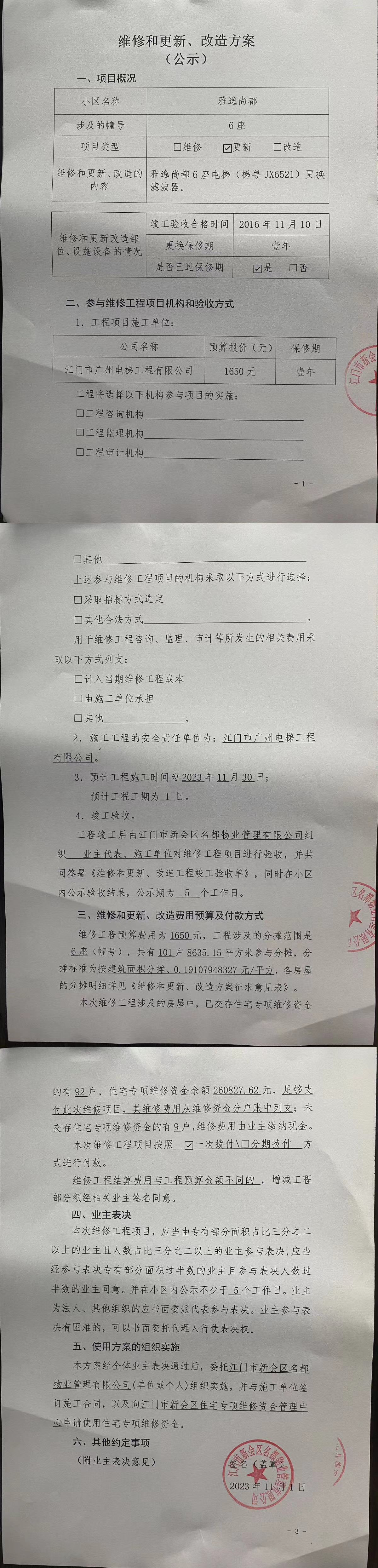 <td valign="top" values="" style="border-width:0" bindtype="0" rowspan="17" colspan="7" datasource="投票结果"><font style=" font-family:方正小标宋简体;font-size:14pt;"><p style="line-height: 1.75em;"><span style="font-family: 宋体, SimSun;">各位尊敬的业主:</span><br></p><p style="text-indent: 2em; line-height: 1.75em;"><span style="font-family: 宋体, SimSun;">根据法律法规的规定,本小区业主利用“江门市物业事项表决管理系统”已对本小区公共事务决策事项进行了表决,在经过7日的询异公示期后,未收到业主有效的异议。现将投票结果公告,并就产生的法律效力说明如下:</span></p><p style="line-height: 1.75em; text-indent: 0em;"><strong style="text-indent: 2em;"><span style="font-family: 宋体, SimSun;">一、投票范围</span></strong></p><p style="text-indent: 2em; line-height: 1.75em;"><span style="font-family: 宋体, SimSun;">雅逸尚都雅逸尚都6座</span></p><p style="text-indent: 2em; line-height: 1.75em;"><span style="font-family: 宋体, SimSun;">总人数(专有部分人数之和):99</span></p><p style="text-indent: 2em; line-height: 1.75em;"><span style="font-family: 宋体, SimSun;"><span style="font-family: 宋体, SimSun; text-indent: 32px;"><span style="font-family: 宋体; text-indent: 32px;">总户数:101</span></span></span></p><p style="text-indent: 2em; line-height: 1.75em;"><span style="font-family: 宋体, SimSun;">建筑物总面积(专有部分面积之和):8635.15㎡</span></p><p style="line-height: 1.75em;"><strong><span style="font-family: 宋体, SimSun;">二、投票结果公告时间</span></strong></p><p style="text-indent: 2em; line-height: 1.75em;"><span style="font-family: 宋体, SimSun;">从2023年11月22日开始</span></p><p style="line-height: 1.75em;"><strong><span style="font-family: 宋体, SimSun;">三、计票规则</span></strong></p><p style="text-indent: 2em; line-height: 1.75em;"><span style="font-family: 宋体, SimSun;">表决事项:使用建筑物及其附属设施的维修资金<br></span></p><p style="font-family: 宋体, SimSun;line-height: 1.75em; text-indent: 2em;">计票规则:弃权票不并入其它项 未表决票不并入其它项</p><p></p><p style="line-height: 1.75em;"><strong><span style="font-family: 宋体, SimSun;">四、通过规则</span></strong></p><p style="line-height: 1.75em;"><strong><span style="font-family: 宋体, SimSun;"> 根据《中华人民共和国民法典》第二百七十八条规定:业主共同决定事项,应当由专有部分面积占比三分之二以上的业主且人数占比三分之二以上的业主参与表决。</span></strong></p><p style="text-indent: 2em; line-height: 1.75em;"><span style="font-family: 宋体, SimSun;"><span style="font-family: 宋体, SimSun; text-indent: 32px;">表决事项:使用建筑物及其附属设施的维修资金<br></span></span></p><p style="font-family: 宋体, SimSun;line-height: 1.75em; text-indent: 2em;">通过规则:参与表决专有部分面积过半数的业主且参与表决人数过半数的业主同意</p><p></p><p style="line-height: 1.75em;"><strong><span style="font-family: 宋体, SimSun;">五、投票结果</span></strong></p><p style="line-height: 1.75em; text-indent: 2em;"><span style="font-family: 宋体, SimSun; text-indent: 2em;"></span></p><div id="resultTable"><table style="table-layout: fixed; font-size:12px; margin-top:10px" width="100%" border="0" cellspacing="0" cellpadding="0"><tbody><tr><td height="28" colspan="10" align="center" style="border: 1px solid #666"><strong style="font-size: 14px;"> 使用建筑物及其附属设施的维修资金</strong></td> </tr><tr id="trfirst"><td height="28" colspan="4" style="border-left: 1px solid #666; border-bottom: 1px solid #666"><strong> 申报单位:</strong> 江门市新会区名都物业管理有限公司</td><td colspan="3" style="border-left: 1px solid #666; border-bottom: 1px solid #666"><strong> 联系方式:</strong> 6609908 </td><td colspan="3" style="border-left: 1px solid #666; border-bottom: 1px solid #666; border-right: 1px solid #666"><strong> 申报日期:</strong> 2023年11月2日 </td></tr><tr> <td height="28" colspan="5" style="border-left: 1px solid #666; border-bottom: 1px solid #666"><strong> 总人数(专有部分人数之和):</strong>99人 </td><td colspan="5" style="border-left: 1px solid #666; border-bottom: 1px solid #666; border-right: 1px solid #666"><strong> 建筑物总面积(专有部分面积之和):</strong>8635.15㎡ </td> </tr><tr><td height="28" colspan="10" bgcolor="#F3F3F3" style="border-left: 1px solid #666;border-bottom: 1px solid #666;border-right: 1px solid #666"><strong> 参与人数及面积统计</strong></td></tr><tr><td height="28" colspan="5" style="border-left: 1px solid #666; border-bottom: 1px solid #666"><strong> 参与表决专有部分人数之和:</strong>69人</td><td colspan="5" style="border-left: 1px solid #666; border-bottom: 1px solid #666; border-right: 1px solid #666"><strong> 参与表决占有表决权总人数比例:</strong>69.70%</td></tr><tr><td height="28" colspan="5" style="border-left: 1px solid #666; border-bottom: 1px solid #666"><strong> 参与表决专有部分面积之和:</strong>5920.14㎡</td><td colspan="5" style="border-left: 1px solid #666; border-bottom: 1px solid #666; border-right: 1px solid #666"><strong> 参与表决占有表决权总面积比例:</strong>68.56%</td></tr><tr><td height="28" colspan="10" bgcolor="#F3F3F3" style="border-left: 1px solid #666; border-bottom: 1px solid #666;border-right: 1px solid #666"> <strong> 未参与人数及面积统计</strong></td> </tr><tr><td height="28" colspan="5" style="border-left: 1px solid #666; border-bottom: 1px solid #666"><strong> 未参与表决专有部分人数之和:</strong>30人 </td><td colspan="5" style="border-left: 1px solid #666; border-bottom: 1px solid #666; border-right: 1px solid #666"><strong> 未参与表决占有表决权总人数比例:<
