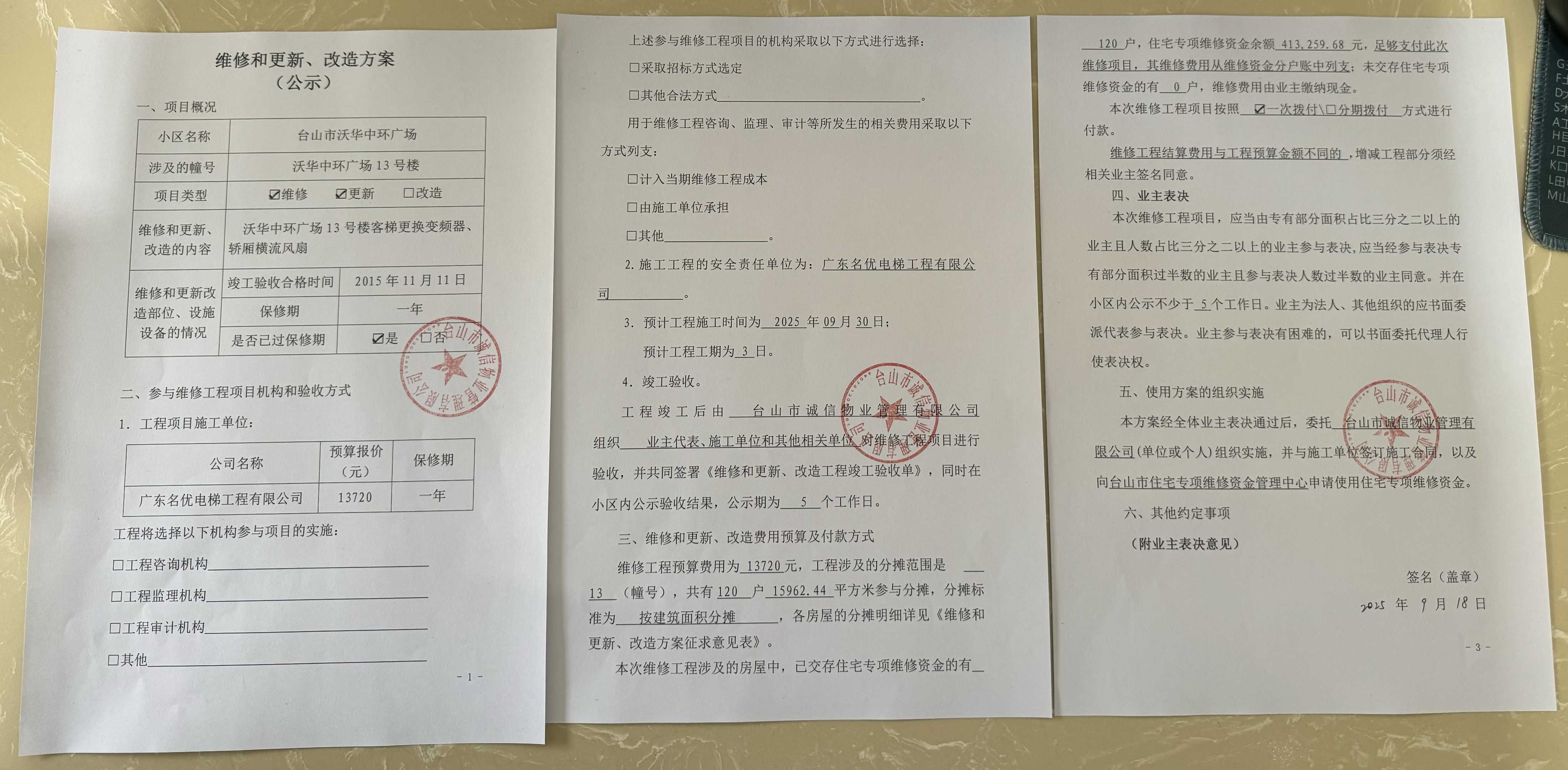 <td VALIGN="top" VALUES="" STYLE="border-width:0" BINDTYPE="0" ROWSPAN="19" COLSPAN="7" DATASOURCE="投票结果" ><font style="font-size:14pt;"><p style="white-space: normal; font-family: 宋体; line-height: 1.75em;">台山沃华中环广场台山沃华中环广场13号楼全体业主:</p><p style="white-space: normal; font-family: 宋体; line-height: 1.75em; text-indent: 2em;">本小区关于沃华中环广场13号楼客梯更换变频器、轿厢横流风扇使用维修资金的投票的投票已表决结束,询异时间从2025年10月03日开始,投票询异公示期间,业主可通过微信查询自己的表决情况或可凭身份证件申请查询自己的表决情况;如公示的业主表决情况与查询的本人表决意见不一致的,可以以书面形式向投票组织机构申诉,投票组织机构予以纠正并重新公示表决结果。异议提出人对投票组织机构的处理仍有异议的,可以向街道办事处(镇人民政府)反映处理,涉及住宅专项维修资金的,可向属地住宅专项维修资金管理中心反映处理。</p><p style="white-space: normal;"><br/></p><p style="white-space: normal; font-family: 宋体; line-height: 1.75em;"><strong>附件:</strong></p><p style="white-space: normal; font-family: 宋体; line-height: 1.75em;"><strong>一、投票范围</strong></p><p style="white-space: normal; font-family: 宋体; line-height: 1.75em; text-indent: 2em;">台山沃华中环广场台山沃华中环广场13号楼</p><p style="white-space: normal; font-family: 宋体; line-height: 1.75em; text-indent: 2em;">总人数(专有部分人数之和):120</p><p style="white-space: normal; font-family: 宋体; line-height: 1.75em; text-indent: 2em;"><span style="font-family: 宋体, SimSun;"><span style="font-family: 宋体; text-indent: 32px;"><span style="font-family: 宋体; text-indent: 32px;">总户数:120</span></span></span></p><p style="white-space: normal; font-family: 宋体; line-height: 1.75em; text-indent: 2em;">建筑物总面积(专有部分面积之和):15962.44㎡</p><p style="white-space: normal; font-family: 宋体; line-height: 1.75em;"><strong>二、询异公示起止时间</strong></p><p dir="ltr" style="white-space: normal; font-family: 宋体; line-height: 1.75em; text-indent: 2em;"><span style="text-indent: 36px;">2025年10月03日至2025年10月13日</span></p><p style="white-space: normal; font-family: 宋体; line-height: 1.75em;"><strong>三、投票详细描述</strong></p><p style="white-space: normal; font-family: 宋体; line-height: 1.75em; text-indent: 2em;"><p> 小区13号楼客梯故障,经检查,是由于客梯变频器长期供电工作内部电器元件出现损坏,无信号输出,造成电梯无法启动,不能正常运行;轿厢横流风扇因长期连续运行,目前已损坏,影响电梯内通风系统的正常运作。</p><p> 现对13号楼客梯进行维修,工程维修预算金额为13720元,项目最终费用以施工合同签订金额为准。因已过保修期,维修费用由相关业主按建筑面积分摊,每平方约0.86元,详见公示附件。如业主手机不能正常通过微信投票,请联系物业公司进行线下纸质投票,物业电话:0750-5555839,5555819。</p></p><p style="white-space: normal; font-family: 宋体; line-height: 1.75em;"><strong>四、计票规则</strong></p><p style="white-space: normal; font-family: 宋体; line-height: 1.75em; text-indent: 2em;">表决事项:使用建筑物及其附属设施的维修资金<br /><p style='text-align: left; font-family: 宋体; font-size: 16px; line-height: 1.75em; text-indent: 2em;'>计票规则:弃权票不并入其它项 未表决票不并入其它项</p></p><p style="white-space: normal; font-family: 宋体; line-height: 1.75em;"><strong>五、通过规则</strong></p><p style="white-space: normal; font-family: 宋体; line-height: 1.75em;"><strong><strong style="white-space: normal;"><span style="font-family: 宋体, SimSun;"> 根据《中华人民共和国民法典》第二百七十八条规定:业主共同决定事项,应当由专有部分面积占比三分之二以上的业主且人数占比三分之二以上的业主参与表决。</span></strong></strong></p><p style="white-space: normal; font-family: 宋体; line-height: 1.75em; text-indent: 2em;">表决事项:使用建筑物及其附属设施的维修资金<br /><p style='text-align: left; font-family: 宋体; font-size: 16px; line-height: 1.75em; text-indent: 2em;'>通过规则:双2/3以上参与表决,参与表决双过半同意</p></p><p style="white-space: normal; font-family: 宋体; line-height: 1.75em;"><strong>六、投票结果</strong></p><p style="white-space: normal; font-family: 宋体; line-height: 1.75em; text-indent: 2em;"><div id='resultTable'><table style='table-layout: fixed; font-size:12px; margin-top:10px' width='100%' border='0' cellspacing='0' cellpadding='0'><tr><td height='28' colspan='10' align='center' style='border: 1px solid #666'><strong style='font-size: 14px;'> 使用建筑物及其附属设施的维修资金</strong></td> </tr><tr id='trfirst'><td height='28' colspan='4' style='border-left: 1px solid #666; border-bottom: 1px solid #666'><strong> 申报单位:</strong> 台山市诚信物业管理有限公司</td><td colspan='3' style='border-left: 1px solid #666; border-bottom: 1px solid #666'><strong> 联系方式:</strong> 5555819 </td><td colspan='3' style='border-left: 1px solid #666; border-bottom: 1px solid #666; border-right: 1px solid #666'><strong> 申报日期:</strong> 2025年9月18日 </td></tr><tr> <td height='28' colspan='5' style='border-left: 1px solid #666; border-bottom: 1px solid #666'><strong> 总人数(专有部分人数之和):</strong>120人 </td><td colspan='5' style='border-left: 1px solid #666; border-bottom: 1px solid #666; border-right: 1px solid #666'><strong> 建筑物总面积(专有部分面积之和):</strong>15962.44㎡ </td> </tr><tr><td height='28' colspan='10' bgcolor='#F3F3F3' style='border-left: 1p