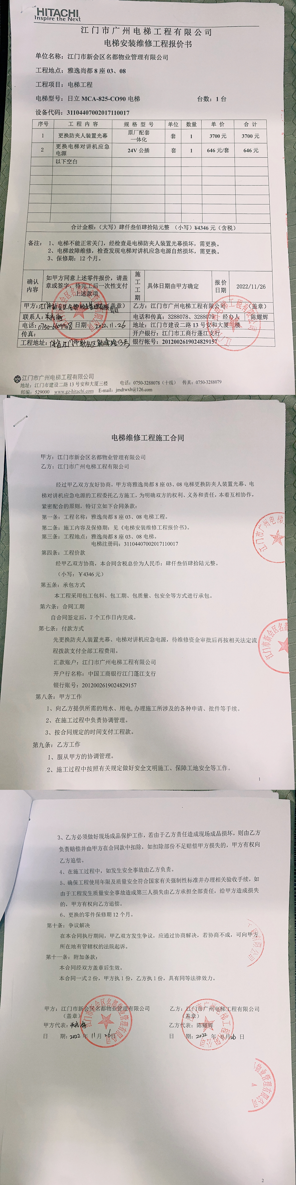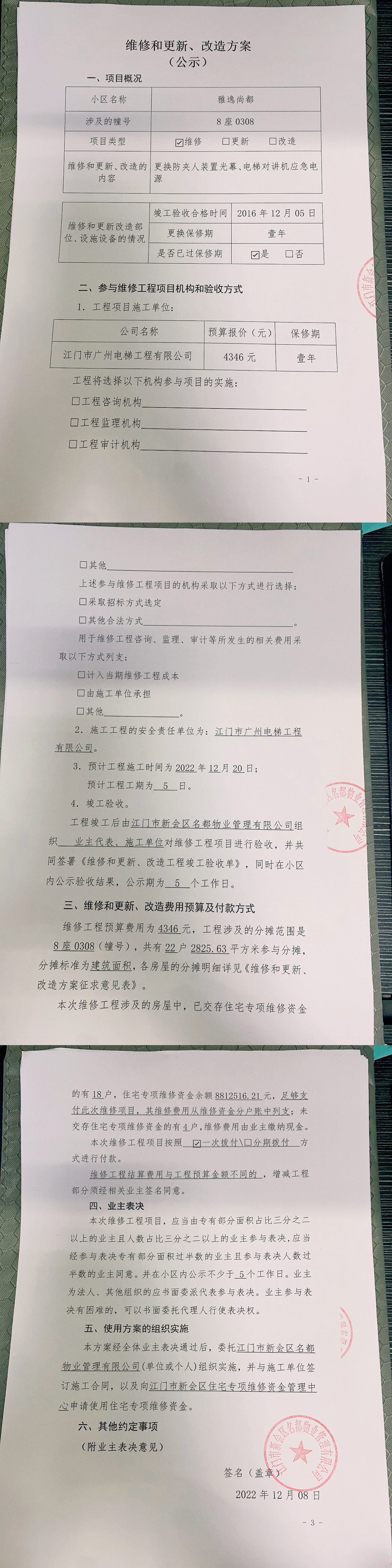 <td VALIGN="top" VALUES="" STYLE="border-width:0" BINDTYPE="0" ROWSPAN="19" COLSPAN="7" DATASOURCE="投票结果" ><font style="font-size:14pt;"><p style="white-space: normal; font-family: 宋体; line-height: 1.75em;">雅逸尚都雅逸尚都8座全体业主:</p><p style="white-space: normal; font-family: 宋体; line-height: 1.75em; text-indent: 2em;">本小区关于雅逸尚都8座0308电梯更换光幕应急电源使用维修资金的投票的投票已表决结束,询异时间从2022年12月22日开始,投票询异公示期间,业主可通过微信查询自己的表决情况或可凭身份证件申请查询自己的表决情况;如公示的业主表决情况与查询的本人表决意见不一致的,可以以书面形式向投票组织机构申诉,投票组织机构予以纠正并重新公示表决结果。异议提出人对投票组织机构的处理仍有异议的,可以向街道办事处(镇人民政府)反映处理,涉及住宅专项维修资金的,可向属地住宅专项维修资金管理中心反映处理。</p><p style="white-space: normal;"><br/></p><p style="white-space: normal; font-family: 宋体; line-height: 1.75em;"><strong>附件:</strong></p><p style="white-space: normal; font-family: 宋体; line-height: 1.75em;"><strong>一、投票范围</strong></p><p style="white-space: normal; font-family: 宋体; line-height: 1.75em; text-indent: 2em;">雅逸尚都雅逸尚都8座</p><p style="white-space: normal; font-family: 宋体; line-height: 1.75em; text-indent: 2em;">总人数(专有部分人数之和):22</p><p style="white-space: normal; font-family: 宋体; line-height: 1.75em; text-indent: 2em;"><span style="font-family: 宋体, SimSun;">总户数:22</span></p><p style="white-space: normal; font-family: 宋体; line-height: 1.75em; text-indent: 2em;">建筑物总面积(专有部分面积之和):2825.63㎡</p><p style="white-space: normal; font-family: 宋体; line-height: 1.75em;"><strong>二、询异公示起止时间</strong></p><p dir="ltr" style="white-space: normal; font-family: 宋体; line-height: 1.75em; text-indent: 2em;"><span style="text-indent: 36px;">2022年12月22日至2022年12月28日</span></p><p style="white-space: normal; font-family: 宋体; line-height: 1.75em;"><strong>三、投票详细描述</strong></p><p style="white-space: normal; font-family: 宋体; line-height: 1.75em; text-indent: 2em;"><p>本小区8座0308电梯不能正常关门,经检查是电梯防夹人装置光幕损坏,存在安全隐患,现立即停止使用电梯,需更换电梯防夹人装置光幕。同时检查发现电梯对讲机对讲机应急电源自然损坏,需要更换。由于8座0308电梯保修期已于2017年12月到期。现需申请使用维修资金对8座0308电梯进行维修,工程维修预算金额为4346元,项目最终费用以施工合同签订金额为准。维修费用的分摊标准为按建筑面积分摊,每平方约1.53807元详见公示附件。如业主手机不能正常通过微信投票,请联系物业公司进行线下纸质投票,物业电话:0750-6609908。</p></p><p style="white-space: normal; font-family: 宋体; line-height: 1.75em;"><strong>四、计票规则</strong></p><p style="white-space: normal; font-family: 宋体; line-height: 1.75em; text-indent: 2em;">表决事项:使用建筑物及其附属设施的维修资金<br /><p style='text-align: left; font-family: 宋体; font-size: 16px; line-height: 1.75em; text-indent: 2em;'>计票规则:弃权票不并入其它项 未表决票不并入其它项</p></p><p style="white-space: normal; font-family: 宋体; line-height: 1.75em;"><strong>五、通过规则</strong></p><p style="white-space: normal; font-family: 宋体; line-height: 1.75em; text-indent: 2em;">表决事项:使用建筑物及其附属设施的维修资金<br /><p style='text-align: left; font-family: 宋体; font-size: 16px; line-height: 1.75em; text-indent: 2em;'>通过规则:参与表决专有部分面积过半数的业主且参与表决人数过半数的业主同意</p></p><p style="white-space: normal; font-family: 宋体; line-height: 1.75em;"><strong>六、投票结果</strong></p><p style="white-space: normal; font-family: 宋体; line-height: 1.75em; text-indent: 2em;"><div id='resultTable'><table style='table-layout: fixed; font-size:12px; margin-top:10px' width='100%' border='0' cellspacing='0' cellpadding='0'><tr><td height='28' colspan='10' align='center' style='border: 1px solid #666'><strong style='font-size: 14px;'> 使用建筑物及其附属设施的维修资金</strong></td> </tr><tr id='trfirst'><td height='28' colspan='4' style='border-left: 1px solid #666; border-bottom: 1px solid #666'><strong> 申报单位:</strong> 江门市新会区名都物业管理有限公司</td><td colspan='3' style='border-left: 1px solid #666; border-bottom: 1px solid #666'><strong> 联系方式:</strong> 6609908 </td><td colspan='3' style='border-left: 1px solid #666; border-bottom: 1px solid #666; border-right: 1px solid #666'><strong> 申报日期:</strong> 2022年12月9日 </td></tr><tr> <td height='28' colspan='5' style='border-left: 1px solid #666; border-bottom: 1px solid #666'><strong> 总人数(专有部分人数之和):</strong>22人 </td><td colspan='5' style='border-left: 1px solid #666; border-bottom: 1px solid #666; border-right: 1px solid #666'><strong> 建筑物总面积(专有部分面积之和):</strong>2825.63㎡ </td> </tr><tr><td height='28' colspan='10' bgcolor='#F3F3F3' style='border-left: 1px solid #666;border-bottom: 1px solid #666;border-right: 1px solid #666'><strong> 参与人数及面积统计</strong></td></tr><tr><td height='28' colspan='5' style='border-left: 1px solid #666; border-bottom: 1px solid #666'><strong> 参与表决专有部分人数之和:</strong>16人</td><td colspan='5' style='border-left: 1px solid #666; border-bottom: 1px solid #666; border-right: 1px solid #666'><strong> 参与表决占有表决权总人数比例:</strong>72.73%</td></tr><tr><td height='28' colspan='5' style
