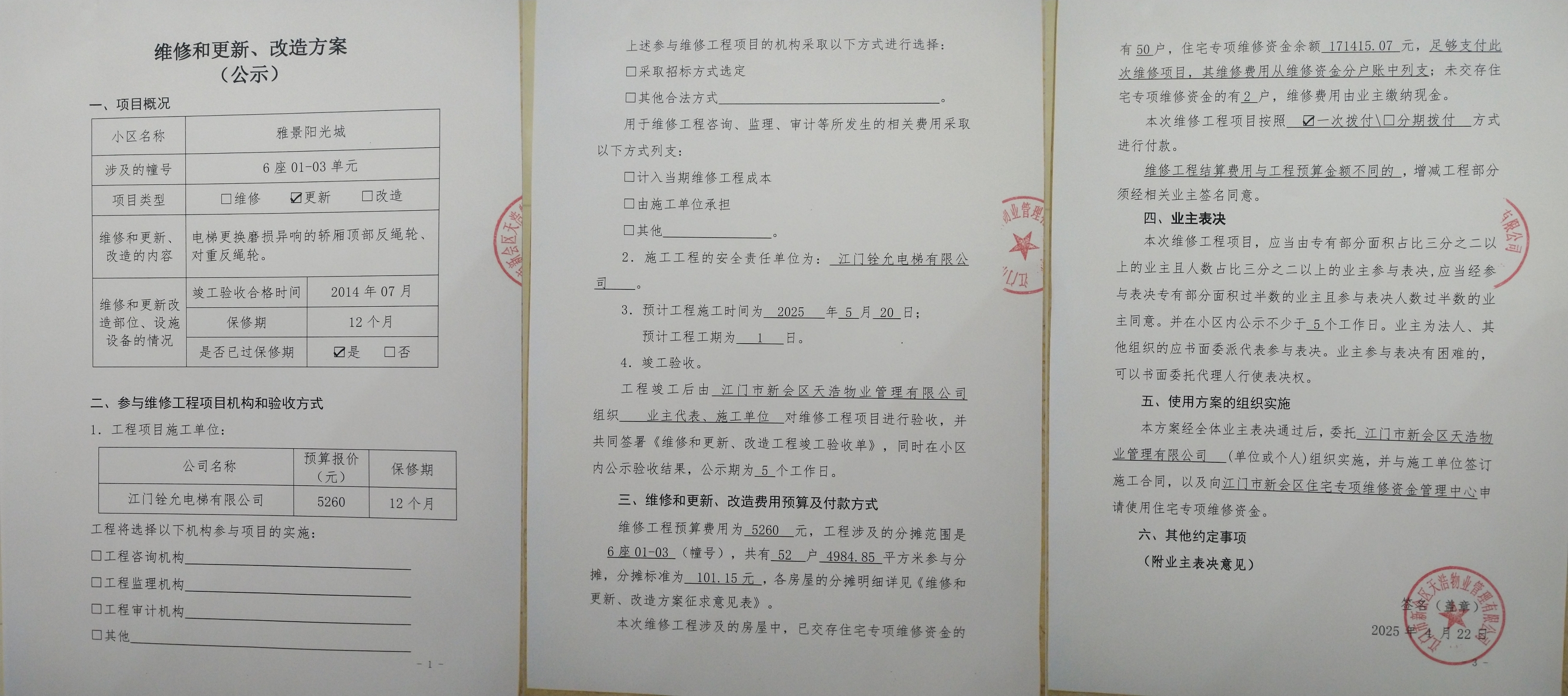 <td VALIGN="top" VALUES="" STYLE="border-width:0" BINDTYPE="0" ROWSPAN="19" COLSPAN="7" DATASOURCE="投票结果" ><font style="font-size:14pt;"><p style="white-space: normal; font-family: 宋体; line-height: 1.75em;">雅景阳光城6座全体业主:</p><p style="white-space: normal; font-family: 宋体; line-height: 1.75em; text-indent: 2em;">本小区关于雅景阳光城6座01-03电梯【梯粤JX4862】更换轿厢顶部反绳轮、对重反绳轮使用维修资金的投票的投票已表决结束,询异时间从2025年05月08日开始,投票询异公示期间,业主可通过微信查询自己的表决情况或可凭身份证件申请查询自己的表决情况;如公示的业主表决情况与查询的本人表决意见不一致的,可以以书面形式向投票组织机构申诉,投票组织机构予以纠正并重新公示表决结果。异议提出人对投票组织机构的处理仍有异议的,可以向街道办事处(镇人民政府)反映处理,涉及住宅专项维修资金的,可向属地住宅专项维修资金管理中心反映处理。</p><p style="white-space: normal;"><br/></p><p style="white-space: normal; font-family: 宋体; line-height: 1.75em;"><strong>附件:</strong></p><p style="white-space: normal; font-family: 宋体; line-height: 1.75em;"><strong>一、投票范围</strong></p><p style="white-space: normal; font-family: 宋体; line-height: 1.75em; text-indent: 2em;">雅景阳光城6座</p><p style="white-space: normal; font-family: 宋体; line-height: 1.75em; text-indent: 2em;">总人数(专有部分人数之和):52</p><p style="white-space: normal; font-family: 宋体; line-height: 1.75em; text-indent: 2em;"><span style="font-family: 宋体, SimSun;"><span style="font-family: 宋体; text-indent: 32px;"><span style="font-family: 宋体; text-indent: 32px;">总户数:52</span></span></span></p><p style="white-space: normal; font-family: 宋体; line-height: 1.75em; text-indent: 2em;">建筑物总面积(专有部分面积之和):4984.85㎡</p><p style="white-space: normal; font-family: 宋体; line-height: 1.75em;"><strong>二、询异公示起止时间</strong></p><p dir="ltr" style="white-space: normal; font-family: 宋体; line-height: 1.75em; text-indent: 2em;"><span style="text-indent: 36px;">2025年05月08日至2025年05月18日</span></p><p style="white-space: normal; font-family: 宋体; line-height: 1.75em;"><strong>三、投票详细描述</strong></p><p style="white-space: normal; font-family: 宋体; line-height: 1.75em; text-indent: 2em;"><p>雅景阳光城6座01-03电梯【梯粤JX4862】上报运行时产生异响,经检查确认为电梯轿厢顶部反绳轮内部、对重反绳轮内部轴承磨损、内圈磨损扩张、无法固定轴承,日常使用自然磨损损坏,已过保修期。现需申请使用维修资金对6座01-03电梯【梯粤JX4862】进行维修,工程维修预算金额为5260元,项目最终费用以施工合同签订金额为准。维修费用的分摊标准为按分户分摊,每户分摊101.15元,详见公示附件。如业主不能正常通过微信投票,请联系物业公司进行线下纸质投票,物业电话:0750-6303009</p></p><p style="white-space: normal; font-family: 宋体; line-height: 1.75em;"><strong>四、计票规则</strong></p><p style="white-space: normal; font-family: 宋体; line-height: 1.75em; text-indent: 2em;">表决事项:使用建筑物及其附属设施的维修资金<br /><p style='text-align: left; font-family: 宋体; font-size: 16px; line-height: 1.75em; text-indent: 2em;'>计票规则:弃权票不并入其它项 未表决票不并入其它项</p></p><p style="white-space: normal; font-family: 宋体; line-height: 1.75em;"><strong>五、通过规则</strong></p><p style="white-space: normal; font-family: 宋体; line-height: 1.75em;"><strong><strong style="white-space: normal;"><span style="font-family: 宋体, SimSun;"> 根据《中华人民共和国民法典》第二百七十八条规定:业主共同决定事项,应当由专有部分面积占比三分之二以上的业主且人数占比三分之二以上的业主参与表决。</span></strong></strong></p><p style="white-space: normal; font-family: 宋体; line-height: 1.75em; text-indent: 2em;">表决事项:使用建筑物及其附属设施的维修资金<br /><p style='text-align: left; font-family: 宋体; font-size: 16px; line-height: 1.75em; text-indent: 2em;'>通过规则:双2/3以上参与表决,参与表决双过半同意</p></p><p style="white-space: normal; font-family: 宋体; line-height: 1.75em;"><strong>六、投票结果</strong></p><p style="white-space: normal; font-family: 宋体; line-height: 1.75em; text-indent: 2em;"><div id='resultTable'><table style='table-layout: fixed; font-size:12px; margin-top:10px' width='100%' border='0' cellspacing='0' cellpadding='0'><tr><td height='28' colspan='10' align='center' style='border: 1px solid #666'><strong style='font-size: 14px;'> 使用建筑物及其附属设施的维修资金</strong></td> </tr><tr id='trfirst'><td height='28' colspan='4' style='border-left: 1px solid #666; border-bottom: 1px solid #666'><strong> 申报单位:</strong> 江门市新会区天浩物业管理有限公司</td><td colspan='3' style='border-left: 1px solid #666; border-bottom: 1px solid #666'><strong> 联系方式:</strong> </td><td colspan='3' style='border-left: 1px solid #666; border-bottom: 1px solid #666; border-right: 1px solid #666'><strong> 申报日期:</strong> 2025年4月23日 </td></tr><tr> <td height='28' colspan='5' style='border-left: 1px solid #666; border-bottom: 1px solid #666'><strong> 总人数(专有部分人数之和):</strong>52人 </td><td colspan='5' style='border-left: 1px solid #666; border-bottom: 1px solid #666; border-right: 1px solid #666'><strong> 建筑物总面积(专有部分面积之和):</strong>4984.85㎡ </td> </tr><tr><td height='28' colspan='10' bgcolor='#F3F3F3' style='border-left: 1px solid #666;border-bottom: 1px solid #666;border-right: 1px solid #66