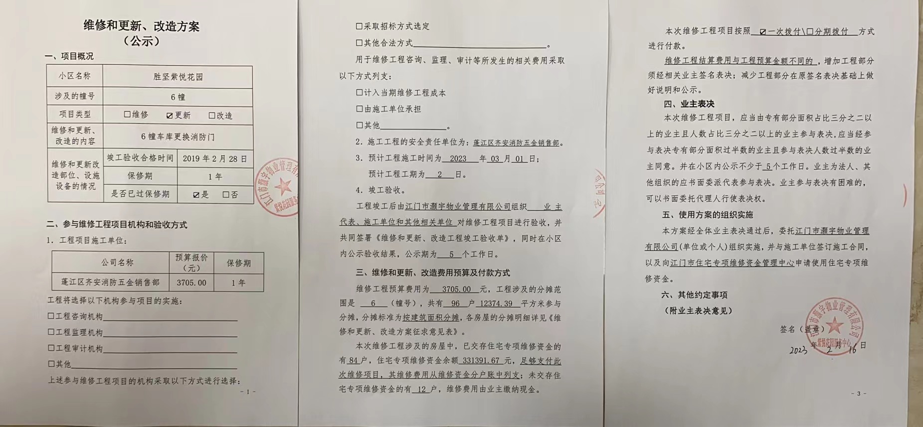 <td VALIGN="top" VALUES="" STYLE="border-width:0" BINDTYPE="0" ROWSPAN="19" COLSPAN="7" DATASOURCE="投票结果" ><font style="font-size:14pt;"><p style="white-space: normal; font-family: 宋体; line-height: 1.75em;">蓬江区胜坚紫悦花园蓬江区胜坚紫悦花园6幢全体业主:</p><p style="white-space: normal; font-family: 宋体; line-height: 1.75em; text-indent: 2em;">本小区关于江门胜坚紫悦花园6幢车库更换消防门使用维修资金的投票的投票已表决结束,询异时间从2023年02月22日开始,投票询异公示期间,业主可通过微信查询自己的表决情况或可凭身份证件申请查询自己的表决情况;如公示的业主表决情况与查询的本人表决意见不一致的,可以以书面形式向投票组织机构申诉,投票组织机构予以纠正并重新公示表决结果。异议提出人对投票组织机构的处理仍有异议的,可以向街道办事处(镇人民政府)反映处理,涉及住宅专项维修资金的,可向属地住宅专项维修资金管理中心反映处理。</p><p style="white-space: normal;"><br/></p><p style="white-space: normal; font-family: 宋体; line-height: 1.75em;"><strong>附件:</strong></p><p style="white-space: normal; font-family: 宋体; line-height: 1.75em;"><strong>一、投票范围</strong></p><p style="white-space: normal; font-family: 宋体; line-height: 1.75em; text-indent: 2em;">蓬江区胜坚紫悦花园蓬江区胜坚紫悦花园6幢</p><p style="white-space: normal; font-family: 宋体; line-height: 1.75em; text-indent: 2em;">总人数(专有部分人数之和):85</p><p style="white-space: normal; font-family: 宋体; line-height: 1.75em; text-indent: 2em;"><span style="font-family: 宋体, SimSun;">总户数:96</span></p><p style="white-space: normal; font-family: 宋体; line-height: 1.75em; text-indent: 2em;">建筑物总面积(专有部分面积之和):12374.39㎡</p><p style="white-space: normal; font-family: 宋体; line-height: 1.75em;"><strong>二、询异公示起止时间</strong></p><p dir="ltr" style="white-space: normal; font-family: 宋体; line-height: 1.75em; text-indent: 2em;"><span style="text-indent: 36px;">2023年02月22日至2023年02月28日</span></p><p style="white-space: normal; font-family: 宋体; line-height: 1.75em;"><strong>三、投票详细描述</strong></p><p style="white-space: normal; font-family: 宋体; line-height: 1.75em; text-indent: 2em;"><p><span style=";font-family:宋体;color:rgb(0,0,8);font-size:19px"> </span><span style="font-size: 16px;"><span style="font-family: 宋体; color: rgb(0, 0, 8);">本小区6幢</span><span style="font-family: 宋体;">车库消防门严重变形,门锁损坏不能正常关闭,物业服务中心一直在反复维修和整改,再无法维修使用,为了尽早排除安全隐患,需要更换车库消防门。由于6幢车库消防门已过保修期。现需申请使用维修资金对6幢车库消防门进行更换,更换金额为:3705.00元,项目最终费用以消防设备报价合同签订金额为准。更换消防门费用的分摊标准为按建筑面积分摊,每平方约:0.299元,详见公示附件。如业主手机不能正常通过微信投票,请联系物业公司进行线下纸质投票,物业电话:0750-3339221。</span></span></p><p><span style="font-family: 宋体; font-size: 19px;"><br/></span></p><p><br/></p></p><p style="white-space: normal; font-family: 宋体; line-height: 1.75em;"><strong>四、计票规则</strong></p><p style="white-space: normal; font-family: 宋体; line-height: 1.75em; text-indent: 2em;">表决事项:使用建筑物及其附属设施的维修资金<br /><p style='text-align: left; font-family: 宋体; font-size: 16px; line-height: 1.75em; text-indent: 2em;'>计票规则:弃权票不并入其它项 未表决票不并入其它项</p></p><p style="white-space: normal; font-family: 宋体; line-height: 1.75em;"><strong>五、通过规则</strong></p><p style="white-space: normal; font-family: 宋体; line-height: 1.75em; text-indent: 2em;">表决事项:使用建筑物及其附属设施的维修资金<br /><p style='text-align: left; font-family: 宋体; font-size: 16px; line-height: 1.75em; text-indent: 2em;'>通过规则:参与表决专有部分面积过半数的业主且参与表决人数过半数的业主同意</p></p><p style="white-space: normal; font-family: 宋体; line-height: 1.75em;"><strong>六、投票结果</strong></p><p style="white-space: normal; font-family: 宋体; line-height: 1.75em; text-indent: 2em;"><div id='resultTable'><table style='table-layout: fixed; font-size:12px; margin-top:10px' width='100%' border='0' cellspacing='0' cellpadding='0'><tr><td height='28' colspan='10' align='center' style='border: 1px solid #666'><strong style='font-size: 14px;'> 使用建筑物及其附属设施的维修资金</strong></td> </tr><tr id='trfirst'><td height='28' colspan='4' style='border-left: 1px solid #666; border-bottom: 1px solid #666'><strong> 申报单位:</strong> 江门市灏宇物业管理有限公司</td><td colspan='3' style='border-left: 1px solid #666; border-bottom: 1px solid #666'><strong> 联系方式:</strong> </td><td colspan='3' style='border-left: 1px solid #666; border-bottom: 1px solid #666; border-right: 1px solid #666'><strong> 申报日期:</strong> 2023年2月16日 </td></tr><tr> <td height='28' colspan='5' style='border-left: 1px solid #666; border-bottom: 1px solid #666'><strong> 总人数(专有部分人数之和):</strong>85人 </td><td colspan='5' style='border-left: 1px solid #666; border-bottom: 1px solid #666; border-right: 1px solid #666'><strong> 建筑物总面积(专有部分面积之和):</strong>12374.39㎡ </td> </tr><tr><td height='28' colspan='10' bgcolor='#F3F3F3' style='border-left: 1px solid #666;border-bottom: 1px solid #666;border-right: 1px solid #666'><strong> 参与人数及面积统计</strong></td></tr><tr><td height='28' colspan='5' style='border-left: 1px solid #666; border-bottom: 1px solid #