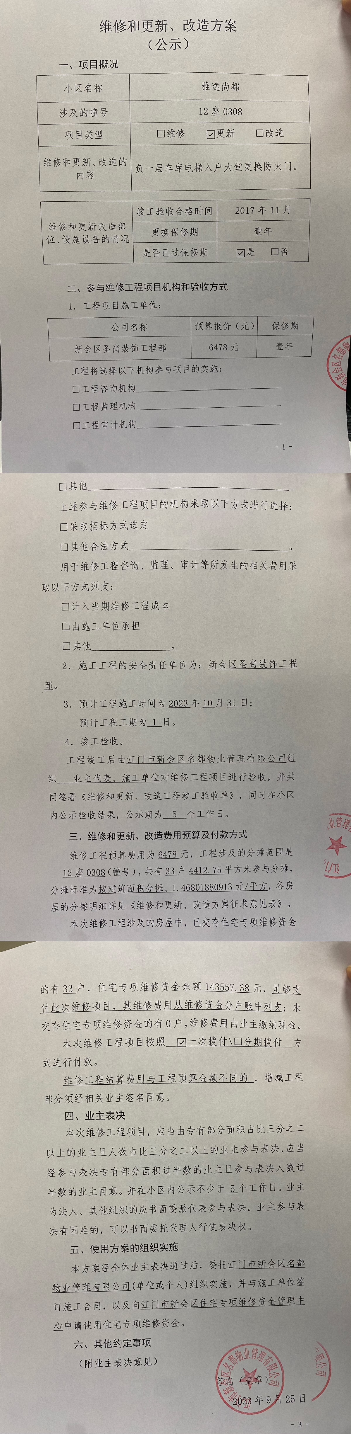 <td valign="top" values="" style="border-width:0" bindtype="0" rowspan="17" colspan="7" datasource="投票结果"><font style=" font-family:方正小标宋简体;font-size:14pt;"><p style="line-height: 1.75em;"><span style="font-family: 宋体, SimSun;">各位尊敬的业主:</span><br></p><p style="text-indent: 2em; line-height: 1.75em;"><span style="font-family: 宋体, SimSun;">根据法律法规的规定,本小区业主利用“江门市物业事项表决管理系统”已对本小区公共事务决策事项进行了表决,在经过7日的询异公示期后,未收到业主有效的异议。现将投票结果公告,并就产生的法律效力说明如下:</span></p><p style="line-height: 1.75em; text-indent: 0em;"><strong style="text-indent: 2em;"><span style="font-family: 宋体, SimSun;">一、投票范围</span></strong></p><p style="text-indent: 2em; line-height: 1.75em;"><span style="font-family: 宋体, SimSun;">雅逸尚都雅逸尚都12座</span></p><p style="text-indent: 2em; line-height: 1.75em;"><span style="font-family: 宋体, SimSun;">总人数(专有部分人数之和):33</span></p><p style="text-indent: 2em; line-height: 1.75em;"><span style="font-family: 宋体, SimSun;"><span style="font-family: 宋体, SimSun; text-indent: 32px;"><span style="font-family: 宋体; text-indent: 32px;">总户数:33</span></span></span></p><p style="text-indent: 2em; line-height: 1.75em;"><span style="font-family: 宋体, SimSun;">建筑物总面积(专有部分面积之和):4412.75㎡</span></p><p style="line-height: 1.75em;"><strong><span style="font-family: 宋体, SimSun;">二、投票结果公告时间</span></strong></p><p style="text-indent: 2em; line-height: 1.75em;"><span style="font-family: 宋体, SimSun;">从2023年10月31日开始</span></p><p style="line-height: 1.75em;"><strong><span style="font-family: 宋体, SimSun;">三、计票规则</span></strong></p><p style="text-indent: 2em; line-height: 1.75em;"><span style="font-family: 宋体, SimSun;">表决事项:使用建筑物及其附属设施的维修资金<br></span></p><p style="font-family: 宋体, SimSun;line-height: 1.75em; text-indent: 2em;">计票规则:弃权票不并入其它项 未表决票不并入其它项</p><p></p><p style="line-height: 1.75em;"><strong><span style="font-family: 宋体, SimSun;">四、通过规则</span></strong></p><p style="line-height: 1.75em;"><strong><span style="font-family: 宋体, SimSun;"> 根据《中华人民共和国民法典》第二百七十八条规定:业主共同决定事项,应当由专有部分面积占比三分之二以上的业主且人数占比三分之二以上的业主参与表决。</span></strong></p><p style="text-indent: 2em; line-height: 1.75em;"><span style="font-family: 宋体, SimSun;"><span style="font-family: 宋体, SimSun; text-indent: 32px;">表决事项:使用建筑物及其附属设施的维修资金<br></span></span></p><p style="font-family: 宋体, SimSun;line-height: 1.75em; text-indent: 2em;">通过规则:参与表决专有部分面积过半数的业主且参与表决人数过半数的业主同意</p><p></p><p style="line-height: 1.75em;"><strong><span style="font-family: 宋体, SimSun;">五、投票结果</span></strong></p><p style="line-height: 1.75em; text-indent: 2em;"><span style="font-family: 宋体, SimSun; text-indent: 2em;"></span></p><div id="resultTable"><table style="table-layout: fixed; font-size:12px; margin-top:10px" width="100%" border="0" cellspacing="0" cellpadding="0"><tbody><tr><td height="28" colspan="10" align="center" style="border: 1px solid #666"><strong style="font-size: 14px;"> 使用建筑物及其附属设施的维修资金</strong></td> </tr><tr id="trfirst"><td height="28" colspan="4" style="border-left: 1px solid #666; border-bottom: 1px solid #666"><strong> 申报单位:</strong> 江门市新会区名都物业管理有限公司</td><td colspan="3" style="border-left: 1px solid #666; border-bottom: 1px solid #666"><strong> 联系方式:</strong> 6609908 </td><td colspan="3" style="border-left: 1px solid #666; border-bottom: 1px solid #666; border-right: 1px solid #666"><strong> 申报日期:</strong> 2023年9月26日 </td></tr><tr> <td height="28" colspan="5" style="border-left: 1px solid #666; border-bottom: 1px solid #666"><strong> 总人数(专有部分人数之和):</strong>33人 </td><td colspan="5" style="border-left: 1px solid #666; border-bottom: 1px solid #666; border-right: 1px solid #666"><strong> 建筑物总面积(专有部分面积之和):</strong>4412.75㎡ </td> </tr><tr><td height="28" colspan="10" bgcolor="#F3F3F3" style="border-left: 1px solid #666;border-bottom: 1px solid #666;border-right: 1px solid #666"><strong> 参与人数及面积统计</strong></td></tr><tr><td height="28" colspan="5" style="border-left: 1px solid #666; border-bottom: 1px solid #666"><strong> 参与表决专有部分人数之和:</strong>25人</td><td colspan="5" style="border-left: 1px solid #666; border-bottom: 1px solid #666; border-right: 1px solid #666"><strong> 参与表决占有表决权总人数比例:</strong>75.76%</td></tr><tr><td height="28" colspan="5" style="border-left: 1px solid #666; border-bottom: 1px solid #666"><strong> 参与表决专有部分面积之和:</strong>3364.96㎡</td><td colspan="5" style="border-left: 1px solid #666; border-bottom: 1px solid #666; border-right: 1px solid #666"><strong> 参与表决占有表决权总面积比例:</strong>76.26%</td></tr><tr><td height="28" colspan="10" bgcolor="#F3F3F3" style="border-left: 1px solid #666; border-bottom: 1px solid #666;border-right: 1px solid #666"> <strong> 未参与人数及面积统计</strong></td> </tr><tr><td height="28" colspan="5" style="border-left: 1px solid #666; border-bottom: 1px solid #666"><strong> 未参与表决专有部分人数之和:</strong>8人 </td><td colspan="5" style="border-left: 1px solid #666; border-bottom: 1px solid #666; border-right: 1px solid #666"><strong> 未参与表决占有表决权总人数比例:</