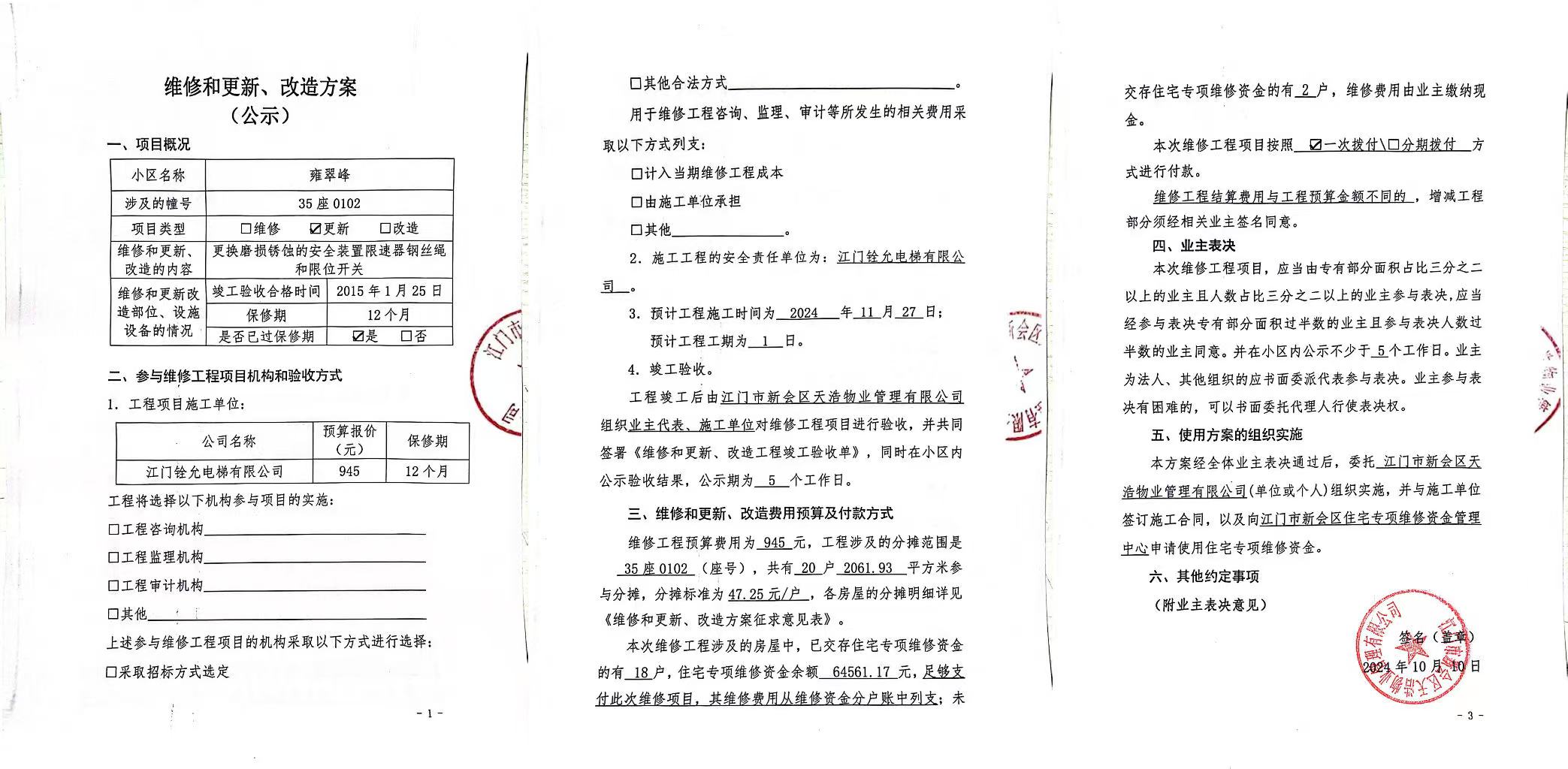 <td VALIGN="top" VALUES="" STYLE="border-width:0" BINDTYPE="0" ROWSPAN="17" COLSPAN="7" DATASOURCE="投票结果" ><font style=" font-family:方正小标宋简体;font-size:14pt;"><p style="line-height: 1.75em;"><span style="font-family: 宋体, SimSun;">各位尊敬的业主:</span><br/></p><p style="text-indent: 2em; line-height: 1.75em;"><span style="font-family: 宋体, SimSun;">根据法律法规的规定,本小区业主利用“江门市物业事项表决管理系统”已对本小区公共事务决策事项进行了表决,在经过7日的询异公示期后,未收到业主有效的异议。现将投票结果公告,并就产生的法律效力说明如下:</span></p><p style="line-height: 1.75em; text-indent: 0em;"><strong style="text-indent: 2em;"><span style="font-family: 宋体, SimSun;">一、投票范围</span></strong></p><p style="text-indent: 2em; line-height: 1.75em;"><span style="font-family: 宋体, SimSun;">雍翠峰雍翠峰35座</span></p><p style="text-indent: 2em; line-height: 1.75em;"><span style="font-family: 宋体, SimSun;">总人数(专有部分人数之和):20</span></p><p style="text-indent: 2em; line-height: 1.75em;"><span style="font-family: 宋体, SimSun;"><span style="font-family: 宋体, SimSun; text-indent: 32px;"><span style="font-family: 宋体; text-indent: 32px;"><span style="font-family: 宋体; text-indent: 32px;">总户数:20</span></span></span></span></p><p style="text-indent: 2em; line-height: 1.75em;"><span style="font-family: 宋体, SimSun;">建筑物总面积(专有部分面积之和):2061.93㎡</span></p><p style="line-height: 1.75em;"><strong><span style="font-family: 宋体, SimSun;">二、投票结果公告时间</span></strong></p><p style="text-indent: 2em; line-height: 1.75em;"><span style="font-family: 宋体, SimSun;"><span style="font-family: 宋体, SimSun; text-indent: 32px;">从2024年10月23日开始</span></span></p><p style="line-height: 1.75em;"><strong><span style="font-family: 宋体, SimSun;">三、计票规则</span></strong></p><p style="text-indent: 2em; line-height: 1.75em;"><span style="font-family: 宋体, SimSun;">表决事项:使用建筑物及其附属设施的维修资金<br /><p style='font-family: 宋体, SimSun;line-height: 1.75em; text-indent: 2em;'>计票规则:弃权票不并入其它项&nbsp;&nbsp;&nbsp;&nbsp;未表决票不并入其它项</p></span></p><p style="line-height: 1.75em;"><strong><span style="font-family: 宋体, SimSun;">四、通过规则</span></strong></p><p style="line-height: 1.75em;"><strong><span style="font-family: 宋体, SimSun;">&nbsp; 根据《中华人民共和国民法典》第二百七十八条规定:业主共同决定事项,应当由专有部分面积占比三分之二以上的业主且人数占比三分之二以上的业主参与表决。</span></strong></p><p style="text-indent: 2em; line-height: 1.75em;"><span style="font-family: 宋体, SimSun;"><span style="font-family: 宋体, SimSun; text-indent: 32px;">表决事项:使用建筑物及其附属设施的维修资金<br /><p style='font-family: 宋体, SimSun;line-height: 1.75em; text-indent: 2em;'>通过规则:双2/3以上参与表决,参与表决双过半同意</p></span></span></p><p style="line-height: 1.75em;"><strong><span style="font-family: 宋体, SimSun;">五、投票结果</span></strong></p><p style="line-height: 1.75em; text-indent: 2em;"><span style="font-family: 宋体, SimSun; text-indent: 2em;"><div id='resultTable'><table style='table-layout: fixed; font-size:12px; margin-top:10px' width='100%' border='0' cellspacing='0' cellpadding='0'><tr><td height='28' colspan='10' align='center' style='border: 1px solid #666'><strong style='font-size: 14px;'> 使用建筑物及其附属设施的维修资金</strong></td> </tr><tr id='trfirst'><td height='28' colspan='4' style='border-left: 1px solid #666; border-bottom: 1px solid #666'><strong>&nbsp;申报单位:</strong> 江门市新会区天浩物业管理有限公司</td><td colspan='3' style='border-left: 1px solid #666; border-bottom: 1px solid #666'><strong>&nbsp;联系方式:</strong> </td><td colspan='3' style='border-left: 1px solid #666; border-bottom: 1px solid #666; border-right: 1px solid #666'><strong>&nbsp;申报日期:</strong> 2024年10月10日 </td></tr><tr> <td height='28' colspan='5' style='border-left: 1px solid #666; border-bottom: 1px solid #666'><strong>&nbsp;列支总人数(专有部分人数之和):</strong>20人 </td><td colspan='5' style='border-left: 1px solid #666; border-bottom: 1px solid #666; border-right: 1px solid #666'><strong>&nbsp;列支建筑物总面积(专有部分面积之和):</strong>2061.93㎡ </td> </tr><tr><td height='28' colspan='10' bgcolor='#F3F3F3' style='border-left: 1px solid #666;border-bottom: 1px solid #666;border-right: 1px solid #666'><strong>&nbsp;参与表决人数及面积统计</strong></td></tr><tr><td height='28' colspan='5' style='border-left: 1px solid #666; border-bottom: 1px solid #666'><strong>&nbsp;参与表决人数:</strong>14人</td><td colspan='5' style='border-left: 1px solid #666; border-bottom: 1px solid #666; border-right: 1px solid #666'><strong>&nbsp;参与表决人数占总人数比例:</strong>70.00%</td></tr><tr><td height='28' colspan='5' style='border-left: 1px solid #666; border-bottom: 1px solid #666'><strong>&nbsp;参与表决面积:</strong>1451.74㎡</td><td colspan='5' style='border-left: 1px solid #666; border-bottom: 1px solid #666; border-right: 1px solid #666'><strong>&nbsp;参与表决面积占总面积比例:</strong>70.41%</td></tr><tr><td height='28' colspan='10' bgcolor='#F3F3F3' style='border-left: 1px solid #666; border-bottom: 1px solid #666;border-right: 1px solid #666'> <strong>&nbsp;参与表决同意人数及面积统计</strong></td> </tr><tr><td height='28' colspan='5' style='border-left: 1px solid #666; border-bottom: 1px solid #666'><strong>&nbsp;参与表决同意人数:</strong>14人 </td><td colspan='5' style='border-left: 1px solid #666; border-bottom: