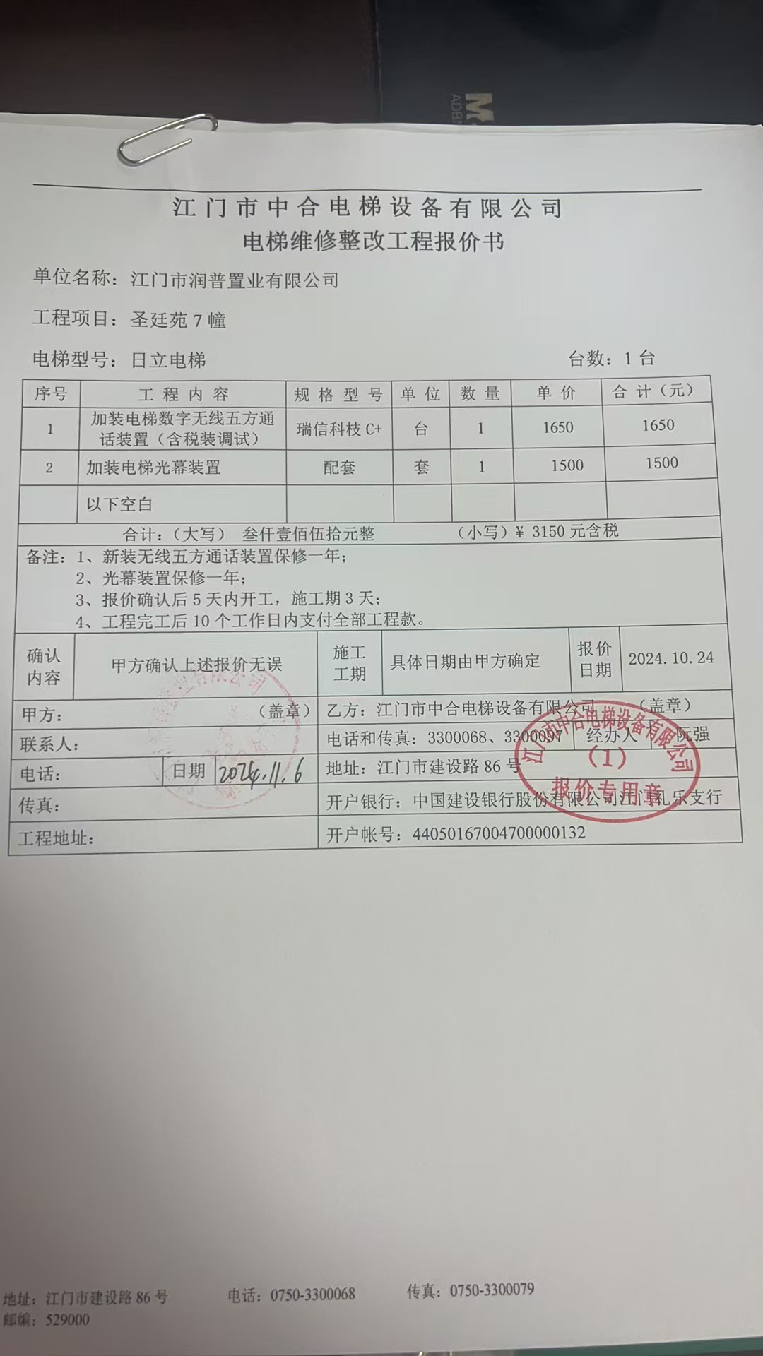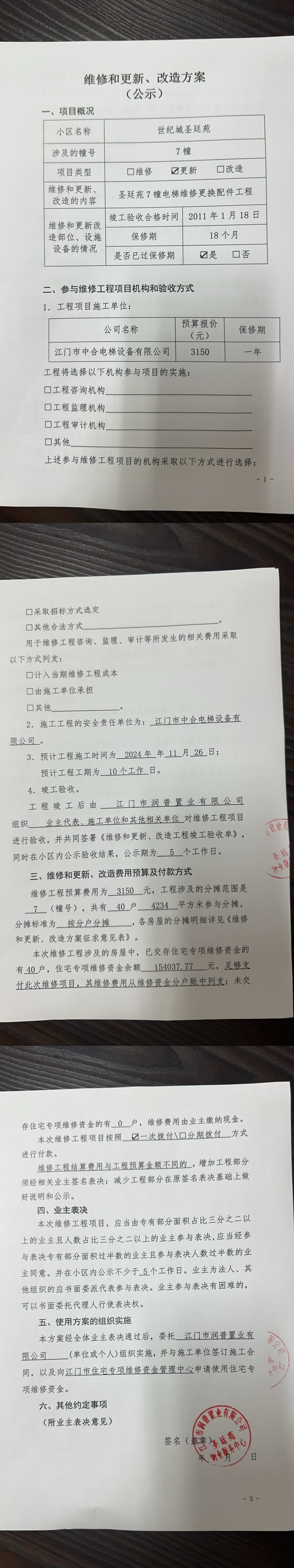 <td VALIGN="top" VALUES="" STYLE="border-width:0" BINDTYPE="0" ROWSPAN="19" COLSPAN="7" DATASOURCE="投票结果" ><font style="font-size:14pt;"><p style="white-space: normal; font-family: 宋体; line-height: 1.75em;">世纪城蓬江区圣廷苑7幢全体业主:</p><p style="white-space: normal; font-family: 宋体; line-height: 1.75em; text-indent: 2em;">本小区关于圣廷苑小区7幢电梯维修更换配件工程使用维修资金的投票的投票已表决结束,询异时间从2026年01月07日开始,投票询异公示期间,业主可通过微信查询自己的表决情况或可凭身份证件申请查询自己的表决情况;如公示的业主表决情况与查询的本人表决意见不一致的,可以以书面形式向投票组织机构申诉,投票组织机构予以纠正并重新公示表决结果。异议提出人对投票组织机构的处理仍有异议的,可以向街道办事处(镇人民政府)反映处理,涉及住宅专项维修资金的,可向属地住宅专项维修资金管理中心反映处理。</p><p style="white-space: normal;"><br/></p><p style="white-space: normal; font-family: 宋体; line-height: 1.75em;"><strong>附件:</strong></p><p style="white-space: normal; font-family: 宋体; line-height: 1.75em;"><strong>一、投票范围</strong></p><p style="white-space: normal; font-family: 宋体; line-height: 1.75em; text-indent: 2em;">世纪城蓬江区圣廷苑7幢</p><p style="white-space: normal; font-family: 宋体; line-height: 1.75em; text-indent: 2em;">总人数(专有部分人数之和):40</p><p style="white-space: normal; font-family: 宋体; line-height: 1.75em; text-indent: 2em;"><span style="font-family: 宋体, SimSun;"><span style="font-family: 宋体; text-indent: 32px;"><span style="font-family: 宋体; text-indent: 32px;">总户数:40</span></span></span></p><p style="white-space: normal; font-family: 宋体; line-height: 1.75em; text-indent: 2em;">建筑物总面积(专有部分面积之和):4234.00㎡</p><p style="white-space: normal; font-family: 宋体; line-height: 1.75em;"><strong>二、询异公示起止时间</strong></p><p dir="ltr" style="white-space: normal; font-family: 宋体; line-height: 1.75em; text-indent: 2em;"><span style="text-indent: 36px;">2026年01月07日至2026年01月14日</span></p><p style="white-space: normal; font-family: 宋体; line-height: 1.75em;"><strong>三、投票详细描述</strong></p><p style="white-space: normal; font-family: 宋体; line-height: 1.75em; text-indent: 2em;"><p style="font-family: "Helvetica Neue", Helvetica, Arial, sans-serif; font-size: 14px; text-wrap-mode: wrap; background-color: rgb(255, 255, 255);">一、圣廷苑7幢电梯五方通话和线路老化不能正常通话,由于现场线路老化布线困难,建议更换无线数字对讲装置。</p><p style="font-family: "Helvetica Neue", Helvetica, Arial, sans-serif; font-size: 14px; text-wrap-mode: wrap; background-color: rgb(255, 255, 255);">二、圣廷苑7幢电梯轿门是旧式触板保护装置,经常出现夹人现象,为确保电梯安全使用,建议更换光幕式保护装置。</p><p style="font-family: "Helvetica Neue", Helvetica, Arial, sans-serif; font-size: 14px; text-wrap-mode: wrap; background-color: rgb(255, 255, 255);">现对圣廷苑7幢进行更换配件工程,工程预算金额为3150元,项目最终费用以施工合同签订金额为准。因已过保修期,维修费用由相关业主按分户分摊,每户78.75元,详见公示</p><p style="font-family: "Helvetica Neue", Helvetica, Arial, sans-serif; font-size: 14px; text-wrap-mode: wrap; background-color: rgb(255, 255, 255);">附件。如业主手机不能正常通过微信投票,请联系物业公司进行线下纸质投票,物业电话:0750-3688100。</p><p><br/></p></p><p style="white-space: normal; font-family: 宋体; line-height: 1.75em;"><strong>四、计票规则</strong></p><p style="white-space: normal; font-family: 宋体; line-height: 1.75em; text-indent: 2em;">表决事项:使用建筑物及其附属设施的维修资金<br /><p style='text-align: left; font-family: 宋体; font-size: 16px; line-height: 1.75em; text-indent: 2em;'>计票规则:弃权票不并入其它项 未表决票不并入其它项</p></p><p style="white-space: normal; font-family: 宋体; line-height: 1.75em;"><strong>五、通过规则</strong></p><p style="white-space: normal; font-family: 宋体; line-height: 1.75em;"><strong><strong style="white-space: normal;"><span style="font-family: 宋体, SimSun;"> 根据《中华人民共和国民法典》第二百七十八条规定:业主共同决定事项,应当由专有部分面积占比三分之二以上的业主且人数占比三分之二以上的业主参与表决。</span></strong></strong></p><p style="white-space: normal; font-family: 宋体; line-height: 1.75em; text-indent: 2em;">表决事项:使用建筑物及其附属设施的维修资金<br /><p style='text-align: left; font-family: 宋体; font-size: 16px; line-height: 1.75em; text-indent: 2em;'>通过规则:双2/3以上参与表决,参与表决双过半同意</p></p><p style="white-space: normal; font-family: 宋体; line-height: 1.75em;"><strong>六、投票结果</strong></p><p style="white-space: normal; font-family: 宋体; line-height: 1.75em; text-indent: 2em;"><div id='resultTable'><table style='table-layout: fixed; font-size:12px; margin-top:10px' width='100%' border='0' cellspacing='0' cellpadding='0'><tr><td height='28' colspan='10' align='center' style='border: 1px solid #666'><strong style='font-size: 14px;'> 使用建筑物及其附属设施的维修资金</strong></td> </tr><tr id='trfirst'><td height='28' colspan='4' style='border-left: 1px solid #666; border-bottom: 1px solid #666'><strong> 申报单位:</strong> 江门市润普置业有限公司</td><td colspan='3' style='border-left: 1px solid #666; border-bottom: 1px solid #666'><strong> 联系方式:</strong> (0750) 3871336 3829717 </td><td colspan='3' style='border-left: 1px solid #666; bord