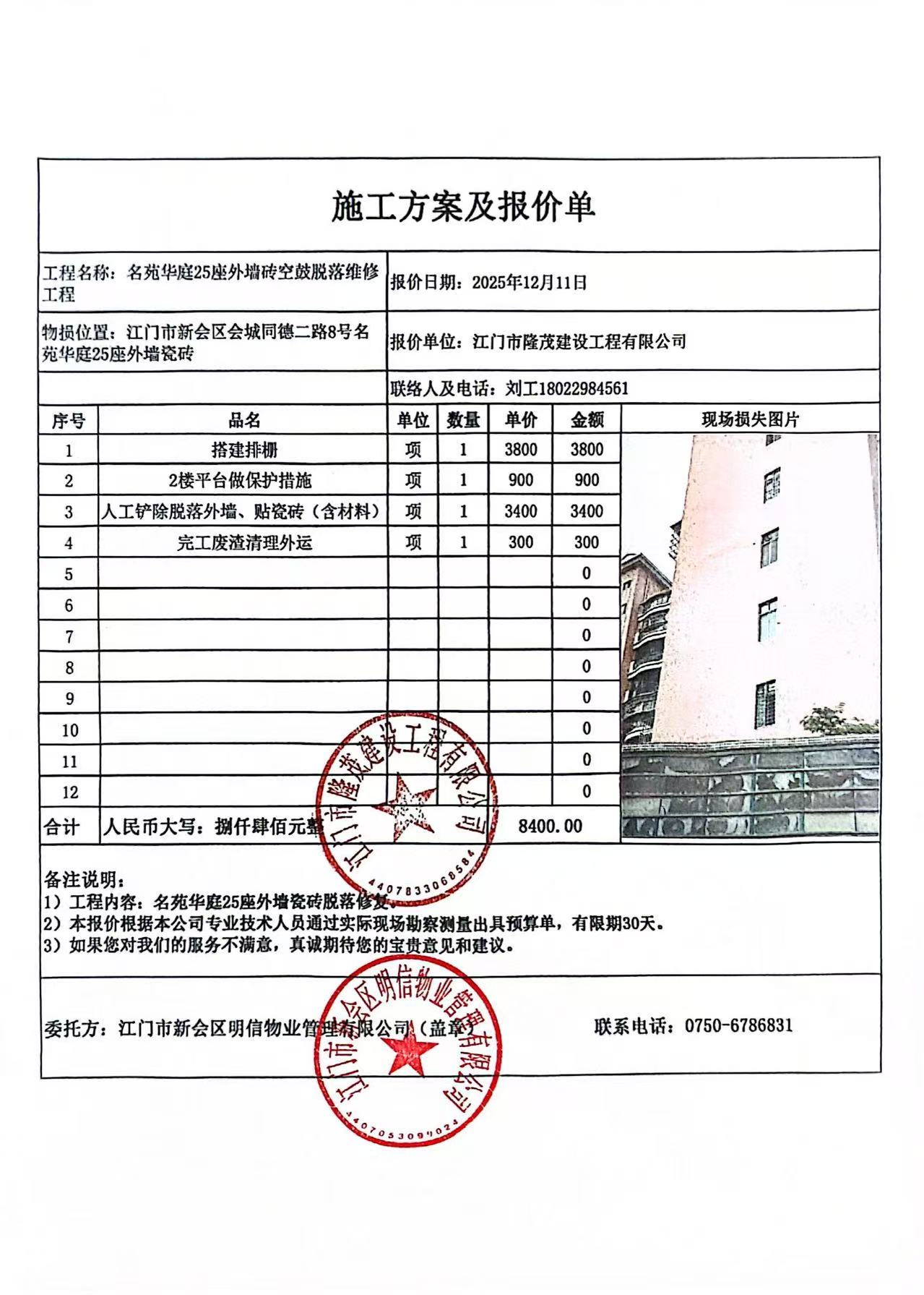 <td VALIGN="top" VALUES="" STYLE="border-width:0" BINDTYPE="0" ROWSPAN="17" COLSPAN="7" DATASOURCE="投票结果" ><font style=" font-family:方正小标宋简体;font-size:14pt;"><p style="line-height: 1.75em;"><span style="font-family: 宋体, SimSun;">各位尊敬的业主:</span><br/></p><p style="text-indent: 2em; line-height: 1.75em;"><span style="font-family: 宋体, SimSun;">根据法律法规的规定,本小区业主利用“江门市物业事项表决管理系统”已对本小区公共事务决策事项(<span style="font-family: 宋体; text-indent: 32px;">名苑华庭25座外墙砖空鼓脱落维修工程使用维修资金的投票</span>)进行了表决,在经过7日的询异公示期后,未收到业主有效的异议。现将投票结果公告,并就产生的法律效力说明如下:</span></p><p style="line-height: 1.75em; text-indent: 0em;"><strong style="text-indent: 2em;"><span style="font-family: 宋体, SimSun;">一、投票范围</span></strong></p><p style="text-indent: 2em; line-height: 1.75em;"><span style="font-family: 宋体, SimSun;">名苑华庭名苑华庭25座</span></p><p style="text-indent: 2em; line-height: 1.75em;"><span style="font-family: 宋体, SimSun;">总人数(专有部分人数之和):40</span></p><p style="text-indent: 2em; line-height: 1.75em;"><span style="font-family: 宋体, SimSun;"><span style="font-family: 宋体, SimSun; text-indent: 32px;"><span style="font-family: 宋体; text-indent: 32px;"><span style="font-family: 宋体; text-indent: 32px;">总户数:40</span></span></span></span></p><p style="text-indent: 2em; line-height: 1.75em;"><span style="font-family: 宋体, SimSun;">建筑物总面积(专有部分面积之和):5844.78㎡</span></p><p style="line-height: 1.75em;"><strong><span style="font-family: 宋体, SimSun;">二、投票结果公告时间</span></strong></p><p style="text-indent: 2em; line-height: 1.75em;"><span style="font-family: 宋体, SimSun;"><span style="font-family: 宋体, SimSun; text-indent: 32px;">从2026年01月16日开始</span></span></p><p style="line-height: 1.75em;"><strong><span style="font-family: 宋体, SimSun;">三、计票规则</span></strong></p><p style="text-indent: 2em; line-height: 1.75em;"><span style="font-family: 宋体, SimSun;">表决事项:使用建筑物及其附属设施的维修资金<br /><p style='font-family: 宋体, SimSun;line-height: 1.75em; text-indent: 2em;'>计票规则:弃权票不并入其它项&nbsp;&nbsp;&nbsp;&nbsp;未表决票不并入其它项</p></span></p><p style="line-height: 1.75em;"><strong><span style="font-family: 宋体, SimSun;">四、通过规则</span></strong></p><p style="line-height: 1.75em;"><strong><span style="font-family: 宋体, SimSun;">&nbsp; 根据《中华人民共和国民法典》第二百七十八条规定:业主共同决定事项,应当由专有部分面积占比三分之二以上的业主且人数占比三分之二以上的业主参与表决。</span></strong></p><p style="text-indent: 2em; line-height: 1.75em;"><span style="font-family: 宋体, SimSun;"><span style="font-family: 宋体, SimSun; text-indent: 32px;">表决事项:使用建筑物及其附属设施的维修资金<br /><p style='font-family: 宋体, SimSun;line-height: 1.75em; text-indent: 2em;'>通过规则:双2/3以上参与表决,参与表决双过半同意</p></span></span></p><p style="line-height: 1.75em;"><strong><span style="font-family: 宋体, SimSun;">五、投票结果</span></strong></p><p style="line-height: 1.75em; text-indent: 2em;"><span style="font-family: 宋体, SimSun; text-indent: 2em;"><div id='resultTable'><table style='table-layout: fixed; font-size:12px; margin-top:10px' width='100%' border='0' cellspacing='0' cellpadding='0'><tr><td height='28' colspan='10' align='center' style='border: 1px solid #666'><strong style='font-size: 14px;'> 使用建筑物及其附属设施的维修资金</strong></td> </tr><tr id='trfirst'><td height='28' colspan='4' style='border-left: 1px solid #666; border-bottom: 1px solid #666'><strong>&nbsp;申报单位:</strong> 江门市新会区明信物业管理有限公司</td><td colspan='3' style='border-left: 1px solid #666; border-bottom: 1px solid #666'><strong>&nbsp;联系方式:</strong> </td><td colspan='3' style='border-left: 1px solid #666; border-bottom: 1px solid #666; border-right: 1px solid #666'><strong>&nbsp;申报日期:</strong> 2025年12月16日 </td></tr><tr> <td height='28' colspan='5' style='border-left: 1px solid #666; border-bottom: 1px solid #666'><strong>&nbsp;列支总人数(专有部分人数之和):</strong>40人 </td><td colspan='5' style='border-left: 1px solid #666; border-bottom: 1px solid #666; border-right: 1px solid #666'><strong>&nbsp;列支建筑物总面积(专有部分面积之和):</strong>5844.78㎡ </td> </tr><tr><td height='28' colspan='10' bgcolor='#F3F3F3' style='border-left: 1px solid #666;border-bottom: 1px solid #666;border-right: 1px solid #666'><strong>&nbsp;参与表决人数及面积统计</strong></td></tr><tr><td height='28' colspan='5' style='border-left: 1px solid #666; border-bottom: 1px solid #666'><strong>&nbsp;参与表决人数:</strong>29人</td><td colspan='5' style='border-left: 1px solid #666; border-bottom: 1px solid #666; border-right: 1px solid #666'><strong>&nbsp;参与表决人数占总人数比例:</strong>72.50%</td></tr><tr><td height='28' colspan='5' style='border-left: 1px solid #666; border-bottom: 1px solid #666'><strong>&nbsp;参与表决面积:</strong>4307.90㎡</td><td colspan='5' style='border-left: 1px solid #666; border-bottom: 1px solid #666; border-right: 1px solid #666'><strong>&nbsp;参与表决面积占总面积比例:</strong>73.71%</td></tr><tr><td height='28' colspan='10' bgcolor='#F3F3F3' style='border-left: 1px solid #666; border-bottom: 1px solid #666;border-right: 1px solid #666'> <strong>&nbsp;参与表决同意人数及面积统计</strong></td> </tr><tr><td height='28' colspan='5' style='border-left: 1px solid #666; border-bot