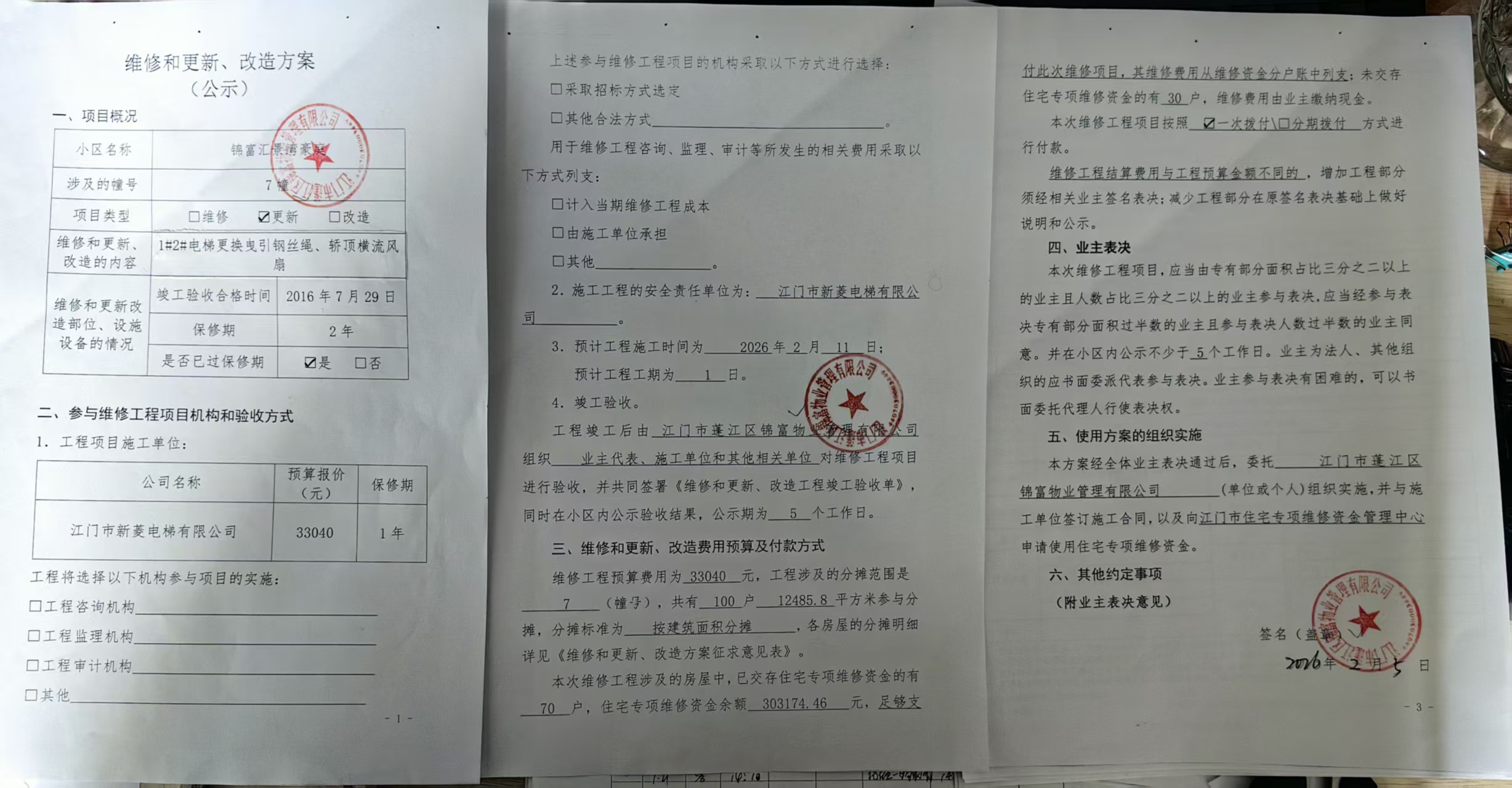 <td VALIGN="top" VALUES="" STYLE="border-width:0" BINDTYPE="0" ROWSPAN="19" COLSPAN="7" DATASOURCE="投票结果" ><font style="font-size:14pt;"><p style="white-space: normal; font-family: 宋体; line-height: 1.75em;">江门市蓬江区锦富汇景湾豪庭蓬江区棠下镇锦富汇景湾豪庭7幢全体业主:</p><p style="white-space: normal; font-family: 宋体; line-height: 1.75em; text-indent: 2em;">本小区关于锦富汇景湾豪庭7幢1#2#电梯更曳引速钢丝绳、轿顶横流风扇工程使用维修资金的投票的投票已表决结束,询异时间从2026年03月24日开始,投票询异公示期间,业主可通过微信查询自己的表决情况或可凭身份证件申请查询自己的表决情况;如公示的业主表决情况与查询的本人表决意见不一致的,可以以书面形式向投票组织机构申诉,投票组织机构予以纠正并重新公示表决结果。异议提出人对投票组织机构的处理仍有异议的,可以向街道办事处(镇人民政府)反映处理,涉及住宅专项维修资金的,可向属地住宅专项维修资金管理中心反映处理。</p><p style="white-space: normal;"><br/></p><p style="white-space: normal; font-family: 宋体; line-height: 1.75em;"><strong>附件:</strong></p><p style="white-space: normal; font-family: 宋体; line-height: 1.75em;"><strong>一、投票范围</strong></p><p style="white-space: normal; font-family: 宋体; line-height: 1.75em; text-indent: 2em;">江门市蓬江区锦富汇景湾豪庭蓬江区棠下镇锦富汇景湾豪庭7幢</p><p style="white-space: normal; font-family: 宋体; line-height: 1.75em; text-indent: 2em;">总人数(专有部分人数之和):92</p><p style="white-space: normal; font-family: 宋体; line-height: 1.75em; text-indent: 2em;"><span style="font-family: 宋体, SimSun;"><span style="font-family: 宋体; text-indent: 32px;"><span style="font-family: 宋体; text-indent: 32px;">总户数:100</span></span></span></p><p style="white-space: normal; font-family: 宋体; line-height: 1.75em; text-indent: 2em;">建筑物总面积(专有部分面积之和):12485.80㎡</p><p style="white-space: normal; font-family: 宋体; line-height: 1.75em;"><strong>二、询异公示起止时间</strong></p><p dir="ltr" style="white-space: normal; font-family: 宋体; line-height: 1.75em; text-indent: 2em;"><span style="text-indent: 36px;">2026年03月24日至2026年03月31日</span></p><p style="white-space: normal; font-family: 宋体; line-height: 1.75em;"><strong>三、投票详细描述</strong></p><p style="white-space: normal; font-family: 宋体; line-height: 1.75em; text-indent: 2em;"><p>小区7幢的电梯日常维保期间,维保发现1#2#电梯曳引钢丝绳出现油泥老化现象,轿顶横流风扇老化,需要维修方能正常运行使用。</p><p> 现对7幢1#2#电梯进行维修,工程维修预算金额为33040元,项目最终费用以施工合同签订金额为准。因已过保修期,维修费用由相关业主按建筑面积分摊,每平方约2.65元,详见公示附件。如业主手机不能正常通过微信投票,请联系物业公司进行线下纸质投票,物业电话:0750-3598316 管理员:15088116809。</p><p><br style="text-wrap-mode: wrap; font-family: "Helvetica Neue", Helvetica, Arial, sans-serif; font-size: 14px; background-color: rgb(255, 255, 255);"/></p><p><br/></p></p><p style="white-space: normal; font-family: 宋体; line-height: 1.75em;"><strong>四、计票规则</strong></p><p style="white-space: normal; font-family: 宋体; line-height: 1.75em; text-indent: 2em;">表决事项:使用建筑物及其附属设施的维修资金<br /><p style='text-align: left; font-family: 宋体; font-size: 16px; line-height: 1.75em; text-indent: 2em;'>计票规则:弃权票不并入其它项 未表决票不并入其它项</p></p><p style="white-space: normal; font-family: 宋体; line-height: 1.75em;"><strong>五、通过规则</strong></p><p style="white-space: normal; font-family: 宋体; line-height: 1.75em;"><strong><strong style="white-space: normal;"><span style="font-family: 宋体, SimSun;"> 根据《中华人民共和国民法典》第二百七十八条规定:业主共同决定事项,应当由专有部分面积占比三分之二以上的业主且人数占比三分之二以上的业主参与表决。</span></strong></strong></p><p style="white-space: normal; font-family: 宋体; line-height: 1.75em; text-indent: 2em;">表决事项:使用建筑物及其附属设施的维修资金<br /><p style='text-align: left; font-family: 宋体; font-size: 16px; line-height: 1.75em; text-indent: 2em;'>通过规则:双2/3以上参与表决,参与表决双过半同意</p></p><p style="white-space: normal; font-family: 宋体; line-height: 1.75em;"><strong>六、投票结果</strong></p><p style="white-space: normal; font-family: 宋体; line-height: 1.75em; text-indent: 2em;"><div id='resultTable'><table style='table-layout: fixed; font-size:12px; margin-top:10px' width='100%' border='0' cellspacing='0' cellpadding='0'><tr><td height='28' colspan='10' align='center' style='border: 1px solid #666'><strong style='font-size: 14px;'> 使用建筑物及其附属设施的维修资金</strong></td> </tr><tr id='trfirst'><td height='28' colspan='4' style='border-left: 1px solid #666; border-bottom: 1px solid #666'><strong> 申报单位:</strong> 江门市蓬江区锦富物业管理有限公司</td><td colspan='3' style='border-left: 1px solid #666; border-bottom: 1px solid #666'><strong> 联系方式:</strong> 3598316 </td><td colspan='3' style='border-left: 1px solid #666; border-bottom: 1px solid #666; border-right: 1px solid #666'><strong> 申报日期:</strong> 2026年2月5日 </td></tr><tr> <td height='28' colspan='5' style='border-left: 1px solid #666; border-bottom: 1px solid #666'><strong> 总人数(专有部分人数之和):</strong>92人 </td><td colspan='5' style='border-left: 1px solid #666; border-bottom: 1px solid #666; border-right: 1px solid #666'><strong> 