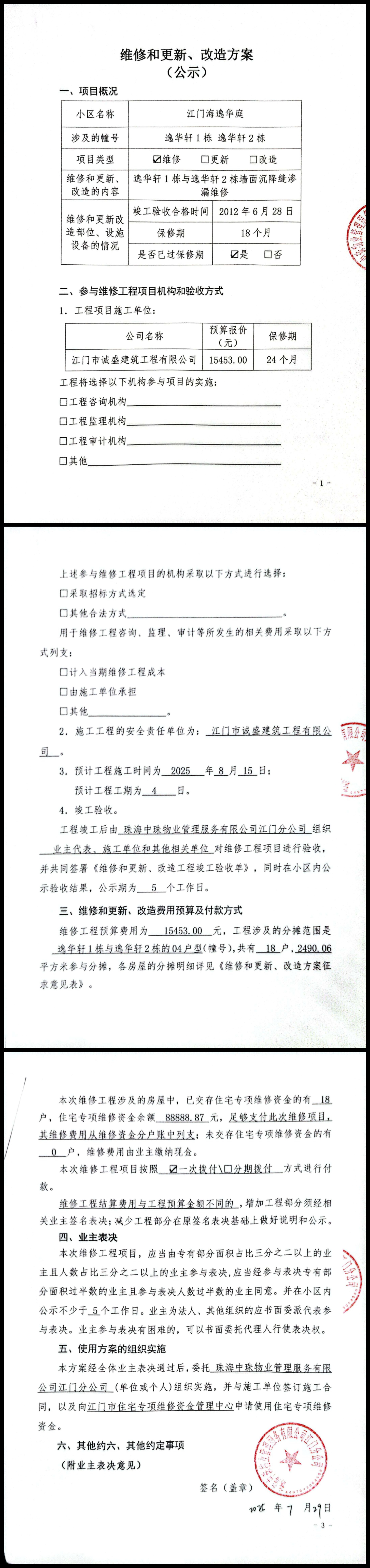 <td VALIGN="top" VALUES="" STYLE="border-width:0" BINDTYPE="0" ROWSPAN="17" COLSPAN="7" DATASOURCE="投票结果" ><font style=" font-family:方正小标宋简体;font-size:14pt;"><p style="line-height: 1.75em;"><span style="font-family: 宋体, SimSun;">各位尊敬的业主:</span><br/></p><p style="text-indent: 2em; line-height: 1.75em;"><span style="font-family: 宋体, SimSun;">根据法律法规的规定,本小区业主利用“江门市物业事项表决管理系统”已对本小区公共事务决策事项(<span style="font-family: 宋体; text-indent: 32px;">海逸华庭逸华轩1栋与逸华轩2栋墙面沉降缝渗漏维修使用维修资金的投票</span>)进行了表决,在经过7日的询异公示期后,未收到业主有效的异议。现将投票结果公告,并就产生的法律效力说明如下:</span></p><p style="line-height: 1.75em; text-indent: 0em;"><strong style="text-indent: 2em;"><span style="font-family: 宋体, SimSun;">一、投票范围</span></strong></p><p style="text-indent: 2em; line-height: 1.75em;"><span style="font-family: 宋体, SimSun;">海逸华庭江海区海逸华庭逸华轩1幢、江海区海逸华庭逸华轩2幢</span></p><p style="text-indent: 2em; line-height: 1.75em;"><span style="font-family: 宋体, SimSun;">总人数(专有部分人数之和):18</span></p><p style="text-indent: 2em; line-height: 1.75em;"><span style="font-family: 宋体, SimSun;"><span style="font-family: 宋体, SimSun; text-indent: 32px;"><span style="font-family: 宋体; text-indent: 32px;"><span style="font-family: 宋体; text-indent: 32px;">总户数:18</span></span></span></span></p><p style="text-indent: 2em; line-height: 1.75em;"><span style="font-family: 宋体, SimSun;">建筑物总面积(专有部分面积之和):2490.06㎡</span></p><p style="line-height: 1.75em;"><strong><span style="font-family: 宋体, SimSun;">二、投票结果公告时间</span></strong></p><p style="text-indent: 2em; line-height: 1.75em;"><span style="font-family: 宋体, SimSun;"><span style="font-family: 宋体, SimSun; text-indent: 32px;">从2025年10月31日开始</span></span></p><p style="line-height: 1.75em;"><strong><span style="font-family: 宋体, SimSun;">三、计票规则</span></strong></p><p style="text-indent: 2em; line-height: 1.75em;"><span style="font-family: 宋体, SimSun;">表决事项:使用建筑物及其附属设施的维修资金<br /><p style='font-family: 宋体, SimSun;line-height: 1.75em; text-indent: 2em;'>计票规则:弃权票不并入其它项&nbsp;&nbsp;&nbsp;&nbsp;未表决票不并入其它项</p></span></p><p style="line-height: 1.75em;"><strong><span style="font-family: 宋体, SimSun;">四、通过规则</span></strong></p><p style="line-height: 1.75em;"><strong><span style="font-family: 宋体, SimSun;">&nbsp; 根据《中华人民共和国民法典》第二百七十八条规定:业主共同决定事项,应当由专有部分面积占比三分之二以上的业主且人数占比三分之二以上的业主参与表决。</span></strong></p><p style="text-indent: 2em; line-height: 1.75em;"><span style="font-family: 宋体, SimSun;"><span style="font-family: 宋体, SimSun; text-indent: 32px;">表决事项:使用建筑物及其附属设施的维修资金<br /><p style='font-family: 宋体, SimSun;line-height: 1.75em; text-indent: 2em;'>通过规则:双2/3以上参与表决,参与表决双过半同意</p></span></span></p><p style="line-height: 1.75em;"><strong><span style="font-family: 宋体, SimSun;">五、投票结果</span></strong></p><p style="line-height: 1.75em; text-indent: 2em;"><span style="font-family: 宋体, SimSun; text-indent: 2em;"><div id='resultTable'><table style='table-layout: fixed; font-size:12px; margin-top:10px' width='100%' border='0' cellspacing='0' cellpadding='0'><tr><td height='28' colspan='10' align='center' style='border: 1px solid #666'><strong style='font-size: 14px;'> 使用建筑物及其附属设施的维修资金</strong></td> </tr><tr id='trfirst'><td height='28' colspan='4' style='border-left: 1px solid #666; border-bottom: 1px solid #666'><strong>&nbsp;申报单位:</strong> 珠海中珠物业管理服务有限公司江门分公司</td><td colspan='3' style='border-left: 1px solid #666; border-bottom: 1px solid #666'><strong>&nbsp;联系方式:</strong> 3181899 </td><td colspan='3' style='border-left: 1px solid #666; border-bottom: 1px solid #666; border-right: 1px solid #666'><strong>&nbsp;申报日期:</strong> 2025年8月4日 </td></tr><tr> <td height='28' colspan='5' style='border-left: 1px solid #666; border-bottom: 1px solid #666'><strong>&nbsp;列支总人数(专有部分人数之和):</strong>18人 </td><td colspan='5' style='border-left: 1px solid #666; border-bottom: 1px solid #666; border-right: 1px solid #666'><strong>&nbsp;列支建筑物总面积(专有部分面积之和):</strong>2490.06㎡ </td> </tr><tr><td height='28' colspan='10' bgcolor='#F3F3F3' style='border-left: 1px solid #666;border-bottom: 1px solid #666;border-right: 1px solid #666'><strong>&nbsp;参与表决人数及面积统计</strong></td></tr><tr><td height='28' colspan='5' style='border-left: 1px solid #666; border-bottom: 1px solid #666'><strong>&nbsp;参与表决人数:</strong>13人</td><td colspan='5' style='border-left: 1px solid #666; border-bottom: 1px solid #666; border-right: 1px solid #666'><strong>&nbsp;参与表决人数占总人数比例:</strong>72.22%</td></tr><tr><td height='28' colspan='5' style='border-left: 1px solid #666; border-bottom: 1px solid #666'><strong>&nbsp;参与表决面积:</strong>1842.47㎡</td><td colspan='5' style='border-left: 1px solid #666; border-bottom: 1px solid #666; border-right: 1px solid #666'><strong>&nbsp;参与表决面积占总面积比例:</strong>73.99%</td></tr><tr><td height='28' colspan='10' bgcolor='#F3F3F3' style='border-left: 1px solid #666; border-bottom: 1px solid #666;border-right: 1px solid #666'> <strong>&nbsp;参与表决同意人数及面积统计</strong></