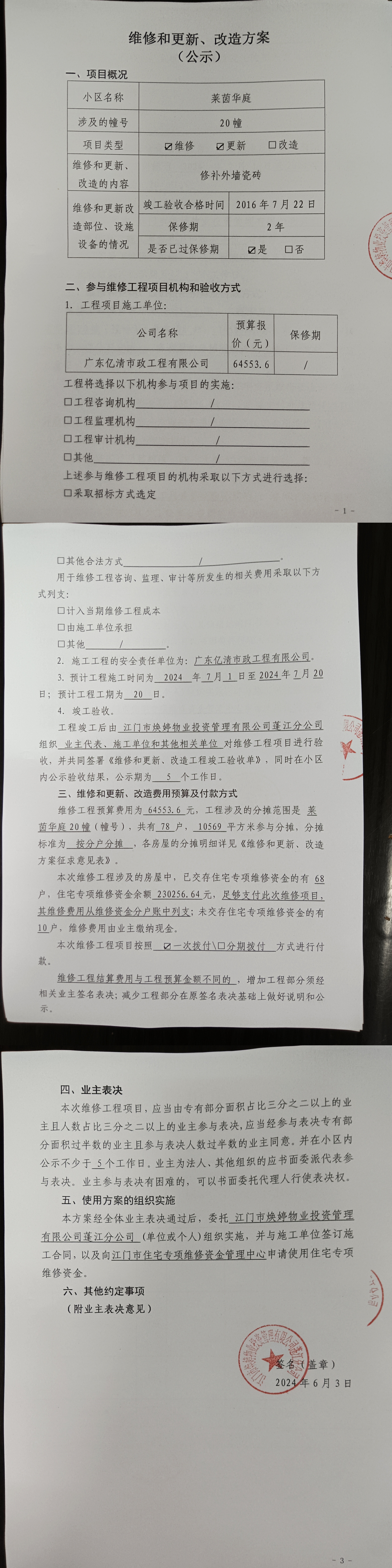 <td VALIGN="top" VALUES="" STYLE="border-width:0" BINDTYPE="0" ROWSPAN="17" COLSPAN="7" DATASOURCE="投票结果" ><font style=" font-family:方正小标宋简体;font-size:14pt;"><p style="line-height: 1.75em;"><span style="font-family: 宋体, SimSun;">各位尊敬的业主:</span><br/></p><p style="text-indent: 2em; line-height: 1.75em;"><span style="font-family: 宋体, SimSun;">根据法律法规的规定,本小区业主利用“江门市物业事项表决管理系统”已对本小区公共事务决策事项进行了表决,在经过7日的询异公示期后,未收到业主有效的异议。现将投票结果公告,并就产生的法律效力说明如下:</span></p><p style="line-height: 1.75em; text-indent: 0em;"><strong style="text-indent: 2em;"><span style="font-family: 宋体, SimSun;">一、投票范围</span></strong></p><p style="text-indent: 2em; line-height: 1.75em;"><span style="font-family: 宋体, SimSun;">莱茵华庭蓬江区莱茵华庭20幢</span></p><p style="text-indent: 2em; line-height: 1.75em;"><span style="font-family: 宋体, SimSun;">总人数(专有部分人数之和):78</span></p><p style="text-indent: 2em; line-height: 1.75em;"><span style="font-family: 宋体, SimSun;"><span style="font-family: 宋体, SimSun; text-indent: 32px;"><span style="font-family: 宋体; text-indent: 32px;"><span style="font-family: 宋体; text-indent: 32px;">总户数:78</span></span></span></span></p><p style="text-indent: 2em; line-height: 1.75em;"><span style="font-family: 宋体, SimSun;">建筑物总面积(专有部分面积之和):10569.00㎡</span></p><p style="line-height: 1.75em;"><strong><span style="font-family: 宋体, SimSun;">二、投票结果公告时间</span></strong></p><p style="text-indent: 2em; line-height: 1.75em;"><span style="font-family: 宋体, SimSun;">从2024年07月08日开始</span></p><p style="line-height: 1.75em;"><strong><span style="font-family: 宋体, SimSun;">三、计票规则</span></strong></p><p style="text-indent: 2em; line-height: 1.75em;"><span style="font-family: 宋体, SimSun;">表决事项:使用建筑物及其附属设施的维修资金<br /><p style='font-family: 宋体, SimSun;line-height: 1.75em; text-indent: 2em;'>计票规则:弃权票不并入其它项&nbsp;&nbsp;&nbsp;&nbsp;未表决票不并入其它项</p></span></p><p style="line-height: 1.75em;"><strong><span style="font-family: 宋体, SimSun;">四、通过规则</span></strong></p><p style="line-height: 1.75em;"><strong><span style="font-family: 宋体, SimSun;">&nbsp; 根据《中华人民共和国民法典》第二百七十八条规定:业主共同决定事项,应当由专有部分面积占比三分之二以上的业主且人数占比三分之二以上的业主参与表决。</span></strong></p><p style="text-indent: 2em; line-height: 1.75em;"><span style="font-family: 宋体, SimSun;"><span style="font-family: 宋体, SimSun; text-indent: 32px;">表决事项:使用建筑物及其附属设施的维修资金<br /><p style='font-family: 宋体, SimSun;line-height: 1.75em; text-indent: 2em;'>通过规则:双2/3以上参与表决,参与表决双过半同意</p></span></span></p><p style="line-height: 1.75em;"><strong><span style="font-family: 宋体, SimSun;">五、投票结果</span></strong></p><p style="line-height: 1.75em; text-indent: 2em;"><span style="font-family: 宋体, SimSun; text-indent: 2em;"><div id='resultTable'><table style='table-layout: fixed; font-size:12px; margin-top:10px' width='100%' border='0' cellspacing='0' cellpadding='0'><tr><td height='28' colspan='10' align='center' style='border: 1px solid #666'><strong style='font-size: 14px;'> 使用建筑物及其附属设施的维修资金</strong></td> </tr><tr id='trfirst'><td height='28' colspan='4' style='border-left: 1px solid #666; border-bottom: 1px solid #666'><strong>&nbsp;申报单位:</strong> 江门市焕婷物业投资管理有限公司蓬江分公司</td><td colspan='3' style='border-left: 1px solid #666; border-bottom: 1px solid #666'><strong>&nbsp;联系方式:</strong> 3211392 </td><td colspan='3' style='border-left: 1px solid #666; border-bottom: 1px solid #666; border-right: 1px solid #666'><strong>&nbsp;申报日期:</strong> 2024年6月2日 </td></tr><tr> <td height='28' colspan='5' style='border-left: 1px solid #666; border-bottom: 1px solid #666'><strong>&nbsp;列支总人数(专有部分人数之和):</strong>78人 </td><td colspan='5' style='border-left: 1px solid #666; border-bottom: 1px solid #666; border-right: 1px solid #666'><strong>&nbsp;列支建筑物总面积(专有部分面积之和):</strong>10569.00㎡ </td> </tr><tr><td height='28' colspan='10' bgcolor='#F3F3F3' style='border-left: 1px solid #666;border-bottom: 1px solid #666;border-right: 1px solid #666'><strong>&nbsp;参与表决人数及面积统计</strong></td></tr><tr><td height='28' colspan='5' style='border-left: 1px solid #666; border-bottom: 1px solid #666'><strong>&nbsp;参与表决人数:</strong>60人</td><td colspan='5' style='border-left: 1px solid #666; border-bottom: 1px solid #666; border-right: 1px solid #666'><strong>&nbsp;参与表决人数占总人数比例:</strong>76.92%</td></tr><tr><td height='28' colspan='5' style='border-left: 1px solid #666; border-bottom: 1px solid #666'><strong>&nbsp;参与表决面积:</strong>8130.00㎡</td><td colspan='5' style='border-left: 1px solid #666; border-bottom: 1px solid #666; border-right: 1px solid #666'><strong>&nbsp;参与表决面积占总面积比例:</strong>76.92%</td></tr><tr><td height='28' colspan='10' bgcolor='#F3F3F3' style='border-left: 1px solid #666; border-bottom: 1px solid #666;border-right: 1px solid #666'> <strong>&nbsp;参与表决同意人数及面积统计</strong></td> </tr><tr><td height='28' colspan='5' style='border-left: 1px solid #666; border-bottom: 1px solid #666'><strong>&nbsp;参与表决同意人数:</strong>56人 </td><td colspan='5' style='border-left: 1px solid #666; border-bottom: 1px solid #666; border-right: 1px