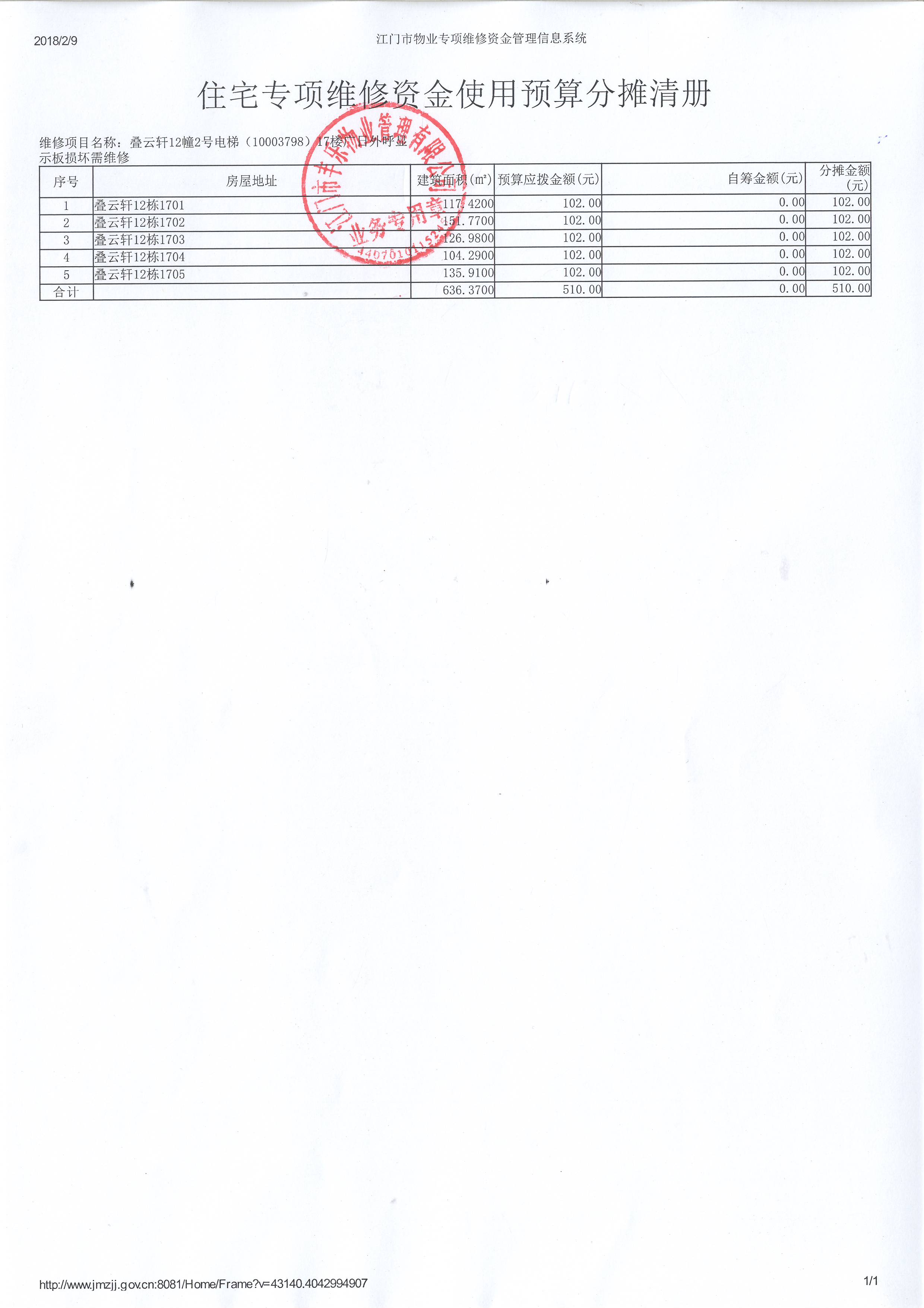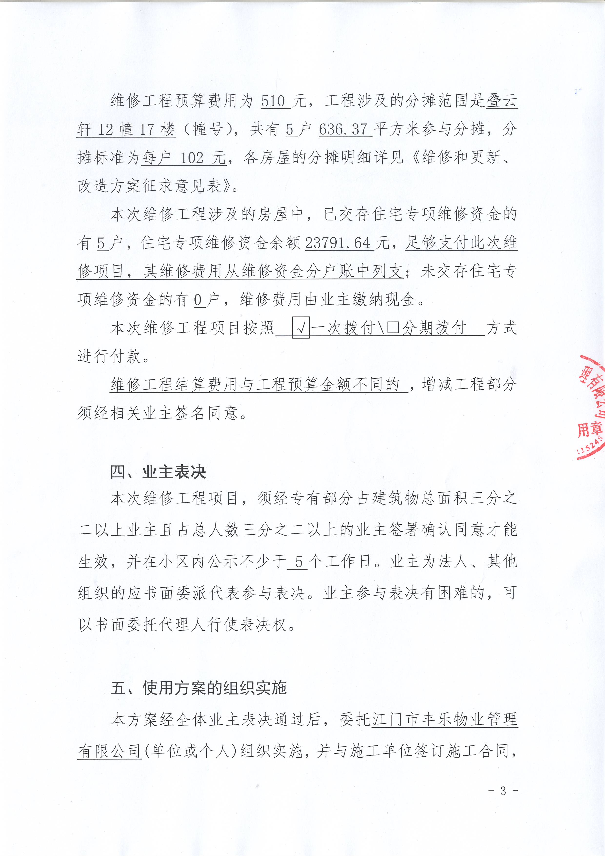 投票结果通知公告时间:从2018年04月18日开始<br/></p><p style="text-align: left; line-height: 1.75em; font-family: 宋体; font-size: 16px;"><strong>三、投票详细描述</strong> </p><p style="text-align: left; line-height: 1.75em; font-family: 宋体; font-size: 16px;"><span style="line-height: 28px; font-family: 宋体;"> </span><p><span style="font-family: "Helvetica Neue", Helvetica, Arial, sans-serif; font-size: 14px; background-color: rgb(255, 255, 255);">本小区叠云轩12幢2号电梯(10003798)17楼广日外呼显示板失灵,经检查,是由于该外呼显示板损坏,已过保修期。</span><br style="font-family: "Helvetica Neue", Helvetica, Arial, sans-serif; font-size: 14px; white-space: normal; background-color: rgb(255, 255, 255);"/><span style="font-family: "Helvetica Neue", Helvetica, Arial, sans-serif; font-size: 14px; background-color: rgb(255, 255, 255);">现需申请使用维修资金对叠云轩12幢2号电梯(10003798)17楼损坏的广日外呼显示板进行维修,工程维修预算金额为510元,项目最终费用以施工合同签订金额为准。维修费用的分摊标准为每户102元,详见附件。</span></p></p><p style="text-align: left; line-height: 1.75em; font-family: 宋体; font-size: 16px;"><strong>四、投票结果</strong> </p><p style="text-align: left; line-height: 1.75em; font-family: 宋体; font-size: 16px;"><table style='table-layout: fixed; font-size:12px; margin-top:10px' width='100%' border='0' cellspacing='0' cellpadding='0'><tr><td height='28' colspan='10' align='center' style='border: 1px solid #666'><strong style='font-size: 14px;'> 叠云轩12幢2号电梯17楼广日外呼显示板损坏需维修</strong></td> </tr><tr><td height='28' colspan='4' style='border-left: 1px solid #666; border-bottom: 1px solid #666'><strong> 申报单位:</strong> 江门市丰乐物业管理有限公司</td><td colspan='3' style='border-left: 1px solid #666; border-bottom: 1px solid #666'><strong> 联系方式:</strong> (0750) 3871336 3829717 </td><td colspan='3' style='border-left: 1px solid #666; border-bottom: 1px solid #666; border-right: 1px solid #666'><strong> 申报日期:</strong> 2018年2月9日 </td></tr><tr> <td height='28' colspan='5' style='border-left: 1px solid #666; border-bottom: 1px solid #666'><strong> 总人数(专有部分人数之和):</strong>5人 </td><td colspan='5' style='border-left: 1px solid #666; border-bottom: 1px solid #666; border-right: 1px solid #666'><strong> 建筑物总面积(专有部分面积之和):</strong>636.37㎡ </td> </tr><tr><td height='28' colspan='10' bgcolor='#F3F3F3' style='border-left: 1px solid #666;border-bottom: 1px solid #666;border-right: 1px solid #666'><strong> 参与人数及面积统计</strong></td></tr><tr><td height='28' colspan='5' style='border-left: 1px solid #666; border-bottom: 1px solid #666'><strong> 参与表决专有部分人数之和:</strong>3人</td><td colspan='5' style='border-left: 1px solid #666; border-bottom: 1px solid #666; border-right: 1px solid #666'><strong> 参与表决占有表决权总人数比例:</strong>60.00%</td></tr><tr><td height='28' colspan='5' style='border-left: 1px solid #666; border-bottom: 1px solid #666'><strong> 参与表决专有部分面积之和:</strong>348.69㎡</td><td colspan='5' style='border-left: 1px solid #666; border-bottom: 1px solid #666; border-right: 1px solid #666'><strong> 参与表决占有表决权总面积比例:</strong>54.79%</td></tr><tr><td height='28' colspan='10' bgcolor='#F3F3F3' style='border-left: 1px solid #666; border-bottom: 1px solid #666;border-right: 1px solid #666'> <strong> 未参与人数及面积统计</strong></td> </tr><tr><td height='28' colspan='5' style='border-left: 1px solid #666; border-bottom: 1px solid #666'><strong> 未参与表决专有部分人数之和:</strong>2人 </td><td colspan='5' style='border-left: 1px solid #666; border-bottom: 1px solid #666; border-right: 1px solid #666'><strong> 未参与表决占有表决权总人数比例:</strong>40.00%</td></tr><tr><td height='28' colspan='5' style='border-left: 1px solid #666; border-bottom: 1px solid #666'><strong> 未参与表决专有部分面积之和:</strong>287.68㎡</td><td colspan='5' style='border-left: 1px solid #666; border-bottom: 1px solid #666; border-right: 1px solid #666'><strong> 未参与表决占有表决权总面积比例:</strong>45.21% </td> </tr><tr><td width='6%' rowspan='2' align='center' bgcolor='#F3F3F3' style='border-left: 1px solid #666; border-bottom: 1px solid #666'><strong>序号</strong></td><td width='11%' rowspan='2' align='center' bgcolor='#F3F3F3' style='border-left: 1px solid #666; border-bottom: 1px solid #666'><strong>候选项</strong></td><td height='28' colspan='2' align='center' bgcolor='#F3F3F3' style='border-left: 1px solid #666; border-bottom: 1px solid #666'><strong>表决人数情况</strong> </td><td colspan='2' align='center' bgcolor='#F3F3F3' style='border-left: 1px solid #666; border-bottom: 1px solid #666'><strong>表决面积情况</strong></td><td colspan='4' align='center' bgcolor='#F3F3F3' style='border-left: 1px solid #666; border-bottom: 1px solid #666; border-right: 1px solid #666'><strong>表决方式</strong></td></tr><tr><td width='11%' height='28' align='center' bgcolor='#F3F3F3' style='border-left: 1px solid #666;border-bottom: 1px solid #666'><strong>参与表决<br />专有部分<br />人数之和</strong> </td><td width='11%' align='center' bgcolor='#F3F3F3' style='border-left: 1px solid #666; border-bottom: 1px solid #666'><strong>占有<br /> 表决权<br /> 总人数比例<br /> </strong></td><td width='11%' align='center' bgcolor='#F3F3F3' style='border-left: 1px solid #666; border-bottom: 1px solid #666'><strong>参与表决<br /> 专有部分<br /> 面积之和<br /> </strong></td><td width='13%' align='center' bgcolor='#F3F3F3' style='border-left: 1px solid #666; border-bottom: 1px solid #666'><strong>占有<br />表决权<br />总面积比例</s
