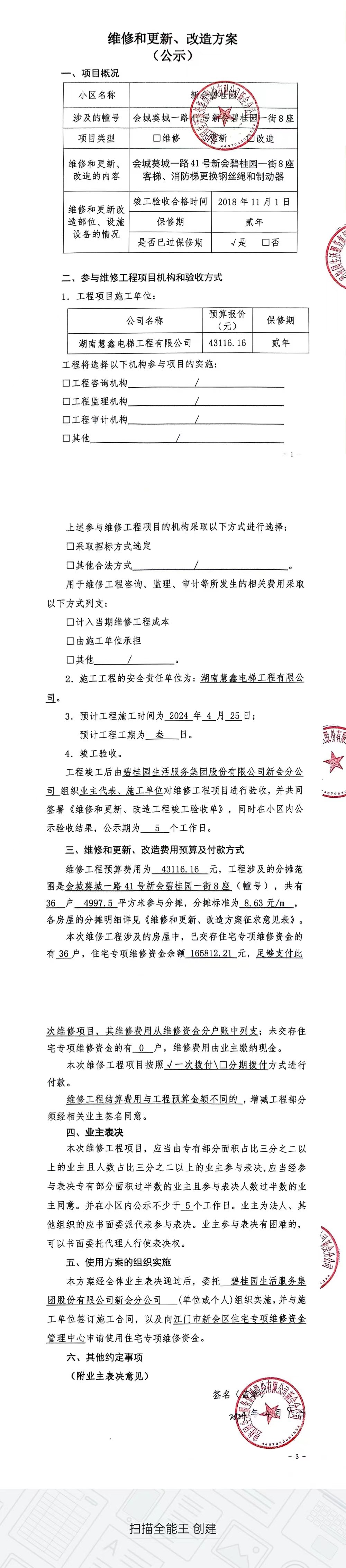 <td VALIGN="top" VALUES="" STYLE="border-width:0" BINDTYPE="0" ROWSPAN="19" COLSPAN="7" DATASOURCE="投票结果" ><font style="font-size:14pt;"><p style="white-space: normal; font-family: 宋体; line-height: 1.75em;">新会碧桂园葵城一路41号01街08座全体业主:</p><p style="white-space: normal; font-family: 宋体; line-height: 1.75em; text-indent: 2em;">本小区关于新会碧桂园会城葵城一路41号新会碧桂园一街8座客梯、消防梯更换钢丝绳和制动器使用维修资金的投票的投票已表决结束,询异时间从2024年06月01日开始,投票询异公示期间,业主可通过微信查询自己的表决情况或可凭身份证件申请查询自己的表决情况;如公示的业主表决情况与查询的本人表决意见不一致的,可以以书面形式向投票组织机构申诉,投票组织机构予以纠正并重新公示表决结果。异议提出人对投票组织机构的处理仍有异议的,可以向街道办事处(镇人民政府)反映处理,涉及住宅专项维修资金的,可向属地住宅专项维修资金管理中心反映处理。</p><p style="white-space: normal;"><br/></p><p style="white-space: normal; font-family: 宋体; line-height: 1.75em;"><strong>附件:</strong></p><p style="white-space: normal; font-family: 宋体; line-height: 1.75em;"><strong>一、投票范围</strong></p><p style="white-space: normal; font-family: 宋体; line-height: 1.75em; text-indent: 2em;">新会碧桂园葵城一路41号01街08座</p><p style="white-space: normal; font-family: 宋体; line-height: 1.75em; text-indent: 2em;">总人数(专有部分人数之和):36</p><p style="white-space: normal; font-family: 宋体; line-height: 1.75em; text-indent: 2em;"><span style="font-family: 宋体, SimSun;"><span style="font-family: 宋体; text-indent: 32px;"><span style="font-family: 宋体; text-indent: 32px;">总户数:36</span></span></span></p><p style="white-space: normal; font-family: 宋体; line-height: 1.75em; text-indent: 2em;">建筑物总面积(专有部分面积之和):4997.50㎡</p><p style="white-space: normal; font-family: 宋体; line-height: 1.75em;"><strong>二、询异公示起止时间</strong></p><p dir="ltr" style="white-space: normal; font-family: 宋体; line-height: 1.75em; text-indent: 2em;"><span style="text-indent: 36px;">2024年06月01日至2024年06月07日</span></p><p style="white-space: normal; font-family: 宋体; line-height: 1.75em;"><strong>三、投票详细描述</strong></p><p style="white-space: normal; font-family: 宋体; line-height: 1.75em; text-indent: 2em;"><p>新会碧桂园会城葵城一路41号新会碧桂园一街8座客梯、消防梯因钢丝绳和制动器存在安全隐患,现需更换客梯、消防梯钢丝绳和制动器。现申请使用维修资金对新会碧桂园会城葵城一路41号新会碧桂园一街8座客梯、消防梯更换钢丝绳和制动器,工程维修预算约43116.16元,项目最终费用以施工合同签订为准,维修费用的分摊标准按建筑面积分摊,每平方约8.63元,详见公示,如果有业主手机不能正常通过微信投票的,请联系物业公司进行线下纸质投票,物业电话17308202884. </p></p><p style="white-space: normal; font-family: 宋体; line-height: 1.75em;"><strong>四、计票规则</strong></p><p style="white-space: normal; font-family: 宋体; line-height: 1.75em; text-indent: 2em;">表决事项:使用建筑物及其附属设施的维修资金<br /><p style='text-align: left; font-family: 宋体; font-size: 16px; line-height: 1.75em; text-indent: 2em;'>计票规则:弃权票不并入其它项 未表决票不并入其它项</p></p><p style="white-space: normal; font-family: 宋体; line-height: 1.75em;"><strong>五、通过规则</strong></p><p style="white-space: normal; font-family: 宋体; line-height: 1.75em;"><strong><strong style="white-space: normal;"><span style="font-family: 宋体, SimSun;"> 根据《中华人民共和国民法典》第二百七十八条规定:业主共同决定事项,应当由专有部分面积占比三分之二以上的业主且人数占比三分之二以上的业主参与表决。</span></strong></strong></p><p style="white-space: normal; font-family: 宋体; line-height: 1.75em; text-indent: 2em;">表决事项:使用建筑物及其附属设施的维修资金<br /><p style='text-align: left; font-family: 宋体; font-size: 16px; line-height: 1.75em; text-indent: 2em;'>通过规则:双2/3以上参与表决,参与表决双过半同意</p></p><p style="white-space: normal; font-family: 宋体; line-height: 1.75em;"><strong>六、投票结果</strong></p><p style="white-space: normal; font-family: 宋体; line-height: 1.75em; text-indent: 2em;"><div id='resultTable'><table style='table-layout: fixed; font-size:12px; margin-top:10px' width='100%' border='0' cellspacing='0' cellpadding='0'><tr><td height='28' colspan='10' align='center' style='border: 1px solid #666'><strong style='font-size: 14px;'> 使用建筑物及其附属设施的维修资金</strong></td> </tr><tr id='trfirst'><td height='28' colspan='4' style='border-left: 1px solid #666; border-bottom: 1px solid #666'><strong> 申报单位:</strong> 碧桂园生活服务集团股份有限公司新会分公司</td><td colspan='3' style='border-left: 1px solid #666; border-bottom: 1px solid #666'><strong> 联系方式:</strong> </td><td colspan='3' style='border-left: 1px solid #666; border-bottom: 1px solid #666; border-right: 1px solid #666'><strong> 申报日期:</strong> 2024年4月9日 </td></tr><tr> <td height='28' colspan='5' style='border-left: 1px solid #666; border-bottom: 1px solid #666'><strong> 总人数(专有部分人数之和):</strong>36人 </td><td colspan='5' style='border-left: 1px solid #666; border-bottom: 1px solid #666; border-right: 1px solid #666'><strong> 建筑物总面积(专有部分面积之和):</strong>4997.50㎡ </td> </tr><tr><td height='28' colspan='10' bgcolor='#F3F3F3' style='border-left: 1px solid #666;bord