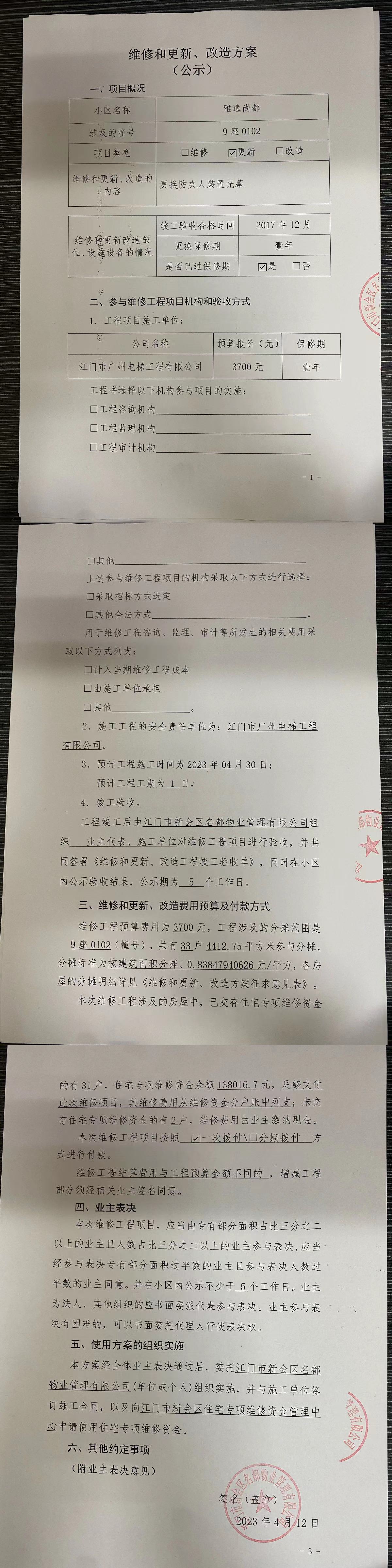 <td valign="top" values="" style="border-width:0" bindtype="0" rowspan="17" colspan="7" datasource="投票结果"><font style=" font-family:方正小标宋简体;font-size:14pt;"><p style="line-height: 1.75em;"><span style="font-family: 宋体, SimSun;">各位尊敬的业主:</span><br></p><p style="text-indent: 2em; line-height: 1.75em;"><span style="font-family: 宋体, SimSun;">根据法律法规的规定,本小区业主利用“物业公共事务决策系统”已对本小区公共事务决策事项进行了表决,在经过7日的询异公示期后,未收到业主有效的异议。现将投票结果公告,并就产生的法律效力说明如下:</span></p><p style="line-height: 1.75em; text-indent: 0em;"><strong style="text-indent: 2em;"><span style="font-family: 宋体, SimSun;">一、投票范围</span></strong></p><p style="text-indent: 2em; line-height: 1.75em;"><span style="font-family: 宋体, SimSun;">雅逸尚都雅逸尚都9座</span></p><p style="text-indent: 2em; line-height: 1.75em;"><span style="font-family: 宋体, SimSun;">总人数(专有部分人数之和):33</span></p><p style="text-indent: 2em; line-height: 1.75em;"><span style="font-family: 宋体, SimSun;"><span style="font-family: 宋体, SimSun; text-indent: 32px;">总户数:33</span></span></p><p style="text-indent: 2em; line-height: 1.75em;"><span style="font-family: 宋体, SimSun;">建筑物总面积(专有部分面积之和):4412.75㎡</span></p><p style="line-height: 1.75em;"><strong><span style="font-family: 宋体, SimSun;">二、投票起止时间</span></strong></p><p style="text-indent: 2em; line-height: 1.75em;"><span style="font-family: 宋体, SimSun;">投票表决时间:从2023年04月12日到2023年04月17日止</span></p><p style="text-indent: 2em; line-height: 1.75em;"><span style="font-family: 宋体, SimSun;">投票询异公示时间:从2023年04月18日开始</span></p><p style="text-indent: 2em; line-height: 1.75em;"><span style="font-family: 宋体, SimSun;">投票结果通知公告时间:从2023年04月25日开始</span></p><p style="line-height: 1.75em;"><strong><span style="font-family: 宋体, SimSun;">三、计票规则</span></strong></p><p style="text-indent: 2em; line-height: 1.75em;"><span style="font-family: 宋体, SimSun;">表决事项:使用建筑物及其附属设施的维修资金<br></span></p><p style="font-family: 宋体, SimSun;line-height: 1.75em; text-indent: 2em;">计票规则:弃权票不并入其它项 未表决票不并入其它项</p><p></p><p style="line-height: 1.75em;"><strong><span style="font-family: 宋体, SimSun;">四、通过规则</span></strong></p><p style="text-indent: 2em; line-height: 1.75em;"><span style="font-family: 宋体, SimSun;"><span style="font-family: 宋体, SimSun; text-indent: 32px;">表决事项:使用建筑物及其附属设施的维修资金<br></span></span></p><p style="font-family: 宋体, SimSun;line-height: 1.75em; text-indent: 2em;">通过规则:参与表决专有部分面积过半数的业主且参与表决人数过半数的业主同意</p><p></p><p style="line-height: 1.75em;"><strong><span style="font-family: 宋体, SimSun;">五、投票结果</span></strong></p><p style="line-height: 1.75em; text-indent: 2em;"><span style="font-family: 宋体, SimSun; text-indent: 2em;"></span></p><div id="resultTable"><table style="table-layout: fixed; font-size:12px; margin-top:10px" width="100%" border="0" cellspacing="0" cellpadding="0"><tbody><tr><td height="28" colspan="10" align="center" style="border: 1px solid #666"><strong style="font-size: 14px;"> 使用建筑物及其附属设施的维修资金</strong></td> </tr><tr id="trfirst"><td height="28" colspan="4" style="border-left: 1px solid #666; border-bottom: 1px solid #666"><strong> 申报单位:</strong> 江门市新会区名都物业管理有限公司</td><td colspan="3" style="border-left: 1px solid #666; border-bottom: 1px solid #666"><strong> 联系方式:</strong> 6609908 </td><td colspan="3" style="border-left: 1px solid #666; border-bottom: 1px solid #666; border-right: 1px solid #666"><strong> 申报日期:</strong> 2023年4月12日 </td></tr><tr> <td height="28" colspan="5" style="border-left: 1px solid #666; border-bottom: 1px solid #666"><strong> 总人数(专有部分人数之和):</strong>33人 </td><td colspan="5" style="border-left: 1px solid #666; border-bottom: 1px solid #666; border-right: 1px solid #666"><strong> 建筑物总面积(专有部分面积之和):</strong>4412.75㎡ </td> </tr><tr><td height="28" colspan="10" bgcolor="#F3F3F3" style="border-left: 1px solid #666;border-bottom: 1px solid #666;border-right: 1px solid #666"><strong> 参与人数及面积统计</strong></td></tr><tr><td height="28" colspan="5" style="border-left: 1px solid #666; border-bottom: 1px solid #666"><strong> 参与表决专有部分人数之和:</strong>24人</td><td colspan="5" style="border-left: 1px solid #666; border-bottom: 1px solid #666; border-right: 1px solid #666"><strong> 参与表决占有表决权总人数比例:</strong>72.73%</td></tr><tr><td height="28" colspan="5" style="border-left: 1px solid #666; border-bottom: 1px solid #666"><strong> 参与表决专有部分面积之和:</strong>3101.16㎡</td><td colspan="5" style="border-left: 1px solid #666; border-bottom: 1px solid #666; border-right: 1px solid #666"><strong> 参与表决占有表决权总面积比例:</strong>70.28%</td></tr><tr><td height="28" colspan="10" bgcolor="#F3F3F3" style="border-left: 1px solid #666; border-bottom: 1px solid #666;border-right: 1px solid #666"> <strong> 未参与人数及面积统计</strong></td> </tr><tr><td height="28" colspan="5" style="border-left: 1px solid #666; border-bottom: 1px solid #666"><strong> 未参与表决专有部分人数之和:</strong>9人 </td><td colspan="5" style="border-left: 1px solid #666; border-bottom: 1px solid #666; border-right: 1px solid #666"><strong> 未参与表决占有表决权总人数比例:</strong>27.27%</td></tr><tr><td height="28