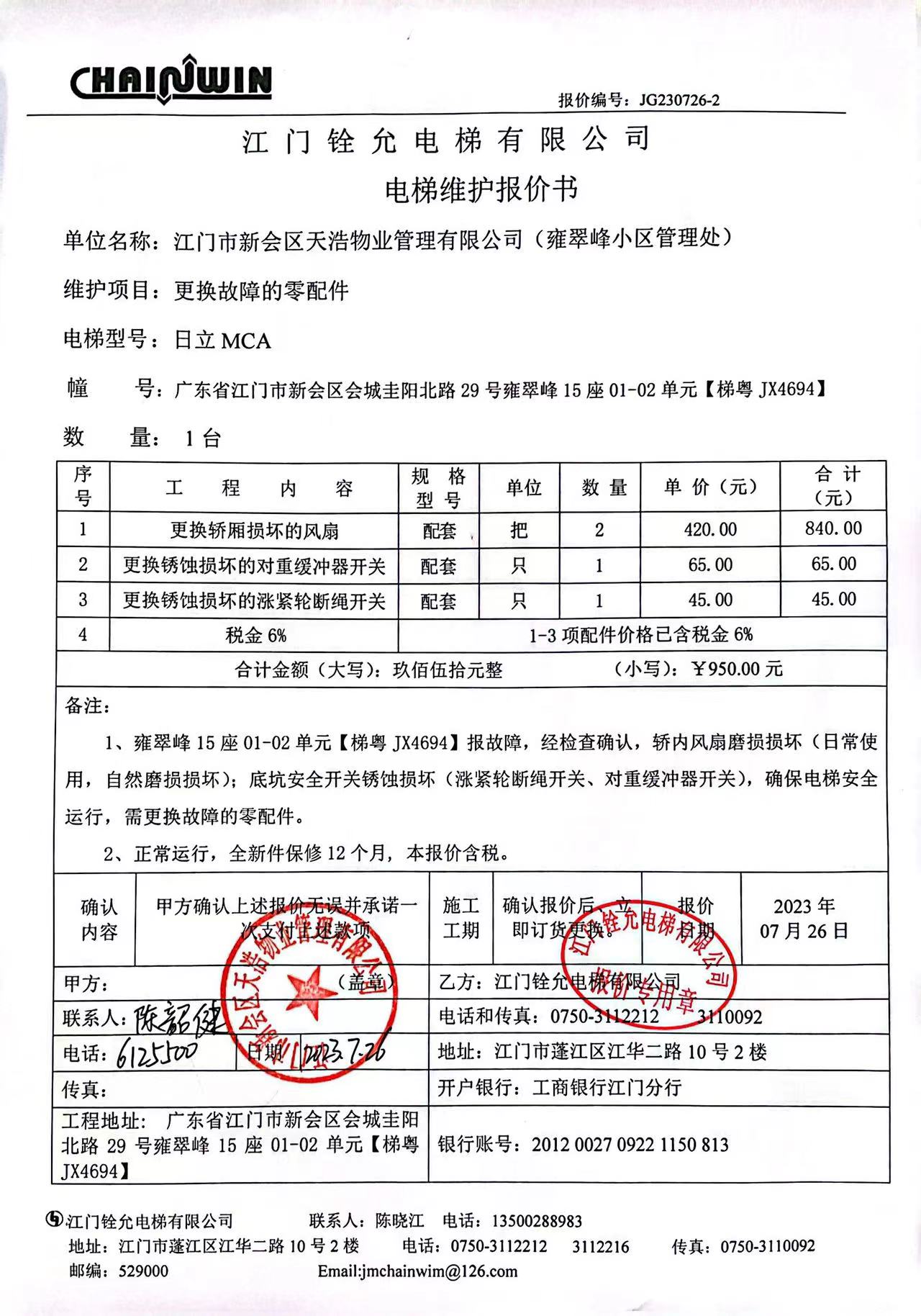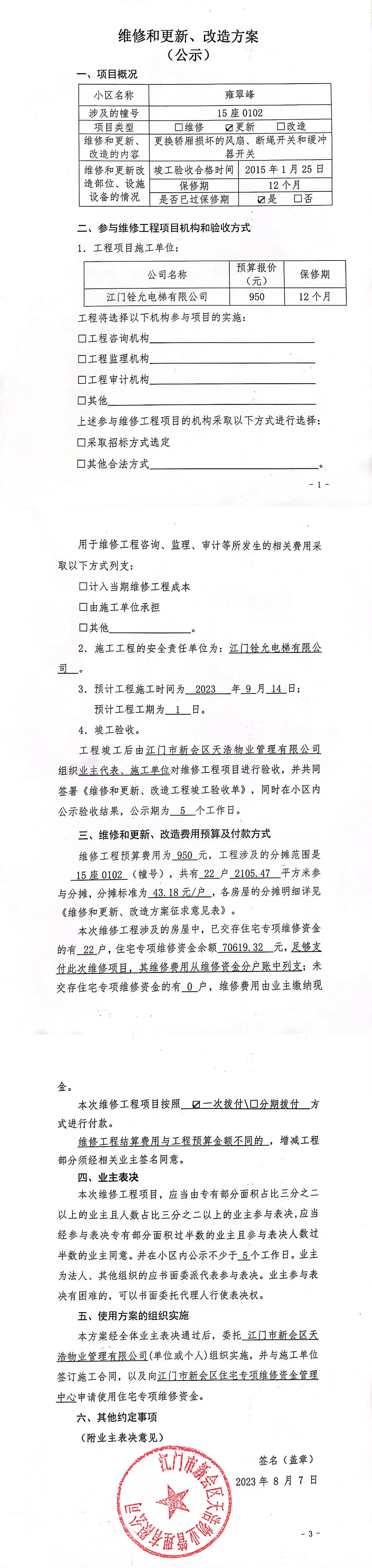 <td VALIGN="top" VALUES="" STYLE="border-width:0" BINDTYPE="0" ROWSPAN="19" COLSPAN="7" DATASOURCE="投票结果" ><font style="font-size:14pt;"><p style="white-space: normal; font-family: 宋体; line-height: 1.75em;">雍翠峰雍翠峰15座全体业主:</p><p style="white-space: normal; font-family: 宋体; line-height: 1.75em; text-indent: 2em;">本小区关于雍翠峰15座0102电梯更换轿厢损坏的风扇和锈蚀的开关使用维修资金的投票的投票已表决结束,询异时间从2023年09月08日开始,投票询异公示期间,业主可通过微信查询自己的表决情况或可凭身份证件申请查询自己的表决情况;如公示的业主表决情况与查询的本人表决意见不一致的,可以以书面形式向投票组织机构申诉,投票组织机构予以纠正并重新公示表决结果。异议提出人对投票组织机构的处理仍有异议的,可以向街道办事处(镇人民政府)反映处理,涉及住宅专项维修资金的,可向属地住宅专项维修资金管理中心反映处理。</p><p style="white-space: normal;"><br/></p><p style="white-space: normal; font-family: 宋体; line-height: 1.75em;"><strong>附件:</strong></p><p style="white-space: normal; font-family: 宋体; line-height: 1.75em;"><strong>一、投票范围</strong></p><p style="white-space: normal; font-family: 宋体; line-height: 1.75em; text-indent: 2em;">雍翠峰雍翠峰15座</p><p style="white-space: normal; font-family: 宋体; line-height: 1.75em; text-indent: 2em;">总人数(专有部分人数之和):22</p><p style="white-space: normal; font-family: 宋体; line-height: 1.75em; text-indent: 2em;"><span style="font-family: 宋体, SimSun;">总户数:22</span></p><p style="white-space: normal; font-family: 宋体; line-height: 1.75em; text-indent: 2em;">建筑物总面积(专有部分面积之和):2105.47㎡</p><p style="white-space: normal; font-family: 宋体; line-height: 1.75em;"><strong>二、询异公示起止时间</strong></p><p dir="ltr" style="white-space: normal; font-family: 宋体; line-height: 1.75em; text-indent: 2em;"><span style="text-indent: 36px;">2023年09月08日至2023年09月14日</span></p><p style="white-space: normal; font-family: 宋体; line-height: 1.75em;"><strong>三、投票详细描述</strong></p><p style="white-space: normal; font-family: 宋体; line-height: 1.75em; text-indent: 2em;"><p>雍翠峰15座0102的电梯异响,经检查确认为风扇异响磨损损坏,底坑安全开关锈蚀损坏(日常使用,自然磨损损坏)已过保修期。现需申请使用维修资金对15座0102电梯进行维修,工程维修预算金额为950元,项目最终费用以施工合同签订金额为准。维修费用的分摊标准为按分户分摊,每户分摊43.18元,详见公示附件。如业主手机不能正常通过维修投票,请联系物业公司进行线下纸质投票,物业电话:0750-6125500</p></p><p style="white-space: normal; font-family: 宋体; line-height: 1.75em;"><strong>四、计票规则</strong></p><p style="white-space: normal; font-family: 宋体; line-height: 1.75em; text-indent: 2em;">表决事项:使用建筑物及其附属设施的维修资金<br /><p style='text-align: left; font-family: 宋体; font-size: 16px; line-height: 1.75em; text-indent: 2em;'>计票规则:弃权票不并入其它项 未表决票不并入其它项</p></p><p style="white-space: normal; font-family: 宋体; line-height: 1.75em;"><strong>五、通过规则</strong></p><p style="white-space: normal; font-family: 宋体; line-height: 1.75em; text-indent: 2em;">表决事项:使用建筑物及其附属设施的维修资金<br /><p style='text-align: left; font-family: 宋体; font-size: 16px; line-height: 1.75em; text-indent: 2em;'>通过规则:参与表决专有部分面积过半数的业主且参与表决人数过半数的业主同意</p></p><p style="white-space: normal; font-family: 宋体; line-height: 1.75em;"><strong>六、投票结果</strong></p><p style="white-space: normal; font-family: 宋体; line-height: 1.75em; text-indent: 2em;"><div id='resultTable'><table style='table-layout: fixed; font-size:12px; margin-top:10px' width='100%' border='0' cellspacing='0' cellpadding='0'><tr><td height='28' colspan='10' align='center' style='border: 1px solid #666'><strong style='font-size: 14px;'> 使用建筑物及其附属设施的维修资金</strong></td> </tr><tr id='trfirst'><td height='28' colspan='4' style='border-left: 1px solid #666; border-bottom: 1px solid #666'><strong> 申报单位:</strong> 江门市新会区天浩物业管理有限公司</td><td colspan='3' style='border-left: 1px solid #666; border-bottom: 1px solid #666'><strong> 联系方式:</strong> </td><td colspan='3' style='border-left: 1px solid #666; border-bottom: 1px solid #666; border-right: 1px solid #666'><strong> 申报日期:</strong> 2023年8月7日 </td></tr><tr> <td height='28' colspan='5' style='border-left: 1px solid #666; border-bottom: 1px solid #666'><strong> 总人数(专有部分人数之和):</strong>22人 </td><td colspan='5' style='border-left: 1px solid #666; border-bottom: 1px solid #666; border-right: 1px solid #666'><strong> 建筑物总面积(专有部分面积之和):</strong>2105.47㎡ </td> </tr><tr><td height='28' colspan='10' bgcolor='#F3F3F3' style='border-left: 1px solid #666;border-bottom: 1px solid #666;border-right: 1px solid #666'><strong> 参与人数及面积统计</strong></td></tr><tr><td height='28' colspan='5' style='border-left: 1px solid #666; border-bottom: 1px solid #666'><strong> 参与表决专有部分人数之和:</strong>7人</td><td colspan='5' style='border-left: 1px solid #666; border-bottom: 1px solid #666; border-right: 1px solid #666'><strong> 参与表决占有表决权总人数比例:</strong>31.82%</td></tr><tr><td height='28' colspan='5' style='border-left: 1px solid #666; border-bottom: 1px solid #666'><strong> 参与表决专有部分面积之和:</strong>634.84㎡</td><td colspan='5' style='border-left