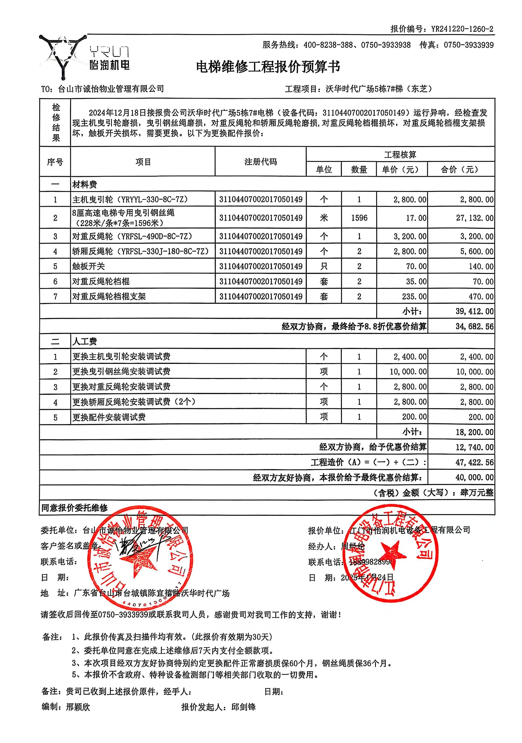 <td VALIGN="top" VALUES="" STYLE="border-width:0" BINDTYPE="0" ROWSPAN="19" COLSPAN="7" DATASOURCE="投票结果" ><font style="font-size:14pt;"><p style="white-space: normal; font-family: 宋体; line-height: 1.75em;">沃华时代广场沃华时代广场5幢全体业主:</p><p style="white-space: normal; font-family: 宋体; line-height: 1.75em; text-indent: 2em;">本小区关于沃华时代广场5栋7#电梯更换主机曳引轮、曳引钢丝绳等配件使用维修资金投票的投票已表决结束,询异时间从2025年02月11日开始,投票询异公示期间,业主可通过微信查询自己的表决情况或可凭身份证件申请查询自己的表决情况;如公示的业主表决情况与查询的本人表决意见不一致的,可以以书面形式向投票组织机构申诉,投票组织机构予以纠正并重新公示表决结果。异议提出人对投票组织机构的处理仍有异议的,可以向街道办事处(镇人民政府)反映处理,涉及住宅专项维修资金的,可向属地住宅专项维修资金管理中心反映处理。</p><p style="white-space: normal;"><br/></p><p style="white-space: normal; font-family: 宋体; line-height: 1.75em;"><strong>附件:</strong></p><p style="white-space: normal; font-family: 宋体; line-height: 1.75em;"><strong>一、投票范围</strong></p><p style="white-space: normal; font-family: 宋体; line-height: 1.75em; text-indent: 2em;">沃华时代广场沃华时代广场5幢</p><p style="white-space: normal; font-family: 宋体; line-height: 1.75em; text-indent: 2em;">总人数(专有部分人数之和):114</p><p style="white-space: normal; font-family: 宋体; line-height: 1.75em; text-indent: 2em;"><span style="font-family: 宋体, SimSun;"><span style="font-family: 宋体; text-indent: 32px;"><span style="font-family: 宋体; text-indent: 32px;">总户数:114</span></span></span></p><p style="white-space: normal; font-family: 宋体; line-height: 1.75em; text-indent: 2em;">建筑物总面积(专有部分面积之和):13451.92㎡</p><p style="white-space: normal; font-family: 宋体; line-height: 1.75em;"><strong>二、询异公示起止时间</strong></p><p dir="ltr" style="white-space: normal; font-family: 宋体; line-height: 1.75em; text-indent: 2em;"><span style="text-indent: 36px;">2025年02月11日至2025年02月21日</span></p><p style="white-space: normal; font-family: 宋体; line-height: 1.75em;"><strong>三、投票详细描述</strong></p><p style="white-space: normal; font-family: 宋体; line-height: 1.75em; text-indent: 2em;"><p style="font-family: "Helvetica Neue", Helvetica, Arial, sans-serif; font-size: 14px; white-space: normal; background-color: rgb(255, 255, 255);"><span style="font-family: 宋体, SimSun;">小区5栋7#电梯日常运行时出现异响,经检查,是由于钢丝绳变形、损伤、断丝,曳引轮绳槽、轿厢反绳轮和对重反绳轮绳槽下陷导致异响。 <br/></span></p><p dir="ltr" style="font-family: "Helvetica Neue", Helvetica, Arial, sans-serif; font-size: 14px; white-space: normal; background-color: rgb(255, 255, 255);"><span style="font-family: 宋体, SimSun;"> 现对5栋7#电梯进行维修更换主机曳引轮、曳引钢丝绳、对重反绳轮、轿厢反绳轮、触板开关、对重反绳轮档棍、对重反绳轮档棍支架,工程维修预算金额为40000元,项目最终费用以施工合同签订金额为准、<span style="font-size: 16px;"><span style="font-size: 14px; font-family: 宋体;">因已过保修期,维修费用由相关业主</span><span style="font-size: 14px;"><span style="font-family: 宋体; background-image: initial; background-position: initial; background-size: initial; background-repeat: initial; background-attachment: initial; background-origin: initial; background-clip: initial;">分户</span><span style="font-family: 宋体;">分摊,</span><span style="font-family: 宋体;">每户约350.88元</span><span style="font-family: 宋体;">,详见公示附件。如业主手机不能正常通过微信投票,请联系物业公司进行线下纸质投票,物业电话0750-5612880、561288</span></span><span style="font-size: 14px; font-family: 宋体;">2。</span></span></span></p><p><br/></p></p><p style="white-space: normal; font-family: 宋体; line-height: 1.75em;"><strong>四、计票规则</strong></p><p style="white-space: normal; font-family: 宋体; line-height: 1.75em; text-indent: 2em;">表决事项:使用建筑物及其附属设施的维修资金<br /><p style='text-align: left; font-family: 宋体; font-size: 16px; line-height: 1.75em; text-indent: 2em;'>计票规则:弃权票不并入其它项 未表决票不并入其它项</p></p><p style="white-space: normal; font-family: 宋体; line-height: 1.75em;"><strong>五、通过规则</strong></p><p style="white-space: normal; font-family: 宋体; line-height: 1.75em;"><strong><strong style="white-space: normal;"><span style="font-family: 宋体, SimSun;"> 根据《中华人民共和国民法典》第二百七十八条规定:业主共同决定事项,应当由专有部分面积占比三分之二以上的业主且人数占比三分之二以上的业主参与表决。</span></strong></strong></p><p style="white-space: normal; font-family: 宋体; line-height: 1.75em; text-indent: 2em;">表决事项:使用建筑物及其附属设施的维修资金<br /><p style='text-align: left; font-family: 宋体; font-size: 16px; line-height: 1.75em; text-indent: 2em;'>通过规则:双2/3以上参与表决,参与表决双过半同意</p></p><p style="white-space: normal; font-family: 宋体; line-height: 1.75em;"><strong>六、投票结果</strong></p><p style="white-space: normal; font-family: 宋体; line-height: 1.75em; text-indent: 2em;"><div id='resultTable'><table style='table-layout: fixed; font-size:12px; margin-top:10px' width='100%' border='0' cellspacing='0' cellpadding='0'><tr><td height='28' colspan='10' align='center' style='border: 1px solid #666'><strong style='font-size: 14px;'> 使