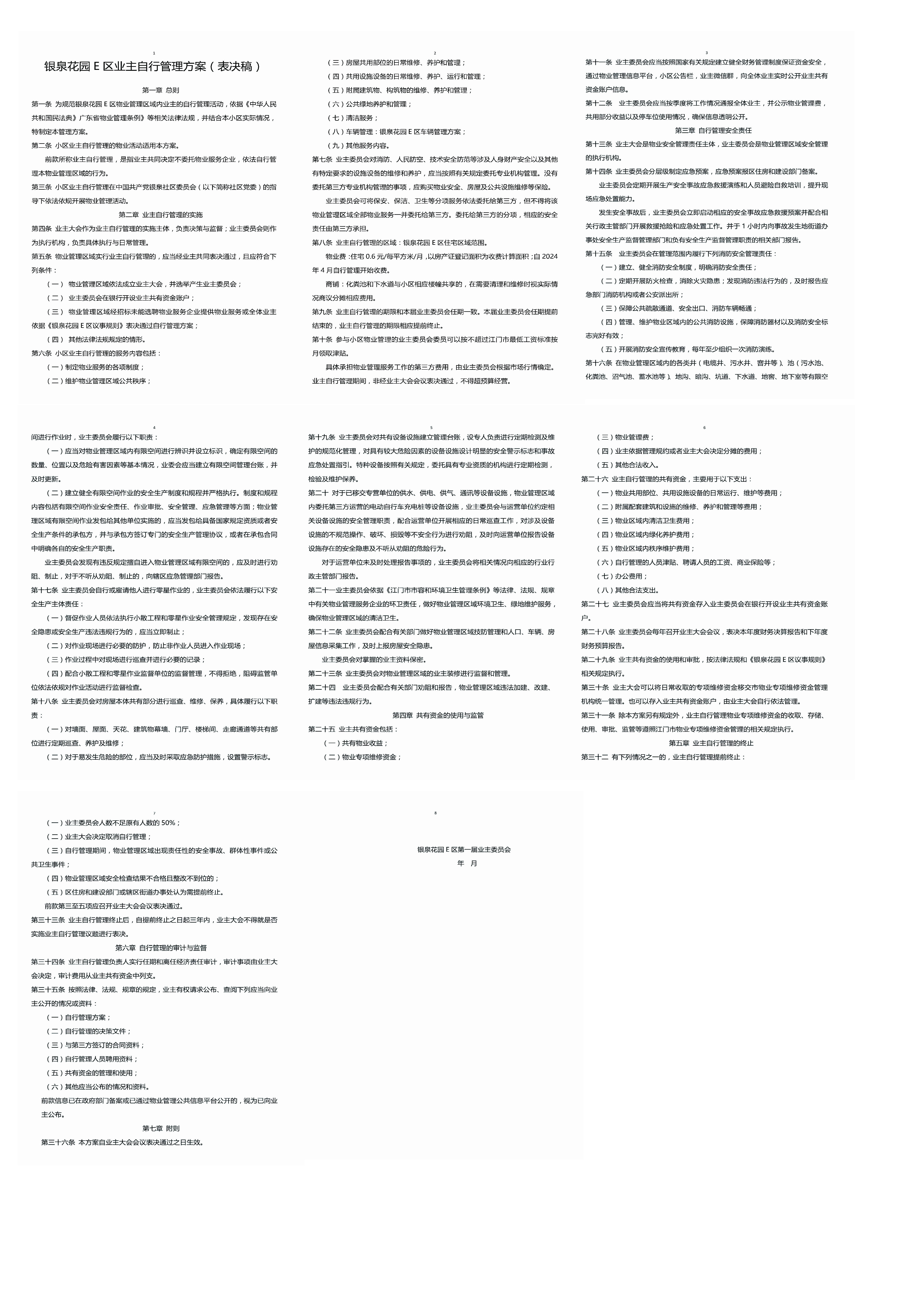 <td VALIGN="top" VALUES="" STYLE="border-width:0" BINDTYPE="0" ROWSPAN="17" COLSPAN="7" DATASOURCE="投票结果" ><font style=" font-family:方正小标宋简体;font-size:14pt;"><p style="line-height: 1.75em;"><span style="font-family: 宋体, SimSun;">各位尊敬的业主:</span><br/></p><p style="text-indent: 2em; line-height: 1.75em;"><span style="font-family: 宋体, SimSun;">根据法律法规的规定,本小区业主利用“江门市物业事项表决管理系统”已对本小区公共事务决策事项进行了表决,在经过7日的询异公示期后,未收到业主有效的异议。现将投票结果公告,并就产生的法律效力说明如下:</span></p><p style="line-height: 1.75em; text-indent: 0em;"><strong style="text-indent: 2em;"><span style="font-family: 宋体, SimSun;">一、投票范围</span></strong></p><p style="text-indent: 2em; line-height: 1.75em;"><span style="font-family: 宋体, SimSun;">银泉花园50幢、51幢、52幢、53幢、55幢、56幢、57幢之二、57幢之一、58幢之二、58幢之一、59幢之二、59幢之一、60幢、61幢之二、61幢之一、62幢之二、62幢之一、63幢之二、63幢之一、65幢之二、65幢之一、66幢之二、66幢之一、67幢之二、67幢之一、68幢之二、68幢之三、68幢之一、69幢之二、69幢之三、69幢之四、69幢之一、70幢之二、70幢之三、70幢之一、71幢之二、71幢之一、72幢之二、72幢之三、72幢之一、73幢、75幢、76幢、77幢、78幢之二、78幢之一、79幢、79幢之二、79幢之一、80幢之二、80幢之一、81幢之二、81幢之一、82幢之二、82幢之三、82幢之一、83幢-、83幢之二、83幢之三、83幢之四、83幢之一、83幢之一#、85幢、85幢之二、85幢之一、86幢、86幢之二、86幢之三、86幢之四、86幢之一、87幢之二、87幢之一、88幢之二、88幢之三、88幢之一、金星路150号、金星路152号、金星路154号、金星路156号、金星路158号、金星路160号、麻园路100号、麻园路84号、麻园路86号、麻园路88号、麻园路90号、麻园路92号、麻园路94号、麻园路96号、麻园路98号</span></p><p style="text-indent: 2em; line-height: 1.75em;"><span style="font-family: 宋体, SimSun;">总人数(专有部分人数之和):1007</span></p><p style="text-indent: 2em; line-height: 1.75em;"><span style="font-family:宋体, SimSun">总户数:1079</span></p><p style="text-indent: 2em; line-height: 1.75em;"><span style="font-family: 宋体, SimSun;">建筑物总面积(专有部分面积之和):104062.86㎡</span></p><p style="line-height: 1.75em;"><strong><span style="font-family: 宋体, SimSun;">二、<strong style="white-space: normal;"><span style="font-family: 宋体, SimSun;">投票结果公告时间</span></strong></span></strong></p><p style="text-indent: 2em; line-height: 1.75em;"><span style="font-family: 宋体, SimSun;"></span><span style="font-family: 宋体, SimSun; text-indent: 32px;">从2025年02月24日开始</span><span style="font-family: 宋体, SimSun;"></span></p><p style="line-height: 1.75em;"><strong><span style="font-family: 宋体, SimSun;">三、计票规则</span></strong></p><p style="text-indent: 2em; line-height: 1.75em;"><span style="font-family: 宋体, SimSun;">表决事项:表决《银泉花园E区业主自行管理方案》(附件1)<br /><p style='font-family: 宋体, SimSun;line-height: 1.75em; text-indent: 2em;'>计票规则:弃权票并入计入表决多数票&nbsp;&nbsp;&nbsp;&nbsp;未表决票不并入其它项</p><br />表决事项:表决《银泉花园E区车辆管理方案》(附件2)<br /><p style='font-family: 宋体, SimSun;line-height: 1.75em; text-indent: 2em;'>计票规则:弃权票并入计入表决多数票&nbsp;&nbsp;&nbsp;&nbsp;未表决票不并入其它项</p></span></p><p style="line-height: 1.75em;"><strong><span style="font-family: 宋体, SimSun;">四、通过规则</span></strong></p><p style="line-height: 1.75em;"><strong><span style="font-family: 宋体, SimSun;"><strong style="font-family: 宋体; white-space: normal;">&nbsp; 根据《中华人民共和国民法典》第二百七十八条规定:业主共同决定事项,应当由专有部分面积占比三分之二以上的业主且人数占比三分之二以上的业主参与表决。</strong></span></strong></p><p style="text-indent: 2em; line-height: 1.75em;"><span style="font-family: 宋体, SimSun;"><span style="font-family: 宋体, SimSun; text-indent: 32px;"><span style="font-family: 宋体; text-indent: 32px;">表决事项:表决《银泉花园E区业主自行管理方案》(附件1)<br /><p style='font-family: 宋体, SimSun;line-height: 1.75em; text-indent: 2em;'>通过规则:双2/3以上参与表决,参与表决双过半同意</p><br/>表决事项:表决《银泉花园E区车辆管理方案》(附件2)<br /><p style='font-family: 宋体, SimSun;line-height: 1.75em; text-indent: 2em;'>通过规则:双2/3以上参与表决,参与表决双3/4以上同意</p></span></span></span></p><p style="line-height: 1.75em;"><strong><span style="font-family: 宋体, SimSun;">五、投票结果</span></strong></p><p style="line-height: 1.75em; text-indent: 2em;"><span style="font-family: 宋体, SimSun; text-indent: 2em;"><div id='resultTable'><table style='table-layout: fixed; font-size:12px; margin-top:10px' width='100%' border='0' cellspacing='0' cellpadding='0'><tr><td height='28' colspan='10' align='center' style='border: 1px solid #666'><strong style='font-size: 14px;'> 表决《银泉花园E区业主自行管理方案》(附件1)</strong></td> </tr><tr id='trfirst'><td height='28' colspan='4' style='border-left: 1px solid #666; border-bottom: 1px solid #666'><strong>&nbsp;申报单位:</strong> 江门市江海区外海街道银泉花园E区业主委员会</td><td colspan='3' style='border-left: 1px solid #666; border-bottom: 1px solid #666'><strong>&nbsp;联系方式:</strong> </td><td colspan='3' style='border-left: 1px solid #666; b