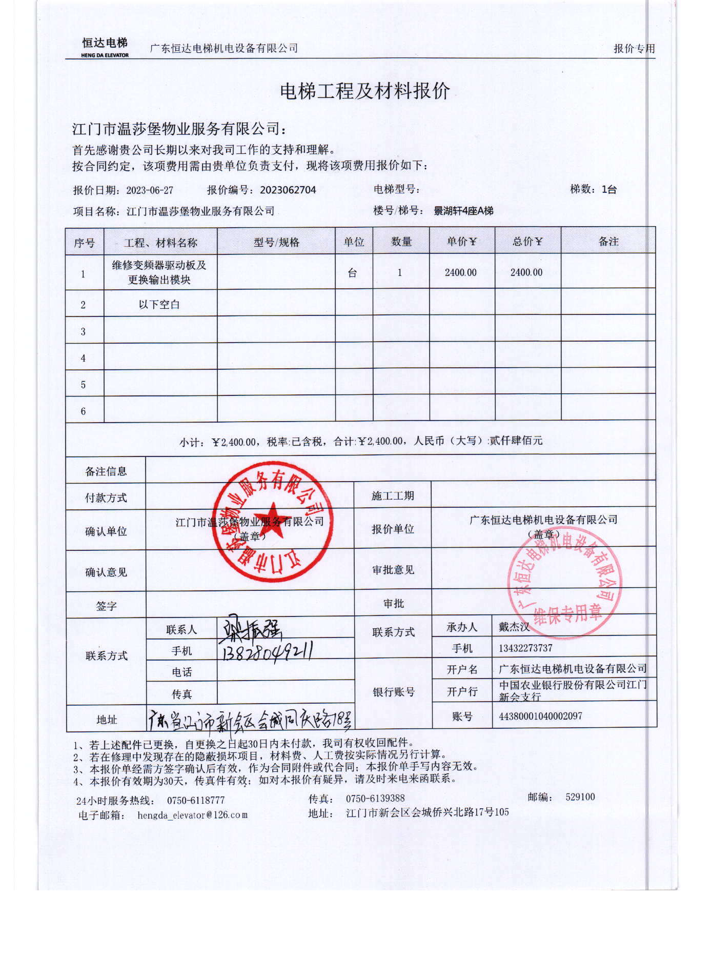 <td VALIGN="top" VALUES="" STYLE="border-width:0" BINDTYPE="0" ROWSPAN="19" COLSPAN="7" DATASOURCE="投票结果" ><font style="font-size:14pt;"><p style="white-space: normal; font-family: 宋体; line-height: 1.75em;">骏凯豪庭骏凯豪庭景湖轩4座全体业主:</p><p style="white-space: normal; font-family: 宋体; line-height: 1.75em; text-indent: 2em;">本小区关于骏凯豪庭景湖轩4座电梯(梯11粤JX1604(20))维修变频器驱动板及更换输出模块使用维修资金的投票的投票已表决结束,询异时间从2023年08月05日开始,投票询异公示期间,业主可通过微信查询自己的表决情况或可凭身份证件申请查询自己的表决情况;如公示的业主表决情况与查询的本人表决意见不一致的,可以以书面形式向投票组织机构申诉,投票组织机构予以纠正并重新公示表决结果。异议提出人对投票组织机构的处理仍有异议的,可以向街道办事处(镇人民政府)反映处理,涉及住宅专项维修资金的,可向属地住宅专项维修资金管理中心反映处理。</p><p style="white-space: normal;"><br/></p><p style="white-space: normal; font-family: 宋体; line-height: 1.75em;"><strong>附件:</strong></p><p style="white-space: normal; font-family: 宋体; line-height: 1.75em;"><strong>一、投票范围</strong></p><p style="white-space: normal; font-family: 宋体; line-height: 1.75em; text-indent: 2em;">骏凯豪庭骏凯豪庭景湖轩4座</p><p style="white-space: normal; font-family: 宋体; line-height: 1.75em; text-indent: 2em;">总人数(专有部分人数之和):66</p><p style="white-space: normal; font-family: 宋体; line-height: 1.75em; text-indent: 2em;"><span style="font-family: 宋体, SimSun;">总户数:66</span></p><p style="white-space: normal; font-family: 宋体; line-height: 1.75em; text-indent: 2em;">建筑物总面积(专有部分面积之和):8420.67㎡</p><p style="white-space: normal; font-family: 宋体; line-height: 1.75em;"><strong>二、询异公示起止时间</strong></p><p dir="ltr" style="white-space: normal; font-family: 宋体; line-height: 1.75em; text-indent: 2em;"><span style="text-indent: 36px;">2023年08月05日至2023年08月11日</span></p><p style="white-space: normal; font-family: 宋体; line-height: 1.75em;"><strong>三、投票详细描述</strong></p><p style="white-space: normal; font-family: 宋体; line-height: 1.75em; text-indent: 2em;"><p>骏凯豪庭景湖轩4座的电梯(梯11粤JX1604(20))出现故障,经检查,是由于变频器驱动板及输出模块故障,已过保修期。现需申请使用维修资金对景湖轩4座电梯(梯11粤JX1604(20))变频器驱动板进行维修及更换输出模块,工程维修预算金额为2400元,项目最终费用以施工合同签订金额为准。维修费用的分摊标准为0.28502元/平方 ,详见公示附件。物业公司联系电话:0750-6399789</p></p><p style="white-space: normal; font-family: 宋体; line-height: 1.75em;"><strong>四、计票规则</strong></p><p style="white-space: normal; font-family: 宋体; line-height: 1.75em; text-indent: 2em;">表决事项:使用建筑物及其附属设施的维修资金<br /><p style='text-align: left; font-family: 宋体; font-size: 16px; line-height: 1.75em; text-indent: 2em;'>计票规则:弃权票不并入其它项 未表决票不并入其它项</p></p><p style="white-space: normal; font-family: 宋体; line-height: 1.75em;"><strong>五、通过规则</strong></p><p style="white-space: normal; font-family: 宋体; line-height: 1.75em; text-indent: 2em;">表决事项:使用建筑物及其附属设施的维修资金<br /><p style='text-align: left; font-family: 宋体; font-size: 16px; line-height: 1.75em; text-indent: 2em;'>通过规则:参与表决专有部分面积过半数的业主且参与表决人数过半数的业主同意</p></p><p style="white-space: normal; font-family: 宋体; line-height: 1.75em;"><strong>六、投票结果</strong></p><p style="white-space: normal; font-family: 宋体; line-height: 1.75em; text-indent: 2em;"><div id='resultTable'><table style='table-layout: fixed; font-size:12px; margin-top:10px' width='100%' border='0' cellspacing='0' cellpadding='0'><tr><td height='28' colspan='10' align='center' style='border: 1px solid #666'><strong style='font-size: 14px;'> 使用建筑物及其附属设施的维修资金</strong></td> </tr><tr id='trfirst'><td height='28' colspan='4' style='border-left: 1px solid #666; border-bottom: 1px solid #666'><strong> 申报单位:</strong> 江门市温莎堡物业服务有限公司</td><td colspan='3' style='border-left: 1px solid #666; border-bottom: 1px solid #666'><strong> 联系方式:</strong> 07506392388 </td><td colspan='3' style='border-left: 1px solid #666; border-bottom: 1px solid #666; border-right: 1px solid #666'><strong> 申报日期:</strong> 2023年7月19日 </td></tr><tr> <td height='28' colspan='5' style='border-left: 1px solid #666; border-bottom: 1px solid #666'><strong> 总人数(专有部分人数之和):</strong>66人 </td><td colspan='5' style='border-left: 1px solid #666; border-bottom: 1px solid #666; border-right: 1px solid #666'><strong> 建筑物总面积(专有部分面积之和):</strong>8420.67㎡ </td> </tr><tr><td height='28' colspan='10' bgcolor='#F3F3F3' style='border-left: 1px solid #666;border-bottom: 1px solid #666;border-right: 1px solid #666'><strong> 参与人数及面积统计</strong></td></tr><tr><td height='28' colspan='5' style='border-left: 1px solid #666; border-bottom: 1px solid #666'><strong> 参与表决专有部分人数之和:</strong>47人</td><td colspan='5' style='border-left: 1px solid #666; border-bottom: 1px solid #666; border-right: 1px solid #666'><strong> 参与表决占有表决权总人数比例:</strong>71.21%</td></tr><tr><td height='28' colspan='5' style='border-left: 1px solid #666; border-bottom: 1px solid #666'><strong> 参与表决专有部分面积之和:</strong>5974.79㎡</td><td colspan='5' st
