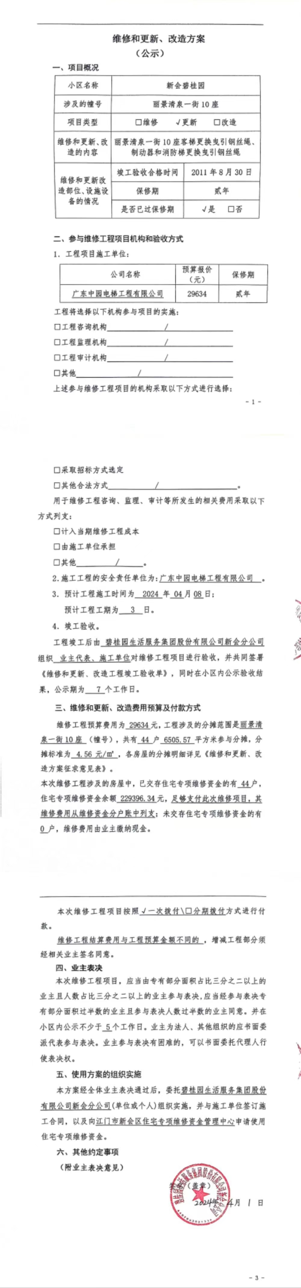 <td VALIGN="top" VALUES="" STYLE="border-width:0" BINDTYPE="0" ROWSPAN="19" COLSPAN="7" DATASOURCE="投票结果" ><font style="font-size:14pt;"><p style="white-space: normal; font-family: 宋体; line-height: 1.75em;">新会碧桂园丽景清泉一街10座全体业主:</p><p style="white-space: normal; font-family: 宋体; line-height: 1.75em; text-indent: 2em;">本小区关于新会碧桂园丽景清泉一街10座客梯更换曳引钢丝绳、制动器,消防梯更换曳引钢丝绳使用维修资金的投票的投票已表决结束,询异时间从2024年04月08日开始,投票询异公示期间,业主可通过微信查询自己的表决情况或可凭身份证件申请查询自己的表决情况;如公示的业主表决情况与查询的本人表决意见不一致的,可以以书面形式向投票组织机构申诉,投票组织机构予以纠正并重新公示表决结果。异议提出人对投票组织机构的处理仍有异议的,可以向街道办事处(镇人民政府)反映处理,涉及住宅专项维修资金的,可向属地住宅专项维修资金管理中心反映处理。</p><p style="white-space: normal;"><br/></p><p style="white-space: normal; font-family: 宋体; line-height: 1.75em;"><strong>附件:</strong></p><p style="white-space: normal; font-family: 宋体; line-height: 1.75em;"><strong>一、投票范围</strong></p><p style="white-space: normal; font-family: 宋体; line-height: 1.75em; text-indent: 2em;">新会碧桂园丽景清泉一街10座</p><p style="white-space: normal; font-family: 宋体; line-height: 1.75em; text-indent: 2em;">总人数(专有部分人数之和):44</p><p style="white-space: normal; font-family: 宋体; line-height: 1.75em; text-indent: 2em;"><span style="font-family: 宋体, SimSun;"><span style="font-family: 宋体; text-indent: 32px;"><span style="font-family: 宋体; text-indent: 32px;">总户数:44</span></span></span></p><p style="white-space: normal; font-family: 宋体; line-height: 1.75em; text-indent: 2em;">建筑物总面积(专有部分面积之和):6505.57㎡</p><p style="white-space: normal; font-family: 宋体; line-height: 1.75em;"><strong>二、询异公示起止时间</strong></p><p dir="ltr" style="white-space: normal; font-family: 宋体; line-height: 1.75em; text-indent: 2em;"><span style="text-indent: 36px;">2024年04月08日至2024年04月14日</span></p><p style="white-space: normal; font-family: 宋体; line-height: 1.75em;"><strong>三、投票详细描述</strong></p><p style="white-space: normal; font-family: 宋体; line-height: 1.75em; text-indent: 2em;"><p>新会碧桂园丽景清泉一街10座客梯和消防梯出现异响和振动,检查发现客梯制动器老化,客梯和消防梯的曳引钢丝绳出现磨损严重,导致故障发生比较频繁,有卡阻安全隐患。已过保修期,现申请使用维修资金对新会碧桂园丽景清泉一街10座客梯曳引钢丝绳、制动器,消防梯曳引钢丝绳进行更换,工程维修预算约29634元,项目最终费用以施工合同签订为准,维修费用的分摊标准按建筑面积分摊,每平方约4.56元,详见公示,如果有业主手机不能正常通过微信投票的,请联系物业公司进行线下纸质投票,物业电话18088896991</p></p><p style="white-space: normal; font-family: 宋体; line-height: 1.75em;"><strong>四、计票规则</strong></p><p style="white-space: normal; font-family: 宋体; line-height: 1.75em; text-indent: 2em;">表决事项:使用建筑物及其附属设施的维修资金<br /><p style='text-align: left; font-family: 宋体; font-size: 16px; line-height: 1.75em; text-indent: 2em;'>计票规则:弃权票不并入其它项 未表决票不并入其它项</p></p><p style="white-space: normal; font-family: 宋体; line-height: 1.75em;"><strong>五、通过规则</strong></p><p style="white-space: normal; font-family: 宋体; line-height: 1.75em;"><strong><strong style="white-space: normal;"><span style="font-family: 宋体, SimSun;"> 根据《中华人民共和国民法典》第二百七十八条规定:业主共同决定事项,应当由专有部分面积占比三分之二以上的业主且人数占比三分之二以上的业主参与表决。</span></strong></strong></p><p style="white-space: normal; font-family: 宋体; line-height: 1.75em; text-indent: 2em;">表决事项:使用建筑物及其附属设施的维修资金<br /><p style='text-align: left; font-family: 宋体; font-size: 16px; line-height: 1.75em; text-indent: 2em;'>通过规则:双2/3以上参与表决,参与表决双过半同意</p></p><p style="white-space: normal; font-family: 宋体; line-height: 1.75em;"><strong>六、投票结果</strong></p><p style="white-space: normal; font-family: 宋体; line-height: 1.75em; text-indent: 2em;"><div id='resultTable'><table style='table-layout: fixed; font-size:12px; margin-top:10px' width='100%' border='0' cellspacing='0' cellpadding='0'><tr><td height='28' colspan='10' align='center' style='border: 1px solid #666'><strong style='font-size: 14px;'> 使用建筑物及其附属设施的维修资金</strong></td> </tr><tr id='trfirst'><td height='28' colspan='4' style='border-left: 1px solid #666; border-bottom: 1px solid #666'><strong> 申报单位:</strong> 碧桂园生活服务集团股份有限公司新会分公司</td><td colspan='3' style='border-left: 1px solid #666; border-bottom: 1px solid #666'><strong> 联系方式:</strong> </td><td colspan='3' style='border-left: 1px solid #666; border-bottom: 1px solid #666; border-right: 1px solid #666'><strong> 申报日期:</strong> 2024年4月1日 </td></tr><tr> <td height='28' colspan='5' style='border-left: 1px solid #666; border-bottom: 1px solid #666'><strong> 总人数(专有部分人数之和):</strong>44人 </td><td colspan='5' style='border-left: 1px solid #666; border-bottom: 1px solid #666; border-right: 1px solid #666'><strong> 建筑物总面积(专有部分面积之和):</strong>6505.57㎡ </td> </tr><tr><td height='28' colspan='10' bgcolor='#