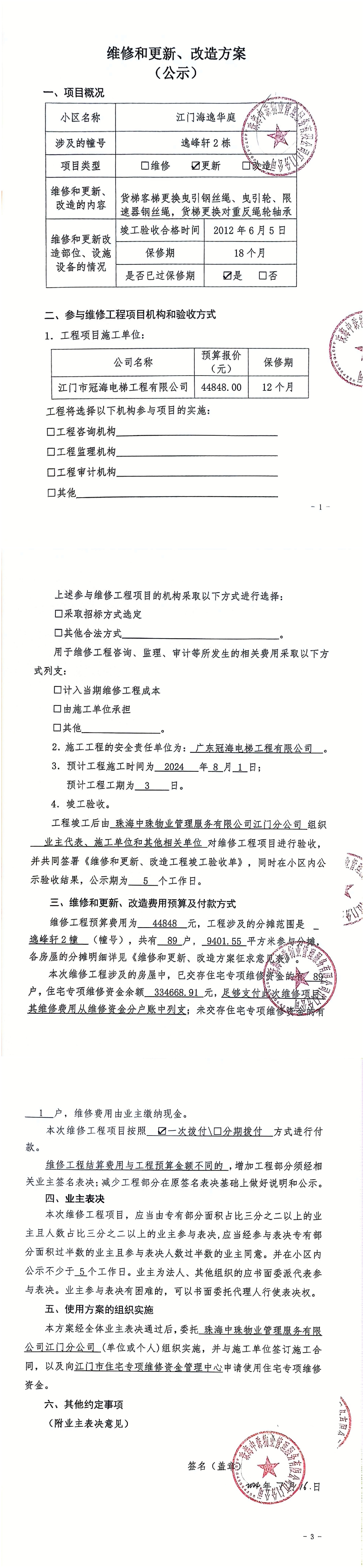 <td VALIGN="top" VALUES="" STYLE="border-width:0" BINDTYPE="0" ROWSPAN="19" COLSPAN="7" DATASOURCE="投票结果" ><font style="font-size:14pt;"><p style="white-space: normal; font-family: 宋体; line-height: 1.75em;">海逸华庭江海区海逸华庭逸峰轩2幢全体业主:</p><p style="white-space: normal; font-family: 宋体; line-height: 1.75em; text-indent: 2em;">本小区关于江门海逸华庭逸峰轩2栋货梯客梯更换曳引钢丝绳、曳引轮、限速器钢丝绳,货梯更换对重反绳轮轴承使用维修资金的投票的投票已表决结束,询异时间从2024年09月19日开始,投票询异公示期间,业主可通过微信查询自己的表决情况或可凭身份证件申请查询自己的表决情况;如公示的业主表决情况与查询的本人表决意见不一致的,可以以书面形式向投票组织机构申诉,投票组织机构予以纠正并重新公示表决结果。异议提出人对投票组织机构的处理仍有异议的,可以向街道办事处(镇人民政府)反映处理,涉及住宅专项维修资金的,可向属地住宅专项维修资金管理中心反映处理。</p><p style="white-space: normal;"><br/></p><p style="white-space: normal; font-family: 宋体; line-height: 1.75em;"><strong>附件:</strong></p><p style="white-space: normal; font-family: 宋体; line-height: 1.75em;"><strong>一、投票范围</strong></p><p style="white-space: normal; font-family: 宋体; line-height: 1.75em; text-indent: 2em;">海逸华庭江海区海逸华庭逸峰轩2幢</p><p style="white-space: normal; font-family: 宋体; line-height: 1.75em; text-indent: 2em;">总人数(专有部分人数之和):87</p><p style="white-space: normal; font-family: 宋体; line-height: 1.75em; text-indent: 2em;"><span style="font-family: 宋体, SimSun;"><span style="font-family: 宋体; text-indent: 32px;"><span style="font-family: 宋体; text-indent: 32px;">总户数:89</span></span></span></p><p style="white-space: normal; font-family: 宋体; line-height: 1.75em; text-indent: 2em;">建筑物总面积(专有部分面积之和):9401.55㎡</p><p style="white-space: normal; font-family: 宋体; line-height: 1.75em;"><strong>二、询异公示起止时间</strong></p><p dir="ltr" style="white-space: normal; font-family: 宋体; line-height: 1.75em; text-indent: 2em;"><span style="text-indent: 36px;">2024年09月19日至2024年09月25日</span></p><p style="white-space: normal; font-family: 宋体; line-height: 1.75em;"><strong>三、投票详细描述</strong></p><p style="white-space: normal; font-family: 宋体; line-height: 1.75em; text-indent: 2em;"><p style="font-family: "Helvetica Neue", Helvetica, Arial, sans-serif; font-size: 14px; text-wrap: wrap; background-color: rgb(255, 255, 255);">本小区江门海逸华庭2024年7月11日,经广东省特种设备检测研究院江门检测院对逸峰轩2幢2台乘客电梯进行年度检测,曳引钢丝绳及限速器钢丝绳已严重锈蚀、曳引轮磨损导致磨擦力不足、对重反绳轮轴承磨损导致有异响,检测结果为不合格。此问题会出现电梯运行不平层、振动、异响、 打滑故障,如果不及时更换会造成电梯钢丝绳断股或断丝,需对该栋电梯货梯客梯更换曳引钢丝绳、曳引轮、限速器钢丝绳,货梯更换对重反绳轮轴承方能恢复电梯安全运行。</p><p style="font-family: "Helvetica Neue", Helvetica, Arial, sans-serif; font-size: 14px; text-wrap: wrap; background-color: rgb(255, 255, 255);"> 现需申请使用维修资金对海逸华庭逸峰轩2栋的货梯客梯维修,工程维修预算金额为44848.00元,项目最终费用以施工合同签订金额为准,因已过保修期,维修费用由相关业主按建筑面积分摊,每平方约:4.77元,详见公示附件。如业主手机不能通过正常的微信投票,请联系物业服务中心进行线下或短信投票,物业服务中心电话:0750-3776333。</p><p><br/></p></p><p style="white-space: normal; font-family: 宋体; line-height: 1.75em;"><strong>四、计票规则</strong></p><p style="white-space: normal; font-family: 宋体; line-height: 1.75em; text-indent: 2em;">表决事项:使用建筑物及其附属设施的维修资金<br /><p style='text-align: left; font-family: 宋体; font-size: 16px; line-height: 1.75em; text-indent: 2em;'>计票规则:弃权票不并入其它项 未表决票不并入其它项</p></p><p style="white-space: normal; font-family: 宋体; line-height: 1.75em;"><strong>五、通过规则</strong></p><p style="white-space: normal; font-family: 宋体; line-height: 1.75em;"><strong><strong style="white-space: normal;"><span style="font-family: 宋体, SimSun;"> 根据《中华人民共和国民法典》第二百七十八条规定:业主共同决定事项,应当由专有部分面积占比三分之二以上的业主且人数占比三分之二以上的业主参与表决。</span></strong></strong></p><p style="white-space: normal; font-family: 宋体; line-height: 1.75em; text-indent: 2em;">表决事项:使用建筑物及其附属设施的维修资金<br /><p style='text-align: left; font-family: 宋体; font-size: 16px; line-height: 1.75em; text-indent: 2em;'>通过规则:双2/3以上参与表决,参与表决双过半同意</p></p><p style="white-space: normal; font-family: 宋体; line-height: 1.75em;"><strong>六、投票结果</strong></p><p style="white-space: normal; font-family: 宋体; line-height: 1.75em; text-indent: 2em;"><div id='resultTable'><table style='table-layout: fixed; font-size:12px; margin-top:10px' width='100%' border='0' cellspacing='0' cellpadding='0'><tr><td height='28' colspan='10' align='center' style='border: 1px solid #666'><strong style='font-size: 14px;'> 使用建筑物及其附属设施的维修资金</strong></td> </tr><tr id='trfirst'><td height='28' colspan='4' style='border-left: 1px solid #666; border-bottom: 1px solid #666'><strong> 申报单位:</strong> 珠海中珠物业管理服务有限公司江门分公司