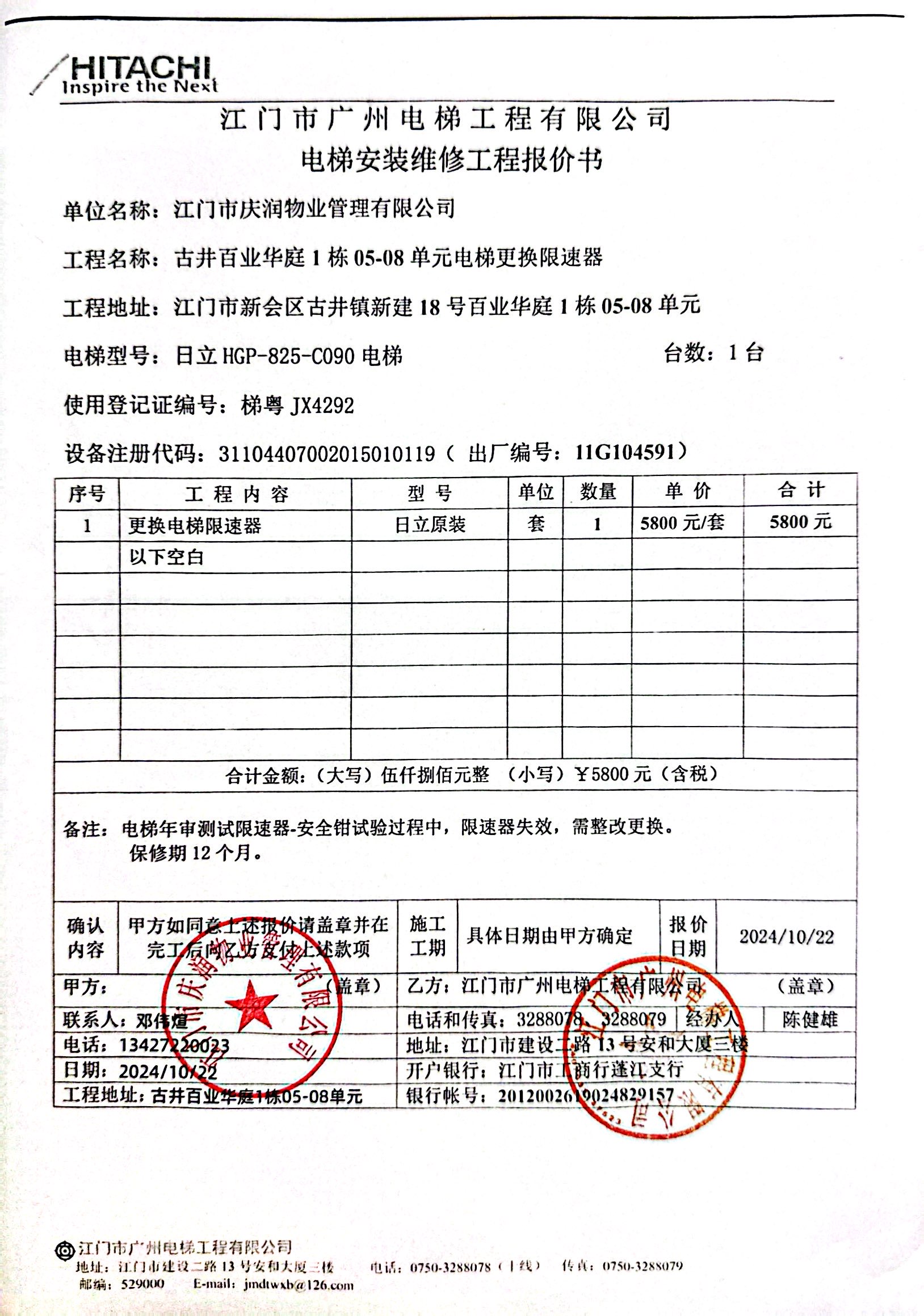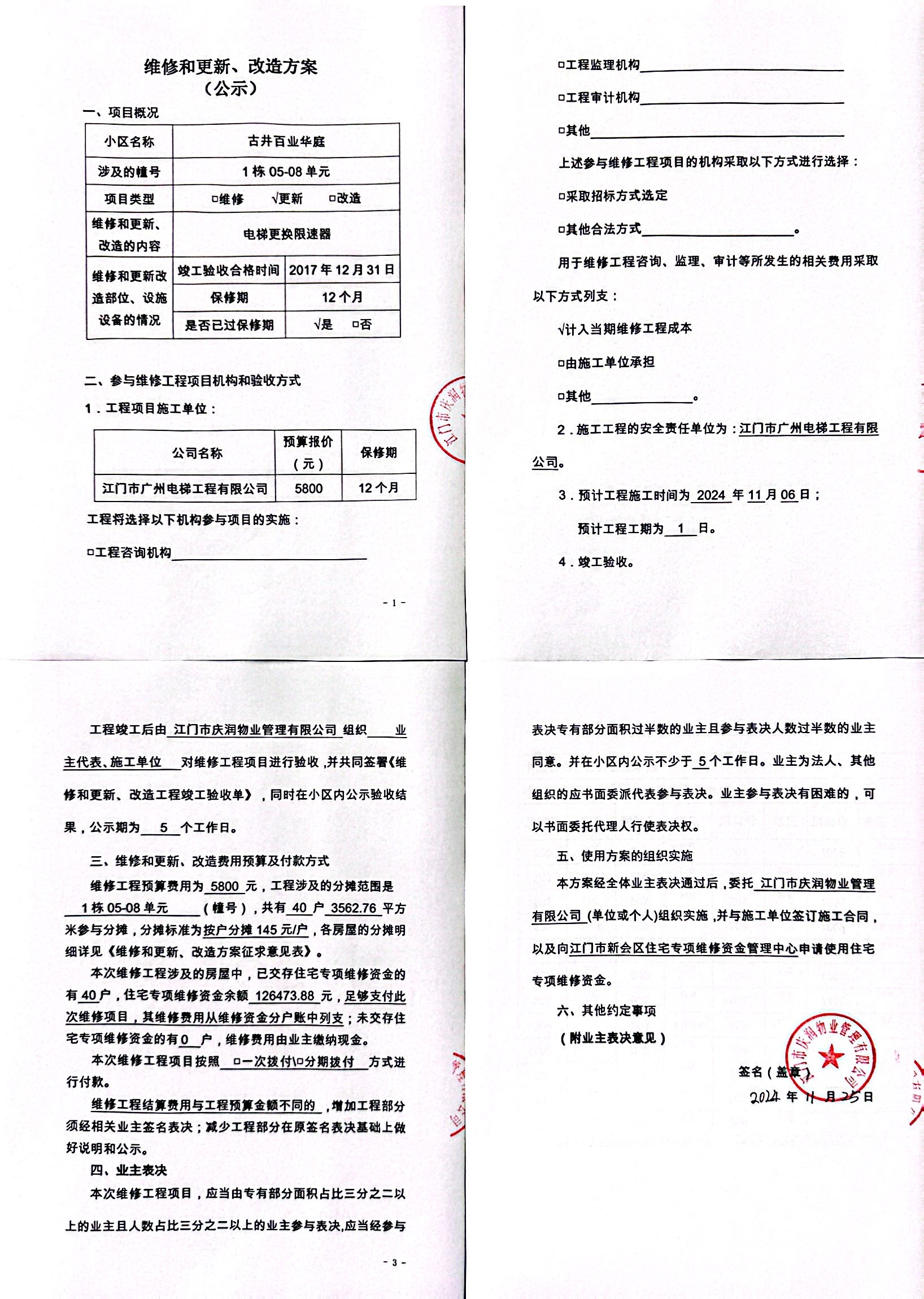 <td VALIGN="top" VALUES="" STYLE="border-width:0" BINDTYPE="0" ROWSPAN="19" COLSPAN="7" DATASOURCE="投票结果" ><font style="font-size:14pt;"><p style="white-space: normal; font-family: 宋体; line-height: 1.75em;">古井百业华庭百业华庭1栋全体业主:</p><p style="white-space: normal; font-family: 宋体; line-height: 1.75em; text-indent: 2em;">本小区关于古井百业华庭1栋05-08单元电梯(梯粤JX4292)更换限速器使用维修资金的投票的投票已表决结束,询异时间从2024年12月31日开始,投票询异公示期间,业主可通过微信查询自己的表决情况或可凭身份证件申请查询自己的表决情况;如公示的业主表决情况与查询的本人表决意见不一致的,可以以书面形式向投票组织机构申诉,投票组织机构予以纠正并重新公示表决结果。异议提出人对投票组织机构的处理仍有异议的,可以向街道办事处(镇人民政府)反映处理,涉及住宅专项维修资金的,可向属地住宅专项维修资金管理中心反映处理。</p><p style="white-space: normal;"><br/></p><p style="white-space: normal; font-family: 宋体; line-height: 1.75em;"><strong>附件:</strong></p><p style="white-space: normal; font-family: 宋体; line-height: 1.75em;"><strong>一、投票范围</strong></p><p style="white-space: normal; font-family: 宋体; line-height: 1.75em; text-indent: 2em;">古井百业华庭百业华庭1栋</p><p style="white-space: normal; font-family: 宋体; line-height: 1.75em; text-indent: 2em;">总人数(专有部分人数之和):30</p><p style="white-space: normal; font-family: 宋体; line-height: 1.75em; text-indent: 2em;"><span style="font-family: 宋体, SimSun;"><span style="font-family: 宋体; text-indent: 32px;"><span style="font-family: 宋体; text-indent: 32px;">总户数:40</span></span></span></p><p style="white-space: normal; font-family: 宋体; line-height: 1.75em; text-indent: 2em;">建筑物总面积(专有部分面积之和):3562.76㎡</p><p style="white-space: normal; font-family: 宋体; line-height: 1.75em;"><strong>二、询异公示起止时间</strong></p><p dir="ltr" style="white-space: normal; font-family: 宋体; line-height: 1.75em; text-indent: 2em;"><span style="text-indent: 36px;">2024年12月31日至2025年01月10日</span></p><p style="white-space: normal; font-family: 宋体; line-height: 1.75em;"><strong>三、投票详细描述</strong></p><p style="white-space: normal; font-family: 宋体; line-height: 1.75em; text-indent: 2em;"><p>古井百业华庭1栋05-08单元电梯(梯粤JX4292)年审测试,限速器测试失效,经检查,是由于电梯安全钳试验过程中,由于限速器老化失效,未能与安全钳联动存在安全隐患,需整改更换。</p><p> 现对古井百业华庭1栋05-08单元电梯(梯粤JX4292)进行更换限速器,工程维修预算金额为5800元,项目最终费用以施工合同签订金额为准。因已过保修期,维修费用由相关业主按户分摊,每户145元,详见公示附件。如业主手机不能正常通过微信投票,请联系物业公司进行线下纸质投票,物业电话:0750-6280888。<br/></p><p><br/></p></p><p style="white-space: normal; font-family: 宋体; line-height: 1.75em;"><strong>四、计票规则</strong></p><p style="white-space: normal; font-family: 宋体; line-height: 1.75em; text-indent: 2em;">表决事项:使用建筑物及其附属设施的维修资金<br /><p style='text-align: left; font-family: 宋体; font-size: 16px; line-height: 1.75em; text-indent: 2em;'>计票规则:弃权票不并入其它项 未表决票不并入其它项</p></p><p style="white-space: normal; font-family: 宋体; line-height: 1.75em;"><strong>五、通过规则</strong></p><p style="white-space: normal; font-family: 宋体; line-height: 1.75em;"><strong><strong style="white-space: normal;"><span style="font-family: 宋体, SimSun;"> 根据《中华人民共和国民法典》第二百七十八条规定:业主共同决定事项,应当由专有部分面积占比三分之二以上的业主且人数占比三分之二以上的业主参与表决。</span></strong></strong></p><p style="white-space: normal; font-family: 宋体; line-height: 1.75em; text-indent: 2em;">表决事项:使用建筑物及其附属设施的维修资金<br /><p style='text-align: left; font-family: 宋体; font-size: 16px; line-height: 1.75em; text-indent: 2em;'>通过规则:双2/3以上参与表决,参与表决双过半同意</p></p><p style="white-space: normal; font-family: 宋体; line-height: 1.75em;"><strong>六、投票结果</strong></p><p style="white-space: normal; font-family: 宋体; line-height: 1.75em; text-indent: 2em;"><div id='resultTable'><table style='table-layout: fixed; font-size:12px; margin-top:10px' width='100%' border='0' cellspacing='0' cellpadding='0'><tr><td height='28' colspan='10' align='center' style='border: 1px solid #666'><strong style='font-size: 14px;'> 使用建筑物及其附属设施的维修资金</strong></td> </tr><tr id='trfirst'><td height='28' colspan='4' style='border-left: 1px solid #666; border-bottom: 1px solid #666'><strong> 申报单位:</strong> 江门市庆润物业管理有限公司</td><td colspan='3' style='border-left: 1px solid #666; border-bottom: 1px solid #666'><strong> 联系方式:</strong> </td><td colspan='3' style='border-left: 1px solid #666; border-bottom: 1px solid #666; border-right: 1px solid #666'><strong> 申报日期:</strong> 2024年11月25日 </td></tr><tr> <td height='28' colspan='5' style='border-left: 1px solid #666; border-bottom: 1px solid #666'><strong> 总人数(专有部分人数之和):</strong>30人 </td><td colspan='5' style='border-left: 1px solid #666; border-bottom: 1px solid #666; border-right: 1px solid #666'><strong> 建筑物总面积(专有部分面积之和):</strong>3562.76㎡ </td> </tr><tr><td height='28' colspan='10' bgcolor='#F3F3F3' style='border-left: 1px solid #666;border-bottom: 1px solid #666;border-right: 1px 