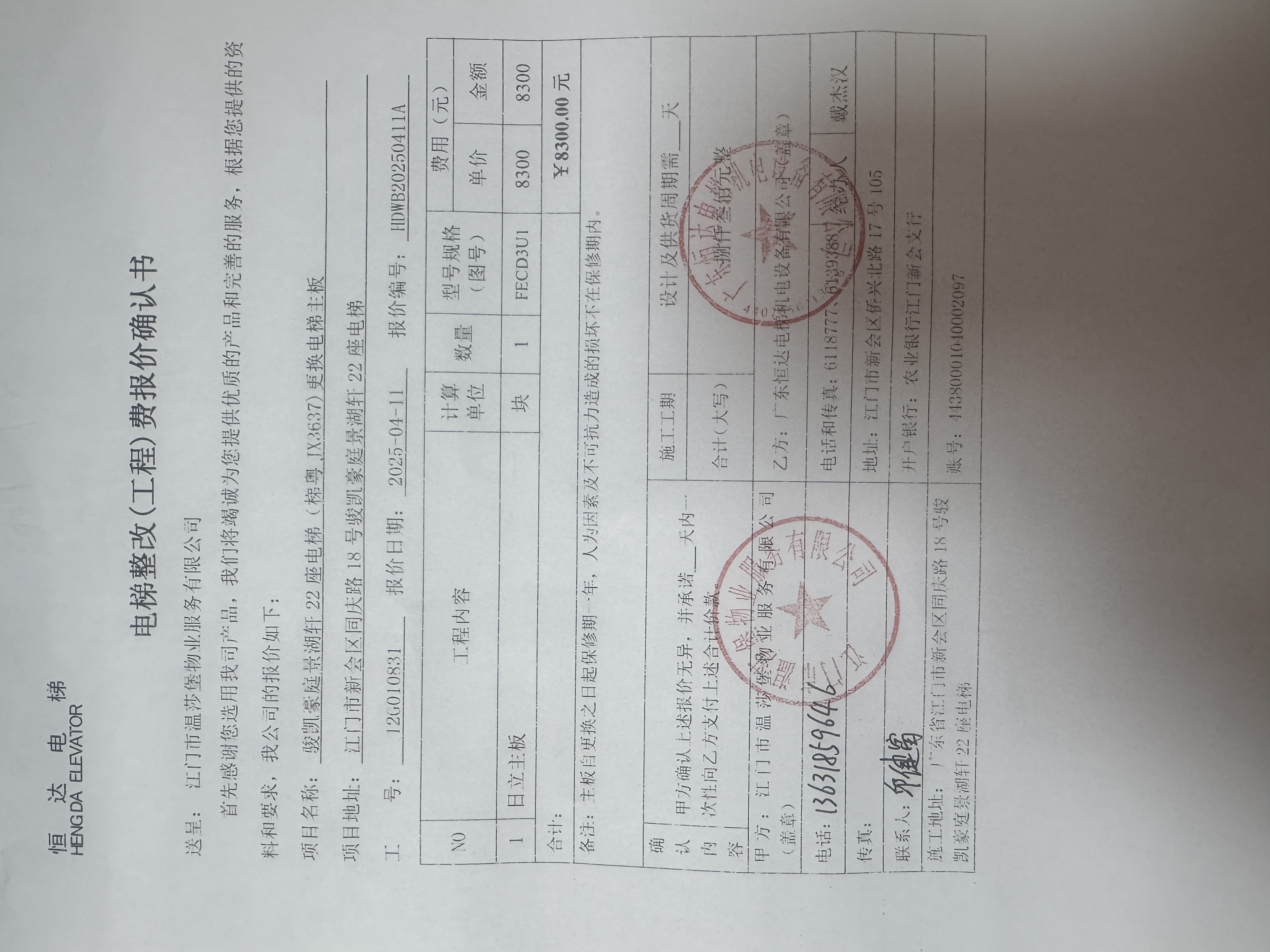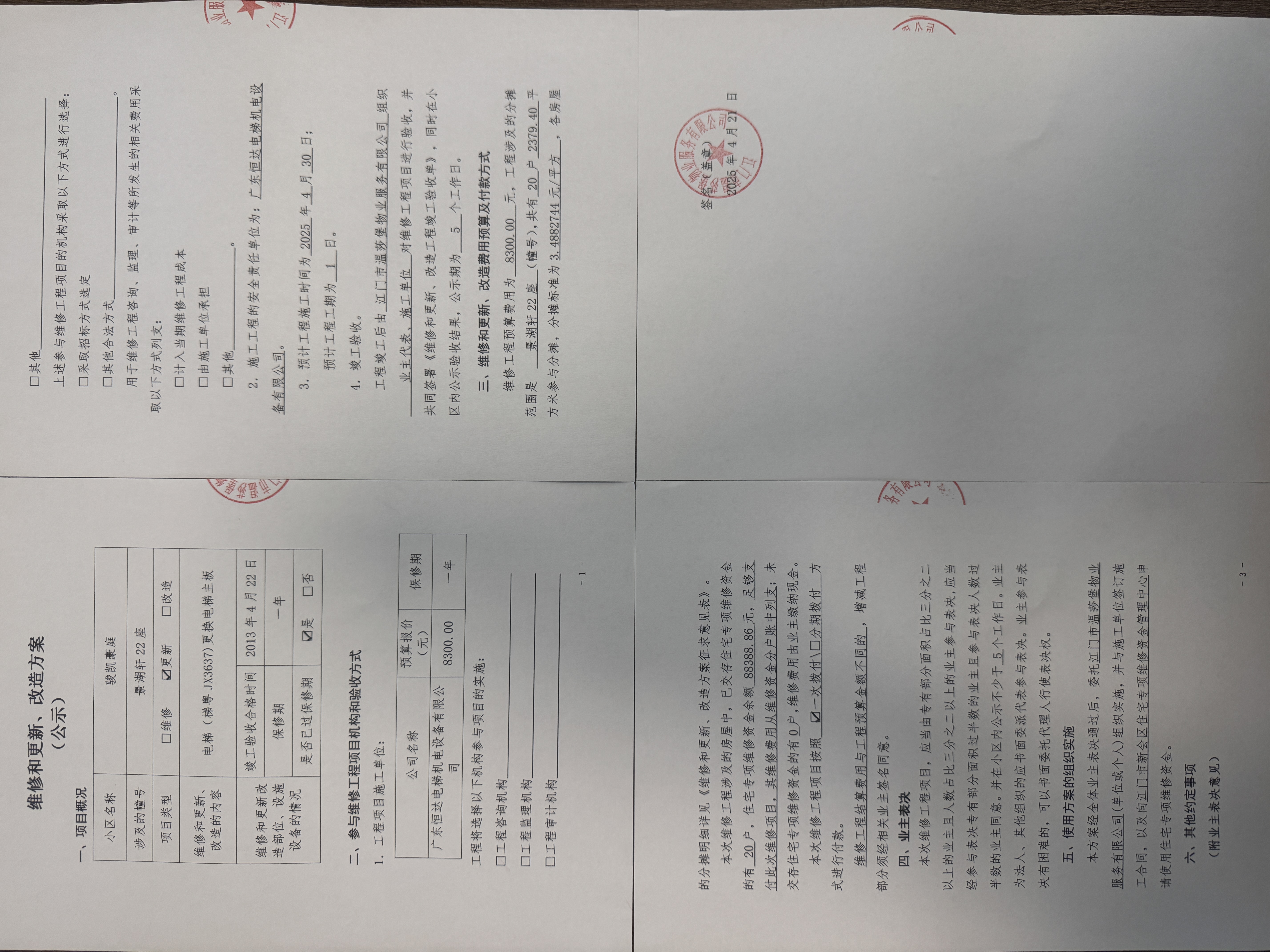 <td VALIGN="top" VALUES="" STYLE="border-width:0" BINDTYPE="0" ROWSPAN="19" COLSPAN="7" DATASOURCE="投票结果" ><font style="font-size:14pt;"><p style="white-space: normal; font-family: 宋体; line-height: 1.75em;">骏凯豪庭骏凯豪庭景湖轩22座全体业主:</p><p style="white-space: normal; font-family: 宋体; line-height: 1.75em; text-indent: 2em;">本小区关于骏凯豪庭景湖轩22座电梯(梯粤JX3637)更换电梯主板使用维修资金的投票的投票已表决结束,询异时间从2025年04月27日开始,投票询异公示期间,业主可通过微信查询自己的表决情况或可凭身份证件申请查询自己的表决情况;如公示的业主表决情况与查询的本人表决意见不一致的,可以以书面形式向投票组织机构申诉,投票组织机构予以纠正并重新公示表决结果。异议提出人对投票组织机构的处理仍有异议的,可以向街道办事处(镇人民政府)反映处理,涉及住宅专项维修资金的,可向属地住宅专项维修资金管理中心反映处理。</p><p style="white-space: normal;"><br/></p><p style="white-space: normal; font-family: 宋体; line-height: 1.75em;"><strong>附件:</strong></p><p style="white-space: normal; font-family: 宋体; line-height: 1.75em;"><strong>一、投票范围</strong></p><p style="white-space: normal; font-family: 宋体; line-height: 1.75em; text-indent: 2em;">骏凯豪庭骏凯豪庭景湖轩22座</p><p style="white-space: normal; font-family: 宋体; line-height: 1.75em; text-indent: 2em;">总人数(专有部分人数之和):20</p><p style="white-space: normal; font-family: 宋体; line-height: 1.75em; text-indent: 2em;"><span style="font-family: 宋体, SimSun;"><span style="font-family: 宋体; text-indent: 32px;"><span style="font-family: 宋体; text-indent: 32px;">总户数:20</span></span></span></p><p style="white-space: normal; font-family: 宋体; line-height: 1.75em; text-indent: 2em;">建筑物总面积(专有部分面积之和):2379.40㎡</p><p style="white-space: normal; font-family: 宋体; line-height: 1.75em;"><strong>二、询异公示起止时间</strong></p><p dir="ltr" style="white-space: normal; font-family: 宋体; line-height: 1.75em; text-indent: 2em;"><span style="text-indent: 36px;">2025年04月27日至2025年05月07日</span></p><p style="white-space: normal; font-family: 宋体; line-height: 1.75em;"><strong>三、投票详细描述</strong></p><p style="white-space: normal; font-family: 宋体; line-height: 1.75em; text-indent: 2em;"><p>骏凯豪庭景湖轩22座电梯(梯粤JX3637)日常运行出现停止运行的情况,经检查,是由于电梯主板损坏导致。</p><p>现对景湖轩22座电梯(梯粤JX3637)更换电梯主板,工程维修预算金额为8300.00元,项目最终费用以施工合同签订金额为准。因已过保修期,维修费用由相关业主按建筑面积分摊,每平方约3.4882744元,详见公示附件。如业主手机不能正常通过微信投票,请联系物业公司进行线下纸质投票,物业公司电话:0750-6399789。<br/></p></p><p style="white-space: normal; font-family: 宋体; line-height: 1.75em;"><strong>四、计票规则</strong></p><p style="white-space: normal; font-family: 宋体; line-height: 1.75em; text-indent: 2em;">表决事项:使用建筑物及其附属设施的维修资金<br /><p style='text-align: left; font-family: 宋体; font-size: 16px; line-height: 1.75em; text-indent: 2em;'>计票规则:弃权票不并入其它项 未表决票不并入其它项</p></p><p style="white-space: normal; font-family: 宋体; line-height: 1.75em;"><strong>五、通过规则</strong></p><p style="white-space: normal; font-family: 宋体; line-height: 1.75em;"><strong><strong style="white-space: normal;"><span style="font-family: 宋体, SimSun;"> 根据《中华人民共和国民法典》第二百七十八条规定:业主共同决定事项,应当由专有部分面积占比三分之二以上的业主且人数占比三分之二以上的业主参与表决。</span></strong></strong></p><p style="white-space: normal; font-family: 宋体; line-height: 1.75em; text-indent: 2em;">表决事项:使用建筑物及其附属设施的维修资金<br /><p style='text-align: left; font-family: 宋体; font-size: 16px; line-height: 1.75em; text-indent: 2em;'>通过规则:双2/3以上参与表决,参与表决双过半同意</p></p><p style="white-space: normal; font-family: 宋体; line-height: 1.75em;"><strong>六、投票结果</strong></p><p style="white-space: normal; font-family: 宋体; line-height: 1.75em; text-indent: 2em;"><div id='resultTable'><table style='table-layout: fixed; font-size:12px; margin-top:10px' width='100%' border='0' cellspacing='0' cellpadding='0'><tr><td height='28' colspan='10' align='center' style='border: 1px solid #666'><strong style='font-size: 14px;'> 使用建筑物及其附属设施的维修资金</strong></td> </tr><tr id='trfirst'><td height='28' colspan='4' style='border-left: 1px solid #666; border-bottom: 1px solid #666'><strong> 申报单位:</strong> 江门市温莎堡物业服务有限公司</td><td colspan='3' style='border-left: 1px solid #666; border-bottom: 1px solid #666'><strong> 联系方式:</strong> 07506392388 </td><td colspan='3' style='border-left: 1px solid #666; border-bottom: 1px solid #666; border-right: 1px solid #666'><strong> 申报日期:</strong> 2025年4月22日 </td></tr><tr> <td height='28' colspan='5' style='border-left: 1px solid #666; border-bottom: 1px solid #666'><strong> 总人数(专有部分人数之和):</strong>20人 </td><td colspan='5' style='border-left: 1px solid #666; border-bottom: 1px solid #666; border-right: 1px solid #666'><strong> 建筑物总面积(专有部分面积之和):</strong>2379.40㎡ </td> </tr><tr><td height='28' colspan='10' bgcolor='#F3F3F3' style='border-left: 1px solid #666;border-bottom: 1px solid #666;border-right: 1px solid #666'><strong> 参与人数及面积统计</strong></td></tr><tr><td height=
